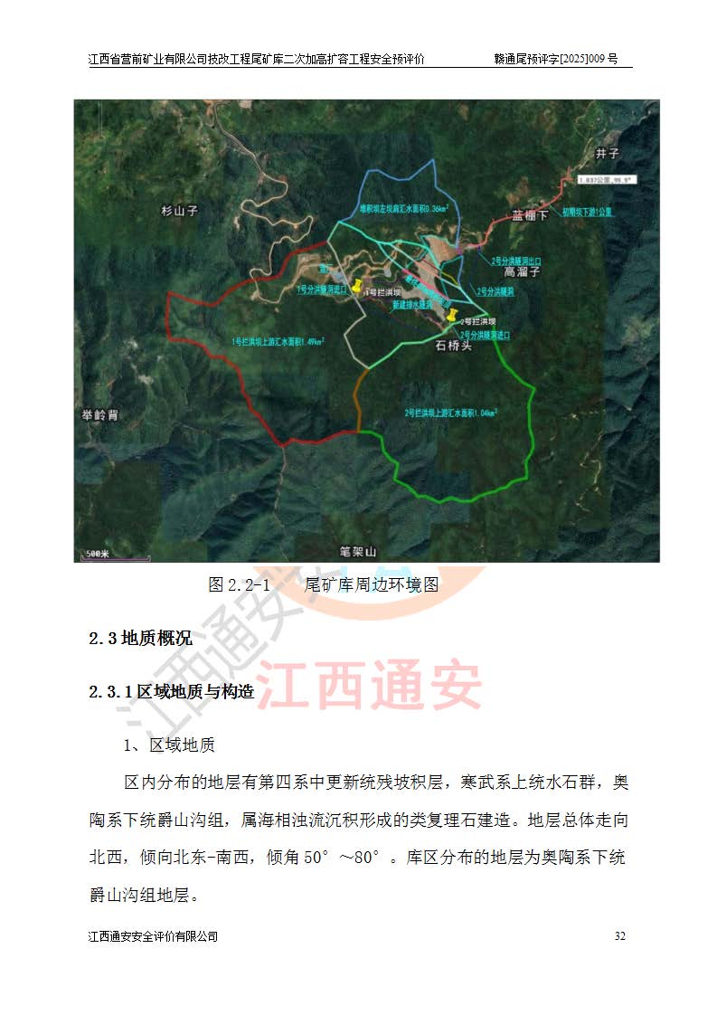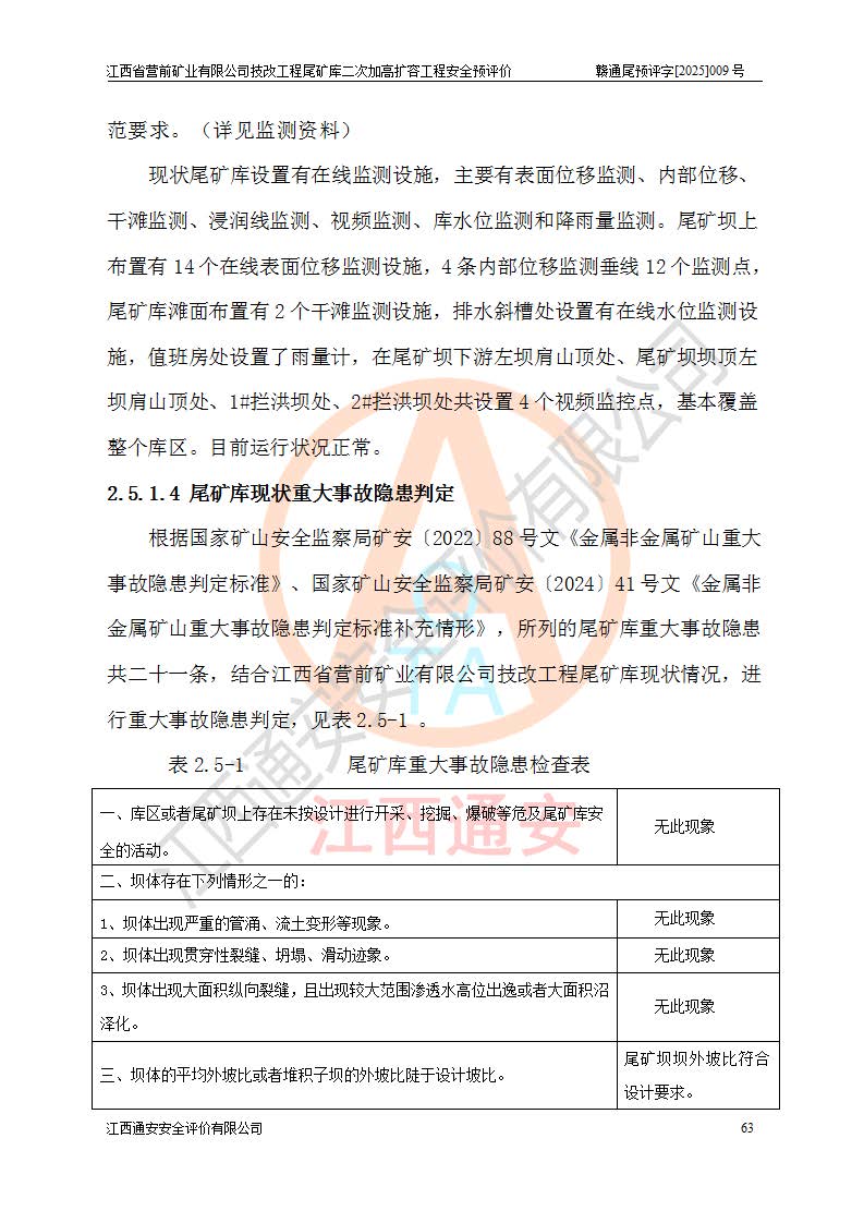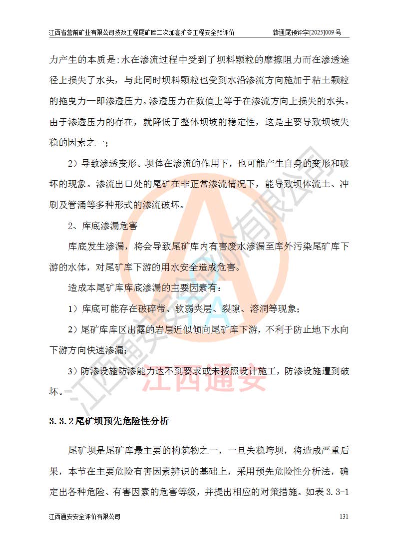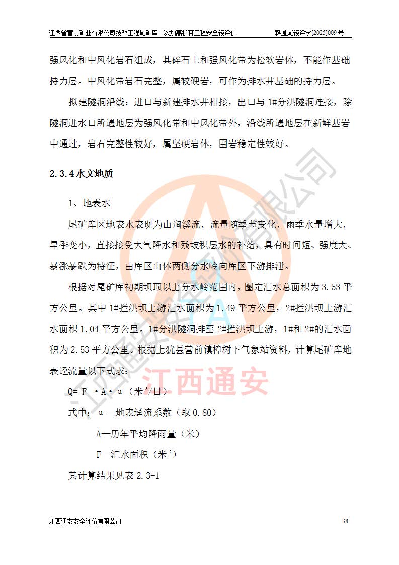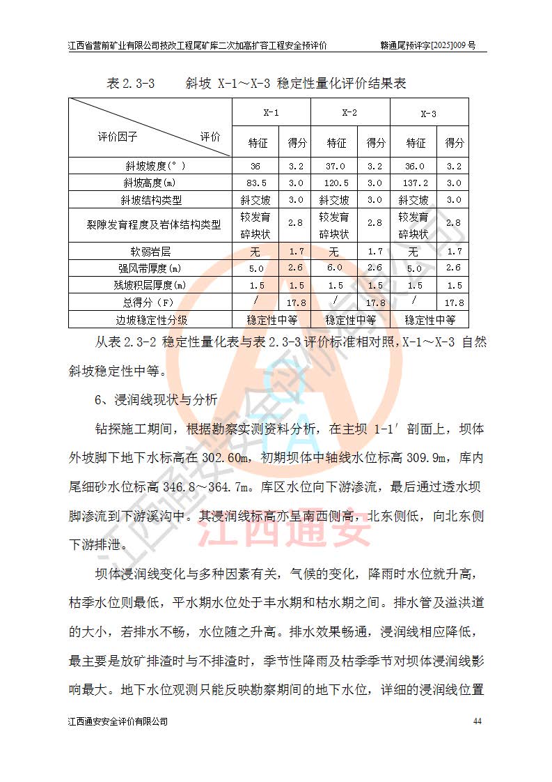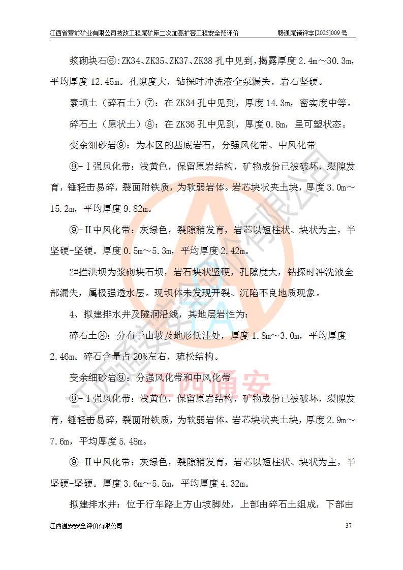 江西省營前礦業(yè)有限公司于2003年12月16日成立,位于贛州市上猶縣營前鎮(zhèn)焦里村境內(nèi),公司注冊資本10000萬元,法定**人陳雅博,礦區(qū)地理坐標(biāo):東經(jīng)114°18′30″~114°19′00″,北緯25°52′35″~25°53′47″。公司經(jīng)營范圍包括:鉛礦、鋅、鎢、銀地下開采、銷售。 江西省營前礦業(yè)有限公司技改工程尾礦庫位于焦里鎢銀鉛鋅礦區(qū),處于上猶縣水巖鄉(xiāng)井子村坑尾自然村境內(nèi),為山谷型尾礦庫。 江西省營前礦業(yè)有限公司技改工程尾礦庫于2013年由福建省冶金工業(yè)設(shè)計(jì)院設(shè)計(jì),2014年8月開始施工建設(shè),2015年4月竣工開始試運(yùn)行,2015年11月完成竣工驗(yàn)收,2016年1月首次取得安全生產(chǎn)許可證,2019年1月完成延期換證,2020年8月委托金建工程設(shè)計(jì)有限公司進(jìn)行尾礦庫加高擴(kuò)容工作,2020年10月21日取得了江西省應(yīng)急管理廳下發(fā)的《關(guān)于江西省營前礦業(yè)有限公司技改工程尾礦庫加高擴(kuò)容工程安全設(shè)施設(shè)計(jì)的審查意見》(贛應(yīng)急非煤項(xiàng)目設(shè)審〔2020〕46號),之后委托駐馬店市黃淮建設(shè)工程有限公司負(fù)責(zé)施工,云南潤滇工程技術(shù)有限公司負(fù)責(zé)監(jiān)理,2021年12月完成加高擴(kuò)容竣工驗(yàn)收工作,經(jīng)過延期,現(xiàn)尾礦庫安全生產(chǎn)許可證編號(贛)FM安許證字[2016]M1692號,**期為2025年01月18日至2028年01月17日。 江西省營前礦業(yè)有限公司技改工程尾礦庫為山谷型尾礦庫,初期壩為透水堆石壩,壩頂高程為330.0m,初期壩高25.0m,后期采用上游式尾礦堆積壩,加高擴(kuò)容后*終壩頂高程為380.0m,堆積壩高50.0m,總壩高為75.0m,總庫容為為503.14×104m3,尾礦庫為三等庫。尾礦庫初期壩以上總匯水面積3.53km2,防洪標(biāo)準(zhǔn)取500年一遇。 目前尾礦庫由初期壩、堆積壩、庫內(nèi)排洪系統(tǒng)(雙格排水斜槽+連接井+排水涵洞+排洪隧洞+排水陡槽+消力池)、1#攔洪壩、1#分洪隧洞、2#攔洪壩、2#分洪隧洞和安全監(jiān)測設(shè)施組成。根據(jù)建設(shè)單位提供的尾礦庫平面布置圖,截至2024年12月,現(xiàn)狀尾礦庫堆積壩頂高程為372.2m,現(xiàn)狀總壩高67.2m,灘頂高程為369.8m,現(xiàn)狀全庫容387.51×104m3,現(xiàn)狀尾礦庫為三等庫,原加高擴(kuò)容設(shè)計(jì)*終堆積壩頂高程為380.0m,現(xiàn)剩余庫容115.63×104m3,剩余**庫容約92.5×104m3,剩余服務(wù)年限約4.5年;礦山現(xiàn)有儲(chǔ)量較大,剩余庫容及服務(wù)年限不滿足礦山后期生產(chǎn)需要。 技改工程尾礦庫尾礦壩下游1**范圍無居民,不存在工礦企業(yè)等建構(gòu)筑物,不屬于“頭頂庫”;尾礦庫不壓礦;距贛江直線距離60**;不涉及保護(hù)區(qū)及生態(tài)紅線;尾礦庫所在溝谷較長,谷底平均縱坡9%,上游周邊山體地形有利于尾礦庫二次加高擴(kuò)容工程的實(shí)施,因此為了增加尾礦庫庫容,延長服務(wù)年限,充分利用尾礦庫所在溝谷地形,江西省營前礦業(yè)有限公司對技改尾礦庫進(jìn)行二次加高擴(kuò)容。 2024年12月,江西省營前礦業(yè)有限公司委托地礦贛西地質(zhì)工程勘察院編制了《江西省營前礦業(yè)有限公司技改工程尾礦庫二次擴(kuò)容工程(水文)地質(zhì)勘察報(bào)告》,2025年4月,江西省營前礦業(yè)有限公司委托金建工程設(shè)計(jì)有限公司編制了《江西省營前礦業(yè)有限公司技改工程尾礦庫二次加高擴(kuò)容工程可行性研究報(bào)告》。 按照非煤礦山建設(shè)項(xiàng)目安全設(shè)施“三同時(shí)”的規(guī)定要求,技改工程尾礦庫為二次加高擴(kuò)容工程,**進(jìn)行安全預(yù)評價(jià);江西省營前礦業(yè)有限公司委托我公司承擔(dān)技改工程尾礦庫二次加高擴(kuò)容工程建設(shè)項(xiàng)目的安全預(yù)評價(jià)工作。 |