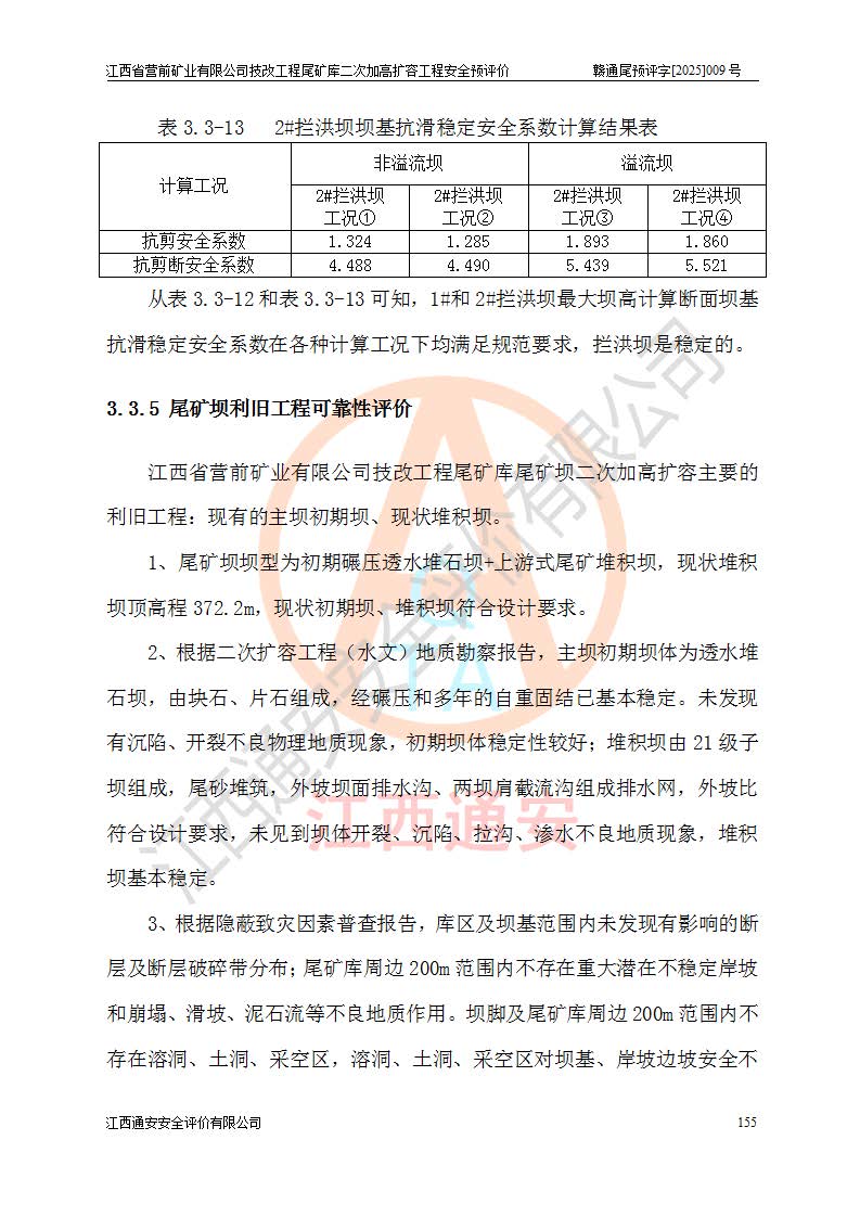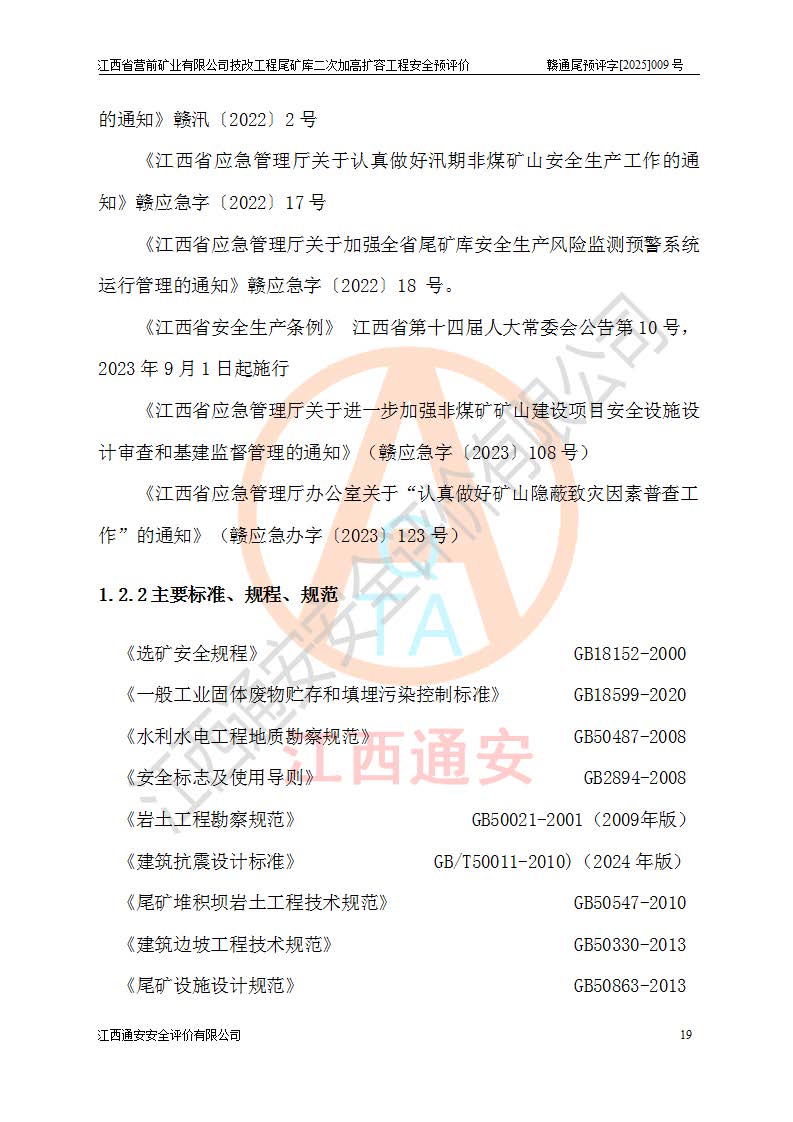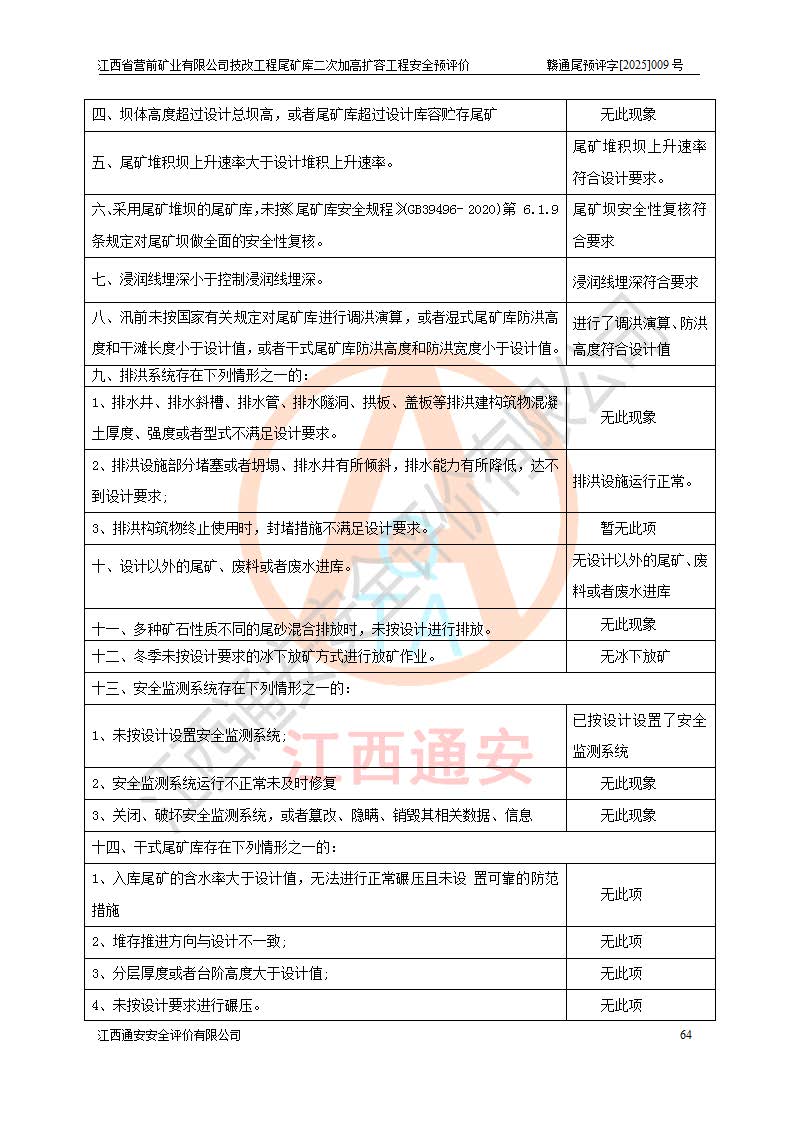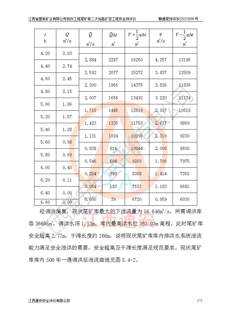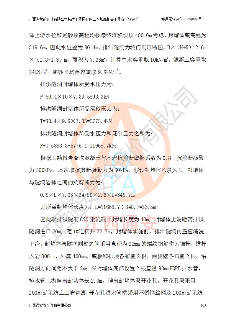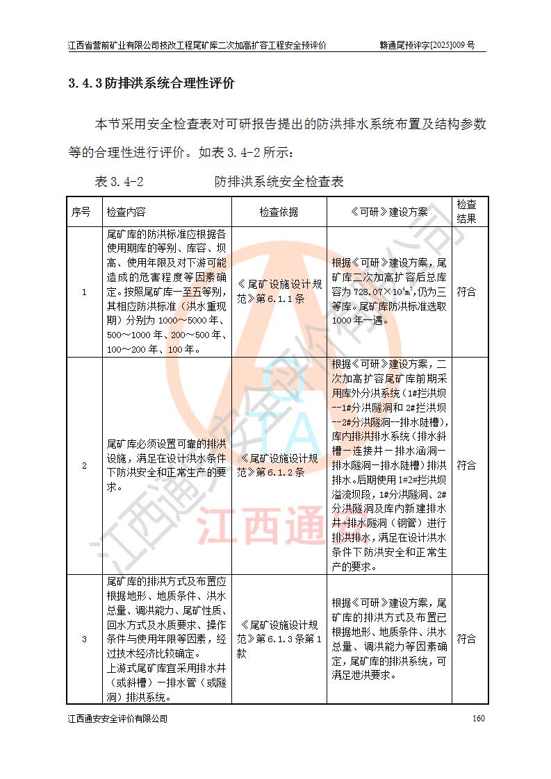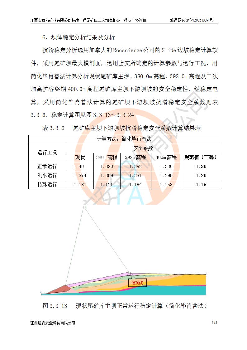 江西省營前礦業(yè)有限公司于2003年12月16日成立,位于贛州市上猶縣營前鎮(zhèn)焦里村境內(nèi),公司注冊資本10000萬元,法定**人陳雅博,礦區(qū)地理坐標(biāo):東經(jīng)114°18′30″~114°19′00″,北緯25°52′35″~25°53′47″。公司經(jīng)營范圍包括:鉛礦、鋅、鎢、銀地下開采、銷售。 江西省營前礦業(yè)有限公司技改工程尾礦庫位于焦里鎢銀鉛鋅礦區(qū),處于上猶縣水巖鄉(xiāng)井子村坑尾自然村境內(nèi),為山谷型尾礦庫。 江西省營前礦業(yè)有限公司技改工程尾礦庫于2013年由福建省冶金工業(yè)設(shè)計(jì)院設(shè)計(jì),2014年8月開始施工建設(shè),2015年4月竣工開始試運(yùn)行,2015年11月完成竣工驗(yàn)收,2016年1月首次取得安全生產(chǎn)許可證,2019年1月完成延期換證,2020年8月委托金建工程設(shè)計(jì)有限公司進(jìn)行尾礦庫加高擴(kuò)容工作,2020年10月21日取得了江西省應(yīng)急管理廳下發(fā)的《關(guān)于江西省營前礦業(yè)有限公司技改工程尾礦庫加高擴(kuò)容工程安全設(shè)施設(shè)計(jì)的審查意見》(贛應(yīng)急非煤項(xiàng)目設(shè)審〔2020〕46號),之后委托駐馬店市黃淮建設(shè)工程有限公司負(fù)責(zé)施工,云南潤滇工程技術(shù)有限公司負(fù)責(zé)監(jiān)理,2021年12月完成加高擴(kuò)容竣工驗(yàn)收工作,經(jīng)過延期,現(xiàn)尾礦庫安全生產(chǎn)許可證編號(贛)FM安許證字[2016]M1692號,**期為2025年01月18日至2028年01月17日。 江西省營前礦業(yè)有限公司技改工程尾礦庫為山谷型尾礦庫,初期壩為透水堆石壩,壩頂高程為330.0m,初期壩高25.0m,后期采用上游式尾礦堆積壩,加高擴(kuò)容后*終壩頂高程為380.0m,堆積壩高50.0m,總壩高為75.0m,總庫容為為503.14×104m3,尾礦庫為三等庫。尾礦庫初期壩以上總匯水面積3.53km2,防洪標(biāo)準(zhǔn)取500年一遇。 目前尾礦庫由初期壩、堆積壩、庫內(nèi)排洪系統(tǒng)(雙格排水斜槽+連接井+排水涵洞+排洪隧洞+排水陡槽+消力池)、1#攔洪壩、1#分洪隧洞、2#攔洪壩、2#分洪隧洞和安全監(jiān)測設(shè)施組成。根據(jù)建設(shè)單位提供的尾礦庫平面布置圖,截至2024年12月,現(xiàn)狀尾礦庫堆積壩頂高程為372.2m,現(xiàn)狀總壩高67.2m,灘頂高程為369.8m,現(xiàn)狀全庫容387.51×104m3,現(xiàn)狀尾礦庫為三等庫,原加高擴(kuò)容設(shè)計(jì)*終堆積壩頂高程為380.0m,現(xiàn)剩余庫容115.63×104m3,剩余**庫容約92.5×104m3,剩余服務(wù)年限約4.5年;礦山現(xiàn)有儲(chǔ)量較大,剩余庫容及服務(wù)年限不滿足礦山后期生產(chǎn)需要。 技改工程尾礦庫尾礦壩下游1**范圍無居民,不存在工礦企業(yè)等建構(gòu)筑物,不屬于“頭頂庫”;尾礦庫不壓礦;距贛江直線距離60**;不涉及保護(hù)區(qū)及生態(tài)紅線;尾礦庫所在溝谷較長,谷底平均縱坡9%,上游周邊山體地形有利于尾礦庫二次加高擴(kuò)容工程的實(shí)施,因此為了增加尾礦庫庫容,延長服務(wù)年限,充分利用尾礦庫所在溝谷地形,江西省營前礦業(yè)有限公司對技改尾礦庫進(jìn)行二次加高擴(kuò)容。 2024年12月,江西省營前礦業(yè)有限公司委托地礦贛西地質(zhì)工程勘察院編制了《江西省營前礦業(yè)有限公司技改工程尾礦庫二次擴(kuò)容工程(水文)地質(zhì)勘察報(bào)告》,2025年4月,江西省營前礦業(yè)有限公司委托金建工程設(shè)計(jì)有限公司編制了《江西省營前礦業(yè)有限公司技改工程尾礦庫二次加高擴(kuò)容工程可行性研究報(bào)告》。 按照非煤礦山建設(shè)項(xiàng)目安全設(shè)施“三同時(shí)”的規(guī)定要求,技改工程尾礦庫為二次加高擴(kuò)容工程,**進(jìn)行安全預(yù)評價(jià);江西省營前礦業(yè)有限公司委托我公司承擔(dān)技改工程尾礦庫二次加高擴(kuò)容工程建設(shè)項(xiàng)目的安全預(yù)評價(jià)工作。 |