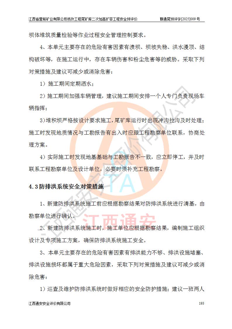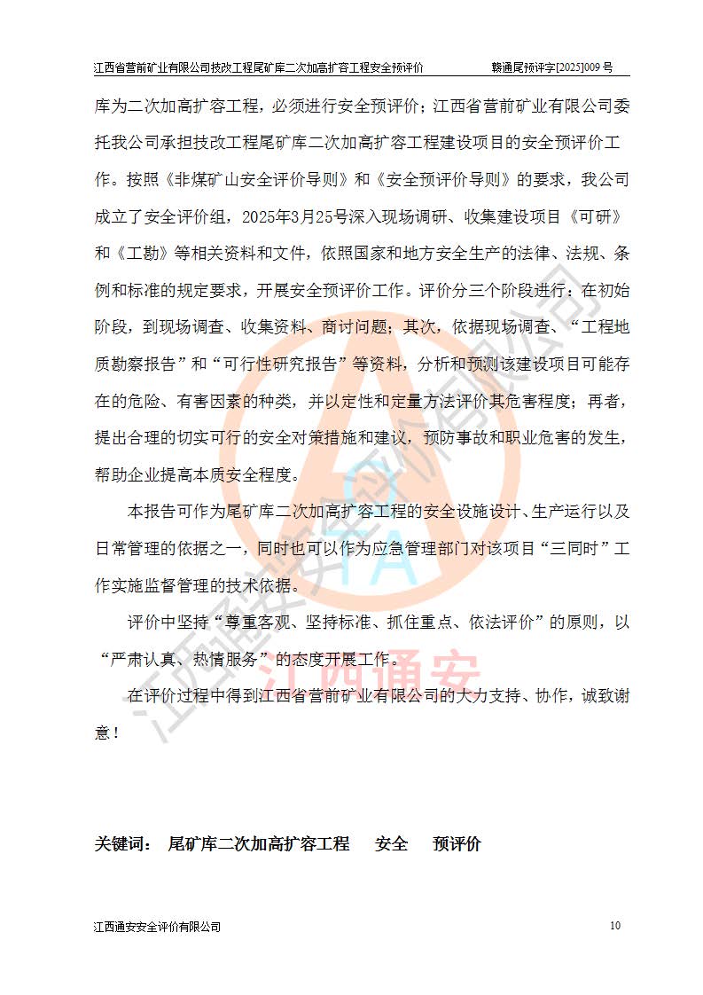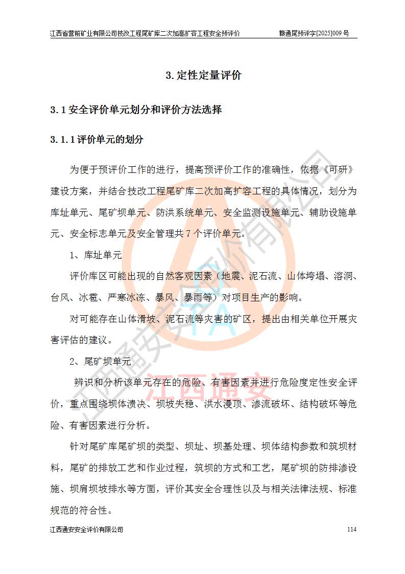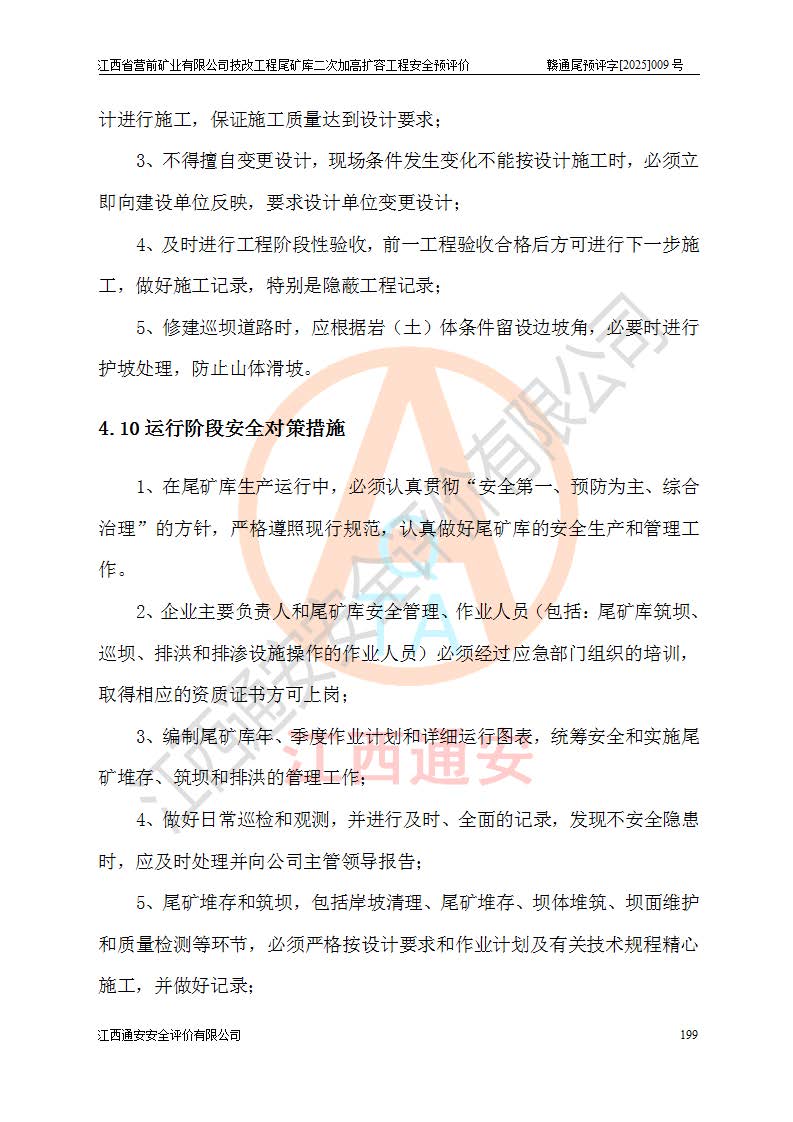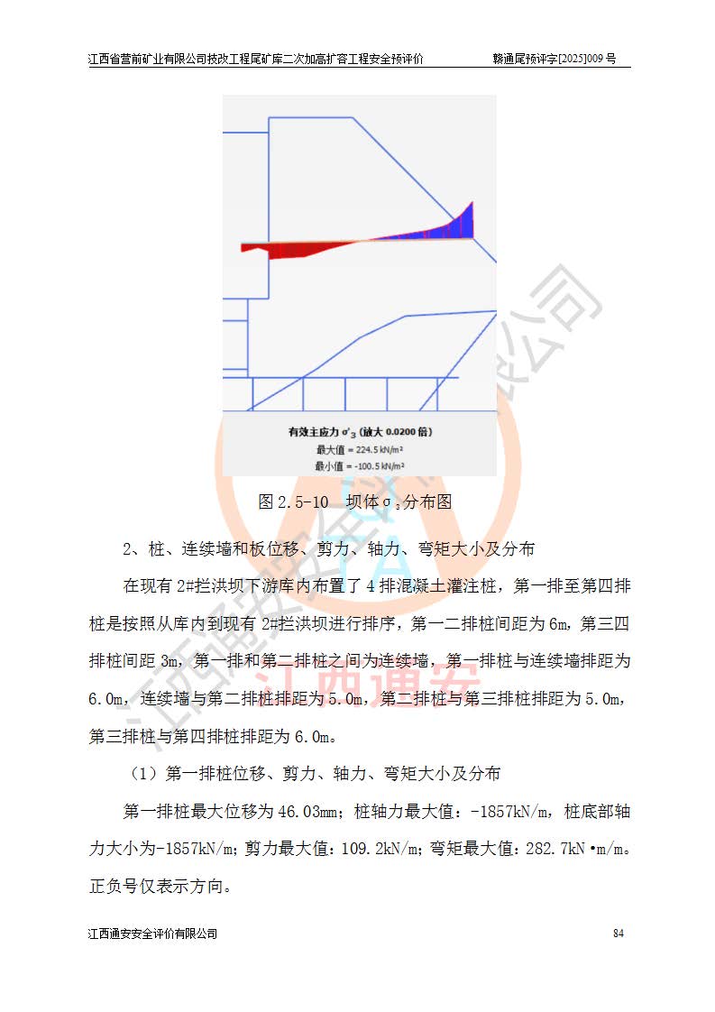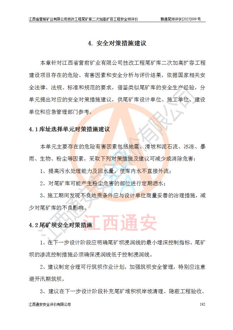 江西省營前礦業(yè)有限公司于2003年12月16日成立,位于贛州市上猶縣營前鎮(zhèn)焦里村境內(nèi),公司注冊資本10000萬元,法定**人陳雅博,礦區(qū)地理坐標(biāo):東經(jīng)114°18′30″~114°19′00″,北緯25°52′35″~25°53′47″。公司經(jīng)營范圍包括:鉛礦、鋅、鎢、銀地下開采、銷售。 江西省營前礦業(yè)有限公司技改工程尾礦庫位于焦里鎢銀鉛鋅礦區(qū),處于上猶縣水巖鄉(xiāng)井子村坑尾自然村境內(nèi),為山谷型尾礦庫。 江西省營前礦業(yè)有限公司技改工程尾礦庫于2013年由福建省冶金工業(yè)設(shè)計(jì)院設(shè)計(jì),2014年8月開始施工建設(shè),2015年4月竣工開始試運(yùn)行,2015年11月完成竣工驗(yàn)收,2016年1月首次取得安全生產(chǎn)許可證,2019年1月完成延期換證,2020年8月委托金建工程設(shè)計(jì)有限公司進(jìn)行尾礦庫加高擴(kuò)容工作,2020年10月21日取得了江西省應(yīng)急管理廳下發(fā)的《關(guān)于江西省營前礦業(yè)有限公司技改工程尾礦庫加高擴(kuò)容工程安全設(shè)施設(shè)計(jì)的審查意見》(贛應(yīng)急非煤項(xiàng)目設(shè)審〔2020〕46號),之后委托駐馬店市黃淮建設(shè)工程有限公司負(fù)責(zé)施工,云南潤滇工程技術(shù)有限公司負(fù)責(zé)監(jiān)理,2021年12月完成加高擴(kuò)容竣工驗(yàn)收工作,經(jīng)過延期,現(xiàn)尾礦庫安全生產(chǎn)許可證編號(贛)FM安許證字[2016]M1692號,**期為2025年01月18日至2028年01月17日。 江西省營前礦業(yè)有限公司技改工程尾礦庫為山谷型尾礦庫,初期壩為透水堆石壩,壩頂高程為330.0m,初期壩高25.0m,后期采用上游式尾礦堆積壩,加高擴(kuò)容后*終壩頂高程為380.0m,堆積壩高50.0m,總壩高為75.0m,總庫容為為503.14×104m3,尾礦庫為三等庫。尾礦庫初期壩以上總匯水面積3.53km2,防洪標(biāo)準(zhǔn)取500年一遇。 目前尾礦庫由初期壩、堆積壩、庫內(nèi)排洪系統(tǒng)(雙格排水斜槽+連接井+排水涵洞+排洪隧洞+排水陡槽+消力池)、1#攔洪壩、1#分洪隧洞、2#攔洪壩、2#分洪隧洞和安全監(jiān)測設(shè)施組成。根據(jù)建設(shè)單位提供的尾礦庫平面布置圖,截至2024年12月,現(xiàn)狀尾礦庫堆積壩頂高程為372.2m,現(xiàn)狀總壩高67.2m,灘頂高程為369.8m,現(xiàn)狀全庫容387.51×104m3,現(xiàn)狀尾礦庫為三等庫,原加高擴(kuò)容設(shè)計(jì)*終堆積壩頂高程為380.0m,現(xiàn)剩余庫容115.63×104m3,剩余**庫容約92.5×104m3,剩余服務(wù)年限約4.5年;礦山現(xiàn)有儲(chǔ)量較大,剩余庫容及服務(wù)年限不滿足礦山后期生產(chǎn)需要。 技改工程尾礦庫尾礦壩下游1**范圍無居民,不存在工礦企業(yè)等建構(gòu)筑物,不屬于“頭頂庫”;尾礦庫不壓礦;距贛江直線距離60**;不涉及保護(hù)區(qū)及生態(tài)紅線;尾礦庫所在溝谷較長,谷底平均縱坡9%,上游周邊山體地形有利于尾礦庫二次加高擴(kuò)容工程的實(shí)施,因此為了增加尾礦庫庫容,延長服務(wù)年限,充分利用尾礦庫所在溝谷地形,江西省營前礦業(yè)有限公司對技改尾礦庫進(jìn)行二次加高擴(kuò)容。 2024年12月,江西省營前礦業(yè)有限公司委托地礦贛西地質(zhì)工程勘察院編制了《江西省營前礦業(yè)有限公司技改工程尾礦庫二次擴(kuò)容工程(水文)地質(zhì)勘察報(bào)告》,2025年4月,江西省營前礦業(yè)有限公司委托金建工程設(shè)計(jì)有限公司編制了《江西省營前礦業(yè)有限公司技改工程尾礦庫二次加高擴(kuò)容工程可行性研究報(bào)告》。 按照非煤礦山建設(shè)項(xiàng)目安全設(shè)施“三同時(shí)”的規(guī)定要求,技改工程尾礦庫為二次加高擴(kuò)容工程,**進(jìn)行安全預(yù)評價(jià);江西省營前礦業(yè)有限公司委托我公司承擔(dān)技改工程尾礦庫二次加高擴(kuò)容工程建設(shè)項(xiàng)目的安全預(yù)評價(jià)工作。 |