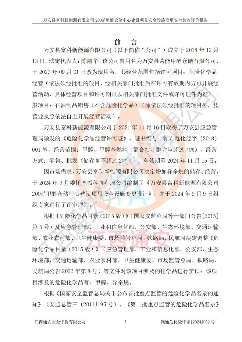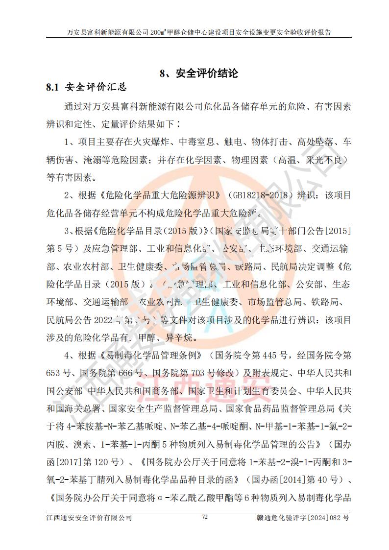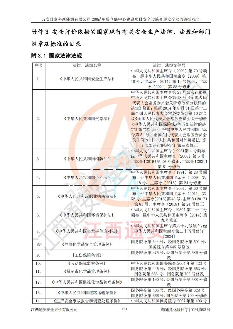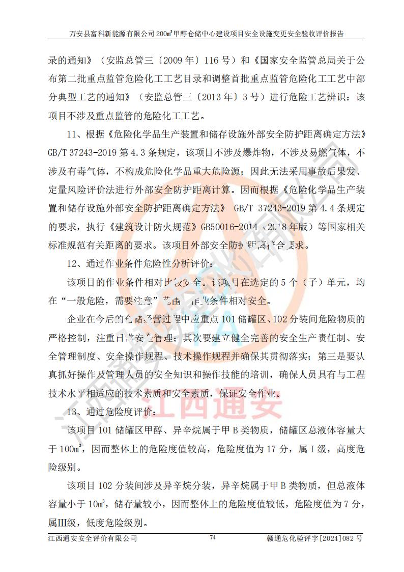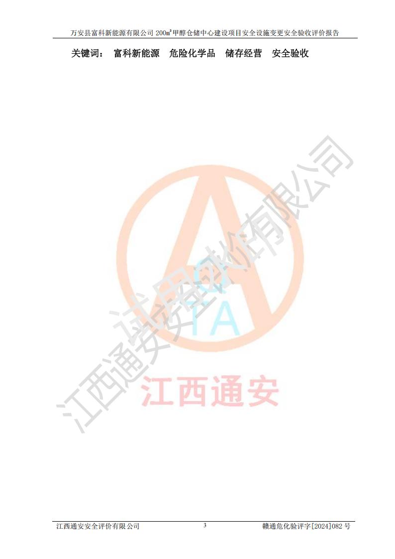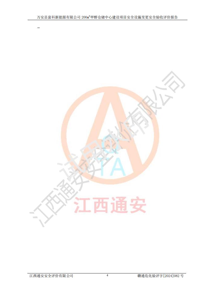 評價報告名稱 | 萬安縣富科新能源有限公司200m3甲醇倉儲中心建設項目安全設施變更安全驗收評價報告 | |||