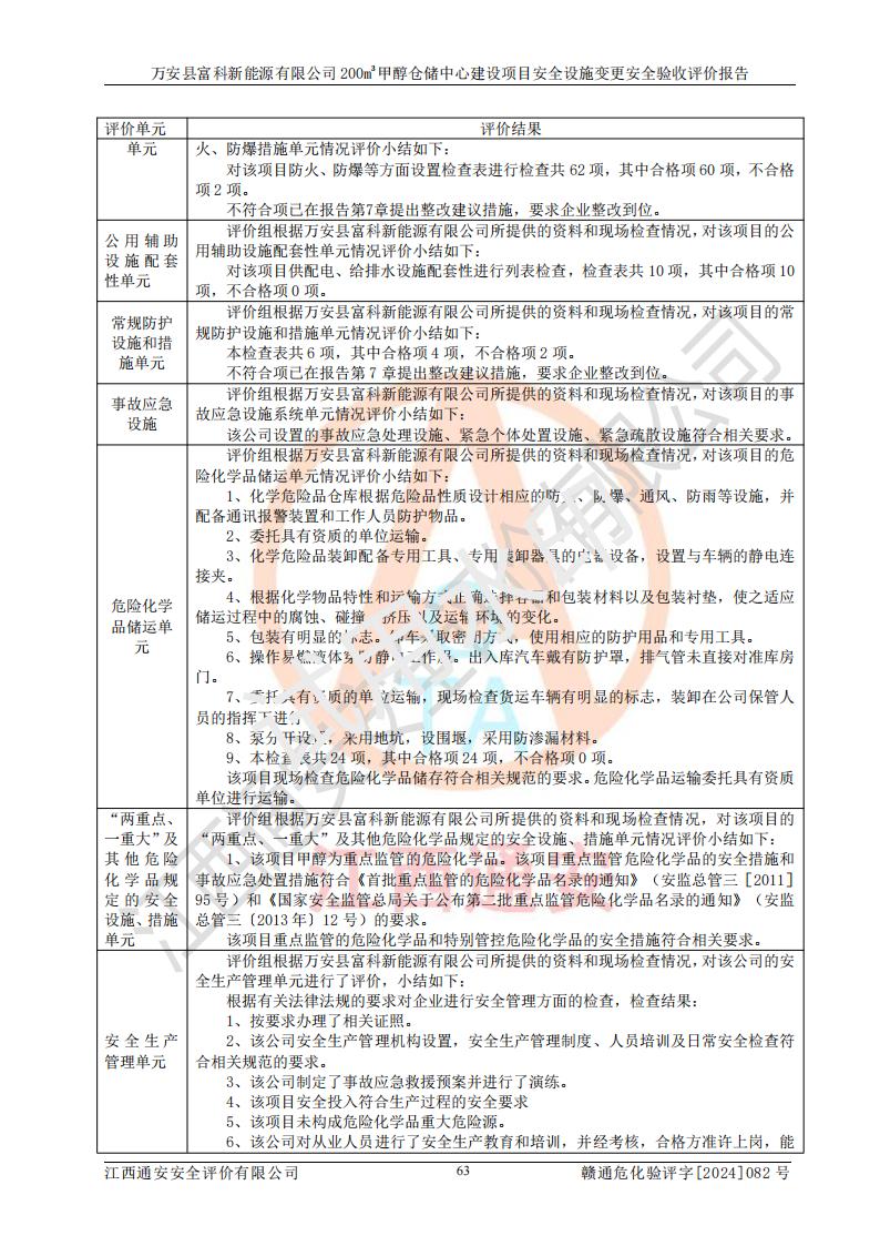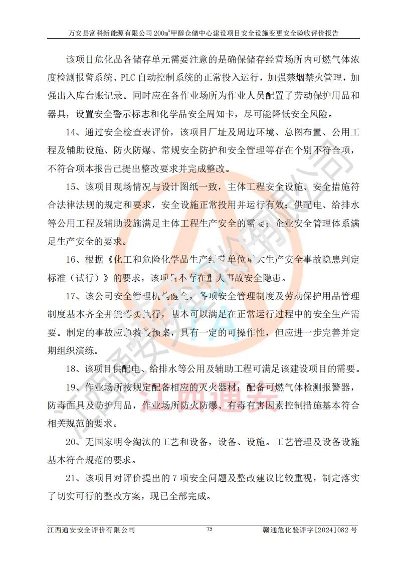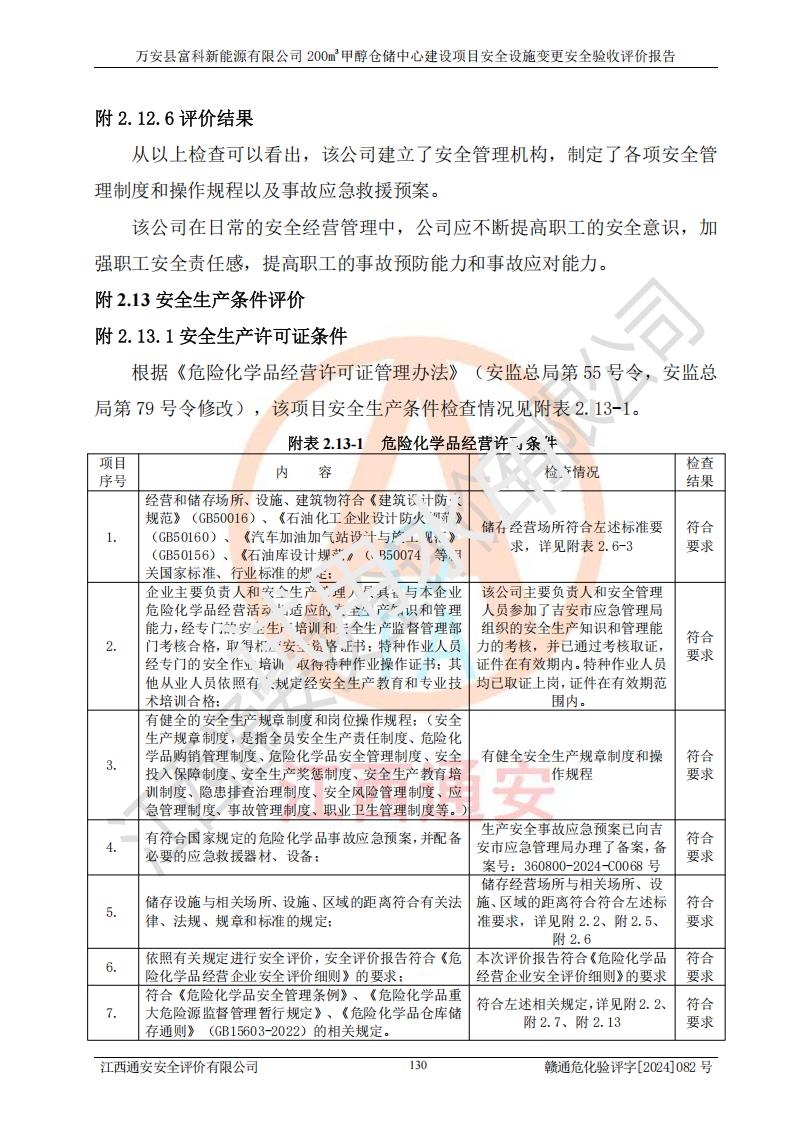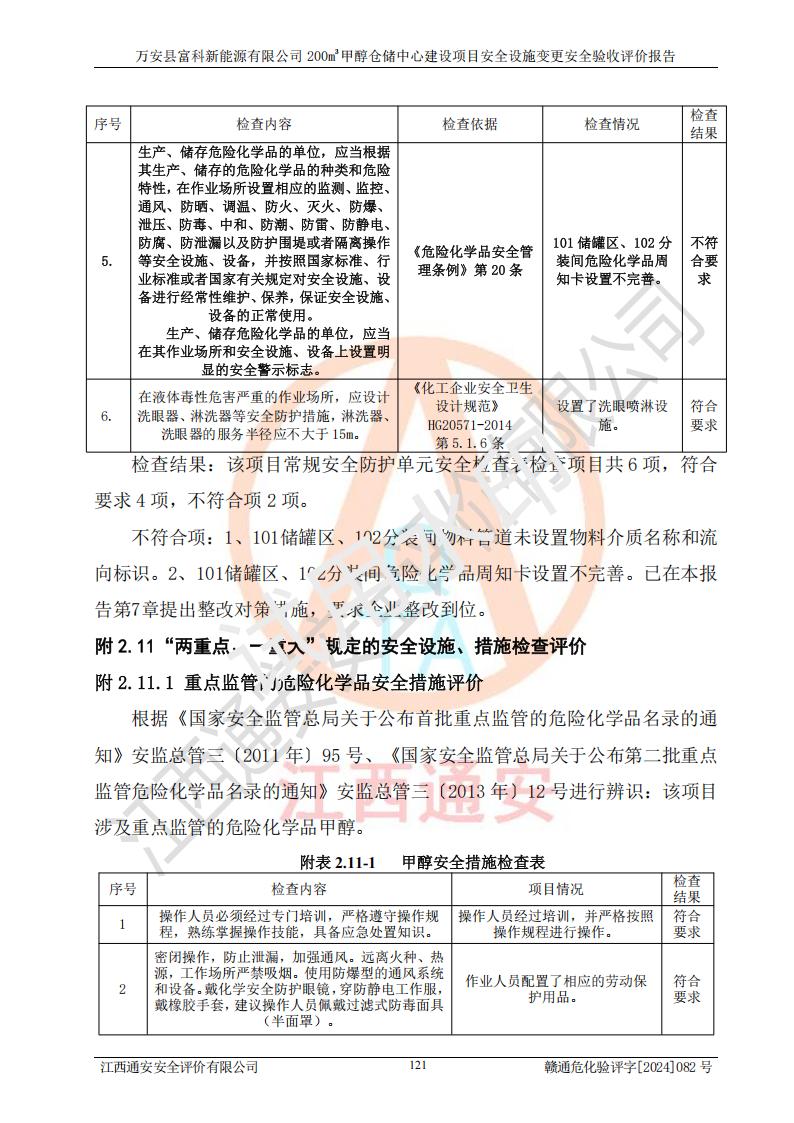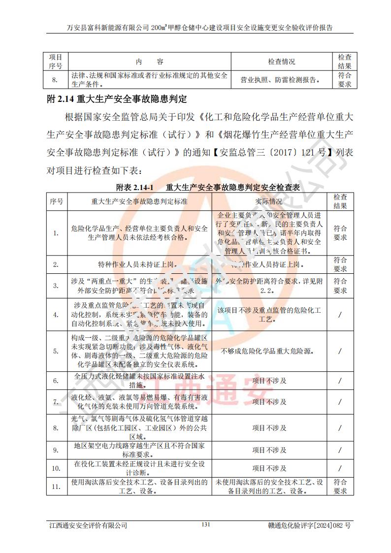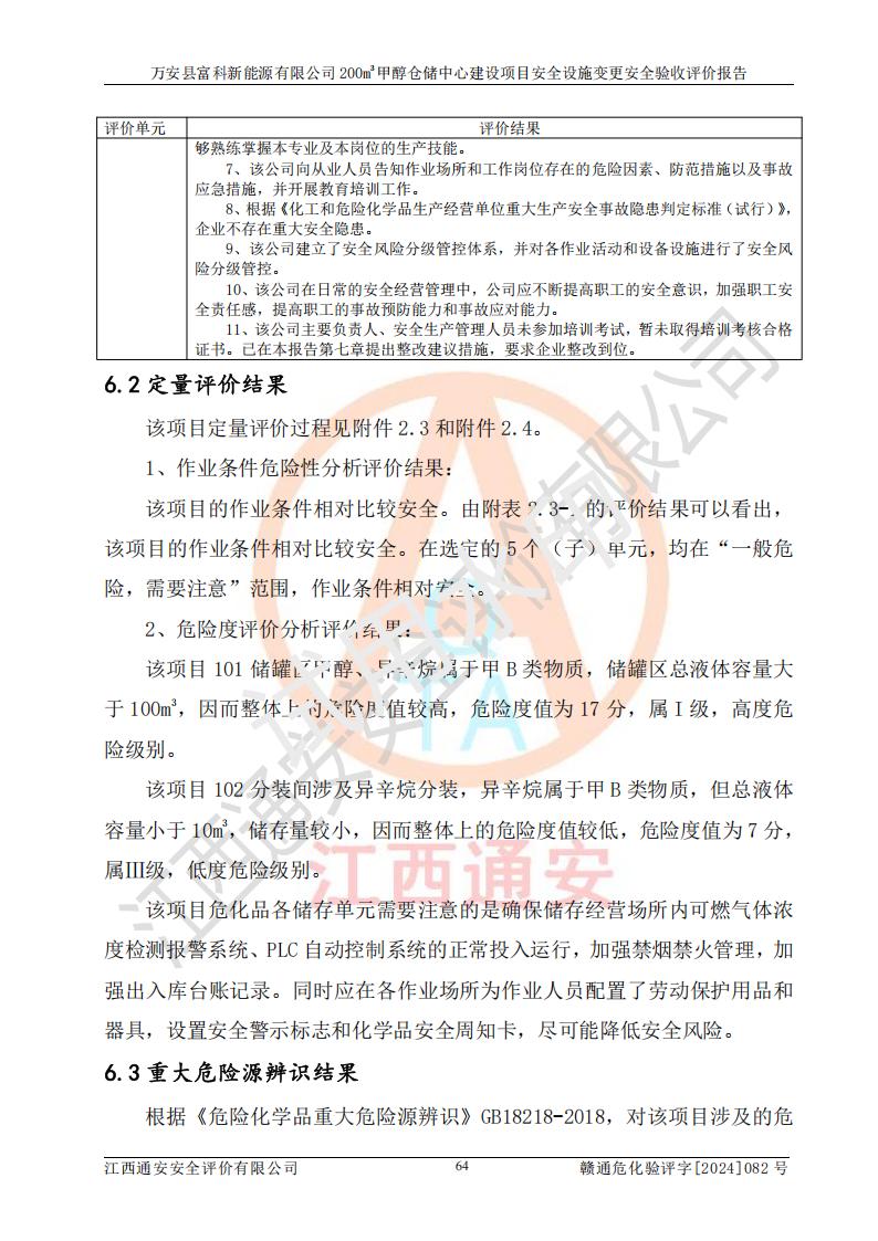 評價結論 | 1、萬安縣富科新能源有限公司200m3甲醇倉儲中心建設項目安全設施變更設計各儲存經(jīng)營單元的安全設施與主體工程同時設計、同時施工、同時投入使用,符合**有關建設項目“三同時”的規(guī)定和要求。 2、萬安縣富科新能源有限公司200m3甲醇倉儲中心建設項目安全設施變更的主體工程安全設施、安全措施符合法律法規(guī)的規(guī)定和要求,并運行**;公用工程及輔助設施滿足主體工程生產(chǎn)安全的需要;企業(yè)安全管理體系滿足生產(chǎn)安全的要求。 3、萬安縣富科新能源有限公司已針對本報告提出的安全隱患整改意見組織人員進行整改,經(jīng)過整改已落實到位,企業(yè)安全生產(chǎn)的風險控制在可以接受的范圍內。 綜上所述,萬安縣富科新能源有限公司200m3甲醇倉儲中心建設項目安全設施變更相關的設備設施和安全設施運行正常,企業(yè)安全管理機制運行正常,安全設施、措施達到規(guī)范要求和預期結果,可以滿足該項目危險化學品儲存經(jīng)營的要求,安全管理**。萬安縣富科新能源有限公司200m3甲醇倉儲中心建設項目安全設施變更具備安全設施竣工驗收條件。 | |||