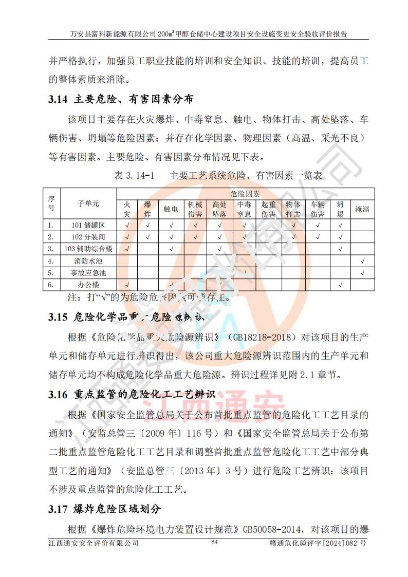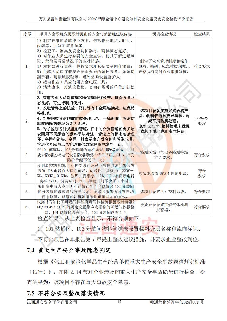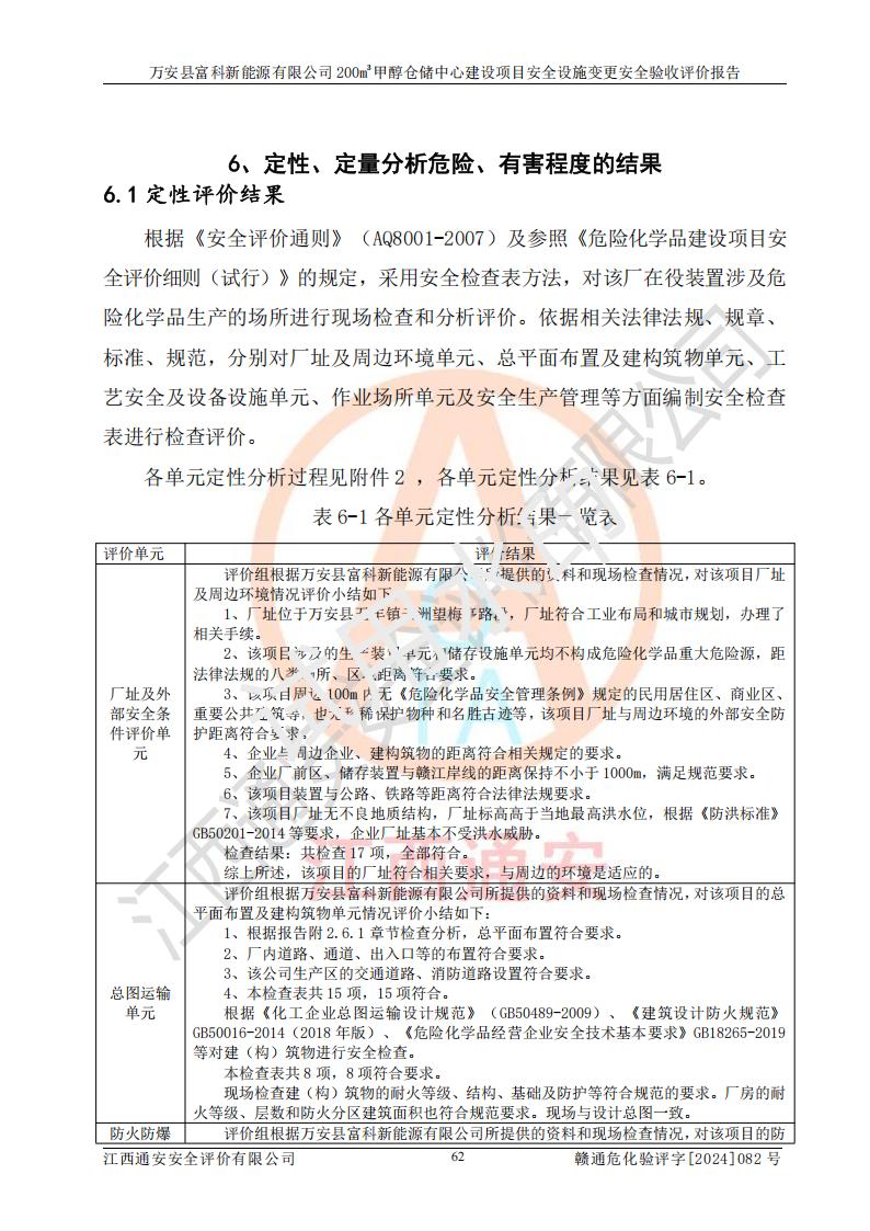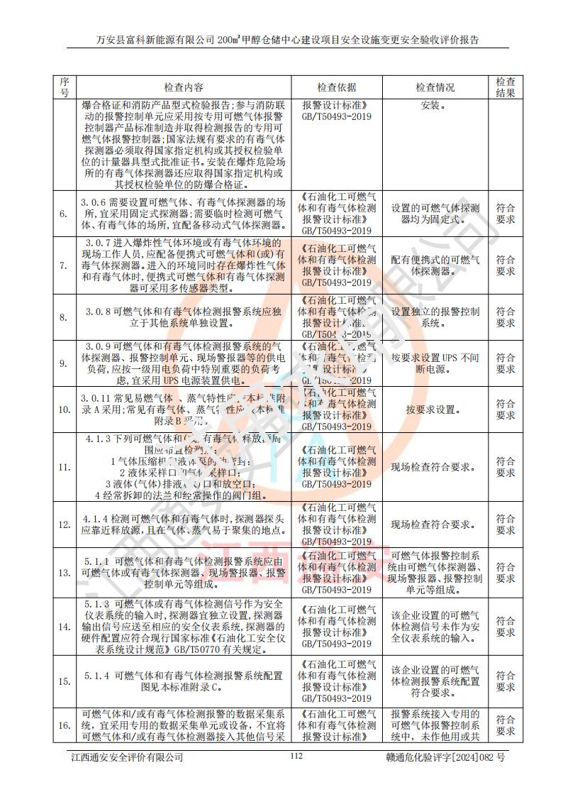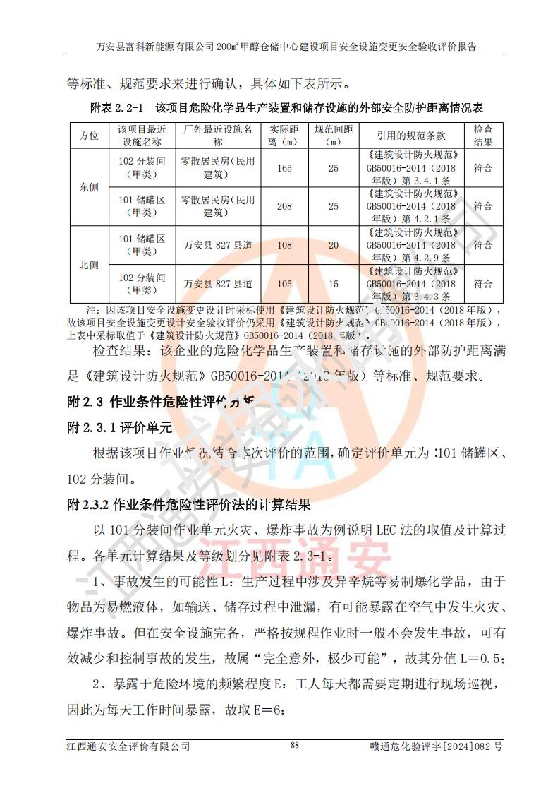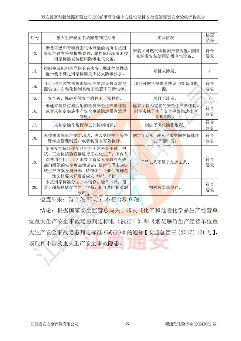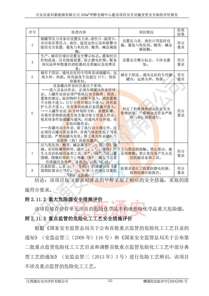 評價結論 | 1、萬安縣富科新能源有限公司200m3甲醇倉儲中心建設項目安全設施變更設計各儲存經(jīng)營單元的安全設施與主體工程同時設計、同時施工、同時投入使用,符合**有關建設項目“三同時”的規(guī)定和要求。 2、萬安縣富科新能源有限公司200m3甲醇倉儲中心建設項目安全設施變更的主體工程安全設施、安全措施符合法律法規(guī)的規(guī)定和要求,并運行**;公用工程及輔助設施滿足主體工程生產(chǎn)安全的需要;企業(yè)安全管理體系滿足生產(chǎn)安全的要求。 3、萬安縣富科新能源有限公司已針對本報告提出的安全隱患整改意見組織人員進行整改,經(jīng)過整改已落實到位,企業(yè)安全生產(chǎn)的風險控制在可以接受的范圍內。 綜上所述,萬安縣富科新能源有限公司200m3甲醇倉儲中心建設項目安全設施變更相關的設備設施和安全設施運行正常,企業(yè)安全管理機制運行正常,安全設施、措施達到規(guī)范要求和預期結果,可以滿足該項目危險化學品儲存經(jīng)營的要求,安全管理**。萬安縣富科新能源有限公司200m3甲醇倉儲中心建設項目安全設施變更具備安全設施竣工驗收條件。 | |||