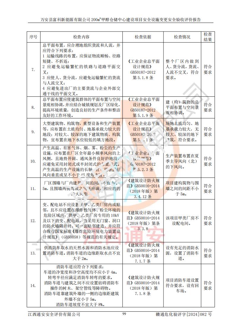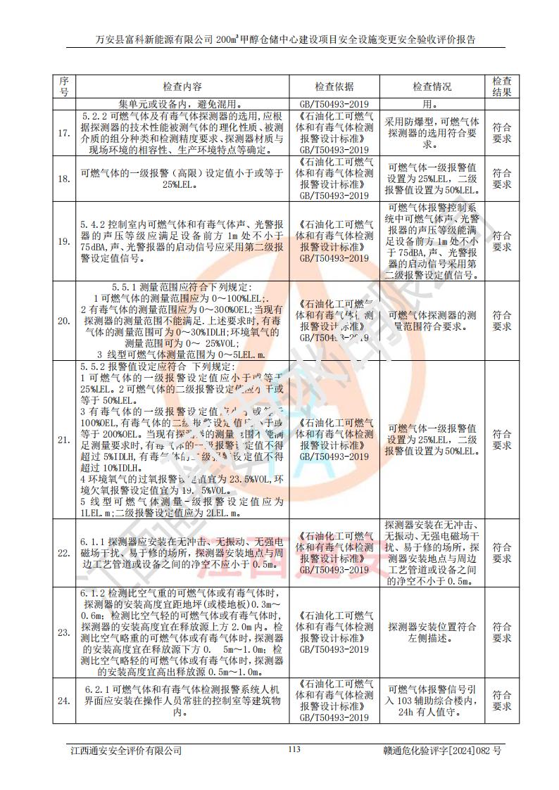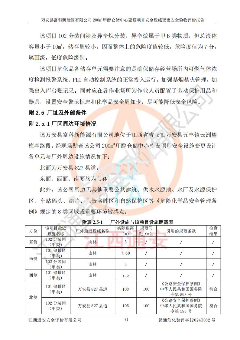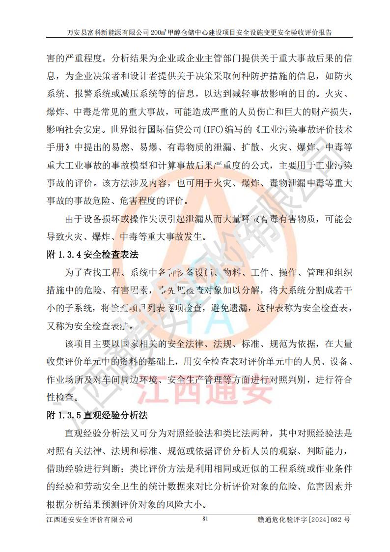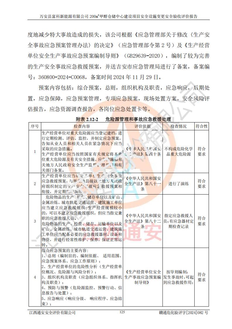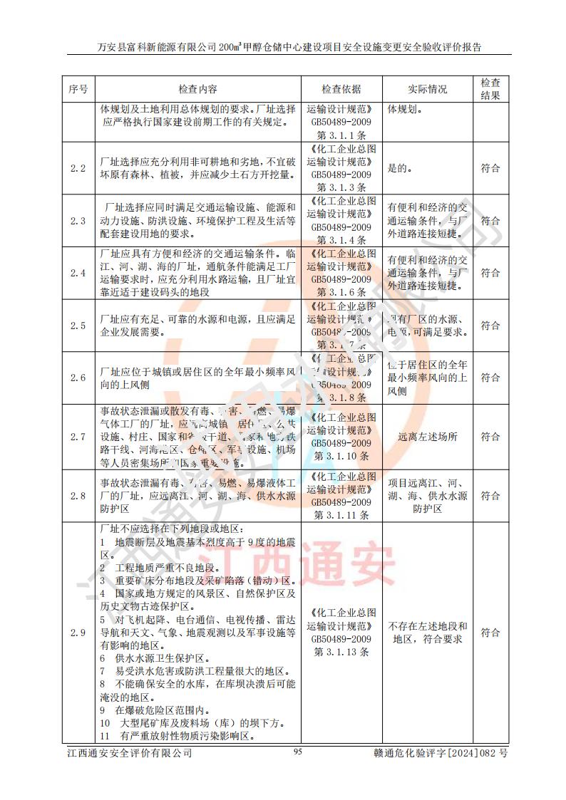 評價結論 | 1、萬安縣富科新能源有限公司200m3甲醇倉儲中心建設項目安全設施變更設計各儲存經(jīng)營單元的安全設施與主體工程同時設計、同時施工、同時投入使用,符合**有關建設項目“三同時”的規(guī)定和要求。 2、萬安縣富科新能源有限公司200m3甲醇倉儲中心建設項目安全設施變更的主體工程安全設施、安全措施符合法律法規(guī)的規(guī)定和要求,并運行**;公用工程及輔助設施滿足主體工程生產(chǎn)安全的需要;企業(yè)安全管理體系滿足生產(chǎn)安全的要求。 3、萬安縣富科新能源有限公司已針對本報告提出的安全隱患整改意見組織人員進行整改,經(jīng)過整改已落實到位,企業(yè)安全生產(chǎn)的風險控制在可以接受的范圍內。 綜上所述,萬安縣富科新能源有限公司200m3甲醇倉儲中心建設項目安全設施變更相關的設備設施和安全設施運行正常,企業(yè)安全管理機制運行正常,安全設施、措施達到規(guī)范要求和預期結果,可以滿足該項目危險化學品儲存經(jīng)營的要求,安全管理**。萬安縣富科新能源有限公司200m3甲醇倉儲中心建設項目安全設施變更具備安全設施竣工驗收條件。 | |||