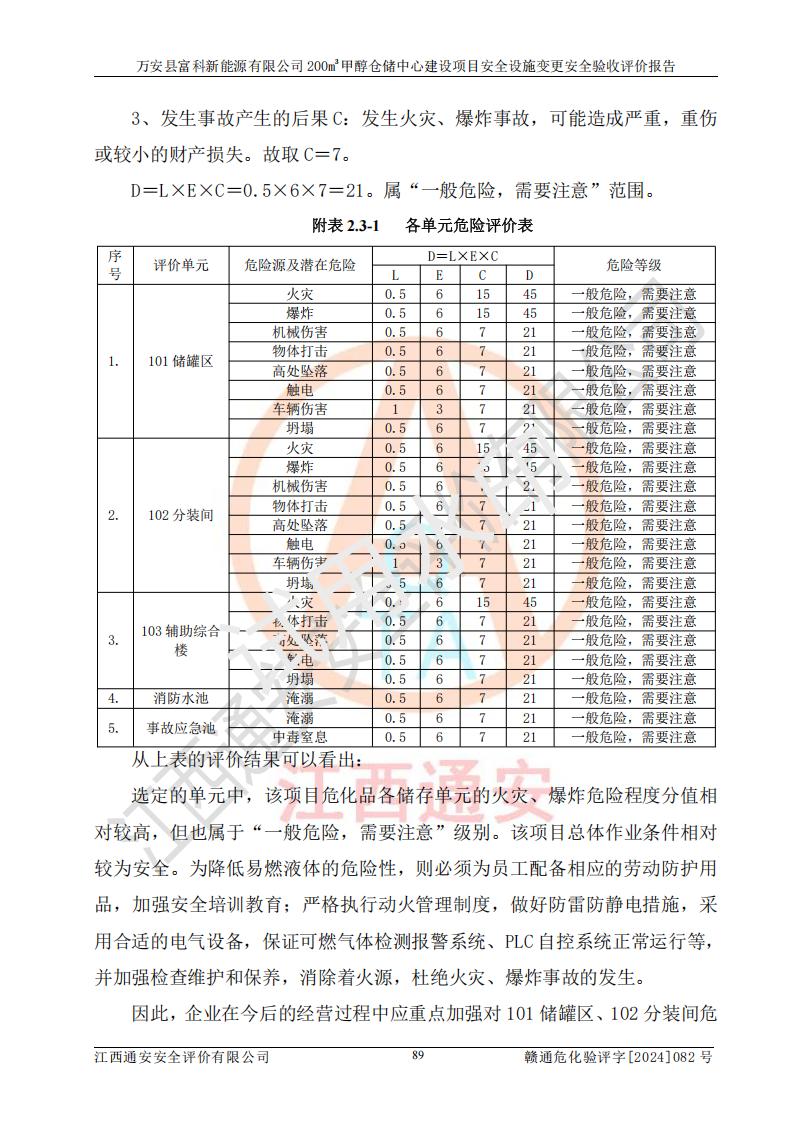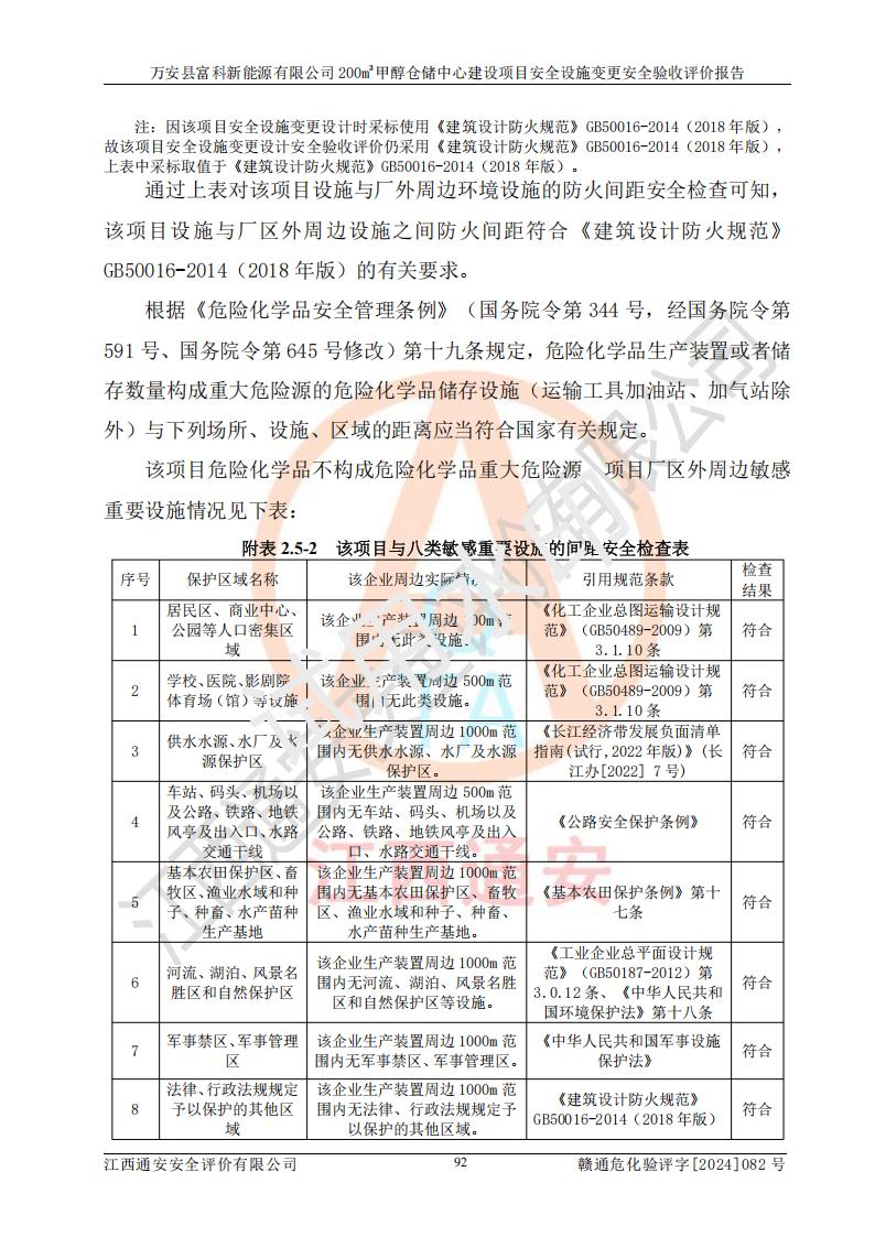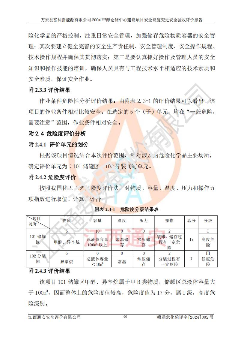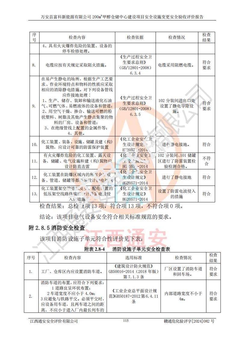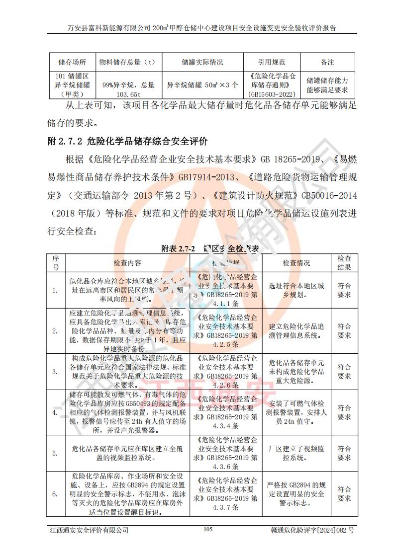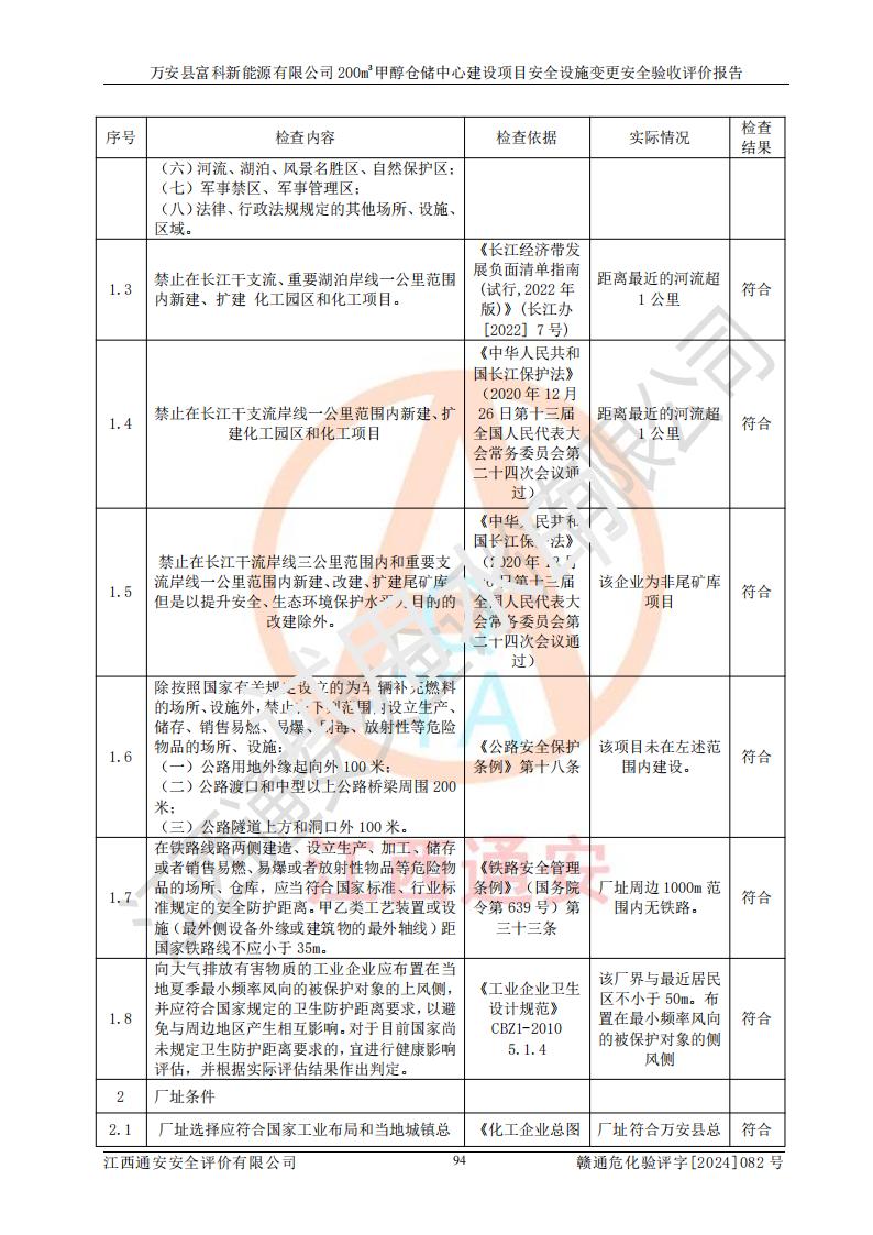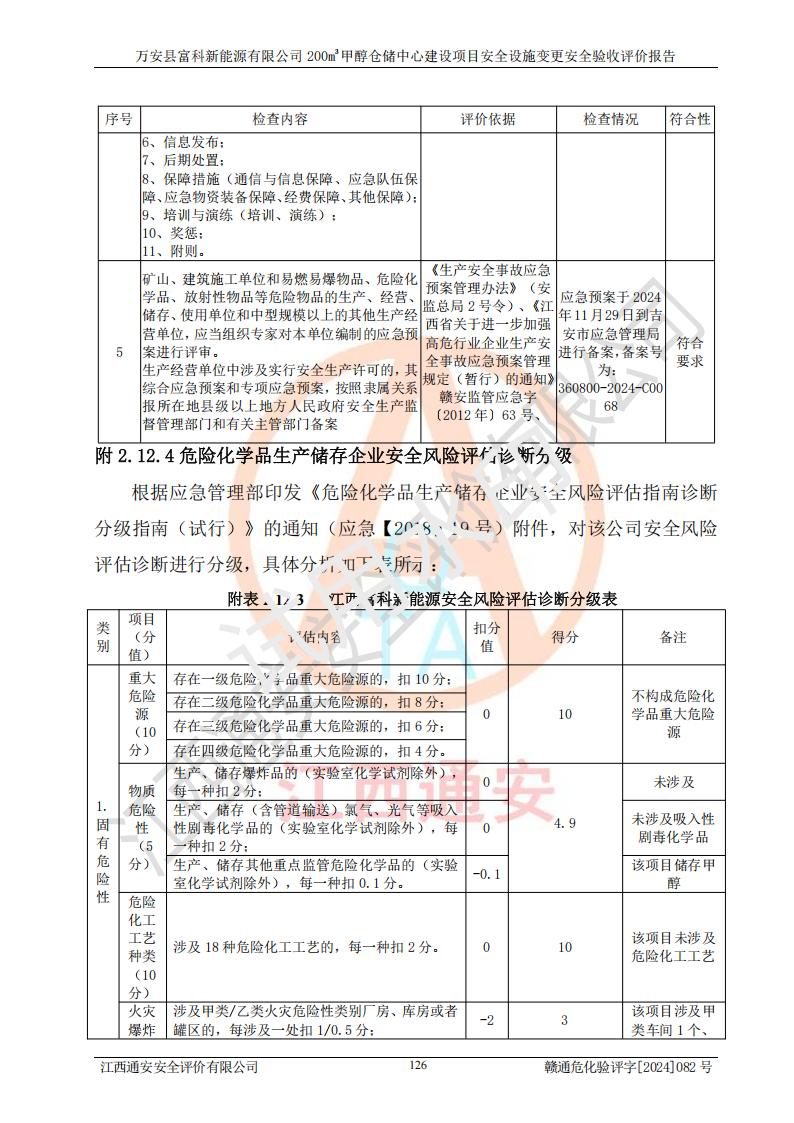 評價結論 | 1、萬安縣富科新能源有限公司200m3甲醇倉儲中心建設項目安全設施變更設計各儲存經(jīng)營單元的安全設施與主體工程同時設計、同時施工、同時投入使用,符合**有關建設項目“三同時”的規(guī)定和要求。 2、萬安縣富科新能源有限公司200m3甲醇倉儲中心建設項目安全設施變更的主體工程安全設施、安全措施符合法律法規(guī)的規(guī)定和要求,并運行**;公用工程及輔助設施滿足主體工程生產(chǎn)安全的需要;企業(yè)安全管理體系滿足生產(chǎn)安全的要求。 3、萬安縣富科新能源有限公司已針對本報告提出的安全隱患整改意見組織人員進行整改,經(jīng)過整改已落實到位,企業(yè)安全生產(chǎn)的風險控制在可以接受的范圍內。 綜上所述,萬安縣富科新能源有限公司200m3甲醇倉儲中心建設項目安全設施變更相關的設備設施和安全設施運行正常,企業(yè)安全管理機制運行正常,安全設施、措施達到規(guī)范要求和預期結果,可以滿足該項目危險化學品儲存經(jīng)營的要求,安全管理**。萬安縣富科新能源有限公司200m3甲醇倉儲中心建設項目安全設施變更具備安全設施竣工驗收條件。 | |||