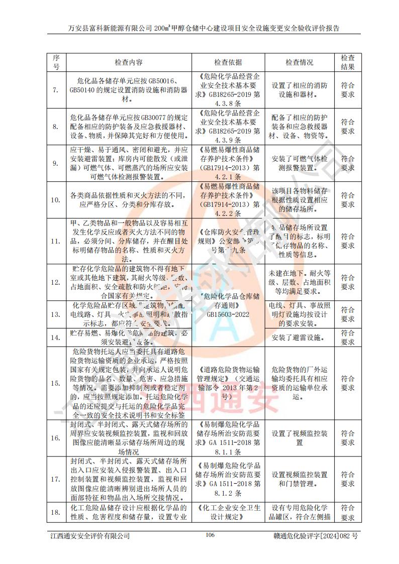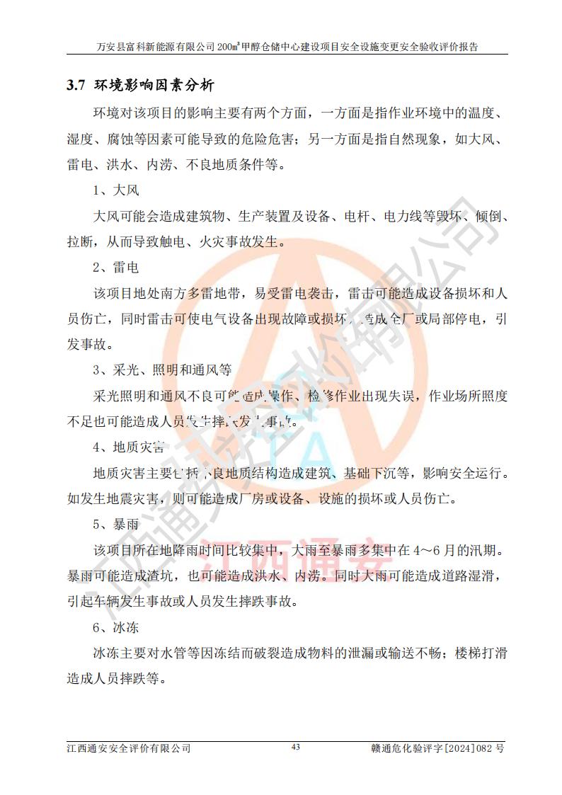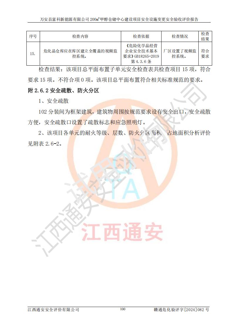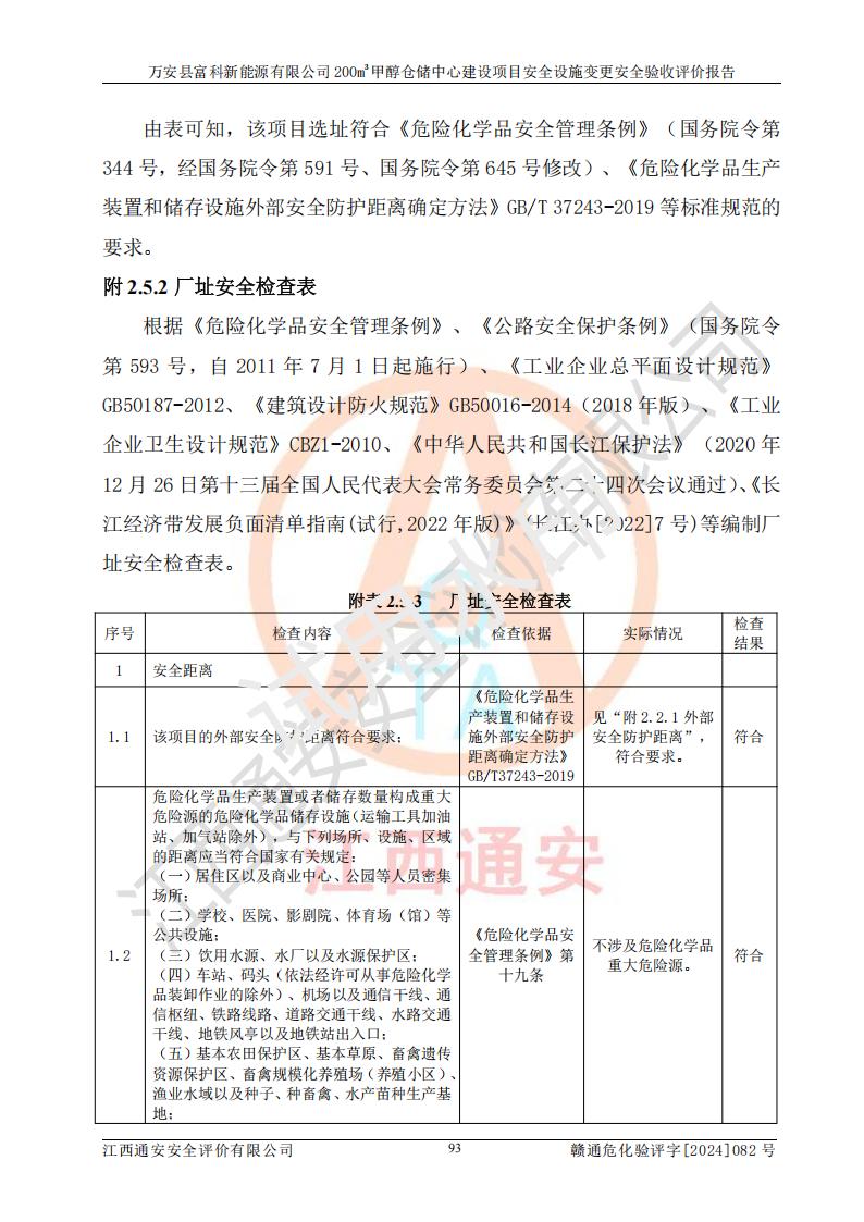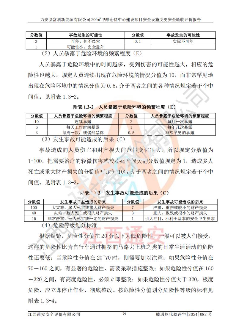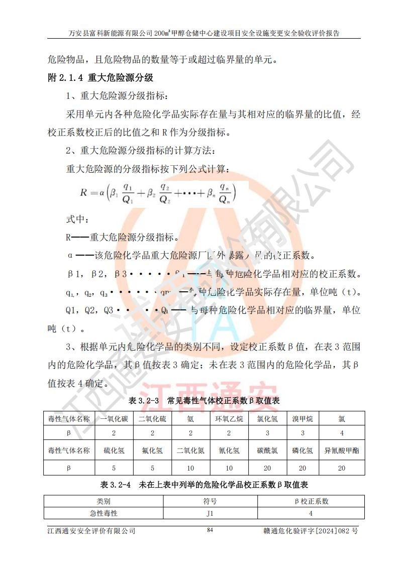 評價結論 | 1、萬安縣富科新能源有限公司200m3甲醇倉儲中心建設項目安全設施變更設計各儲存經(jīng)營單元的安全設施與主體工程同時設計、同時施工、同時投入使用,符合**有關建設項目“三同時”的規(guī)定和要求。 2、萬安縣富科新能源有限公司200m3甲醇倉儲中心建設項目安全設施變更的主體工程安全設施、安全措施符合法律法規(guī)的規(guī)定和要求,并運行**;公用工程及輔助設施滿足主體工程生產(chǎn)安全的需要;企業(yè)安全管理體系滿足生產(chǎn)安全的要求。 3、萬安縣富科新能源有限公司已針對本報告提出的安全隱患整改意見組織人員進行整改,經(jīng)過整改已落實到位,企業(yè)安全生產(chǎn)的風險控制在可以接受的范圍內。 綜上所述,萬安縣富科新能源有限公司200m3甲醇倉儲中心建設項目安全設施變更相關的設備設施和安全設施運行正常,企業(yè)安全管理機制運行正常,安全設施、措施達到規(guī)范要求和預期結果,可以滿足該項目危險化學品儲存經(jīng)營的要求,安全管理**。萬安縣富科新能源有限公司200m3甲醇倉儲中心建設項目安全設施變更具備安全設施竣工驗收條件。 | |||