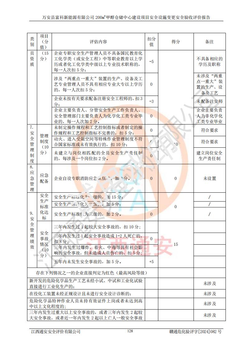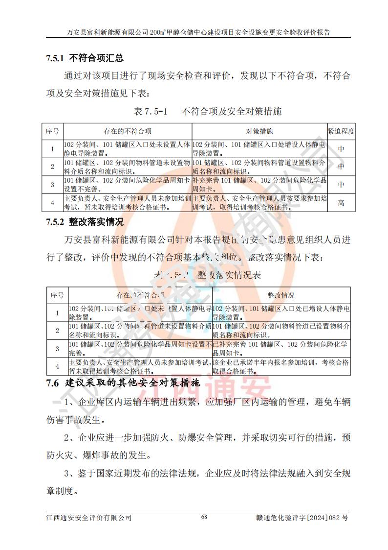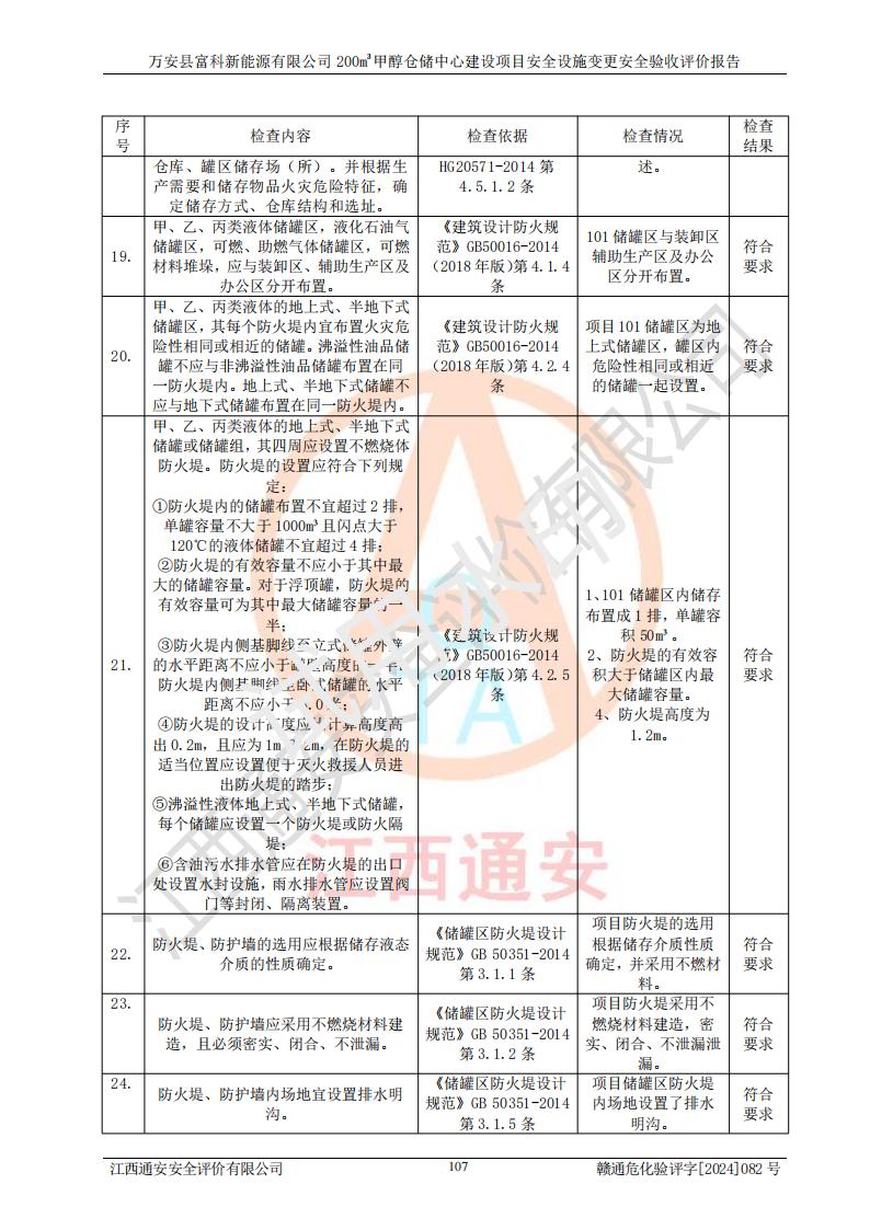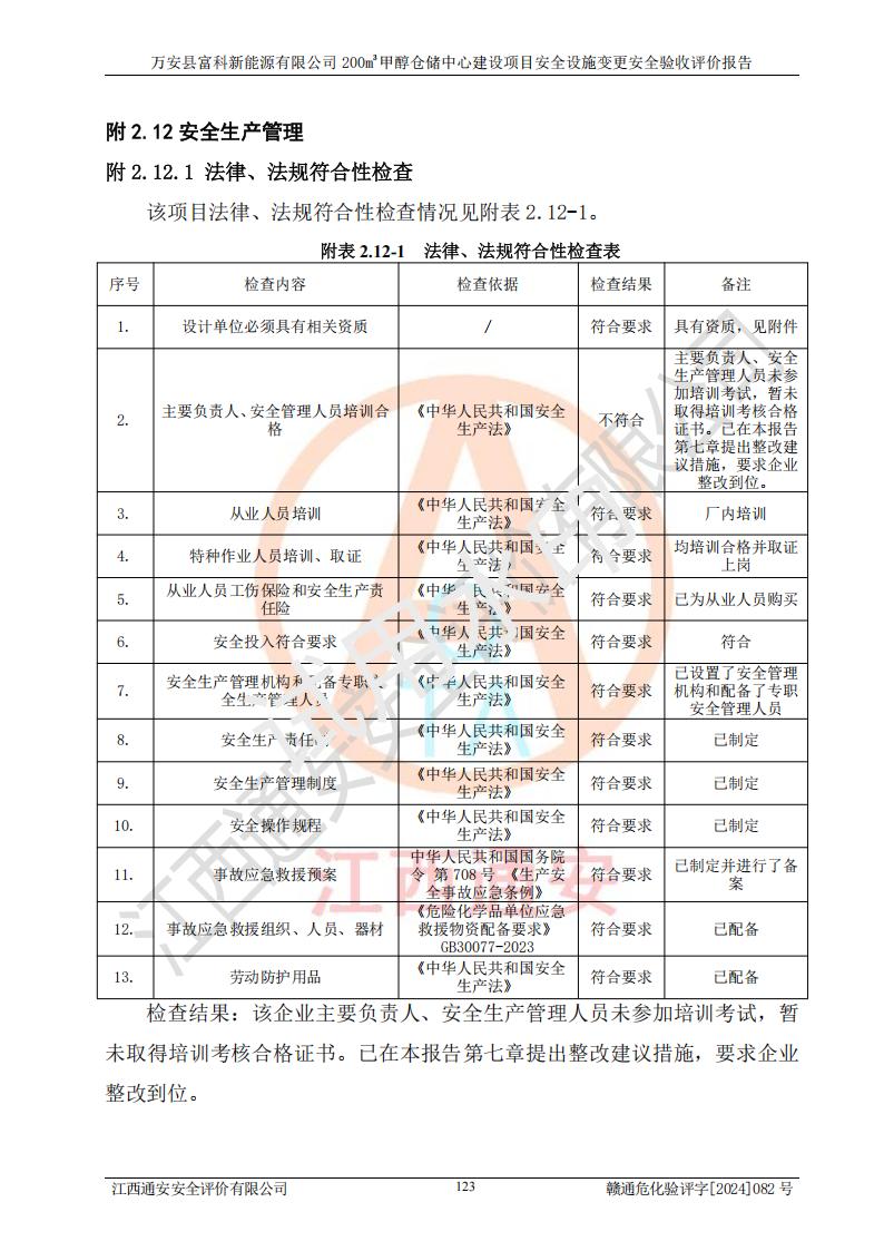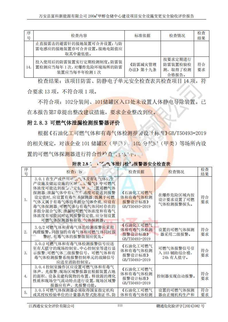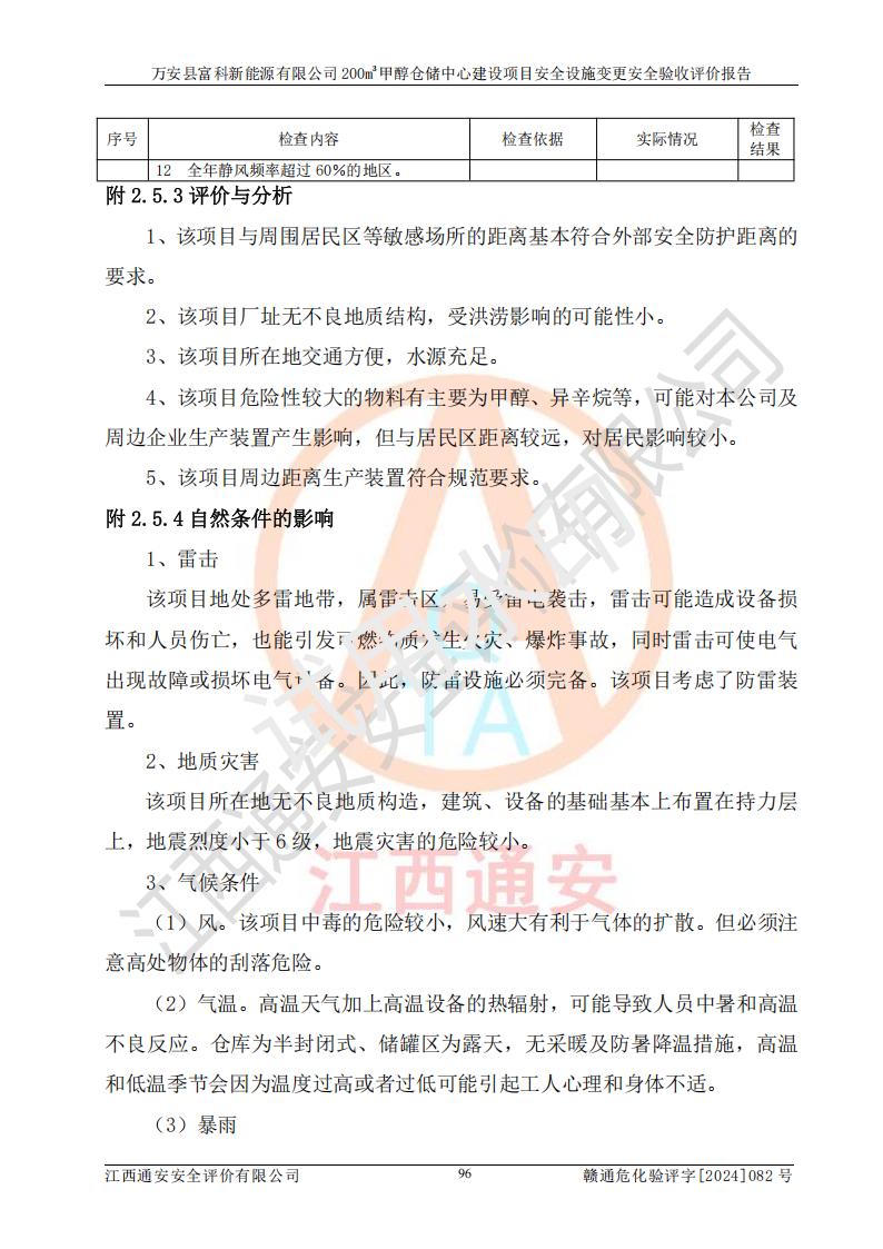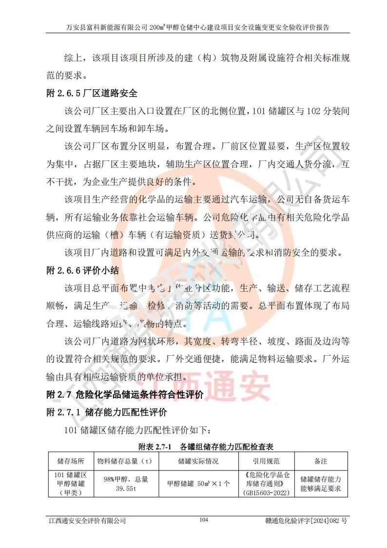 評價結論 | 1、萬安縣富科新能源有限公司200m3甲醇倉儲中心建設項目安全設施變更設計各儲存經(jīng)營單元的安全設施與主體工程同時設計、同時施工、同時投入使用,符合**有關建設項目“三同時”的規(guī)定和要求。 2、萬安縣富科新能源有限公司200m3甲醇倉儲中心建設項目安全設施變更的主體工程安全設施、安全措施符合法律法規(guī)的規(guī)定和要求,并運行**;公用工程及輔助設施滿足主體工程生產(chǎn)安全的需要;企業(yè)安全管理體系滿足生產(chǎn)安全的要求。 3、萬安縣富科新能源有限公司已針對本報告提出的安全隱患整改意見組織人員進行整改,經(jīng)過整改已落實到位,企業(yè)安全生產(chǎn)的風險控制在可以接受的范圍內。 綜上所述,萬安縣富科新能源有限公司200m3甲醇倉儲中心建設項目安全設施變更相關的設備設施和安全設施運行正常,企業(yè)安全管理機制運行正常,安全設施、措施達到規(guī)范要求和預期結果,可以滿足該項目危險化學品儲存經(jīng)營的要求,安全管理**。萬安縣富科新能源有限公司200m3甲醇倉儲中心建設項目安全設施變更具備安全設施竣工驗收條件。 | |||