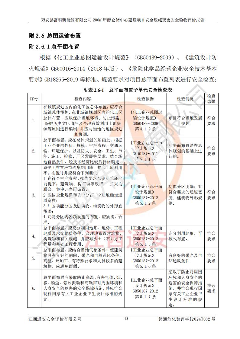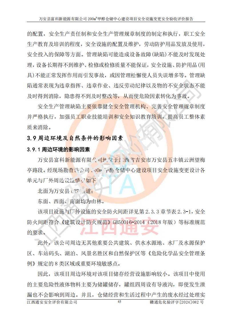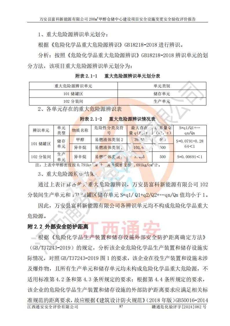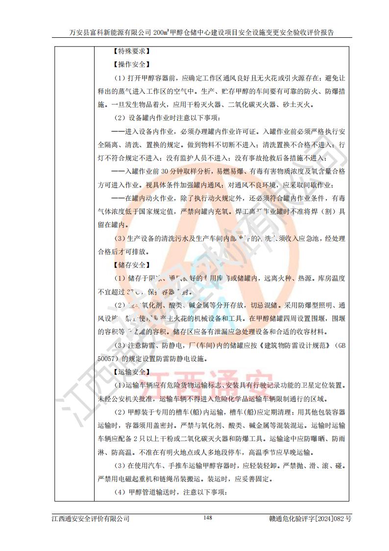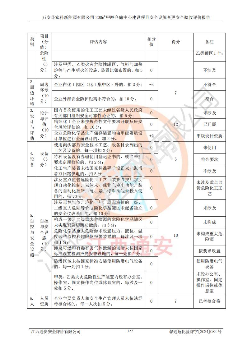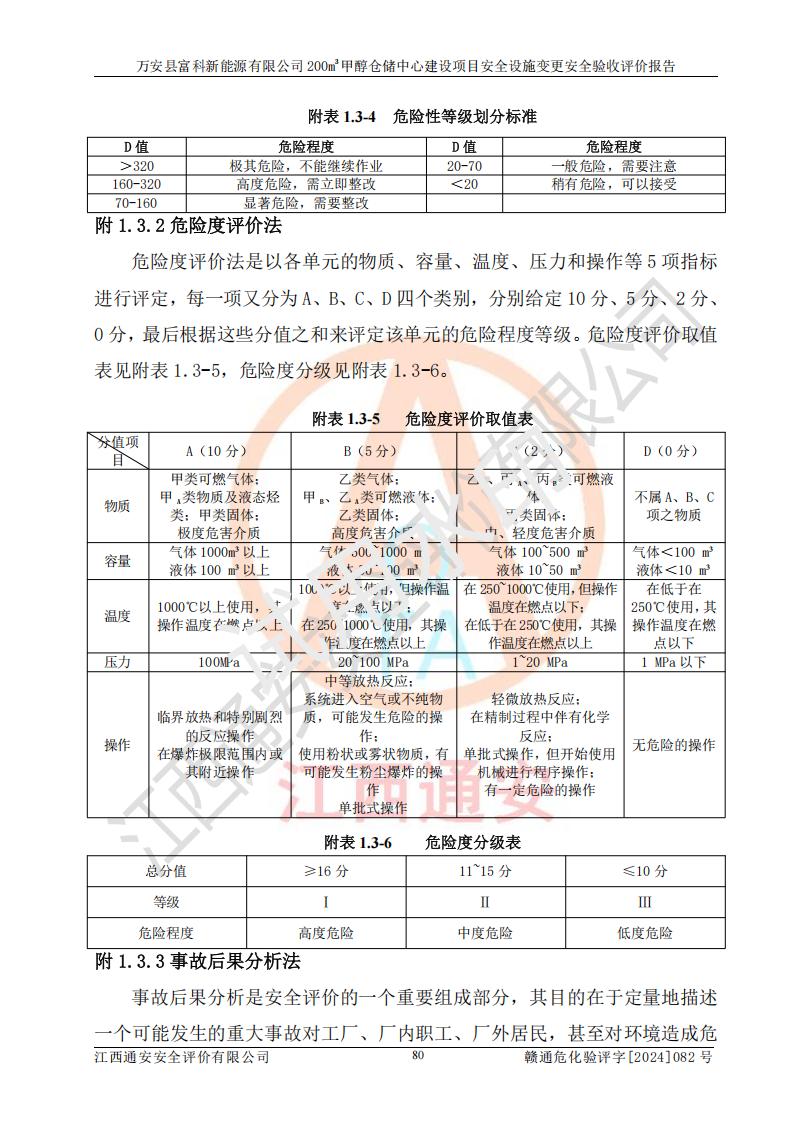 評價結論 | 1、萬安縣富科新能源有限公司200m3甲醇倉儲中心建設項目安全設施變更設計各儲存經(jīng)營單元的安全設施與主體工程同時設計、同時施工、同時投入使用,符合**有關建設項目“三同時”的規(guī)定和要求。 2、萬安縣富科新能源有限公司200m3甲醇倉儲中心建設項目安全設施變更的主體工程安全設施、安全措施符合法律法規(guī)的規(guī)定和要求,并運行**;公用工程及輔助設施滿足主體工程生產(chǎn)安全的需要;企業(yè)安全管理體系滿足生產(chǎn)安全的要求。 3、萬安縣富科新能源有限公司已針對本報告提出的安全隱患整改意見組織人員進行整改,經(jīng)過整改已落實到位,企業(yè)安全生產(chǎn)的風險控制在可以接受的范圍內。 綜上所述,萬安縣富科新能源有限公司200m3甲醇倉儲中心建設項目安全設施變更相關的設備設施和安全設施運行正常,企業(yè)安全管理機制運行正常,安全設施、措施達到規(guī)范要求和預期結果,可以滿足該項目危險化學品儲存經(jīng)營的要求,安全管理**。萬安縣富科新能源有限公司200m3甲醇倉儲中心建設項目安全設施變更具備安全設施竣工驗收條件。 | |||