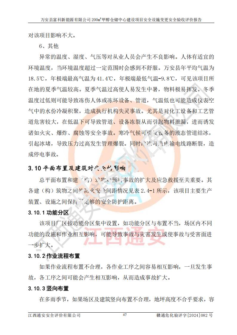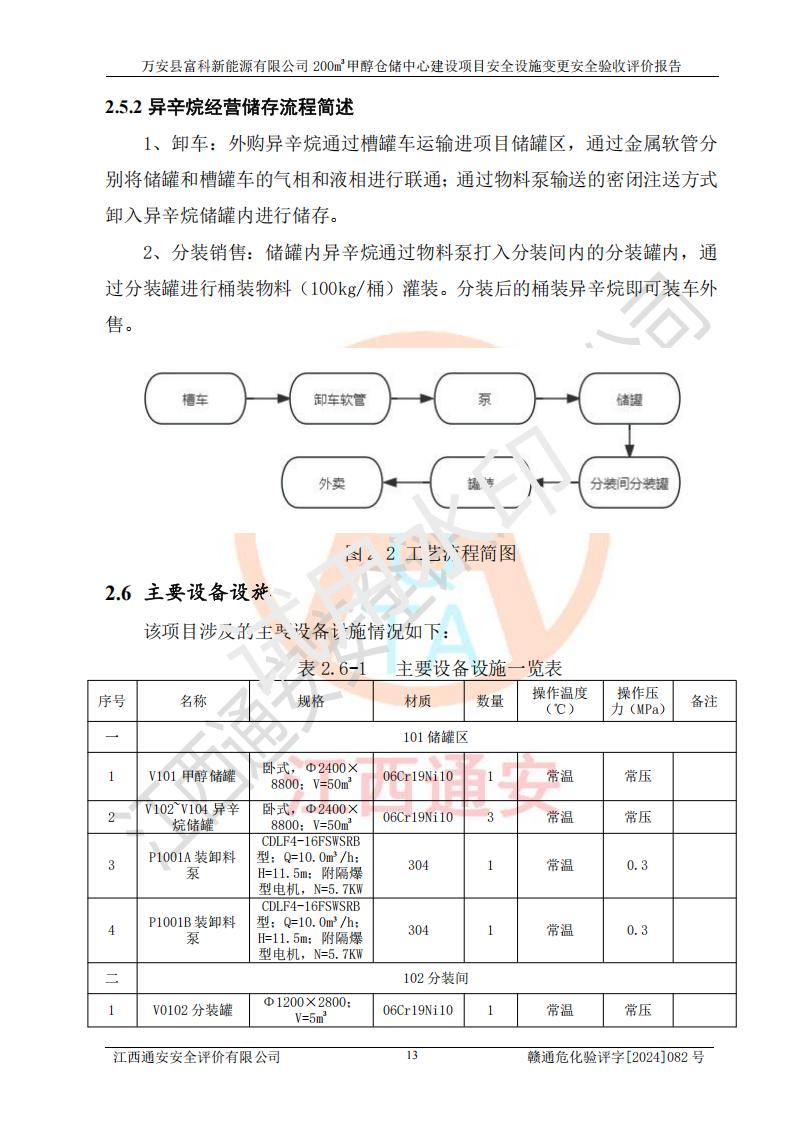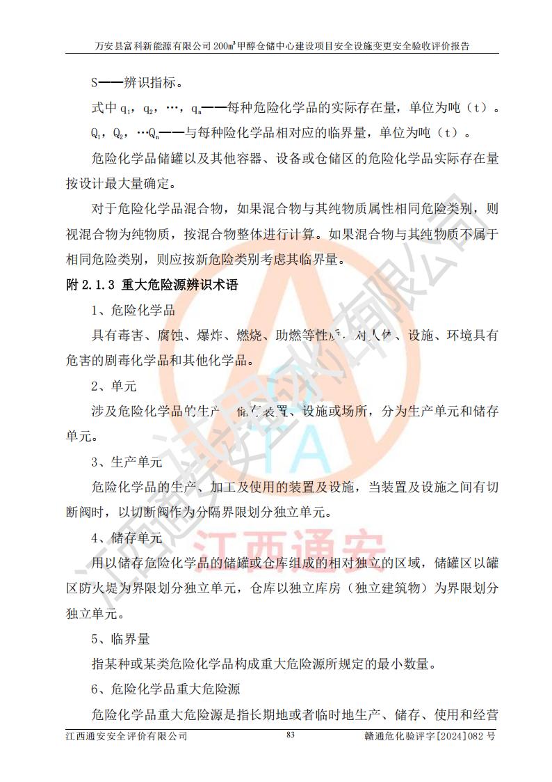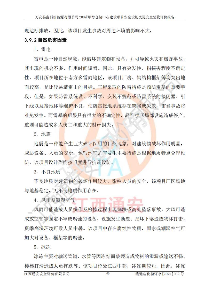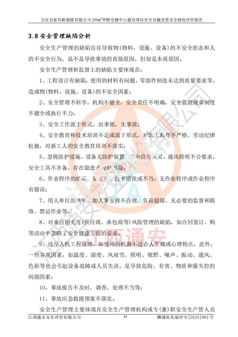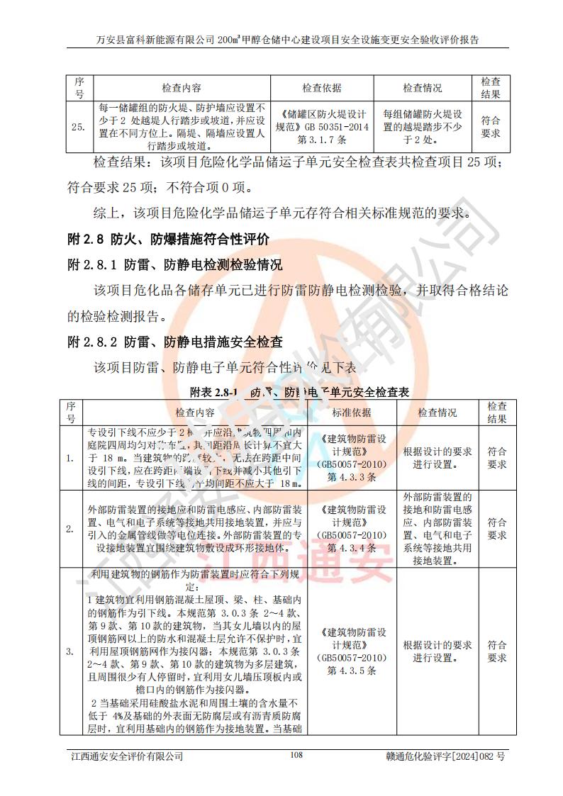 評價結論 | 1、萬安縣富科新能源有限公司200m3甲醇倉儲中心建設項目安全設施變更設計各儲存經(jīng)營單元的安全設施與主體工程同時設計、同時施工、同時投入使用,符合**有關建設項目“三同時”的規(guī)定和要求。 2、萬安縣富科新能源有限公司200m3甲醇倉儲中心建設項目安全設施變更的主體工程安全設施、安全措施符合法律法規(guī)的規(guī)定和要求,并運行**;公用工程及輔助設施滿足主體工程生產(chǎn)安全的需要;企業(yè)安全管理體系滿足生產(chǎn)安全的要求。 3、萬安縣富科新能源有限公司已針對本報告提出的安全隱患整改意見組織人員進行整改,經(jīng)過整改已落實到位,企業(yè)安全生產(chǎn)的風險控制在可以接受的范圍內。 綜上所述,萬安縣富科新能源有限公司200m3甲醇倉儲中心建設項目安全設施變更相關的設備設施和安全設施運行正常,企業(yè)安全管理機制運行正常,安全設施、措施達到規(guī)范要求和預期結果,可以滿足該項目危險化學品儲存經(jīng)營的要求,安全管理**。萬安縣富科新能源有限公司200m3甲醇倉儲中心建設項目安全設施變更具備安全設施竣工驗收條件。 | |||