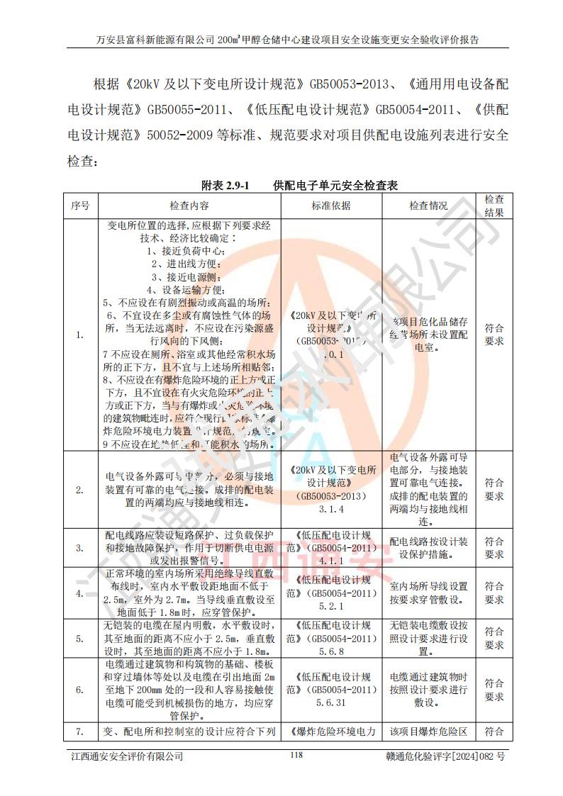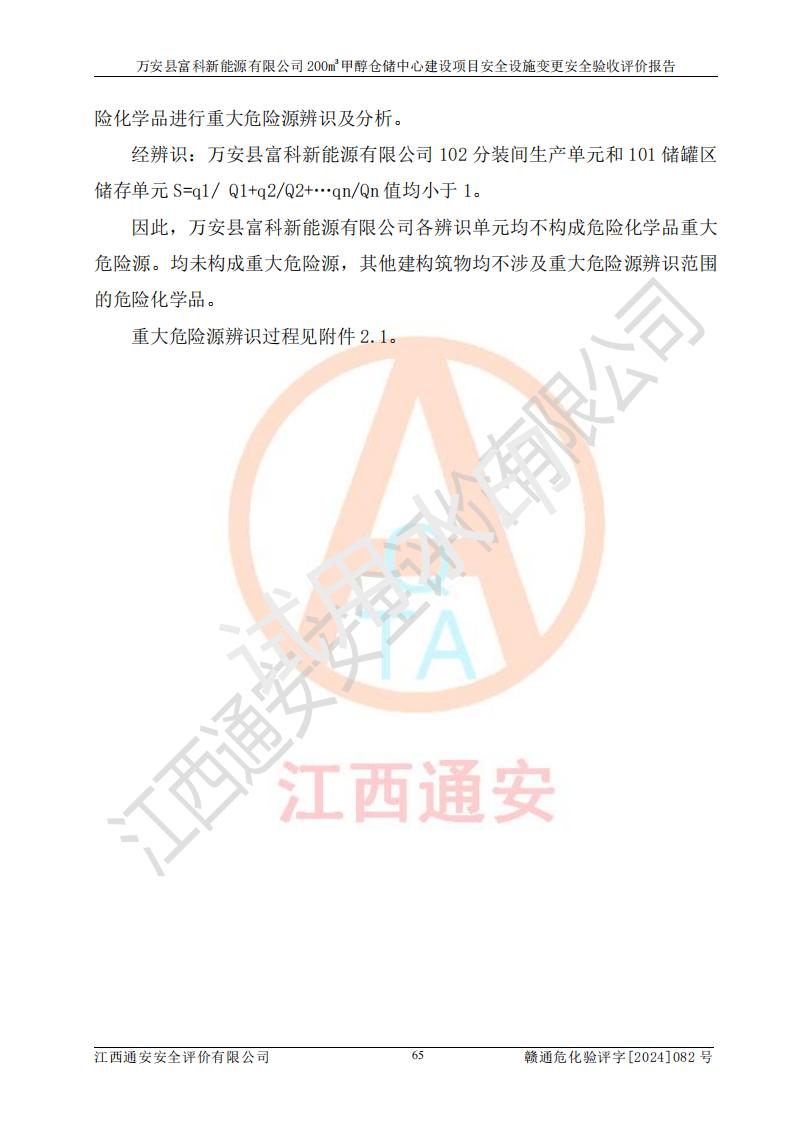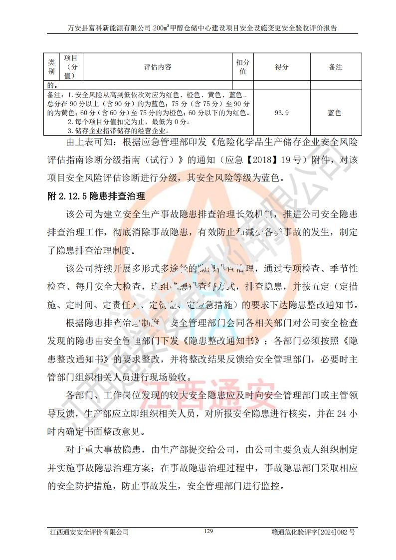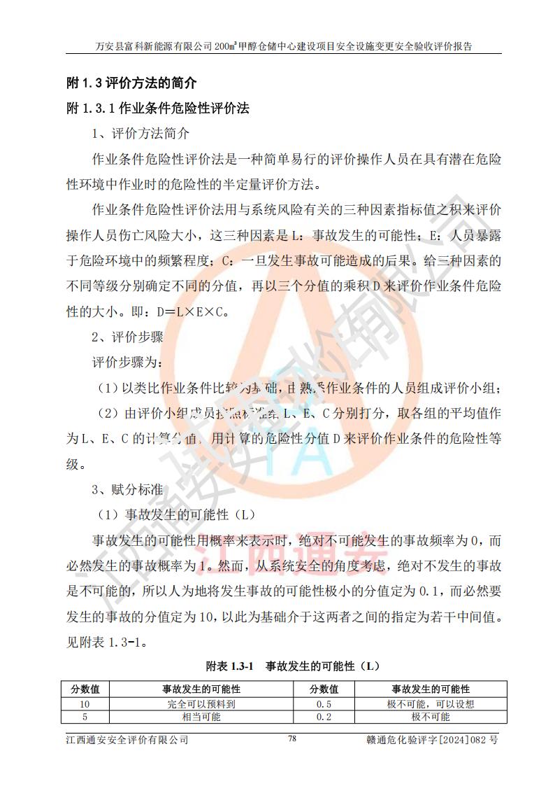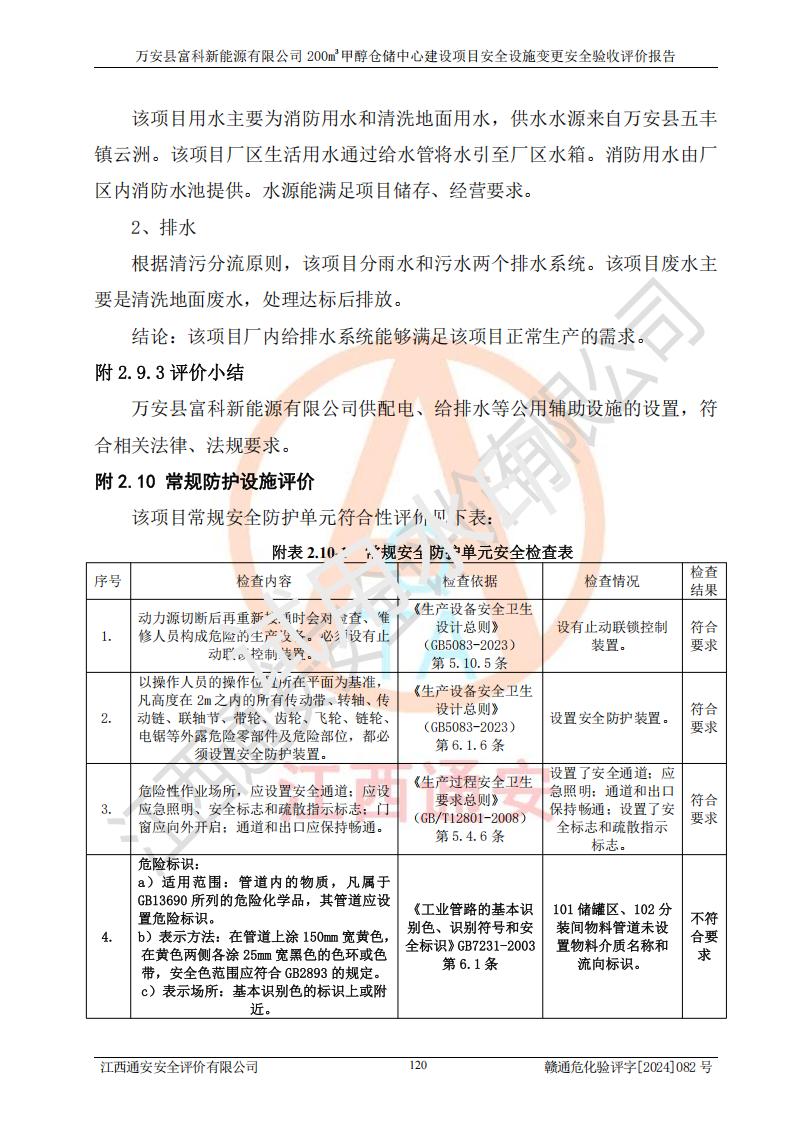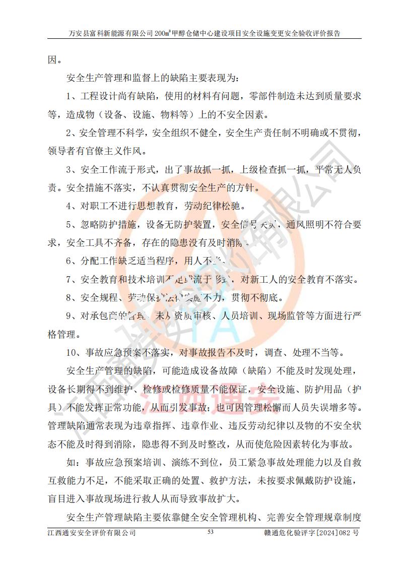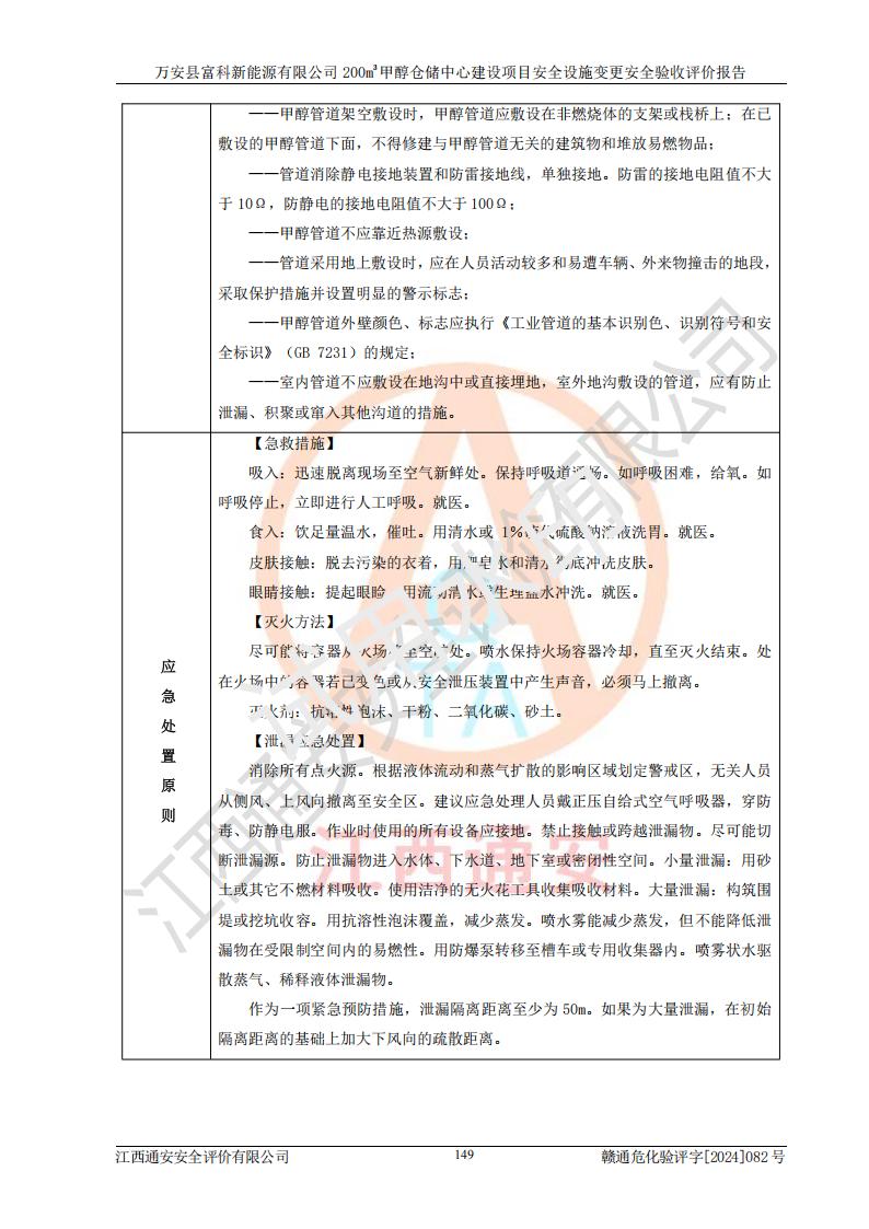 評價結論 | 1、萬安縣富科新能源有限公司200m3甲醇倉儲中心建設項目安全設施變更設計各儲存經(jīng)營單元的安全設施與主體工程同時設計、同時施工、同時投入使用,符合**有關建設項目“三同時”的規(guī)定和要求。 2、萬安縣富科新能源有限公司200m3甲醇倉儲中心建設項目安全設施變更的主體工程安全設施、安全措施符合法律法規(guī)的規(guī)定和要求,并運行**;公用工程及輔助設施滿足主體工程生產(chǎn)安全的需要;企業(yè)安全管理體系滿足生產(chǎn)安全的要求。 3、萬安縣富科新能源有限公司已針對本報告提出的安全隱患整改意見組織人員進行整改,經(jīng)過整改已落實到位,企業(yè)安全生產(chǎn)的風險控制在可以接受的范圍內。 綜上所述,萬安縣富科新能源有限公司200m3甲醇倉儲中心建設項目安全設施變更相關的設備設施和安全設施運行正常,企業(yè)安全管理機制運行正常,安全設施、措施達到規(guī)范要求和預期結果,可以滿足該項目危險化學品儲存經(jīng)營的要求,安全管理**。萬安縣富科新能源有限公司200m3甲醇倉儲中心建設項目安全設施變更具備安全設施竣工驗收條件。 | |||