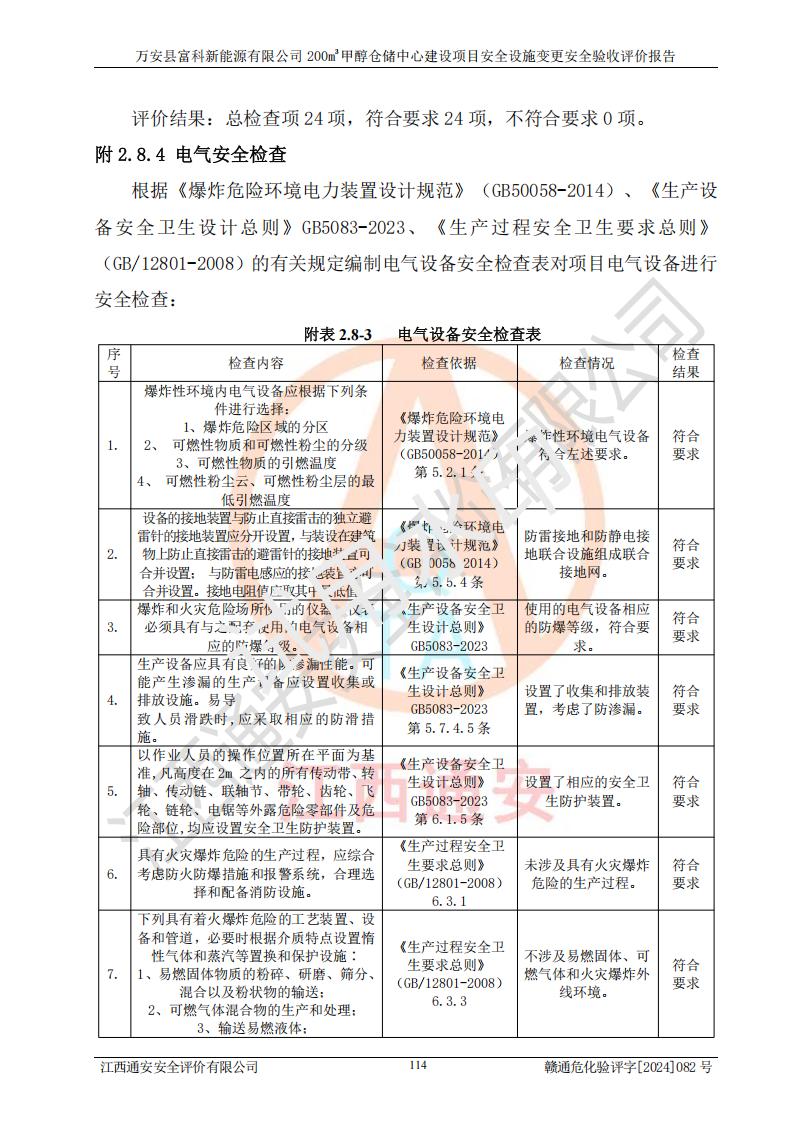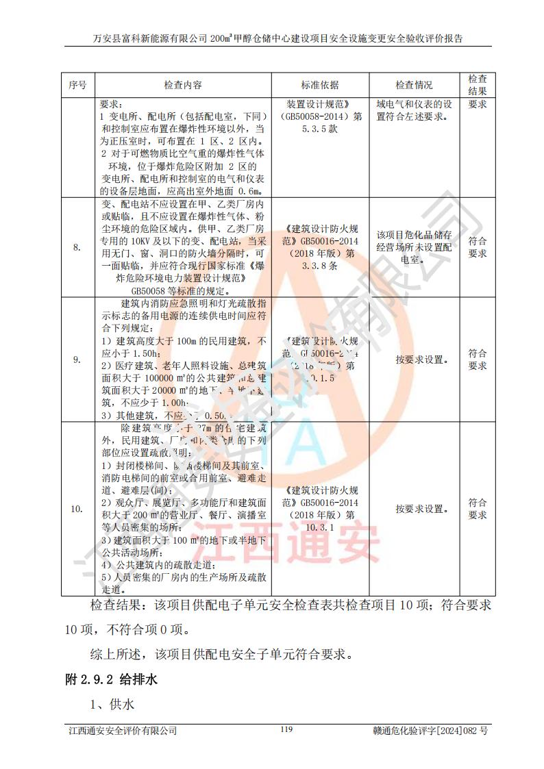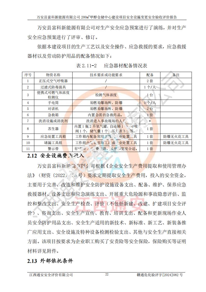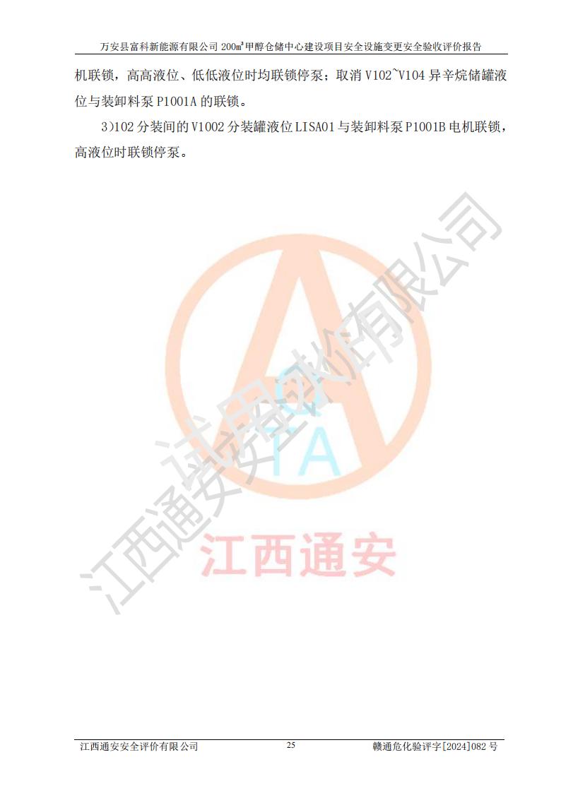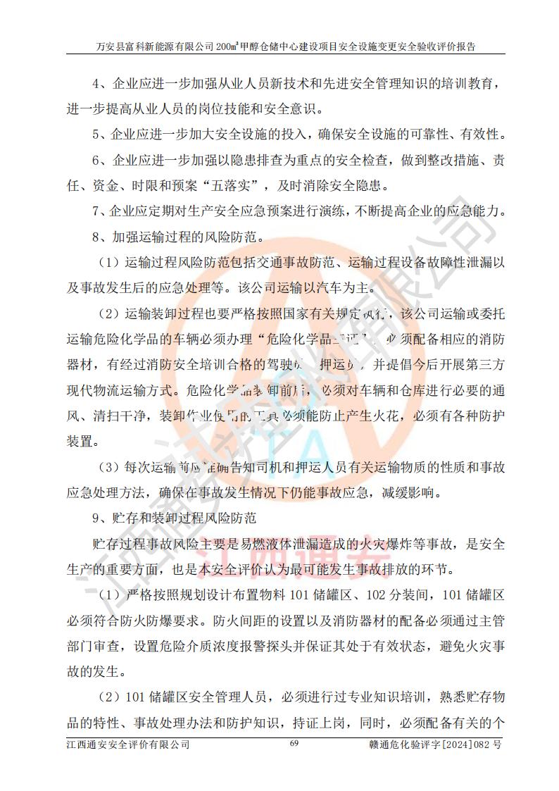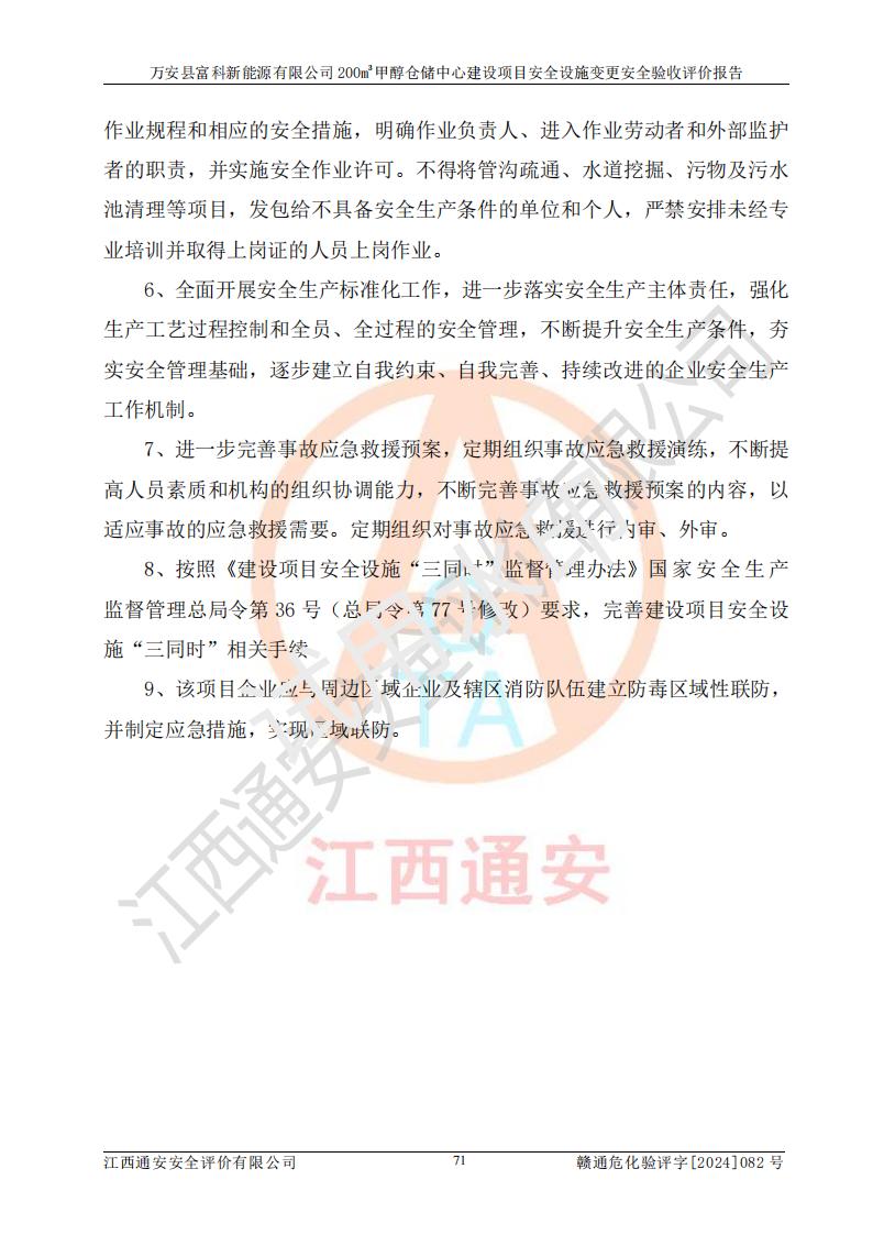 評價結論 | 1、萬安縣富科新能源有限公司200m3甲醇倉儲中心建設項目安全設施變更設計各儲存經(jīng)營單元的安全設施與主體工程同時設計、同時施工、同時投入使用,符合**有關建設項目“三同時”的規(guī)定和要求。 2、萬安縣富科新能源有限公司200m3甲醇倉儲中心建設項目安全設施變更的主體工程安全設施、安全措施符合法律法規(guī)的規(guī)定和要求,并運行**;公用工程及輔助設施滿足主體工程生產(chǎn)安全的需要;企業(yè)安全管理體系滿足生產(chǎn)安全的要求。 3、萬安縣富科新能源有限公司已針對本報告提出的安全隱患整改意見組織人員進行整改,經(jīng)過整改已落實到位,企業(yè)安全生產(chǎn)的風險控制在可以接受的范圍內。 綜上所述,萬安縣富科新能源有限公司200m3甲醇倉儲中心建設項目安全設施變更相關的設備設施和安全設施運行正常,企業(yè)安全管理機制運行正常,安全設施、措施達到規(guī)范要求和預期結果,可以滿足該項目危險化學品儲存經(jīng)營的要求,安全管理**。萬安縣富科新能源有限公司200m3甲醇倉儲中心建設項目安全設施變更具備安全設施竣工驗收條件。 | |||