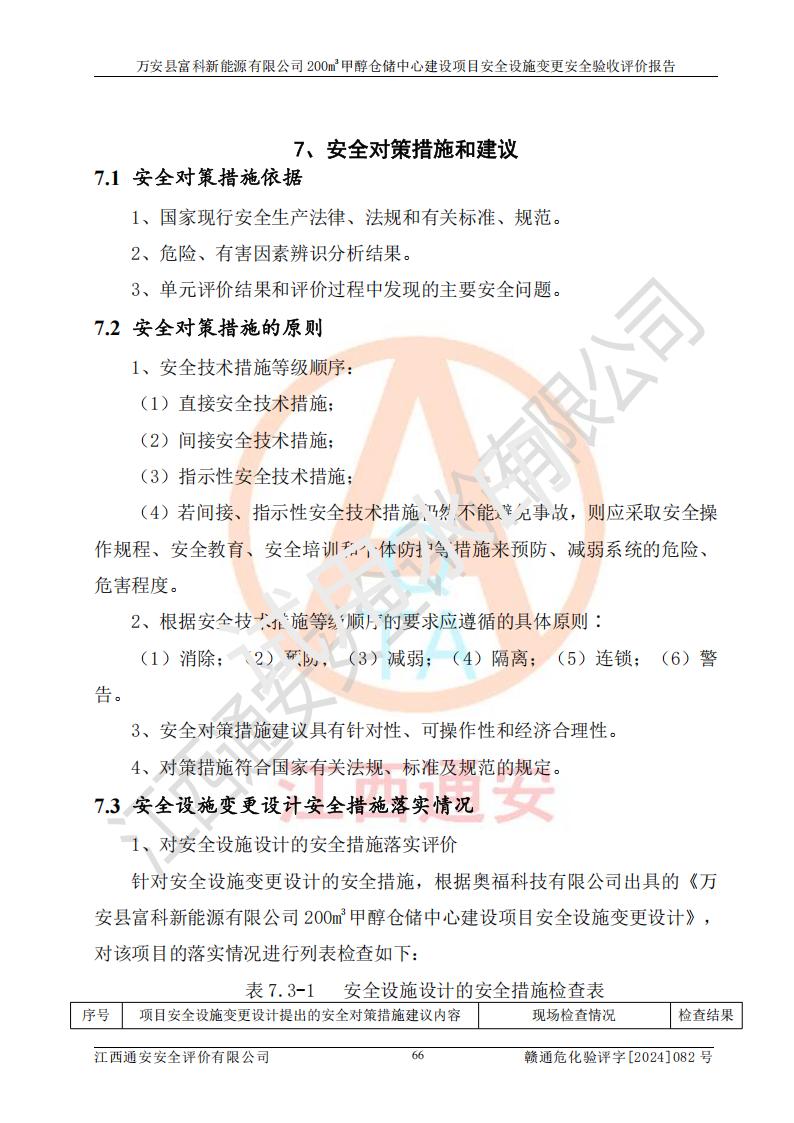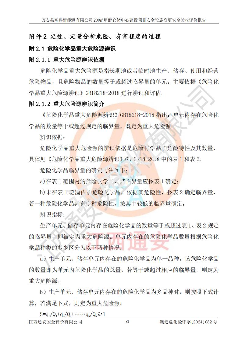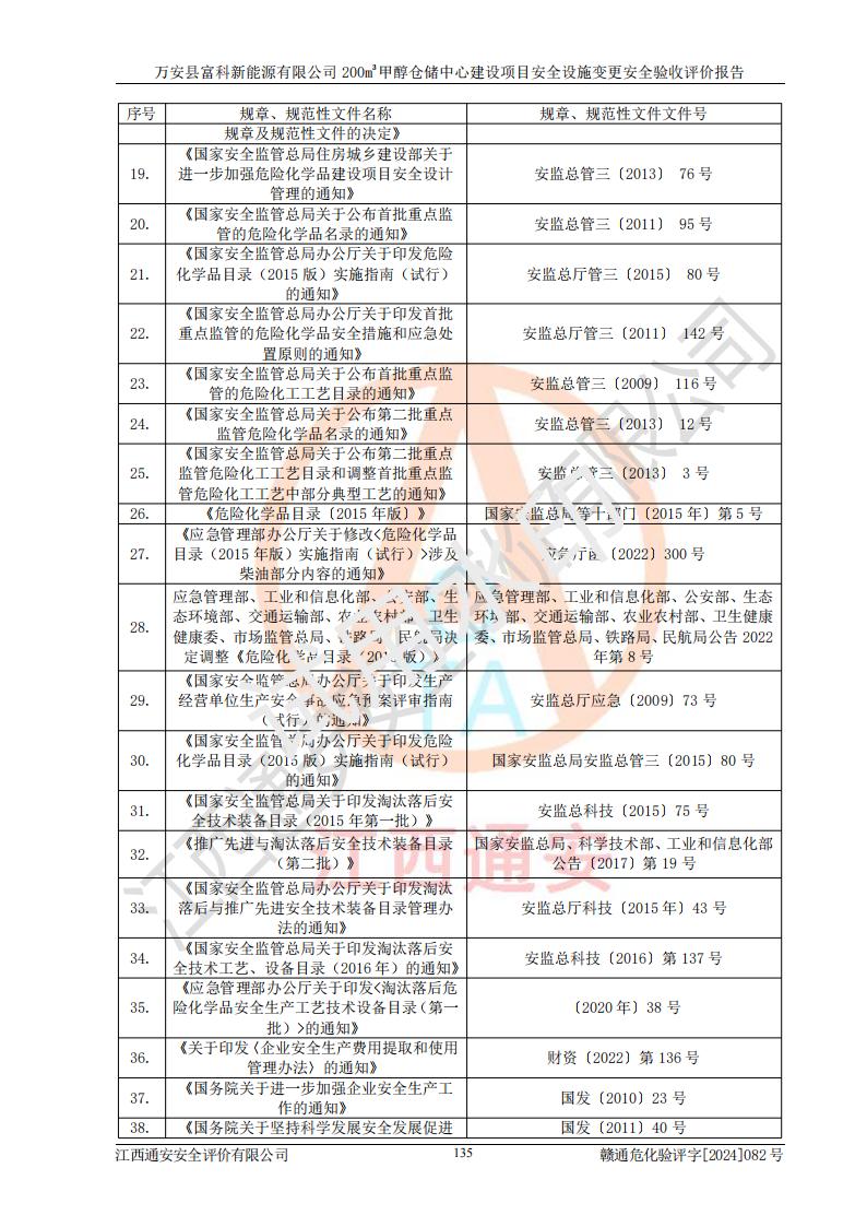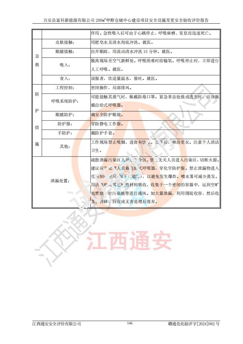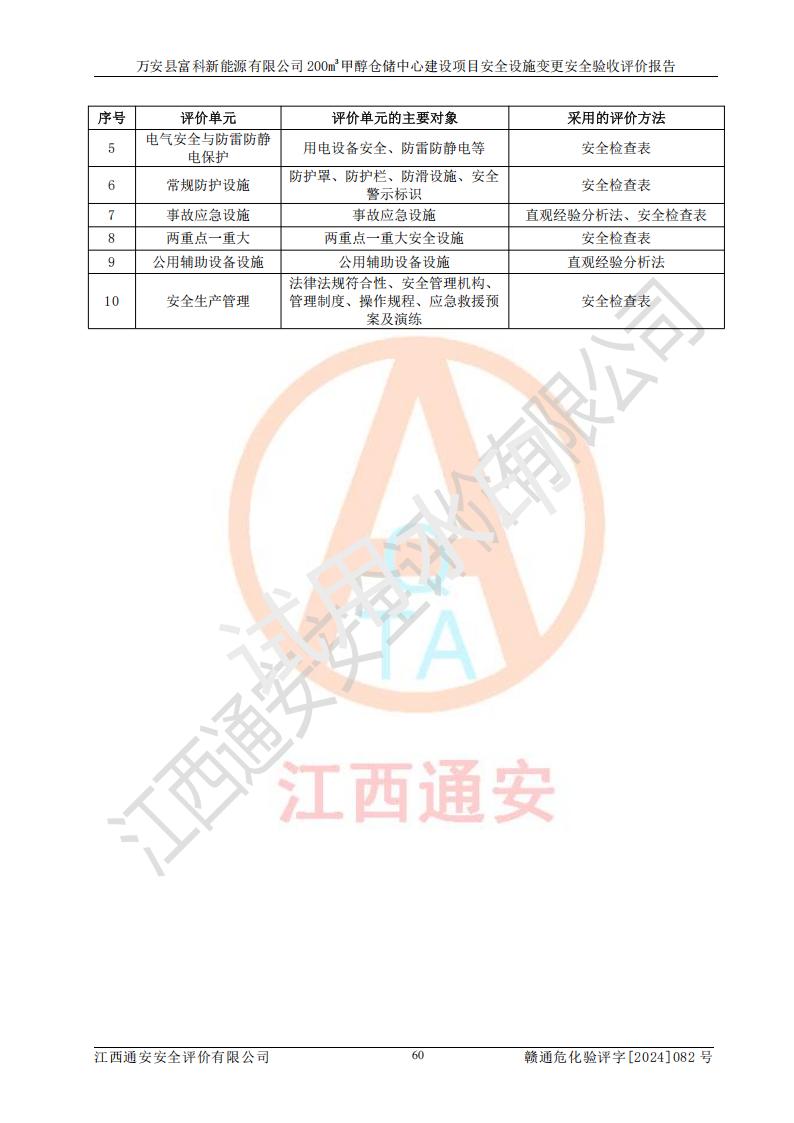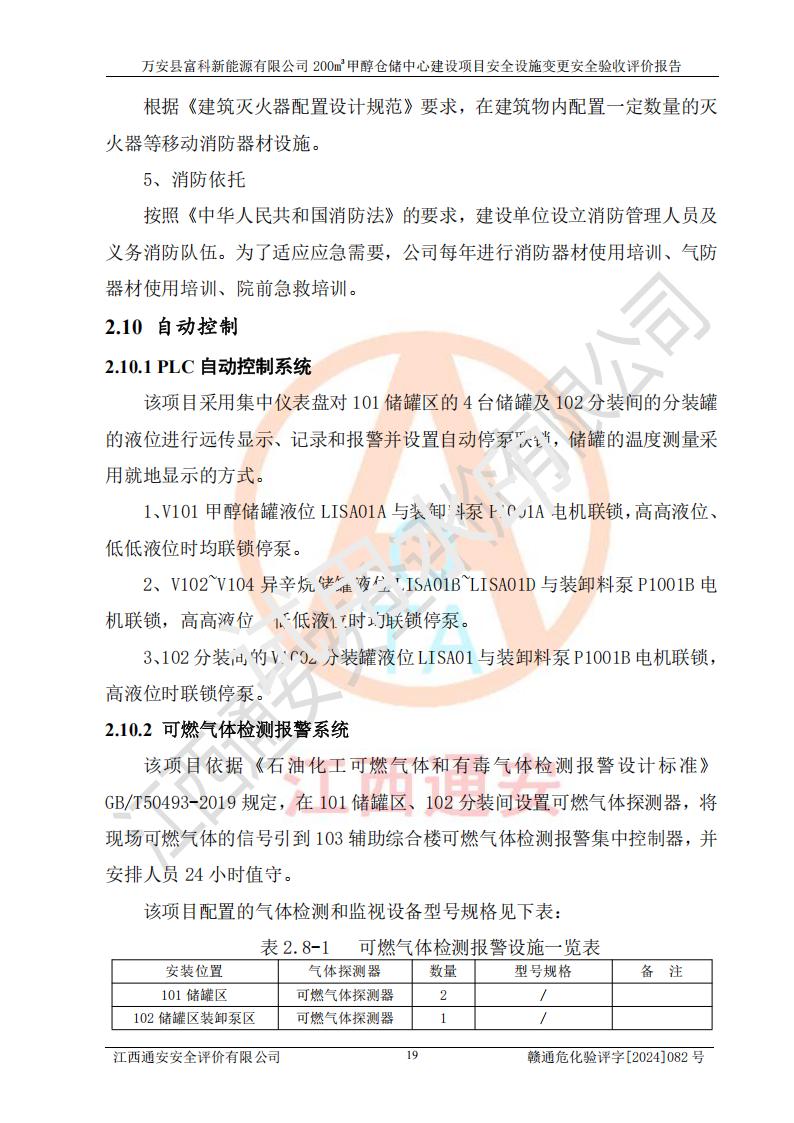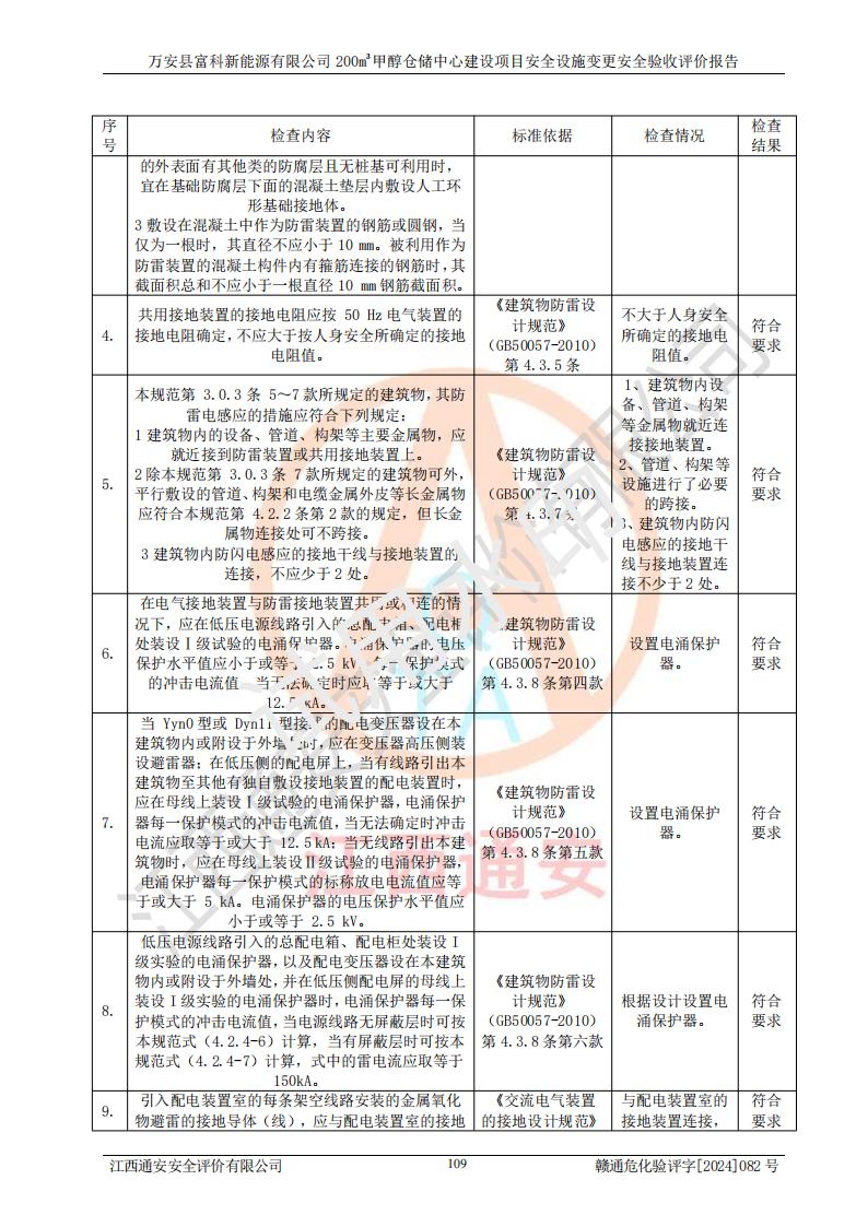評價結論 | 1、萬安縣富科新能源有限公司200m3甲醇倉儲中心建設項目安全設施變更設計各儲存經(jīng)營單元的安全設施與主體工程同時設計、同時施工、同時投入使用,符合**有關建設項目“三同時”的規(guī)定和要求。 2、萬安縣富科新能源有限公司200m3甲醇倉儲中心建設項目安全設施變更的主體工程安全設施、安全措施符合法律法規(guī)的規(guī)定和要求,并運行**;公用工程及輔助設施滿足主體工程生產(chǎn)安全的需要;企業(yè)安全管理體系滿足生產(chǎn)安全的要求。 3、萬安縣富科新能源有限公司已針對本報告提出的安全隱患整改意見組織人員進行整改,經(jīng)過整改已落實到位,企業(yè)安全生產(chǎn)的風險控制在可以接受的范圍內。 綜上所述,萬安縣富科新能源有限公司200m3甲醇倉儲中心建設項目安全設施變更相關的設備設施和安全設施運行正常,企業(yè)安全管理機制運行正常,安全設施、措施達到規(guī)范要求和預期結果,可以滿足該項目危險化學品儲存經(jīng)營的要求,安全管理**。萬安縣富科新能源有限公司200m3甲醇倉儲中心建設項目安全設施變更具備安全設施竣工驗收條件。 | |||