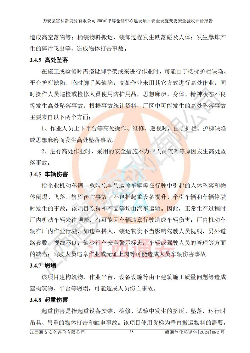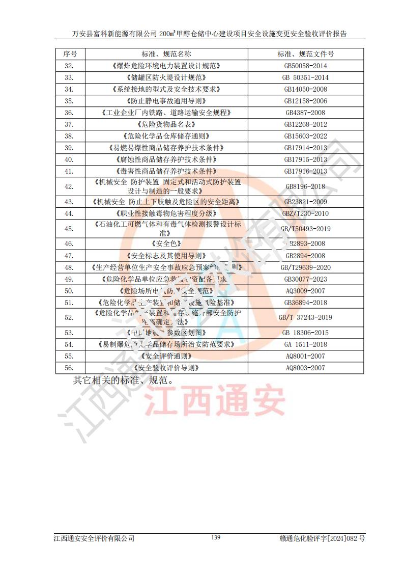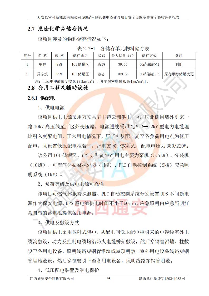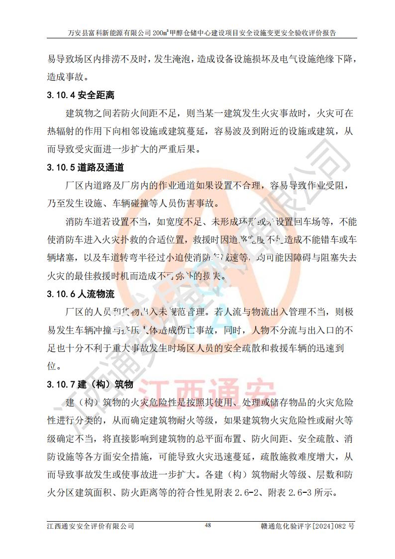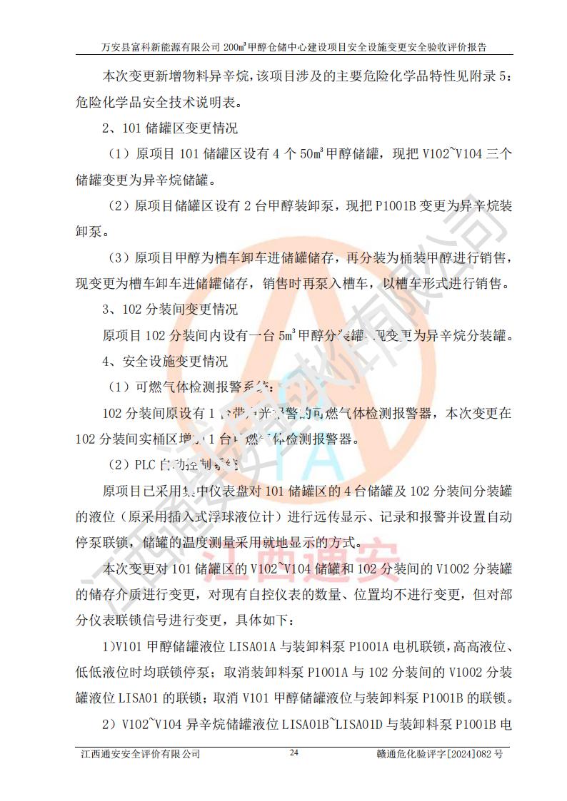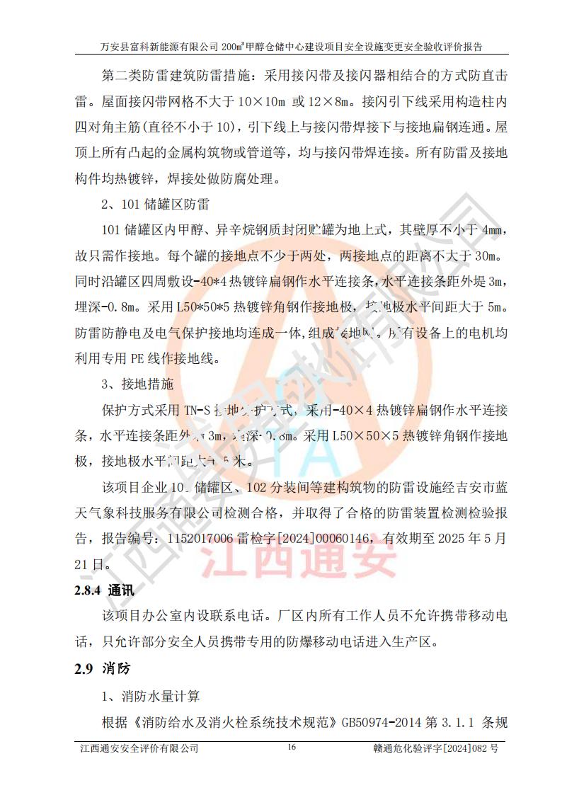 評價結論 | 1、萬安縣富科新能源有限公司200m3甲醇倉儲中心建設項目安全設施變更設計各儲存經(jīng)營單元的安全設施與主體工程同時設計、同時施工、同時投入使用,符合**有關建設項目“三同時”的規(guī)定和要求。 2、萬安縣富科新能源有限公司200m3甲醇倉儲中心建設項目安全設施變更的主體工程安全設施、安全措施符合法律法規(guī)的規(guī)定和要求,并運行**;公用工程及輔助設施滿足主體工程生產(chǎn)安全的需要;企業(yè)安全管理體系滿足生產(chǎn)安全的要求。 3、萬安縣富科新能源有限公司已針對本報告提出的安全隱患整改意見組織人員進行整改,經(jīng)過整改已落實到位,企業(yè)安全生產(chǎn)的風險控制在可以接受的范圍內。 綜上所述,萬安縣富科新能源有限公司200m3甲醇倉儲中心建設項目安全設施變更相關的設備設施和安全設施運行正常,企業(yè)安全管理機制運行正常,安全設施、措施達到規(guī)范要求和預期結果,可以滿足該項目危險化學品儲存經(jīng)營的要求,安全管理**。萬安縣富科新能源有限公司200m3甲醇倉儲中心建設項目安全設施變更具備安全設施竣工驗收條件。 | |||