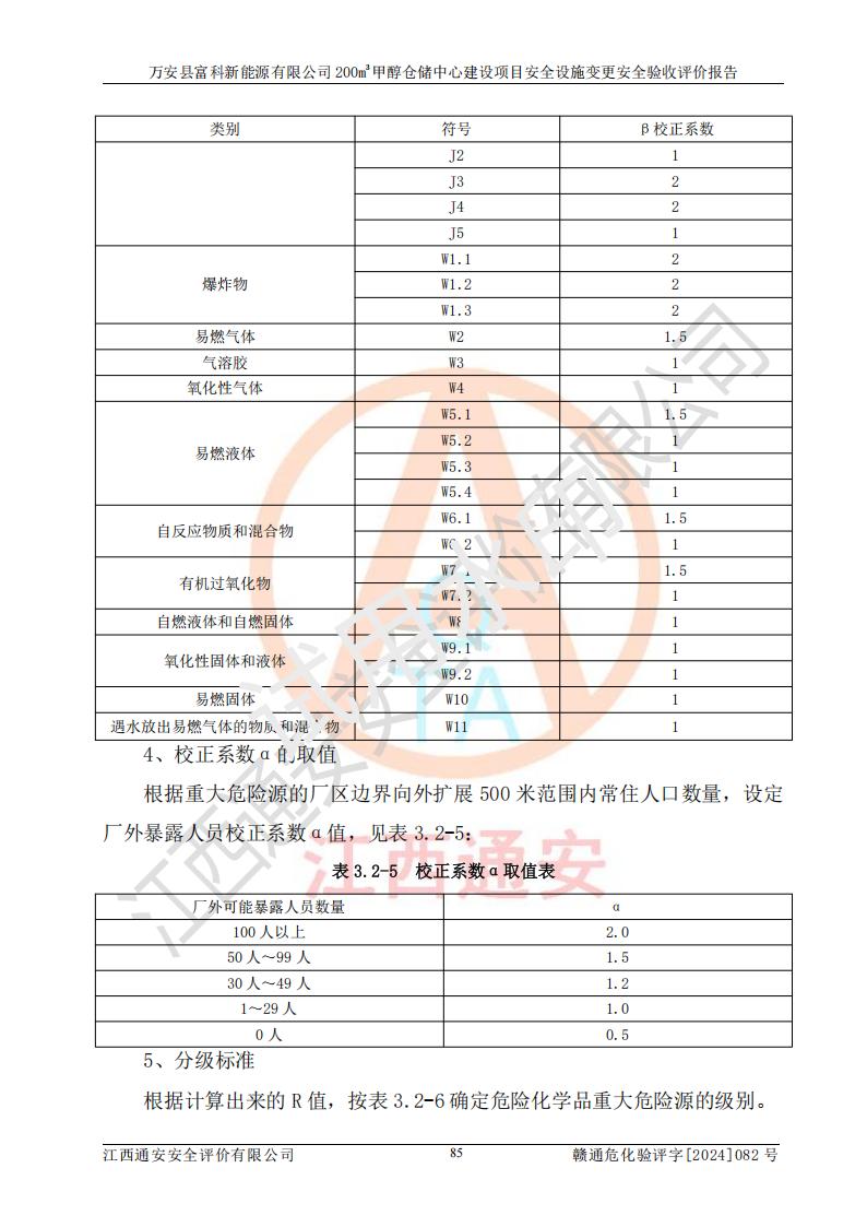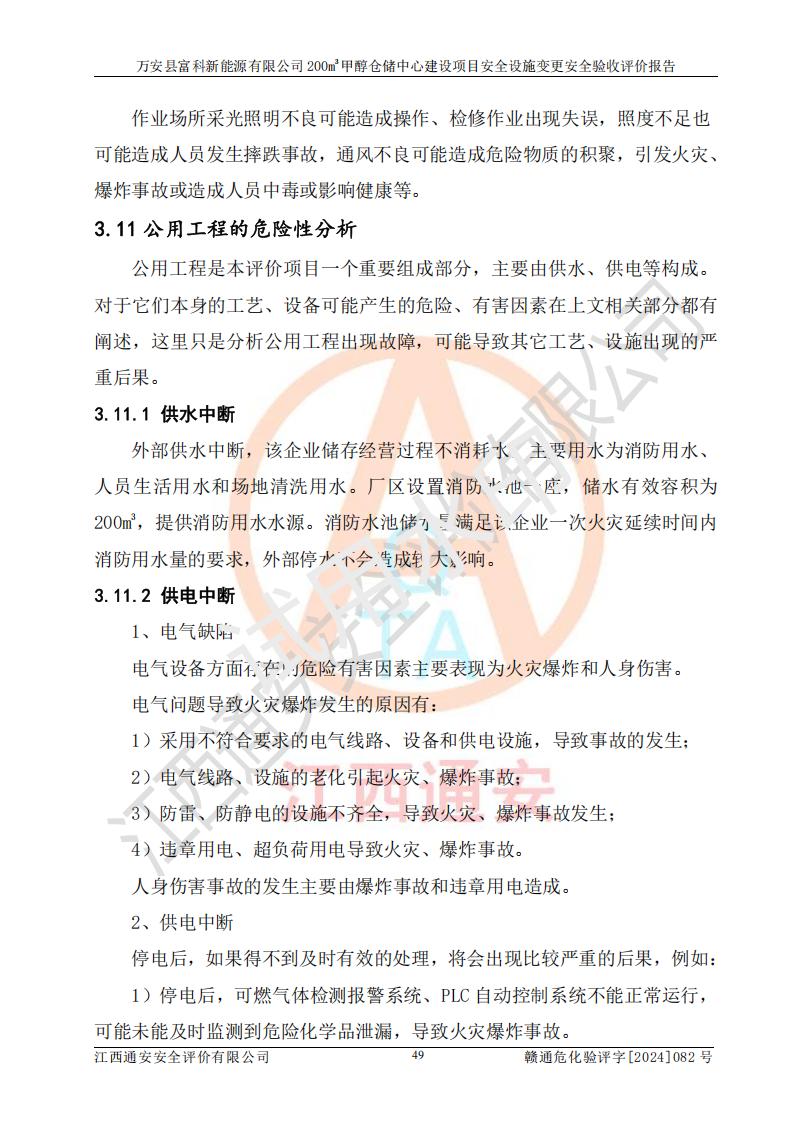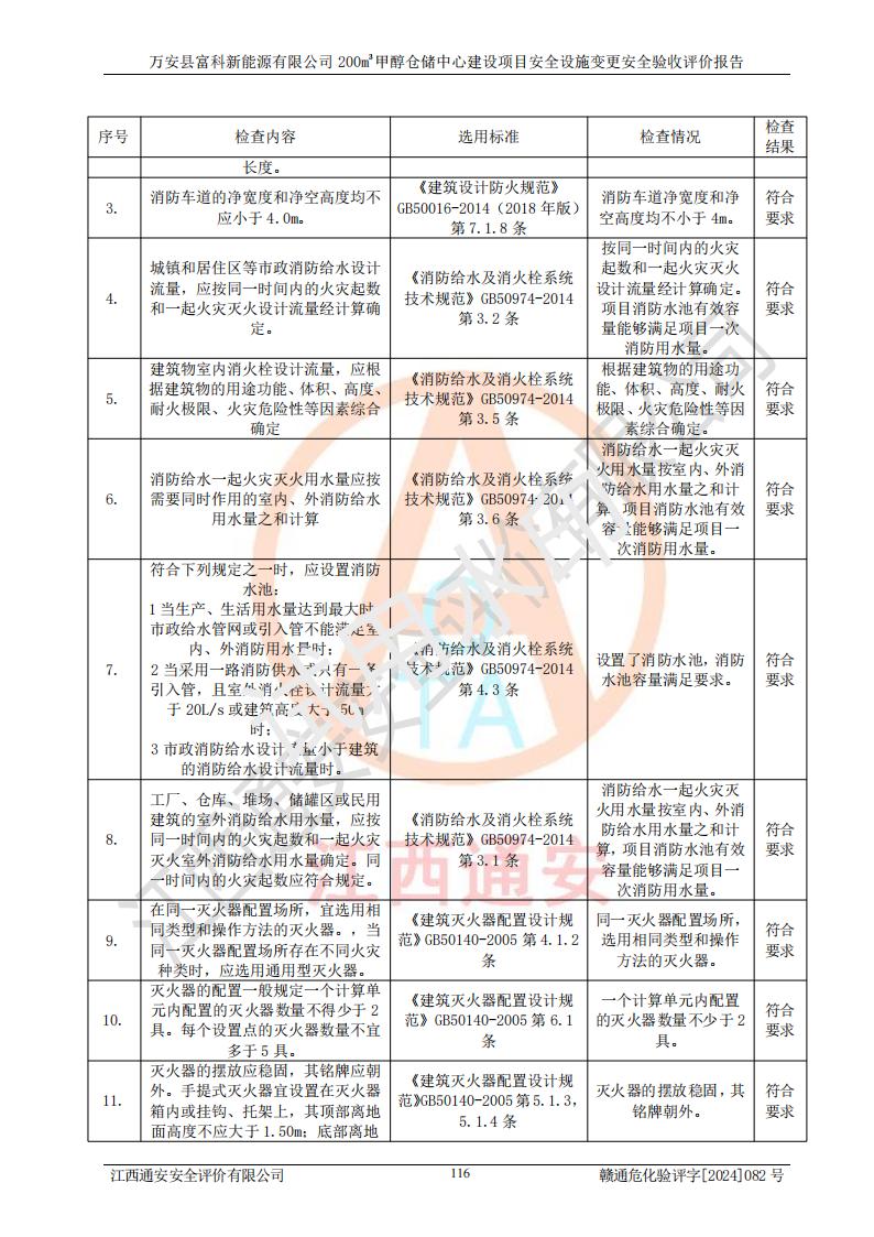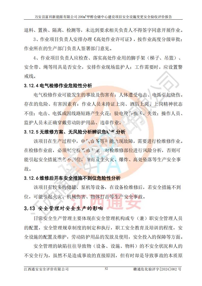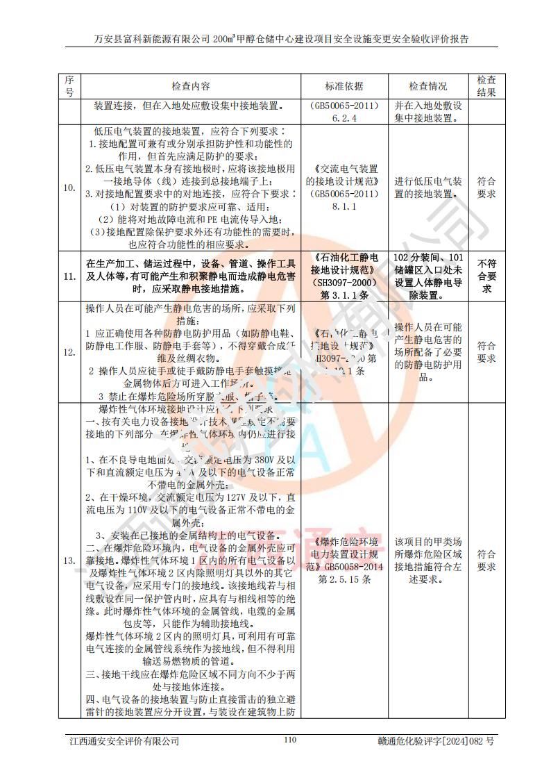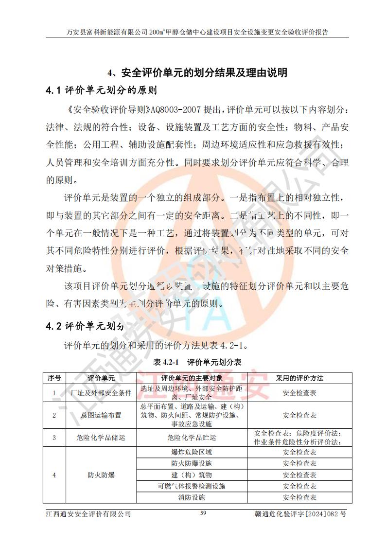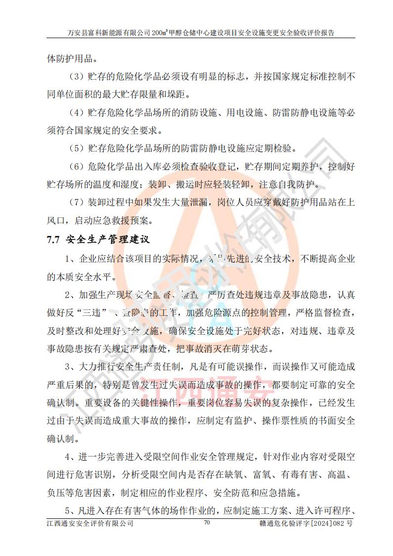 評價結論 | 1、萬安縣富科新能源有限公司200m3甲醇倉儲中心建設項目安全設施變更設計各儲存經(jīng)營單元的安全設施與主體工程同時設計、同時施工、同時投入使用,符合**有關建設項目“三同時”的規(guī)定和要求。 2、萬安縣富科新能源有限公司200m3甲醇倉儲中心建設項目安全設施變更的主體工程安全設施、安全措施符合法律法規(guī)的規(guī)定和要求,并運行**;公用工程及輔助設施滿足主體工程生產(chǎn)安全的需要;企業(yè)安全管理體系滿足生產(chǎn)安全的要求。 3、萬安縣富科新能源有限公司已針對本報告提出的安全隱患整改意見組織人員進行整改,經(jīng)過整改已落實到位,企業(yè)安全生產(chǎn)的風險控制在可以接受的范圍內。 綜上所述,萬安縣富科新能源有限公司200m3甲醇倉儲中心建設項目安全設施變更相關的設備設施和安全設施運行正常,企業(yè)安全管理機制運行正常,安全設施、措施達到規(guī)范要求和預期結果,可以滿足該項目危險化學品儲存經(jīng)營的要求,安全管理**。萬安縣富科新能源有限公司200m3甲醇倉儲中心建設項目安全設施變更具備安全設施竣工驗收條件。 | |||