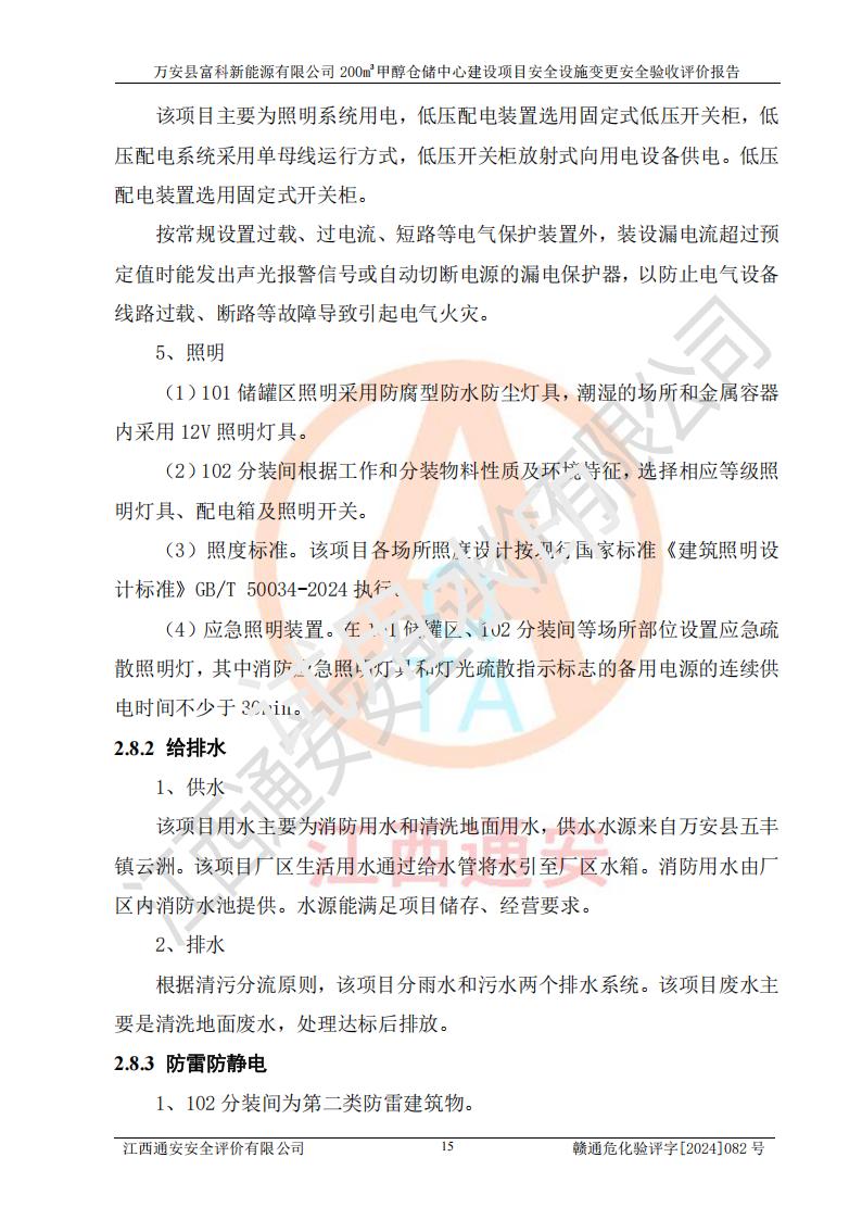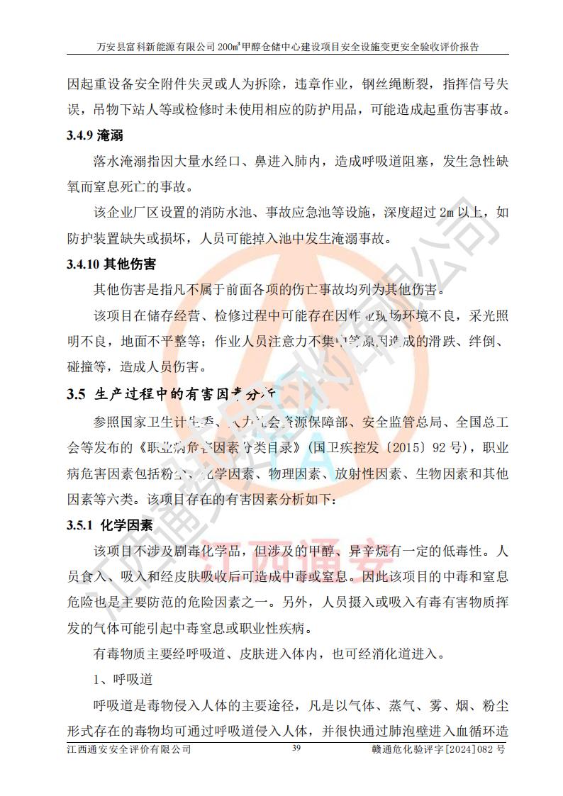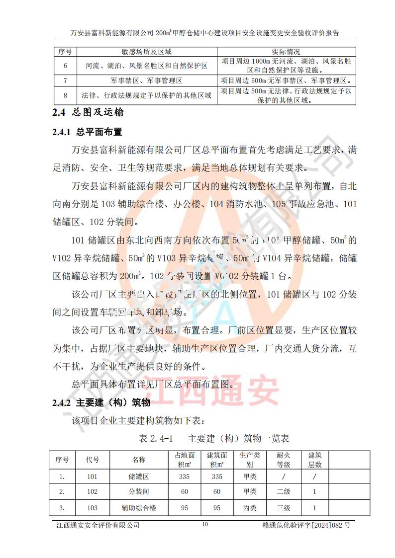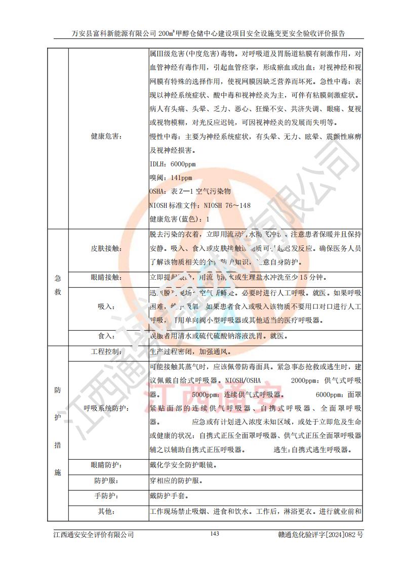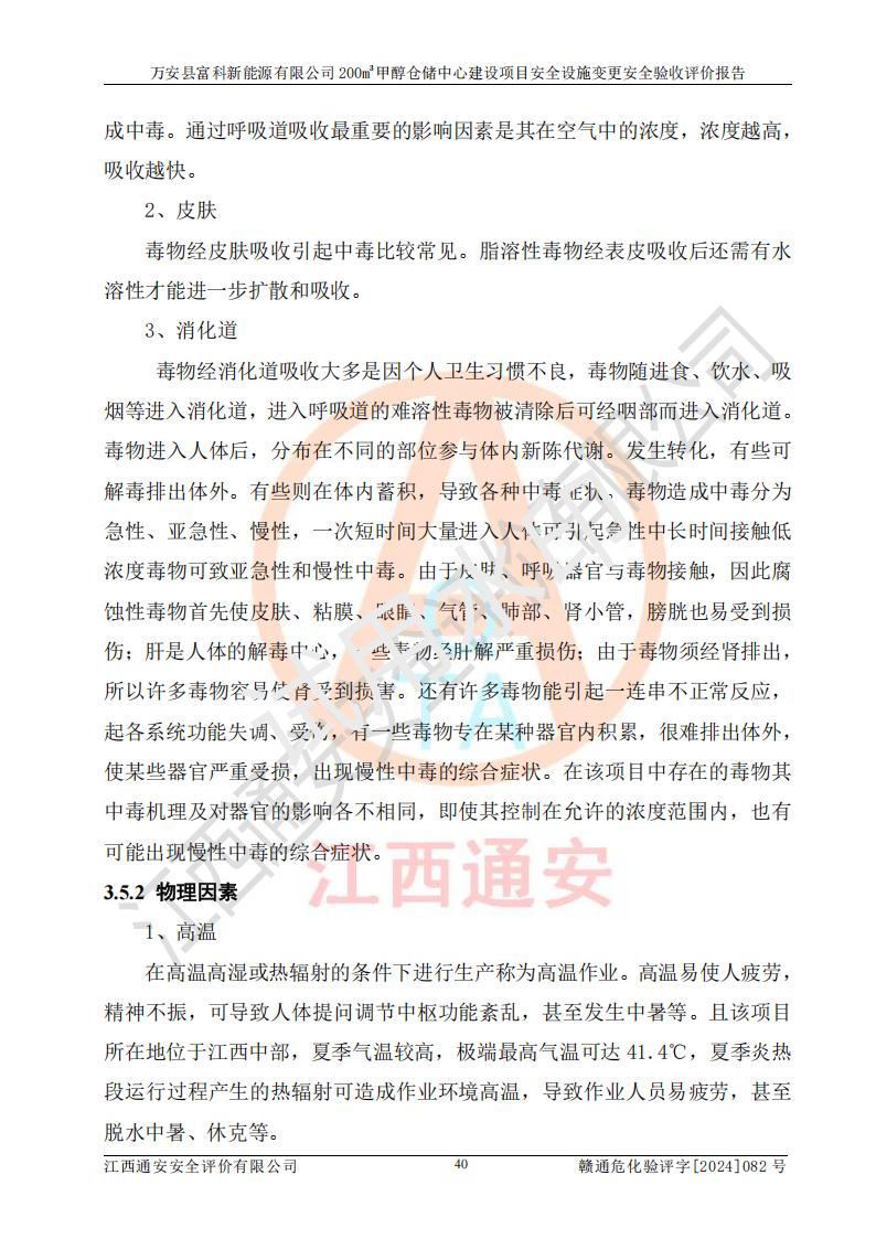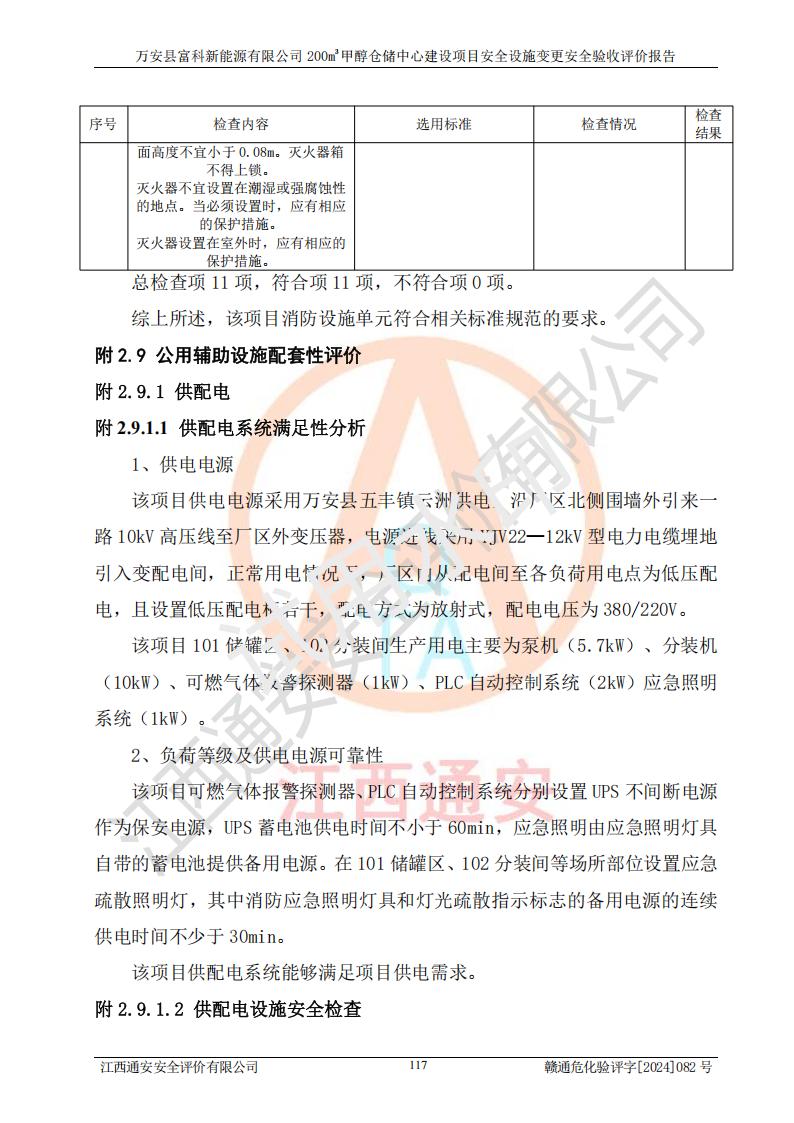 評價結論 | 1、萬安縣富科新能源有限公司200m3甲醇倉儲中心建設項目安全設施變更設計各儲存經(jīng)營單元的安全設施與主體工程同時設計、同時施工、同時投入使用,符合**有關建設項目“三同時”的規(guī)定和要求。 2、萬安縣富科新能源有限公司200m3甲醇倉儲中心建設項目安全設施變更的主體工程安全設施、安全措施符合法律法規(guī)的規(guī)定和要求,并運行**;公用工程及輔助設施滿足主體工程生產(chǎn)安全的需要;企業(yè)安全管理體系滿足生產(chǎn)安全的要求。 3、萬安縣富科新能源有限公司已針對本報告提出的安全隱患整改意見組織人員進行整改,經(jīng)過整改已落實到位,企業(yè)安全生產(chǎn)的風險控制在可以接受的范圍內。 綜上所述,萬安縣富科新能源有限公司200m3甲醇倉儲中心建設項目安全設施變更相關的設備設施和安全設施運行正常,企業(yè)安全管理機制運行正常,安全設施、措施達到規(guī)范要求和預期結果,可以滿足該項目危險化學品儲存經(jīng)營的要求,安全管理**。萬安縣富科新能源有限公司200m3甲醇倉儲中心建設項目安全設施變更具備安全設施竣工驗收條件。 | |||