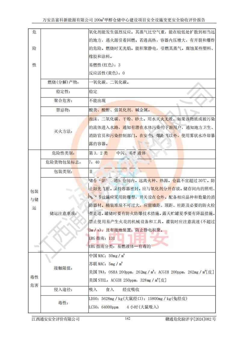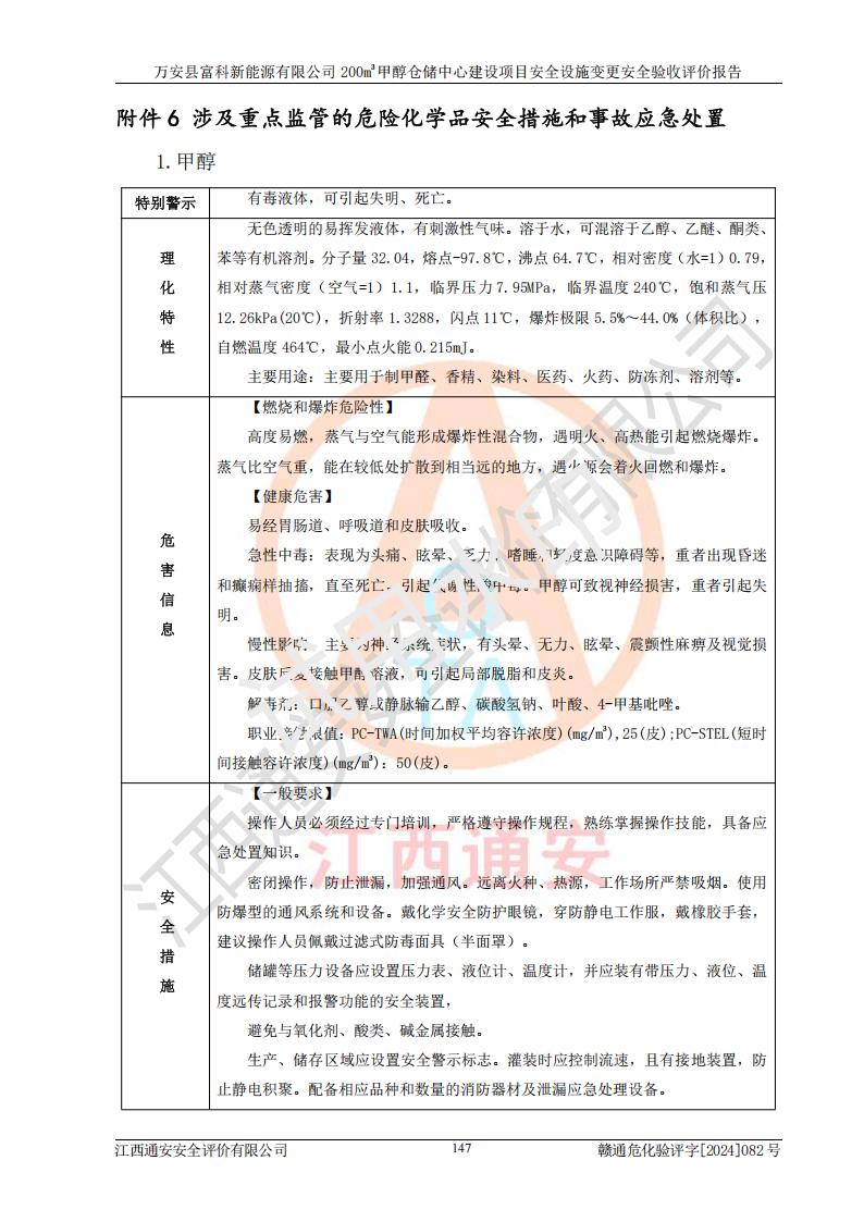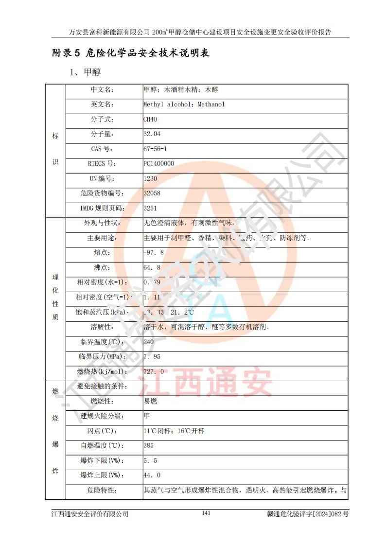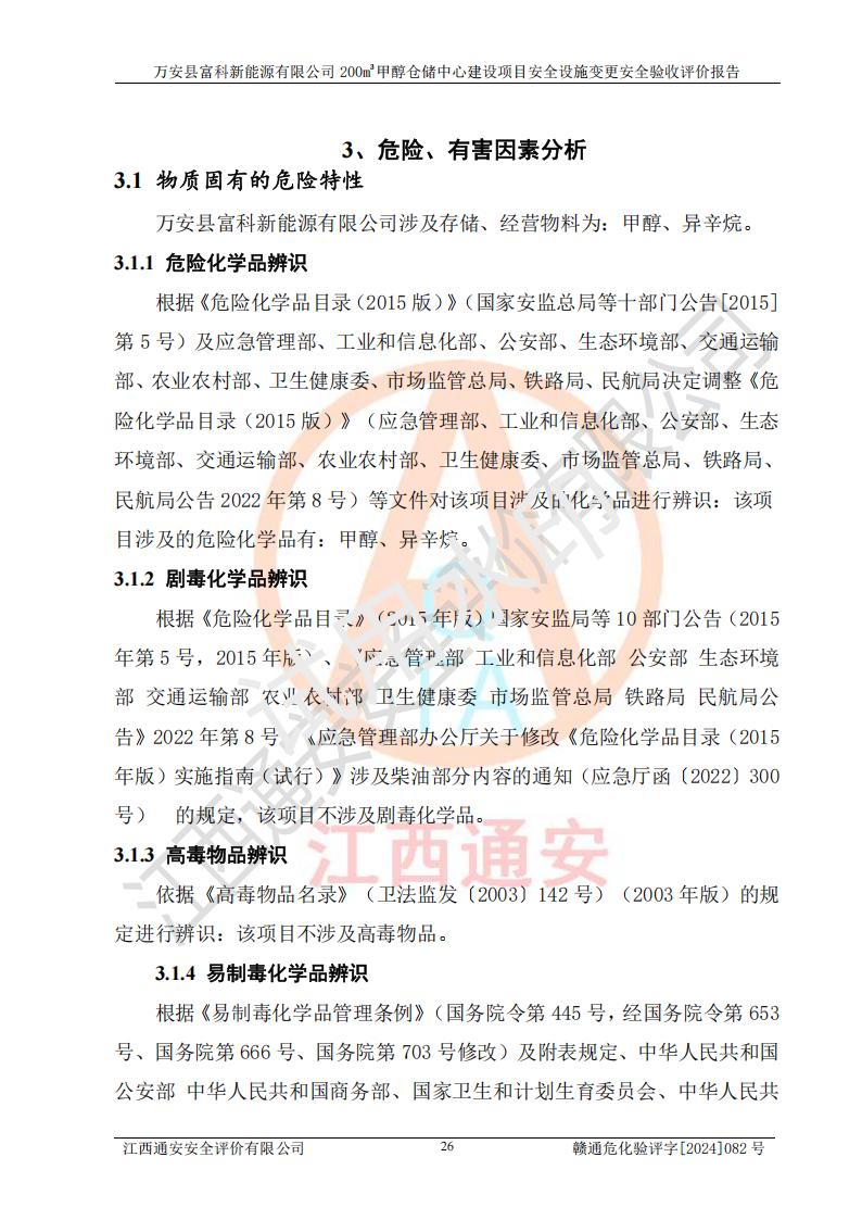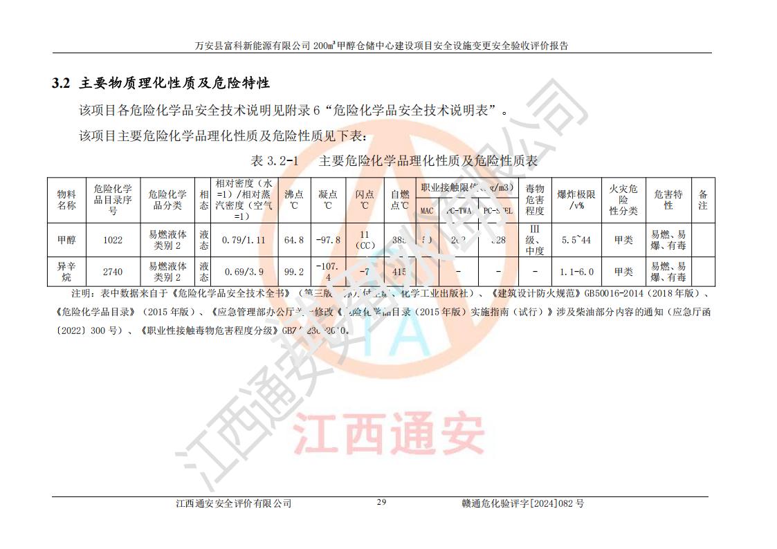 項目簡介 | 萬安縣富科新能源有限公司(以下簡稱“公司”)成立于2018年12月13日,法定**人:陳麗華。該公司曾用名為萬安縣榮能甲醇倉儲有限公司,于2023年09月01日改為現(xiàn)用名,其經(jīng)營范圍包括許可項目:危險化學品經(jīng)營(依法須經(jīng)批準的項目,經(jīng)相關部門批準后在許可**期內方可開展經(jīng)營活動,具體經(jīng)營項目和許可期限以相關部門批準文件或許可證件為準)一般項目:石油制品銷售(不含危險化學品)(除依法須經(jīng)批準的項目外,憑營業(yè)執(zhí)照依法自主開展經(jīng)營活動)。 萬安縣富科新能源有限公司于2021年11月16日取得了萬安縣應急管理局頒發(fā)的《危險化學品經(jīng)營許可證》,證書編號:贛吉?;?jīng)字〔2018〕001號,經(jīng)營范圍:甲醇、甲醇基燃料(混合物甲醇含量*過70%),經(jīng)營方式:零售、批發(fā)(儲存量不*過200m3)。 根據(jù)《危險化學品目錄(2015版)》(**安監(jiān)總局等十部門公告[2015]第5號)及應急管理部、工業(yè)和信息化部、公安部、生態(tài)環(huán)境部、交通運輸部、農(nóng)業(yè)農(nóng)村部、衛(wèi)生健康委、市場監(jiān)管總局、鐵路局、民航局決定調整《危險化學品目錄(2015版)》(應急管理部、工業(yè)和信息化部、公安部、生態(tài)環(huán)境部、交通運輸部、農(nóng)業(yè)農(nóng)村部、衛(wèi)生健康委、市場監(jiān)管總局、鐵路局、民航局公告2022年第8號)等文件對該項目涉及的化學品進行辨識:該項目涉及的危險化學品有:甲醇、異辛烷。 | |||