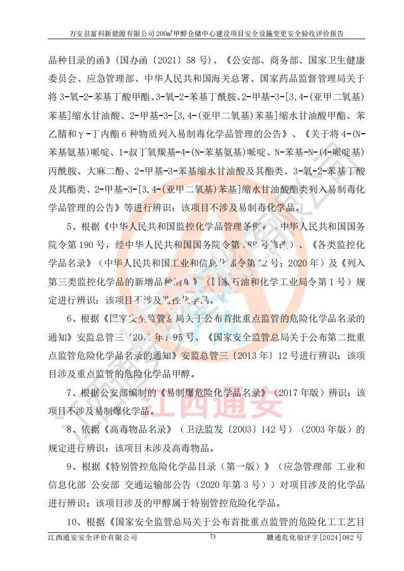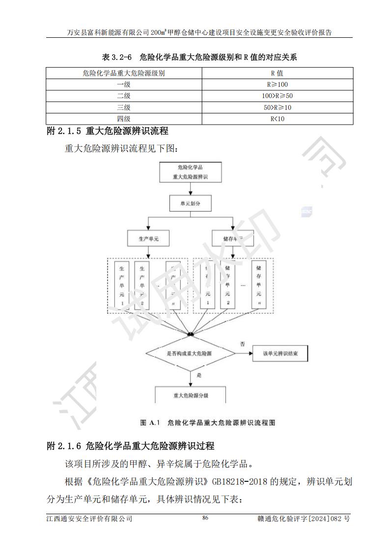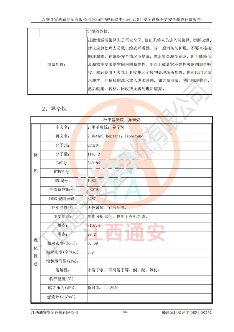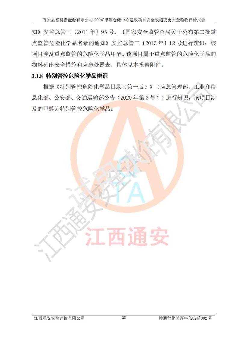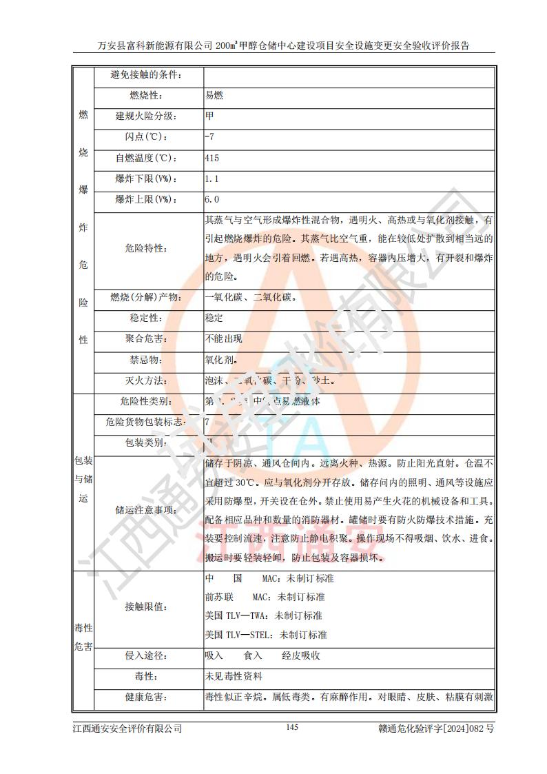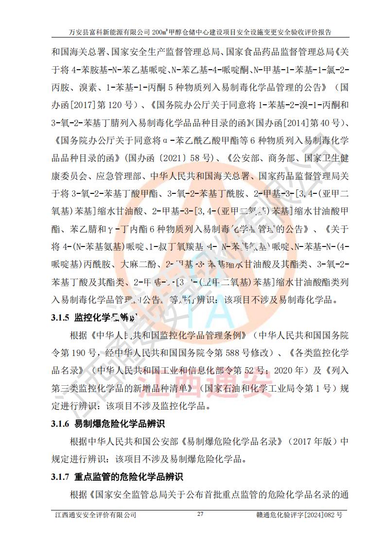 項目簡介 | 萬安縣富科新能源有限公司(以下簡稱“公司”)成立于2018年12月13日,法定**人:陳麗華。該公司曾用名為萬安縣榮能甲醇倉儲有限公司,于2023年09月01日改為現(xiàn)用名,其經(jīng)營范圍包括許可項目:危險化學品經(jīng)營(依法須經(jīng)批準的項目,經(jīng)相關部門批準后在許可**期內方可開展經(jīng)營活動,具體經(jīng)營項目和許可期限以相關部門批準文件或許可證件為準)一般項目:石油制品銷售(不含危險化學品)(除依法須經(jīng)批準的項目外,憑營業(yè)執(zhí)照依法自主開展經(jīng)營活動)。 萬安縣富科新能源有限公司于2021年11月16日取得了萬安縣應急管理局頒發(fā)的《危險化學品經(jīng)營許可證》,證書編號:贛吉?;?jīng)字〔2018〕001號,經(jīng)營范圍:甲醇、甲醇基燃料(混合物甲醇含量*過70%),經(jīng)營方式:零售、批發(fā)(儲存量不*過200m3)。 根據(jù)《危險化學品目錄(2015版)》(**安監(jiān)總局等十部門公告[2015]第5號)及應急管理部、工業(yè)和信息化部、公安部、生態(tài)環(huán)境部、交通運輸部、農(nóng)業(yè)農(nóng)村部、衛(wèi)生健康委、市場監(jiān)管總局、鐵路局、民航局決定調整《危險化學品目錄(2015版)》(應急管理部、工業(yè)和信息化部、公安部、生態(tài)環(huán)境部、交通運輸部、農(nóng)業(yè)農(nóng)村部、衛(wèi)生健康委、市場監(jiān)管總局、鐵路局、民航局公告2022年第8號)等文件對該項目涉及的化學品進行辨識:該項目涉及的危險化學品有:甲醇、異辛烷。 | |||