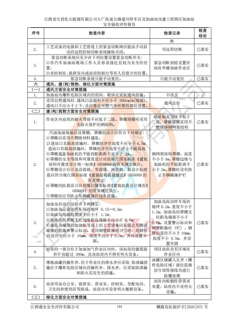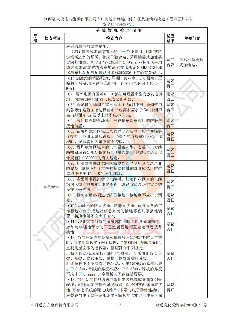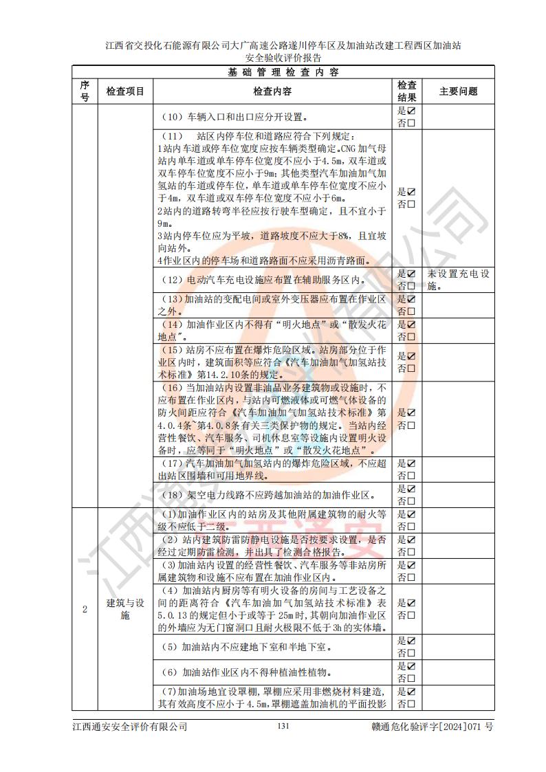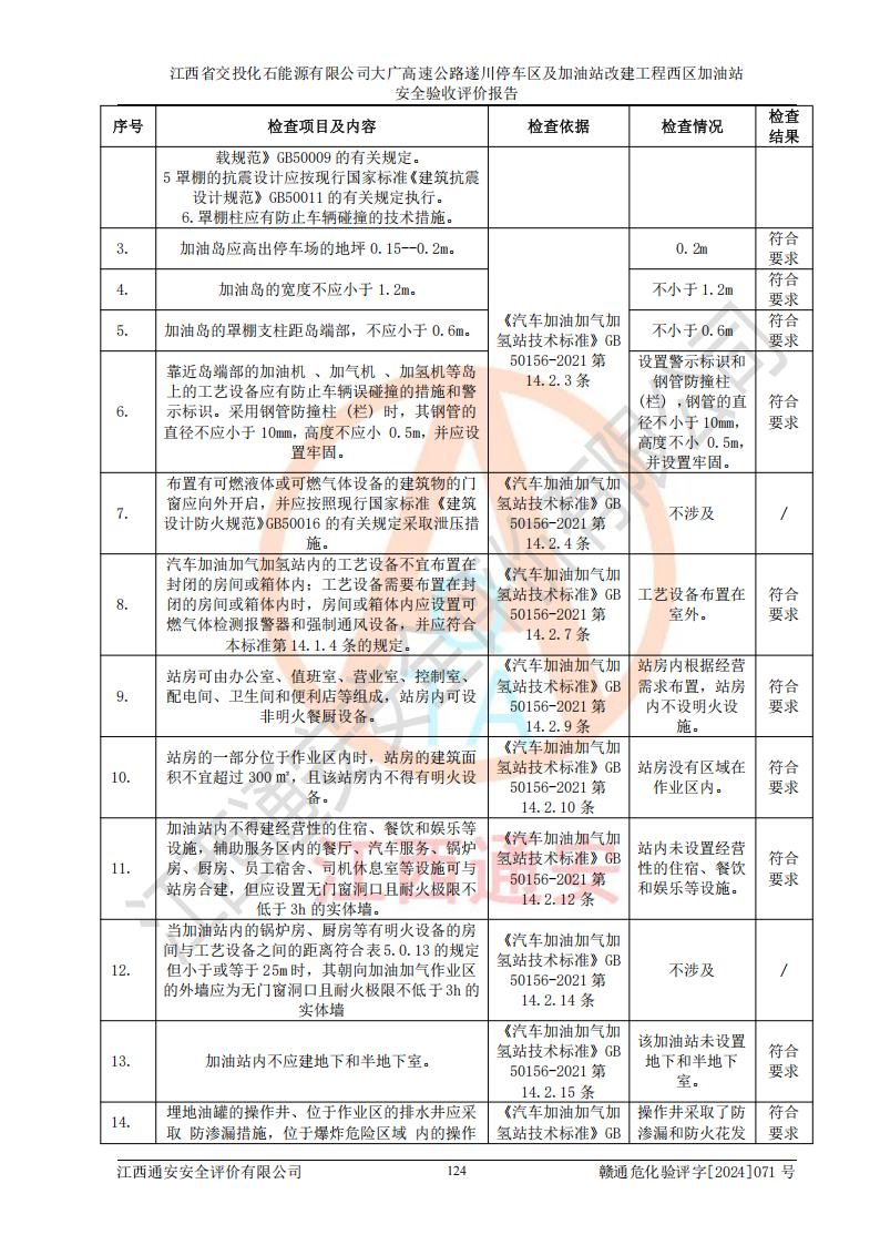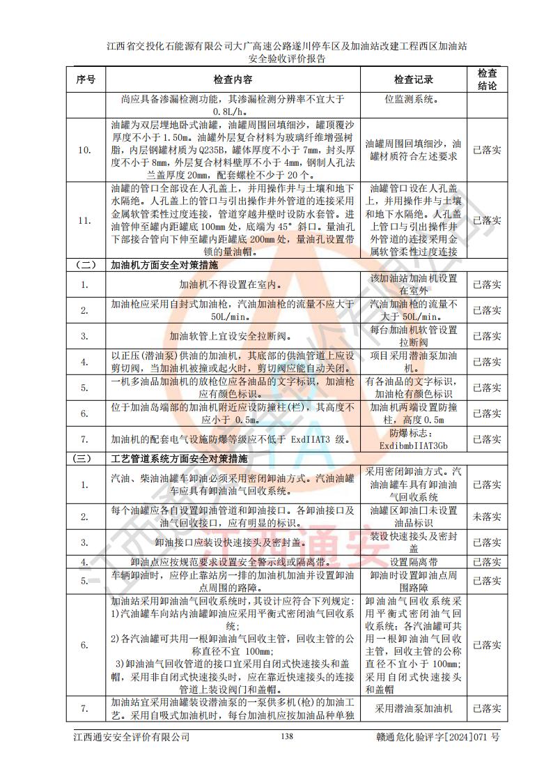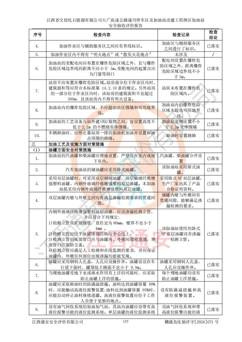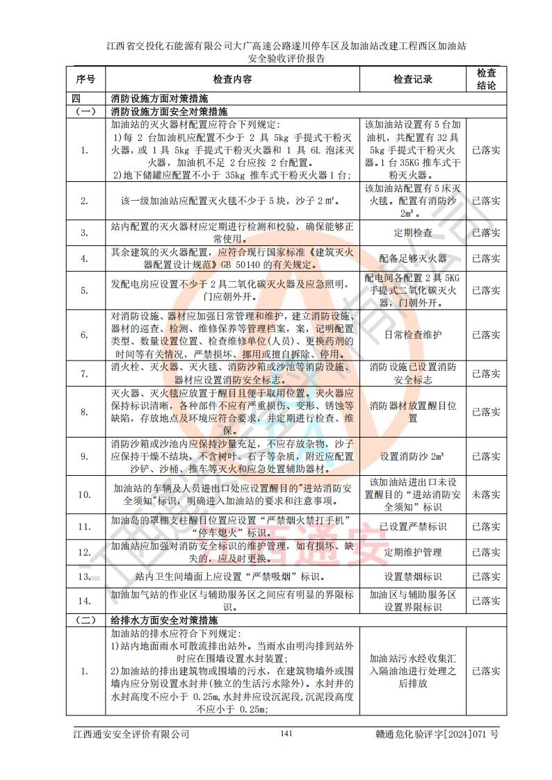 評價結(jié)論 | 該加油站在設(shè)計、施工過程中符合《危險化學品建設(shè)項目安全監(jiān)督管理辦法》(2012年1月30日**安全生產(chǎn)監(jiān)督管理總局令第45號公布,自2012年4月1日起施行;根據(jù)2015年5月27日**安全生產(chǎn)監(jiān)督管理總局令第79號修正)等法規(guī)的要求,工程配套的安全設(shè)施做到了與主體工程同時設(shè)計、同時施工、同時投入生產(chǎn)和使用,符合**有關(guān)建設(shè)項目“三同時”的規(guī)定和要求。 該加油站現(xiàn)場情況與竣工圖紙一致,主體工程安全設(shè)施、安全措施符合法律法規(guī)的規(guī)定和要求,安全設(shè)施正常投用并運行**;公用工程及輔助設(shè)施滿足主體工程生產(chǎn)安全的需要;企業(yè)安全管理體系滿足生產(chǎn)安全的要求。該加油站與周邊裝置和設(shè)施的安全防護距離、安全設(shè)施滿足標準規(guī)范的要求,該加油站的安全條件滿足安全生產(chǎn)的要求。 該加油站已針對本報告提出的安全隱患整改意見組織人員進行整改,已落實到位,企業(yè)安全生產(chǎn)的風險控制在可以接受的范圍內(nèi)。 綜上所述,江西省交投化石能源有限公司大廣高速公路遂川停車區(qū)及加油站改建工程西區(qū)加油站具備**有關(guān)安全生產(chǎn)法律、法規(guī)、部門規(guī)章及標準規(guī)范要求的安全條件,符合經(jīng)營和儲存危險化學品的安全條件要求,具備安全驗收的要求。 | |||