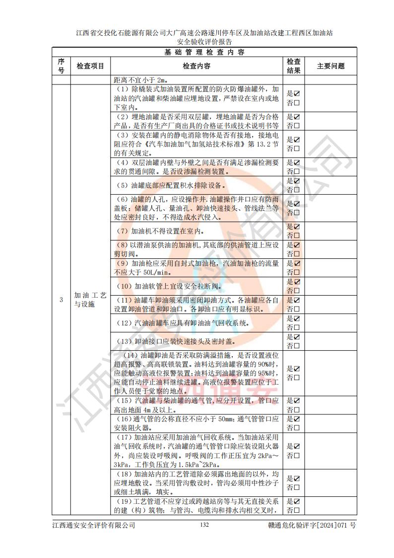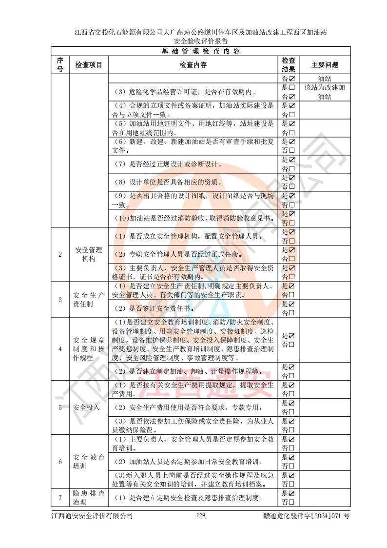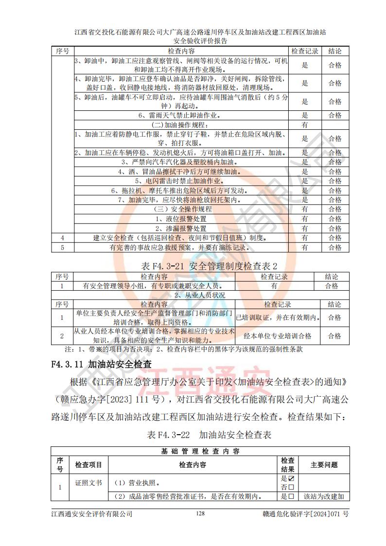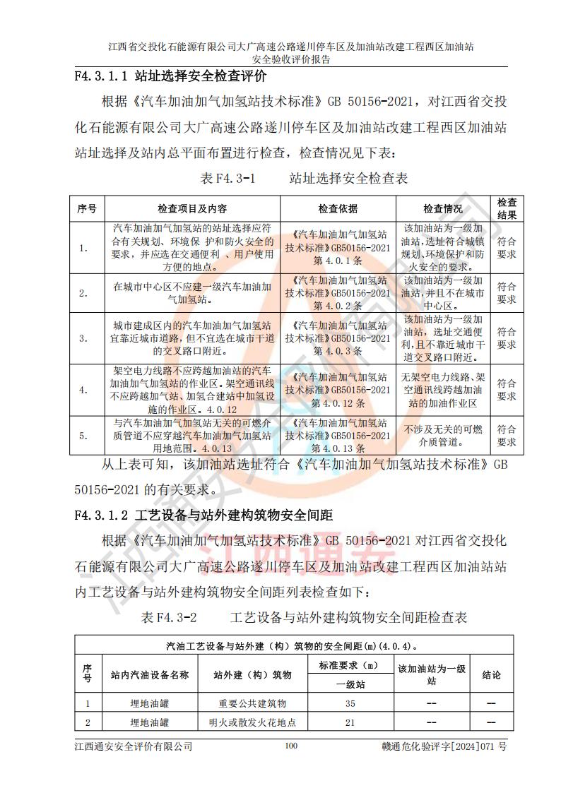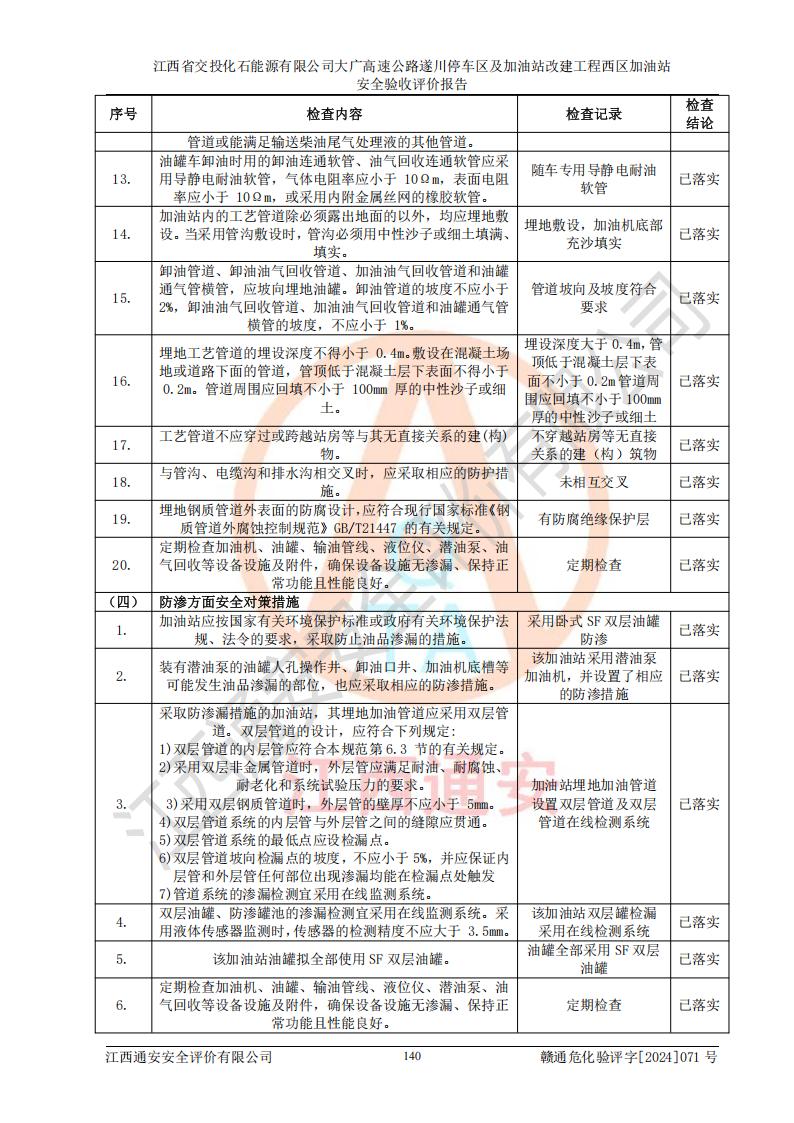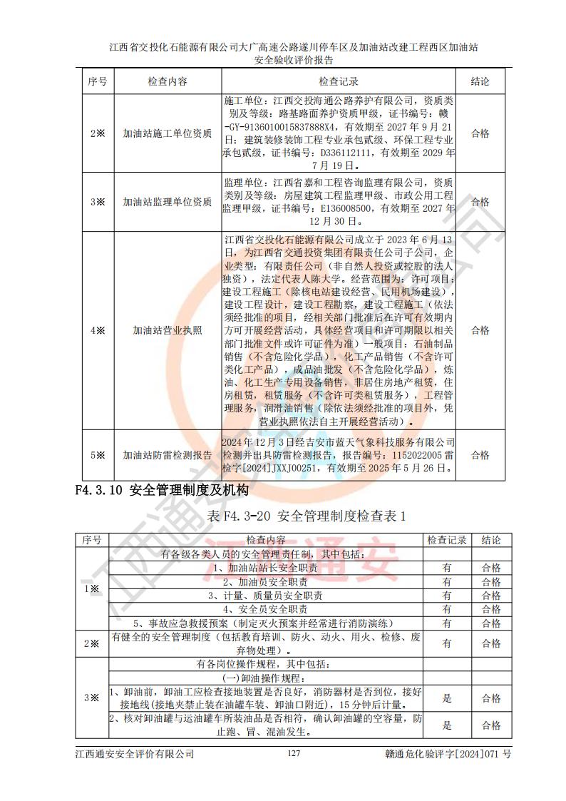 評價結(jié)論 | 該加油站在設(shè)計、施工過程中符合《危險化學品建設(shè)項目安全監(jiān)督管理辦法》(2012年1月30日**安全生產(chǎn)監(jiān)督管理總局令第45號公布,自2012年4月1日起施行;根據(jù)2015年5月27日**安全生產(chǎn)監(jiān)督管理總局令第79號修正)等法規(guī)的要求,工程配套的安全設(shè)施做到了與主體工程同時設(shè)計、同時施工、同時投入生產(chǎn)和使用,符合**有關(guān)建設(shè)項目“三同時”的規(guī)定和要求。 該加油站現(xiàn)場情況與竣工圖紙一致,主體工程安全設(shè)施、安全措施符合法律法規(guī)的規(guī)定和要求,安全設(shè)施正常投用并運行**;公用工程及輔助設(shè)施滿足主體工程生產(chǎn)安全的需要;企業(yè)安全管理體系滿足生產(chǎn)安全的要求。該加油站與周邊裝置和設(shè)施的安全防護距離、安全設(shè)施滿足標準規(guī)范的要求,該加油站的安全條件滿足安全生產(chǎn)的要求。 該加油站已針對本報告提出的安全隱患整改意見組織人員進行整改,已落實到位,企業(yè)安全生產(chǎn)的風險控制在可以接受的范圍內(nèi)。 綜上所述,江西省交投化石能源有限公司大廣高速公路遂川停車區(qū)及加油站改建工程西區(qū)加油站具備**有關(guān)安全生產(chǎn)法律、法規(guī)、部門規(guī)章及標準規(guī)范要求的安全條件,符合經(jīng)營和儲存危險化學品的安全條件要求,具備安全驗收的要求。 | |||