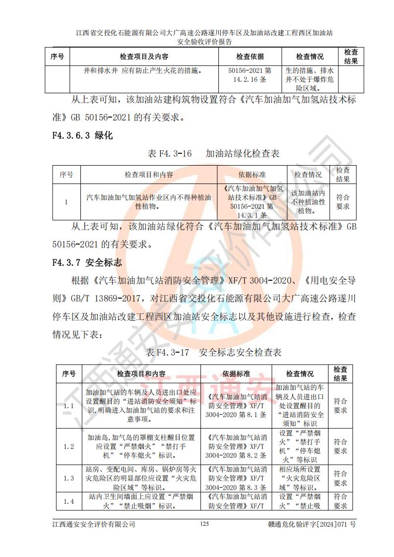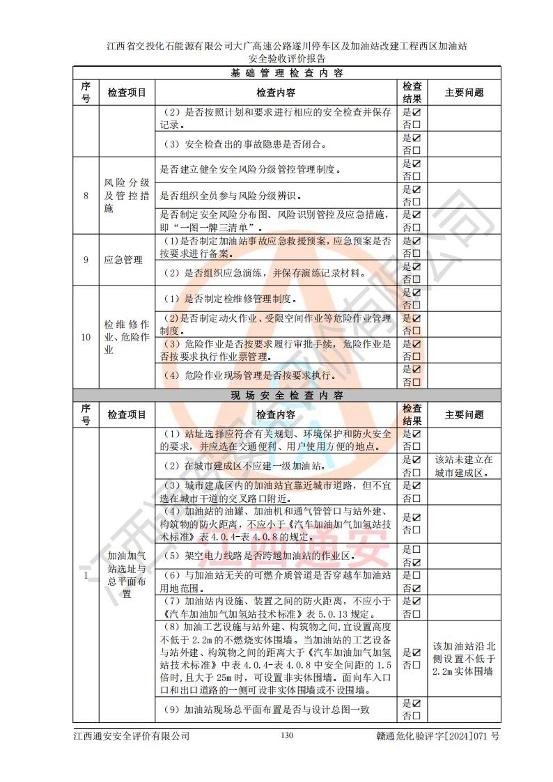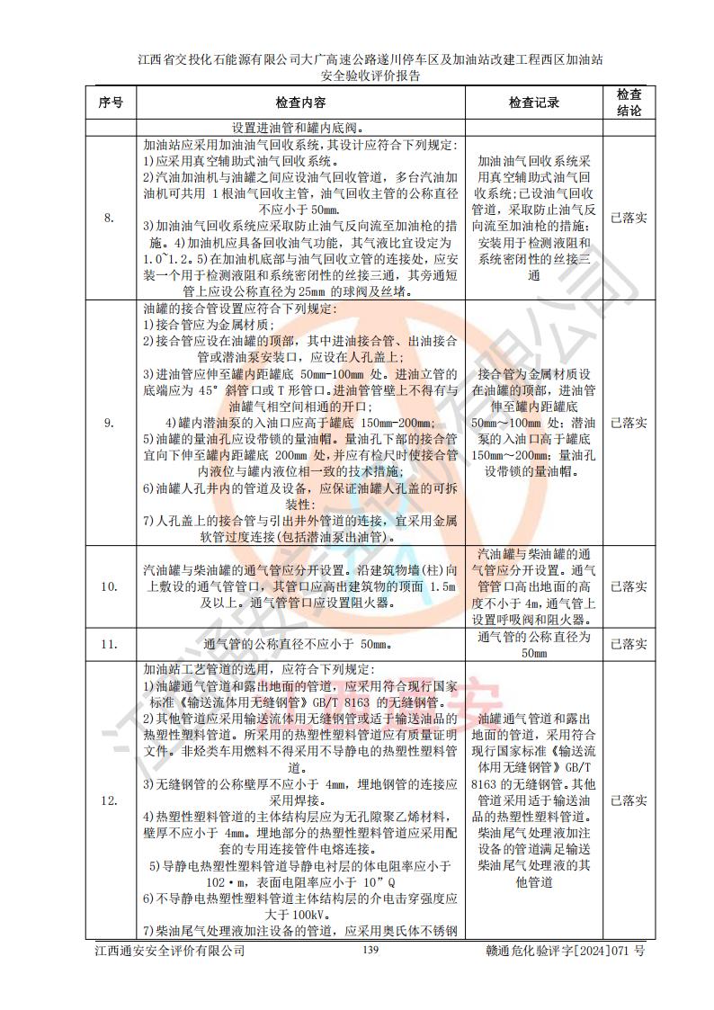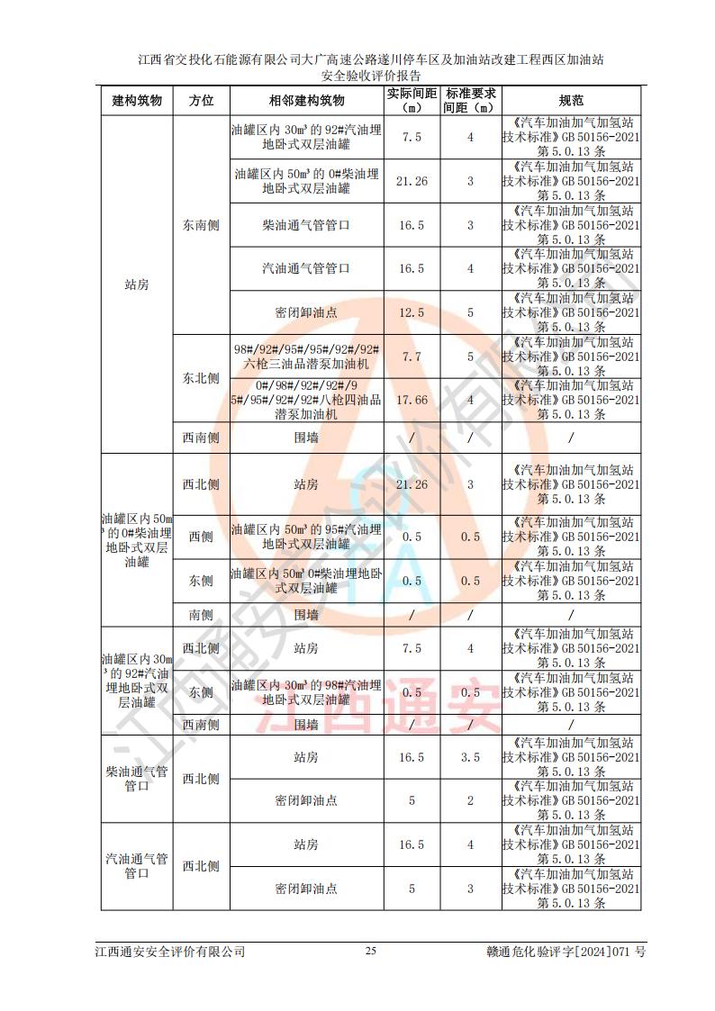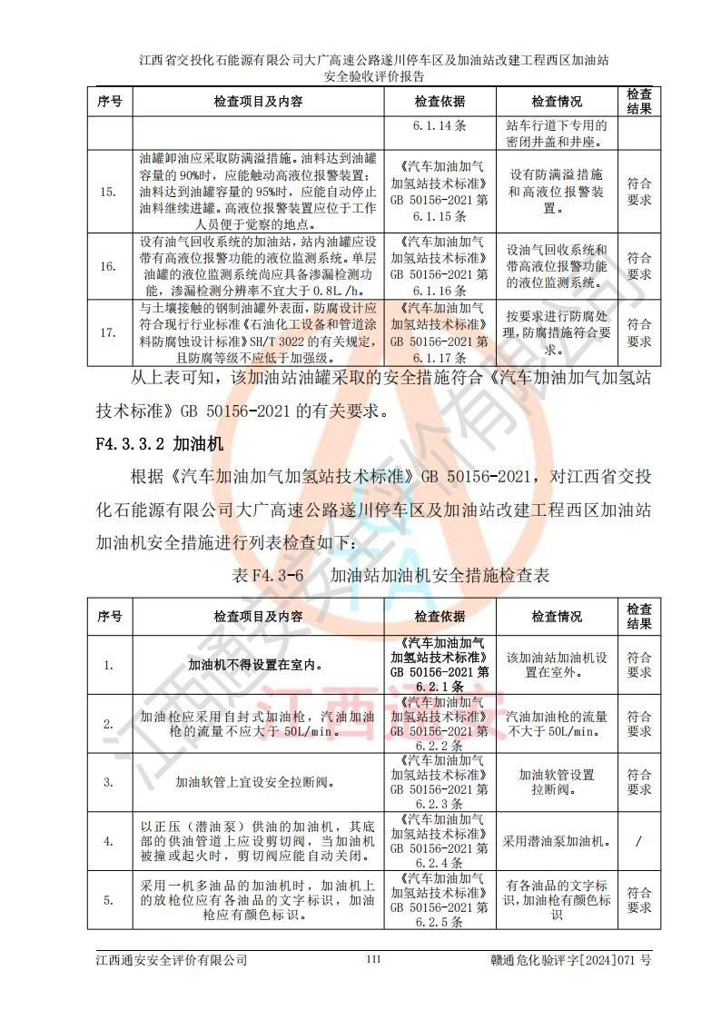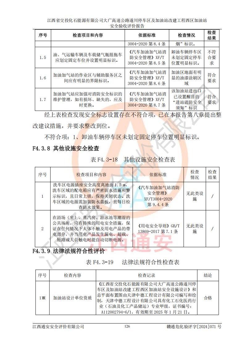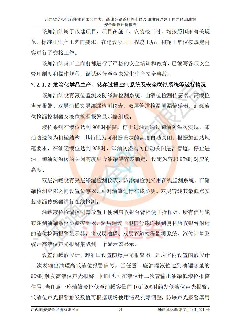 評價結(jié)論 | 該加油站在設(shè)計、施工過程中符合《危險化學品建設(shè)項目安全監(jiān)督管理辦法》(2012年1月30日**安全生產(chǎn)監(jiān)督管理總局令第45號公布,自2012年4月1日起施行;根據(jù)2015年5月27日**安全生產(chǎn)監(jiān)督管理總局令第79號修正)等法規(guī)的要求,工程配套的安全設(shè)施做到了與主體工程同時設(shè)計、同時施工、同時投入生產(chǎn)和使用,符合**有關(guān)建設(shè)項目“三同時”的規(guī)定和要求。 該加油站現(xiàn)場情況與竣工圖紙一致,主體工程安全設(shè)施、安全措施符合法律法規(guī)的規(guī)定和要求,安全設(shè)施正常投用并運行**;公用工程及輔助設(shè)施滿足主體工程生產(chǎn)安全的需要;企業(yè)安全管理體系滿足生產(chǎn)安全的要求。該加油站與周邊裝置和設(shè)施的安全防護距離、安全設(shè)施滿足標準規(guī)范的要求,該加油站的安全條件滿足安全生產(chǎn)的要求。 該加油站已針對本報告提出的安全隱患整改意見組織人員進行整改,已落實到位,企業(yè)安全生產(chǎn)的風險控制在可以接受的范圍內(nèi)。 綜上所述,江西省交投化石能源有限公司大廣高速公路遂川停車區(qū)及加油站改建工程西區(qū)加油站具備**有關(guān)安全生產(chǎn)法律、法規(guī)、部門規(guī)章及標準規(guī)范要求的安全條件,符合經(jīng)營和儲存危險化學品的安全條件要求,具備安全驗收的要求。 | |||