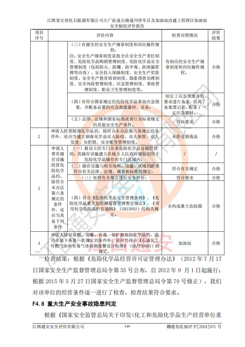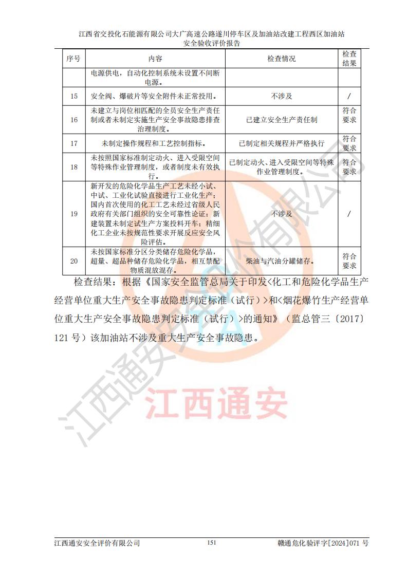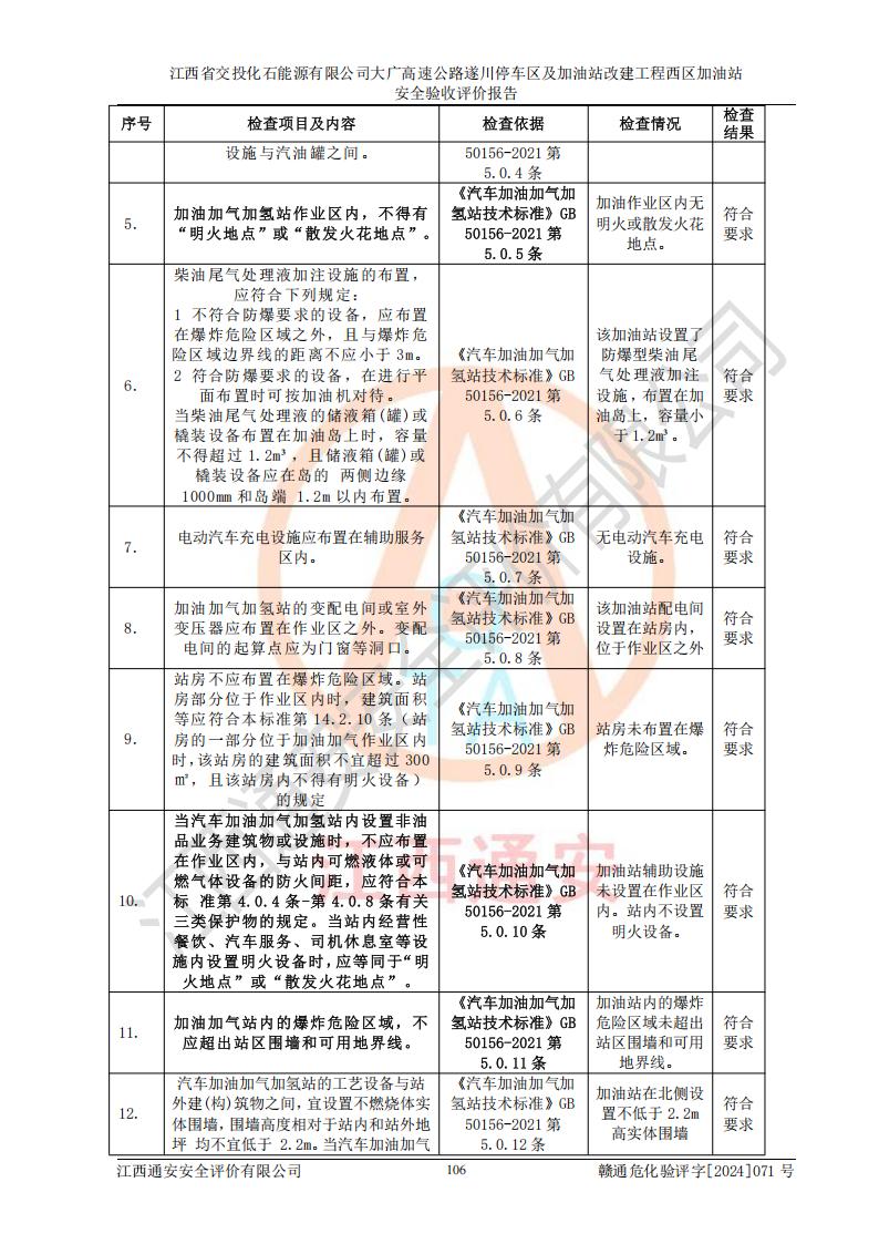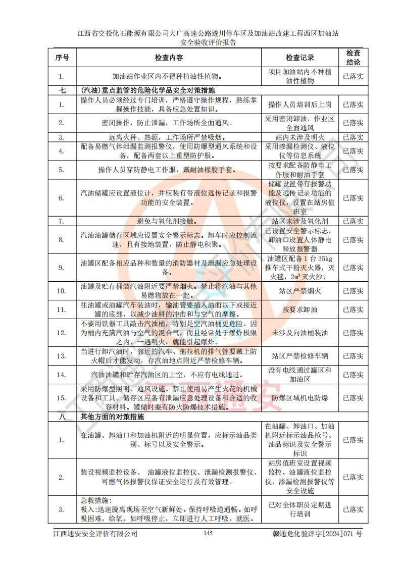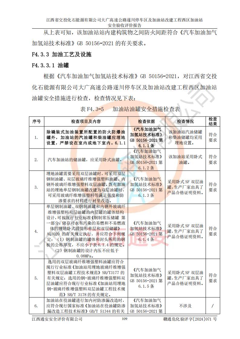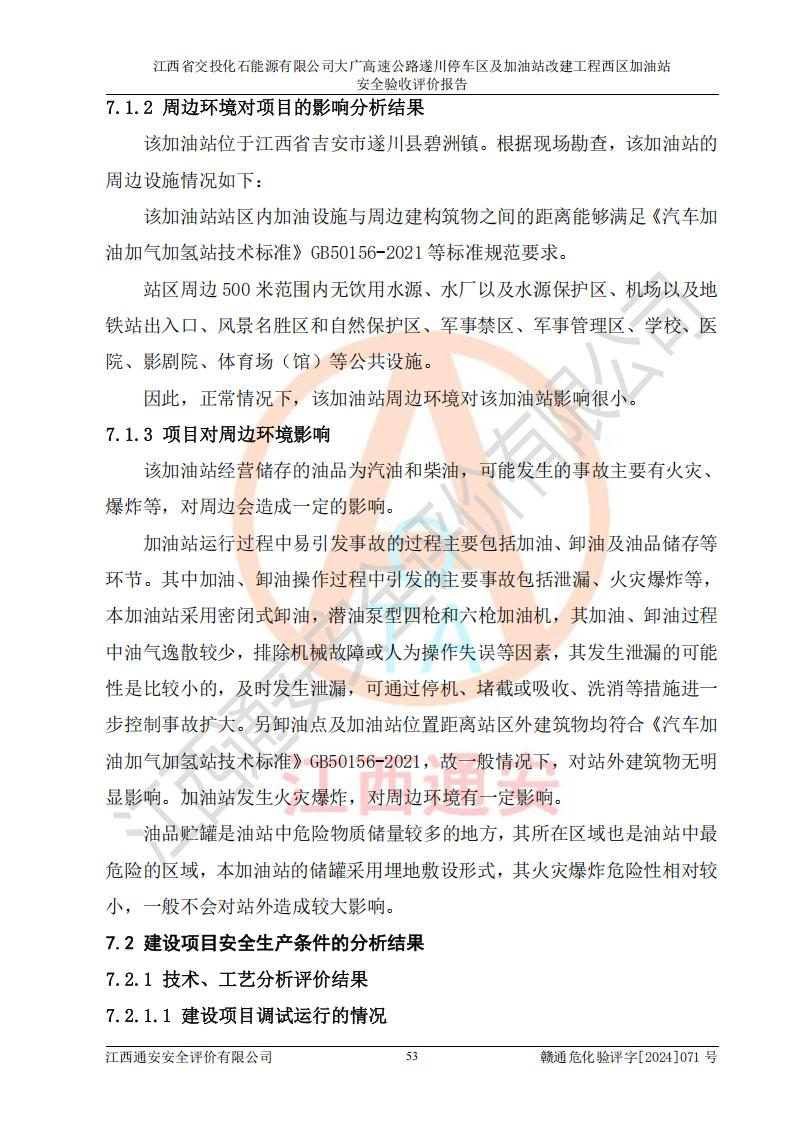 評價結(jié)論 | 該加油站在設(shè)計、施工過程中符合《危險化學品建設(shè)項目安全監(jiān)督管理辦法》(2012年1月30日**安全生產(chǎn)監(jiān)督管理總局令第45號公布,自2012年4月1日起施行;根據(jù)2015年5月27日**安全生產(chǎn)監(jiān)督管理總局令第79號修正)等法規(guī)的要求,工程配套的安全設(shè)施做到了與主體工程同時設(shè)計、同時施工、同時投入生產(chǎn)和使用,符合**有關(guān)建設(shè)項目“三同時”的規(guī)定和要求。 該加油站現(xiàn)場情況與竣工圖紙一致,主體工程安全設(shè)施、安全措施符合法律法規(guī)的規(guī)定和要求,安全設(shè)施正常投用并運行**;公用工程及輔助設(shè)施滿足主體工程生產(chǎn)安全的需要;企業(yè)安全管理體系滿足生產(chǎn)安全的要求。該加油站與周邊裝置和設(shè)施的安全防護距離、安全設(shè)施滿足標準規(guī)范的要求,該加油站的安全條件滿足安全生產(chǎn)的要求。 該加油站已針對本報告提出的安全隱患整改意見組織人員進行整改,已落實到位,企業(yè)安全生產(chǎn)的風險控制在可以接受的范圍內(nèi)。 綜上所述,江西省交投化石能源有限公司大廣高速公路遂川停車區(qū)及加油站改建工程西區(qū)加油站具備**有關(guān)安全生產(chǎn)法律、法規(guī)、部門規(guī)章及標準規(guī)范要求的安全條件,符合經(jīng)營和儲存危險化學品的安全條件要求,具備安全驗收的要求。 | |||