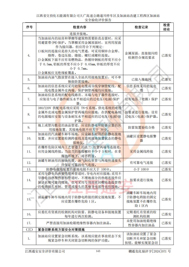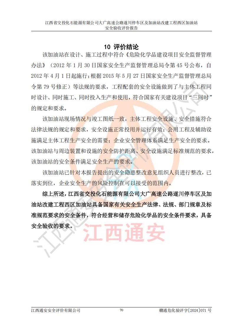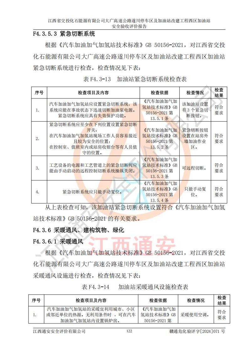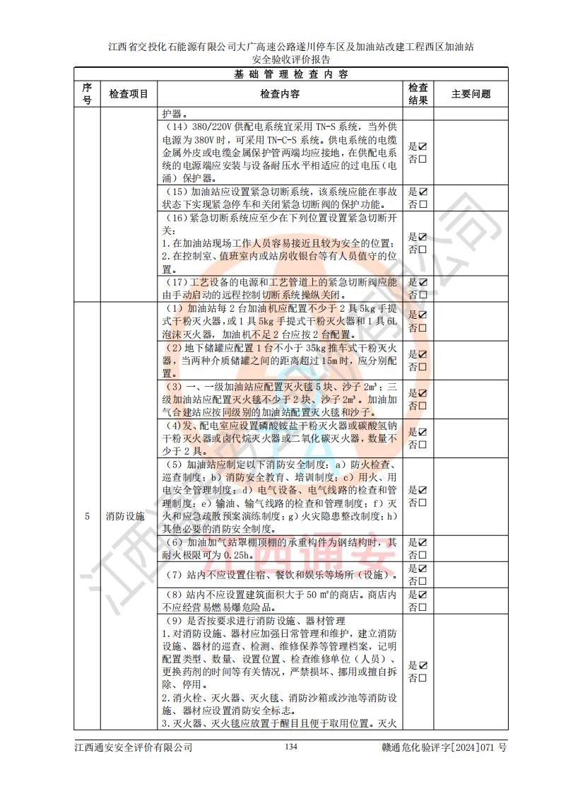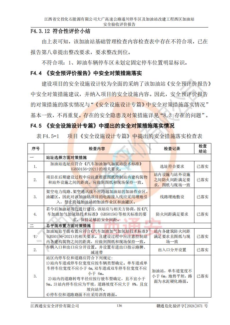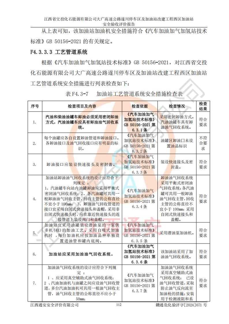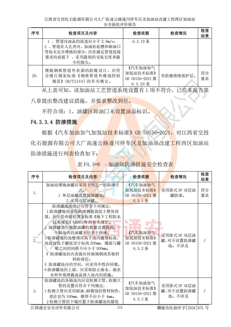 評價結(jié)論 | 該加油站在設(shè)計、施工過程中符合《危險化學品建設(shè)項目安全監(jiān)督管理辦法》(2012年1月30日**安全生產(chǎn)監(jiān)督管理總局令第45號公布,自2012年4月1日起施行;根據(jù)2015年5月27日**安全生產(chǎn)監(jiān)督管理總局令第79號修正)等法規(guī)的要求,工程配套的安全設(shè)施做到了與主體工程同時設(shè)計、同時施工、同時投入生產(chǎn)和使用,符合**有關(guān)建設(shè)項目“三同時”的規(guī)定和要求。 該加油站現(xiàn)場情況與竣工圖紙一致,主體工程安全設(shè)施、安全措施符合法律法規(guī)的規(guī)定和要求,安全設(shè)施正常投用并運行**;公用工程及輔助設(shè)施滿足主體工程生產(chǎn)安全的需要;企業(yè)安全管理體系滿足生產(chǎn)安全的要求。該加油站與周邊裝置和設(shè)施的安全防護距離、安全設(shè)施滿足標準規(guī)范的要求,該加油站的安全條件滿足安全生產(chǎn)的要求。 該加油站已針對本報告提出的安全隱患整改意見組織人員進行整改,已落實到位,企業(yè)安全生產(chǎn)的風險控制在可以接受的范圍內(nèi)。 綜上所述,江西省交投化石能源有限公司大廣高速公路遂川停車區(qū)及加油站改建工程西區(qū)加油站具備**有關(guān)安全生產(chǎn)法律、法規(guī)、部門規(guī)章及標準規(guī)范要求的安全條件,符合經(jīng)營和儲存危險化學品的安全條件要求,具備安全驗收的要求。 | |||