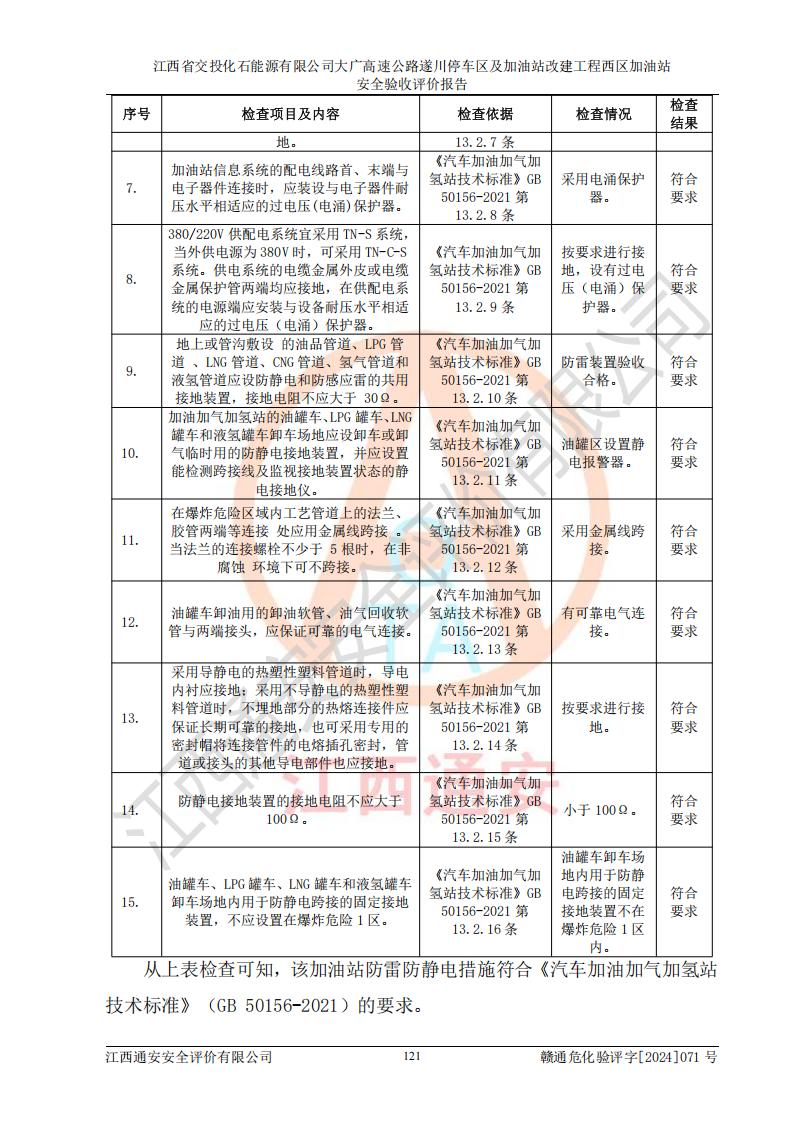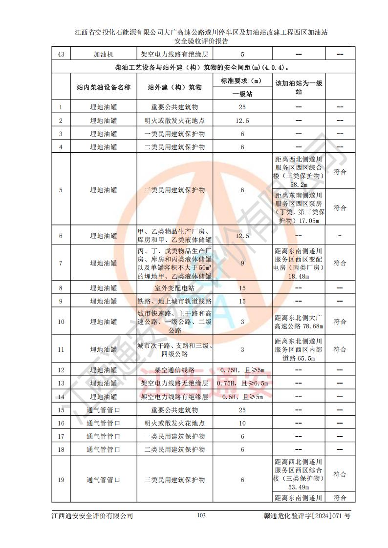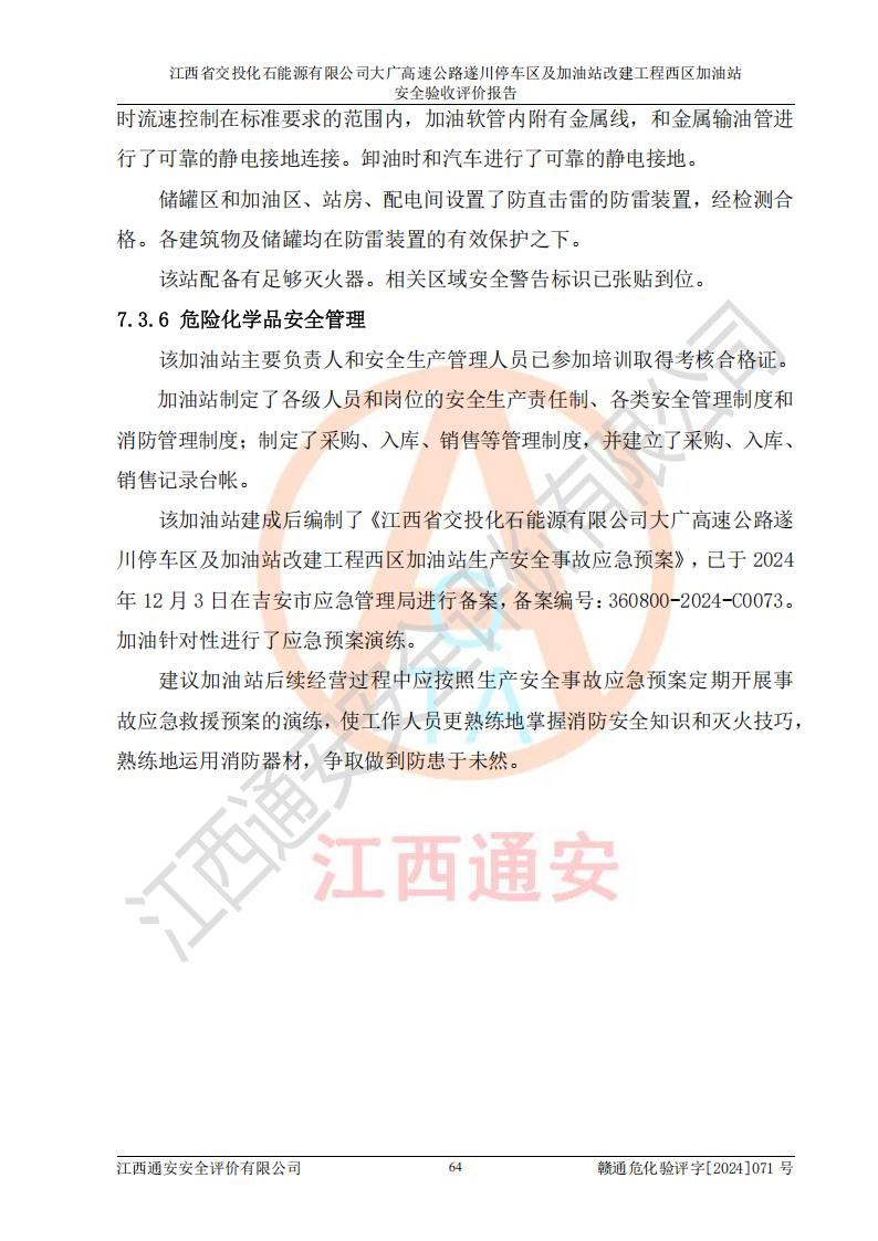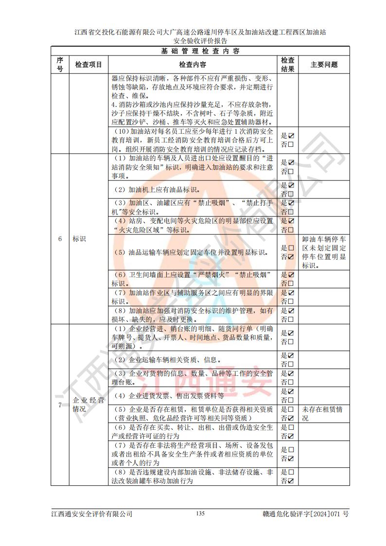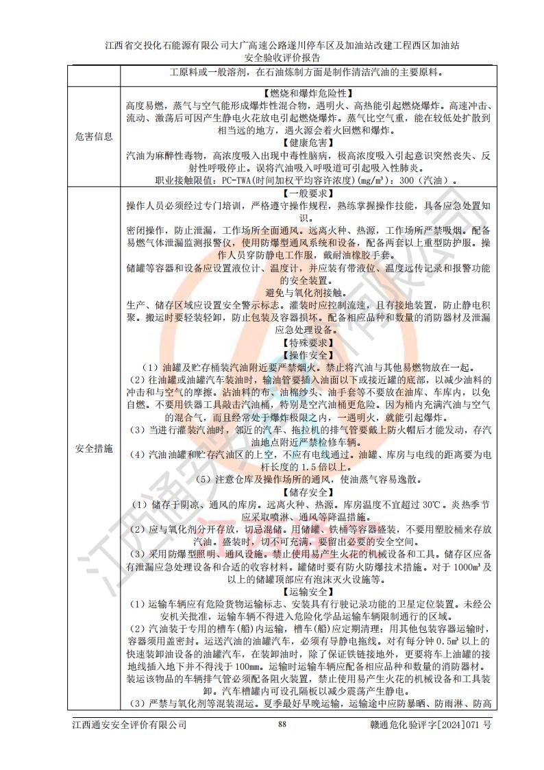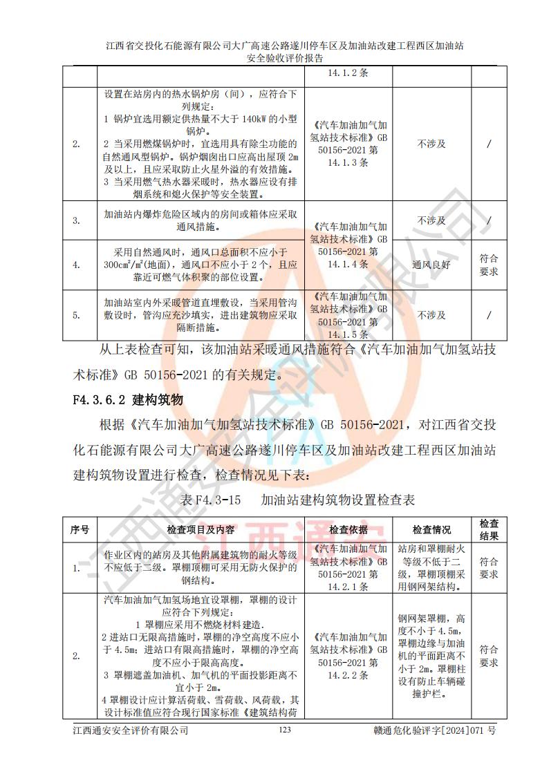 評價結(jié)論 | 該加油站在設(shè)計、施工過程中符合《危險化學品建設(shè)項目安全監(jiān)督管理辦法》(2012年1月30日**安全生產(chǎn)監(jiān)督管理總局令第45號公布,自2012年4月1日起施行;根據(jù)2015年5月27日**安全生產(chǎn)監(jiān)督管理總局令第79號修正)等法規(guī)的要求,工程配套的安全設(shè)施做到了與主體工程同時設(shè)計、同時施工、同時投入生產(chǎn)和使用,符合**有關(guān)建設(shè)項目“三同時”的規(guī)定和要求。 該加油站現(xiàn)場情況與竣工圖紙一致,主體工程安全設(shè)施、安全措施符合法律法規(guī)的規(guī)定和要求,安全設(shè)施正常投用并運行**;公用工程及輔助設(shè)施滿足主體工程生產(chǎn)安全的需要;企業(yè)安全管理體系滿足生產(chǎn)安全的要求。該加油站與周邊裝置和設(shè)施的安全防護距離、安全設(shè)施滿足標準規(guī)范的要求,該加油站的安全條件滿足安全生產(chǎn)的要求。 該加油站已針對本報告提出的安全隱患整改意見組織人員進行整改,已落實到位,企業(yè)安全生產(chǎn)的風險控制在可以接受的范圍內(nèi)。 綜上所述,江西省交投化石能源有限公司大廣高速公路遂川停車區(qū)及加油站改建工程西區(qū)加油站具備**有關(guān)安全生產(chǎn)法律、法規(guī)、部門規(guī)章及標準規(guī)范要求的安全條件,符合經(jīng)營和儲存危險化學品的安全條件要求,具備安全驗收的要求。 | |||