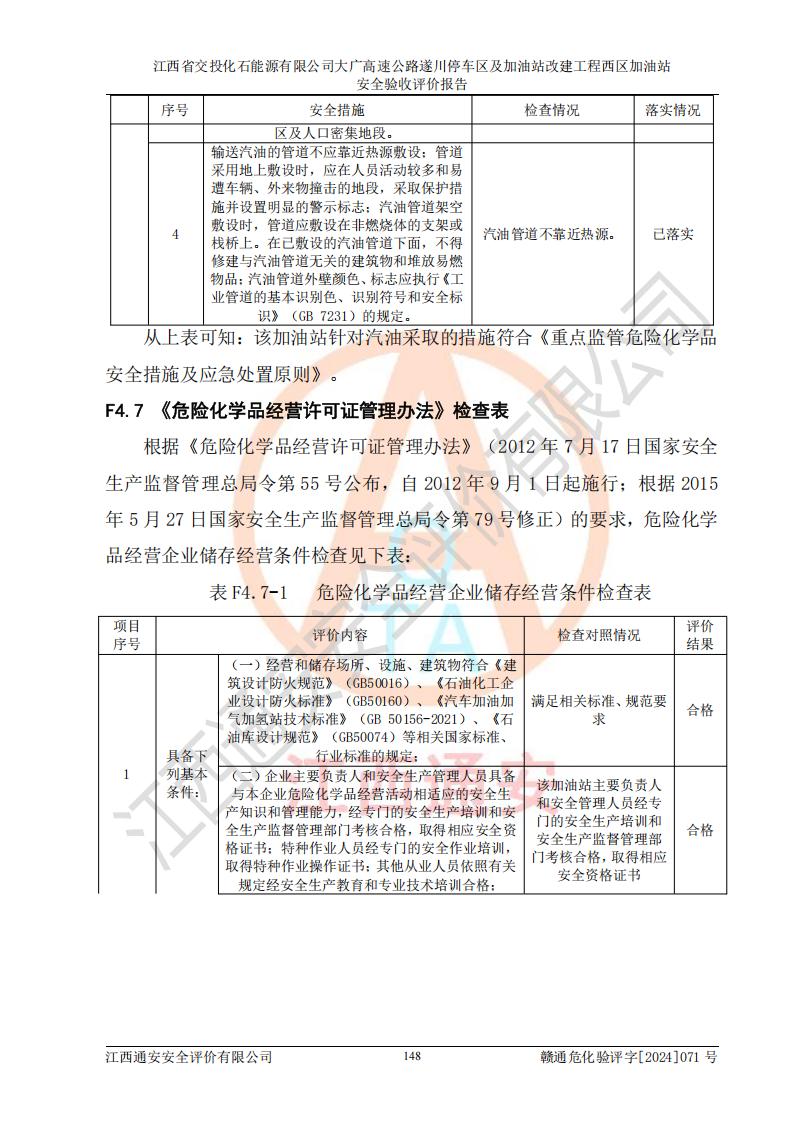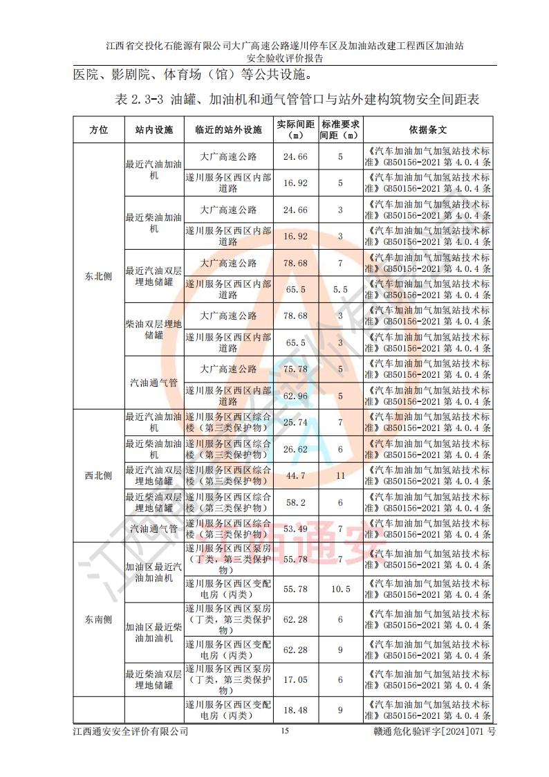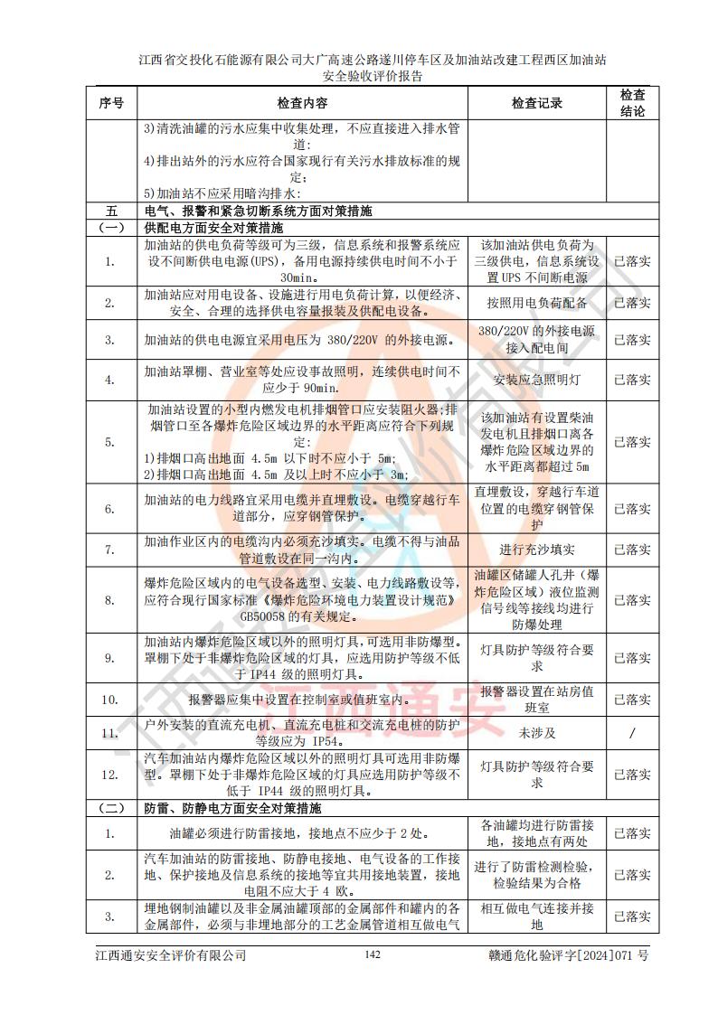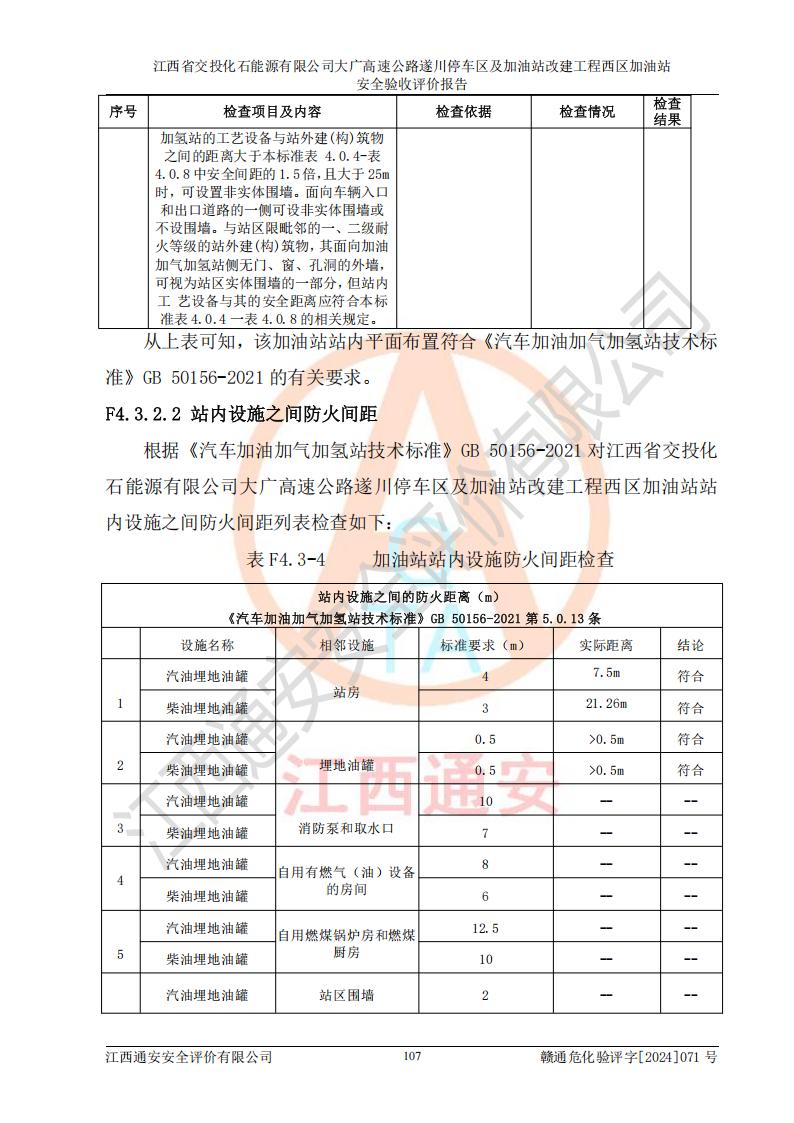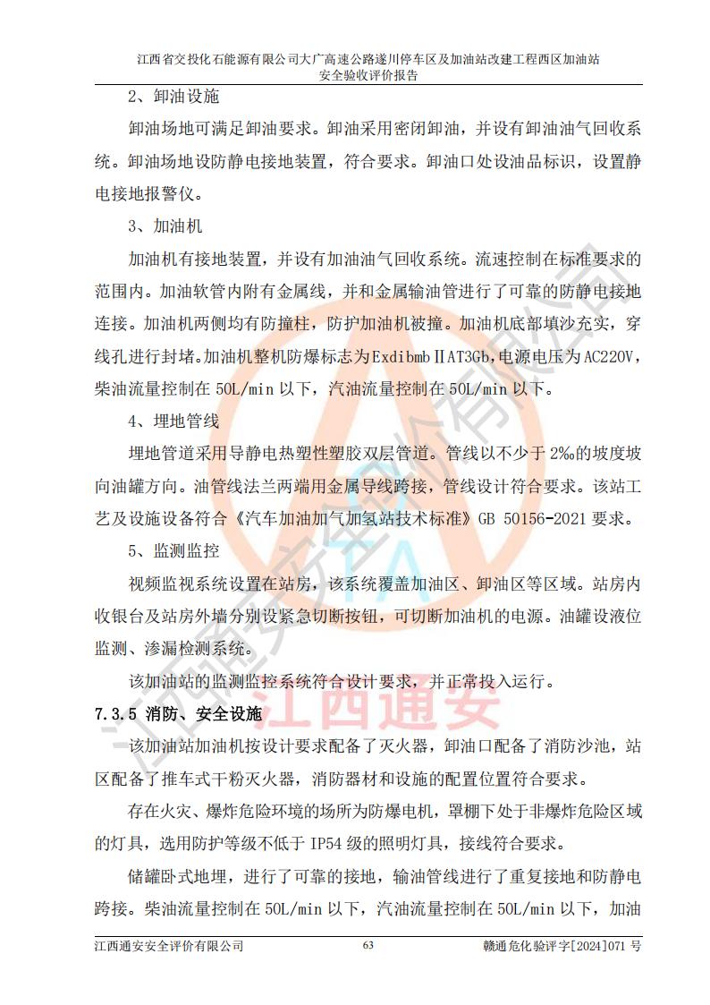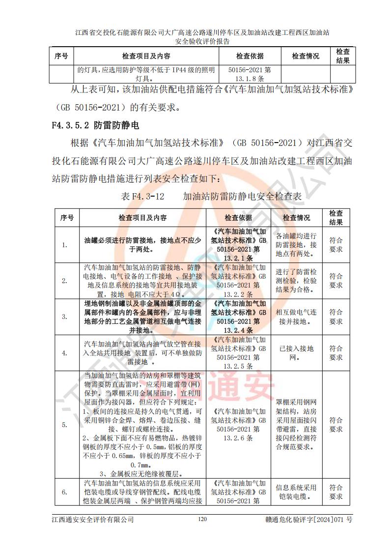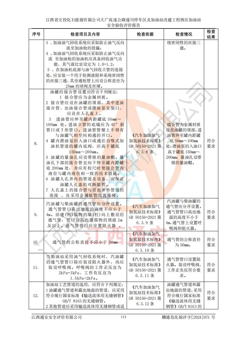 評價結(jié)論 | 該加油站在設(shè)計、施工過程中符合《危險化學品建設(shè)項目安全監(jiān)督管理辦法》(2012年1月30日**安全生產(chǎn)監(jiān)督管理總局令第45號公布,自2012年4月1日起施行;根據(jù)2015年5月27日**安全生產(chǎn)監(jiān)督管理總局令第79號修正)等法規(guī)的要求,工程配套的安全設(shè)施做到了與主體工程同時設(shè)計、同時施工、同時投入生產(chǎn)和使用,符合**有關(guān)建設(shè)項目“三同時”的規(guī)定和要求。 該加油站現(xiàn)場情況與竣工圖紙一致,主體工程安全設(shè)施、安全措施符合法律法規(guī)的規(guī)定和要求,安全設(shè)施正常投用并運行**;公用工程及輔助設(shè)施滿足主體工程生產(chǎn)安全的需要;企業(yè)安全管理體系滿足生產(chǎn)安全的要求。該加油站與周邊裝置和設(shè)施的安全防護距離、安全設(shè)施滿足標準規(guī)范的要求,該加油站的安全條件滿足安全生產(chǎn)的要求。 該加油站已針對本報告提出的安全隱患整改意見組織人員進行整改,已落實到位,企業(yè)安全生產(chǎn)的風險控制在可以接受的范圍內(nèi)。 綜上所述,江西省交投化石能源有限公司大廣高速公路遂川停車區(qū)及加油站改建工程西區(qū)加油站具備**有關(guān)安全生產(chǎn)法律、法規(guī)、部門規(guī)章及標準規(guī)范要求的安全條件,符合經(jīng)營和儲存危險化學品的安全條件要求,具備安全驗收的要求。 | |||