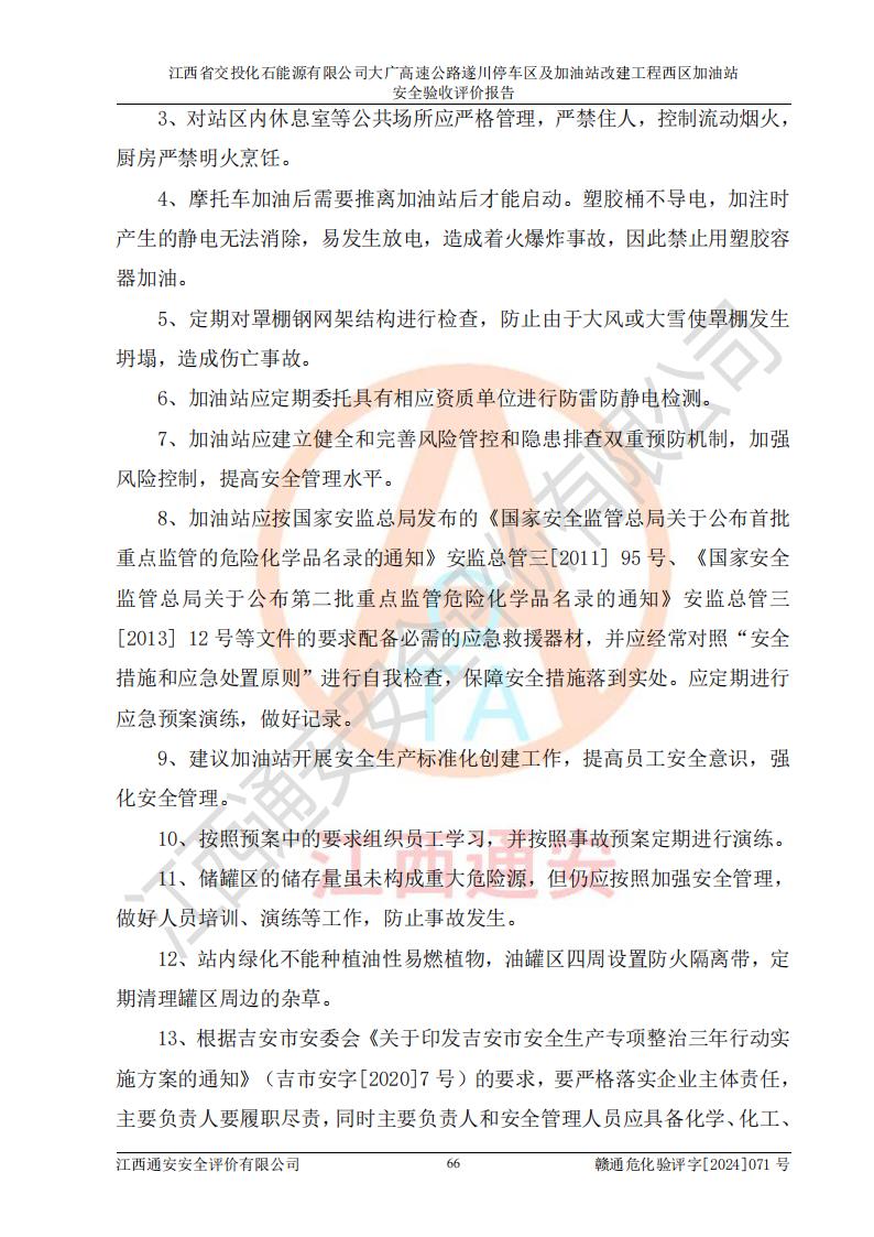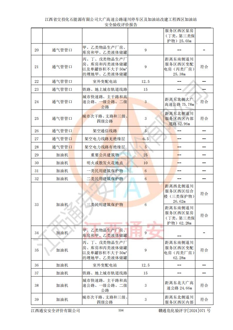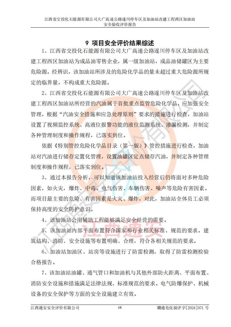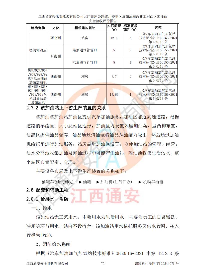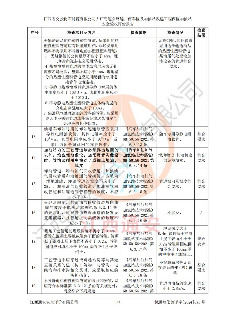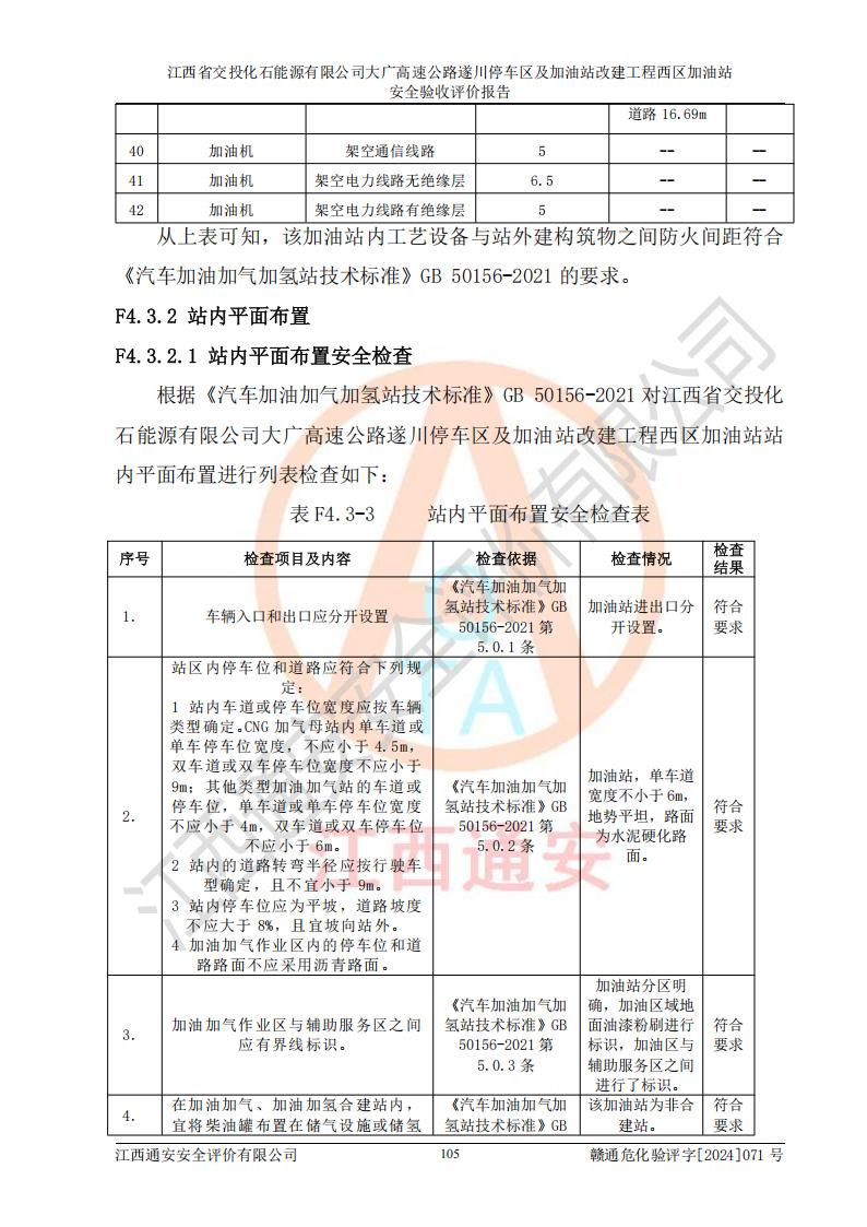 評價結(jié)論 | 該加油站在設(shè)計、施工過程中符合《危險化學品建設(shè)項目安全監(jiān)督管理辦法》(2012年1月30日**安全生產(chǎn)監(jiān)督管理總局令第45號公布,自2012年4月1日起施行;根據(jù)2015年5月27日**安全生產(chǎn)監(jiān)督管理總局令第79號修正)等法規(guī)的要求,工程配套的安全設(shè)施做到了與主體工程同時設(shè)計、同時施工、同時投入生產(chǎn)和使用,符合**有關(guān)建設(shè)項目“三同時”的規(guī)定和要求。 該加油站現(xiàn)場情況與竣工圖紙一致,主體工程安全設(shè)施、安全措施符合法律法規(guī)的規(guī)定和要求,安全設(shè)施正常投用并運行**;公用工程及輔助設(shè)施滿足主體工程生產(chǎn)安全的需要;企業(yè)安全管理體系滿足生產(chǎn)安全的要求。該加油站與周邊裝置和設(shè)施的安全防護距離、安全設(shè)施滿足標準規(guī)范的要求,該加油站的安全條件滿足安全生產(chǎn)的要求。 該加油站已針對本報告提出的安全隱患整改意見組織人員進行整改,已落實到位,企業(yè)安全生產(chǎn)的風險控制在可以接受的范圍內(nèi)。 綜上所述,江西省交投化石能源有限公司大廣高速公路遂川停車區(qū)及加油站改建工程西區(qū)加油站具備**有關(guān)安全生產(chǎn)法律、法規(guī)、部門規(guī)章及標準規(guī)范要求的安全條件,符合經(jīng)營和儲存危險化學品的安全條件要求,具備安全驗收的要求。 | |||