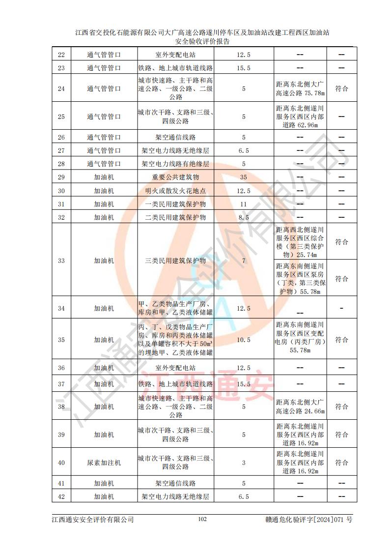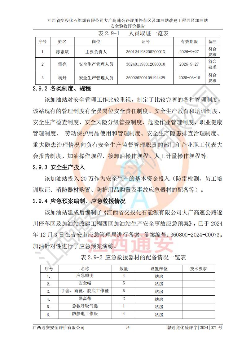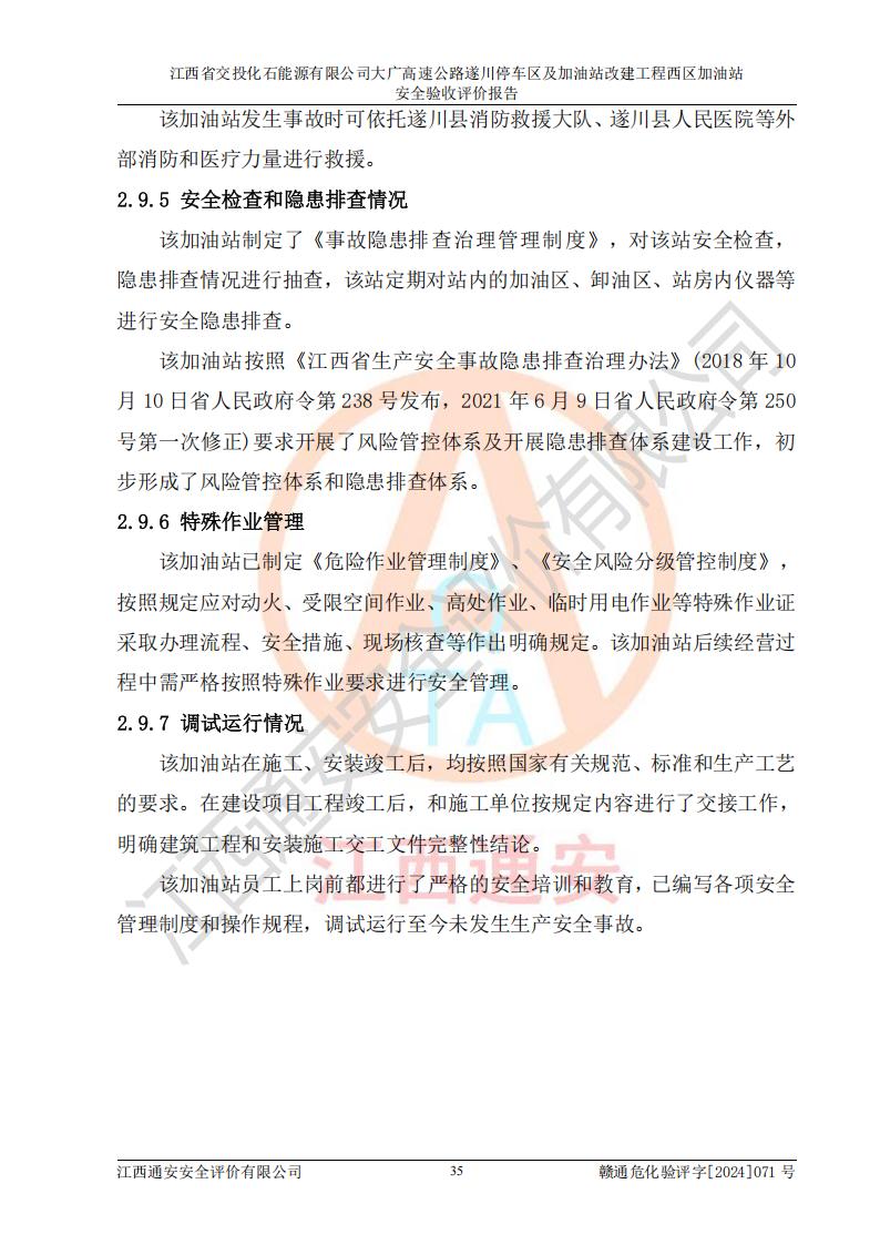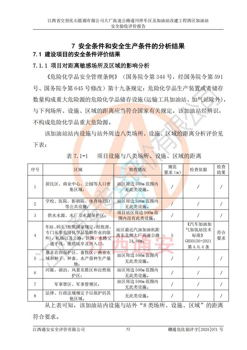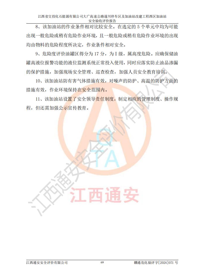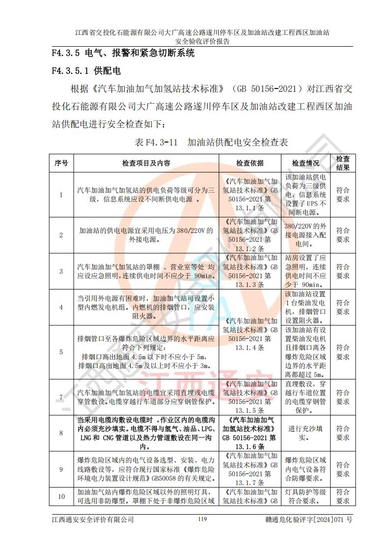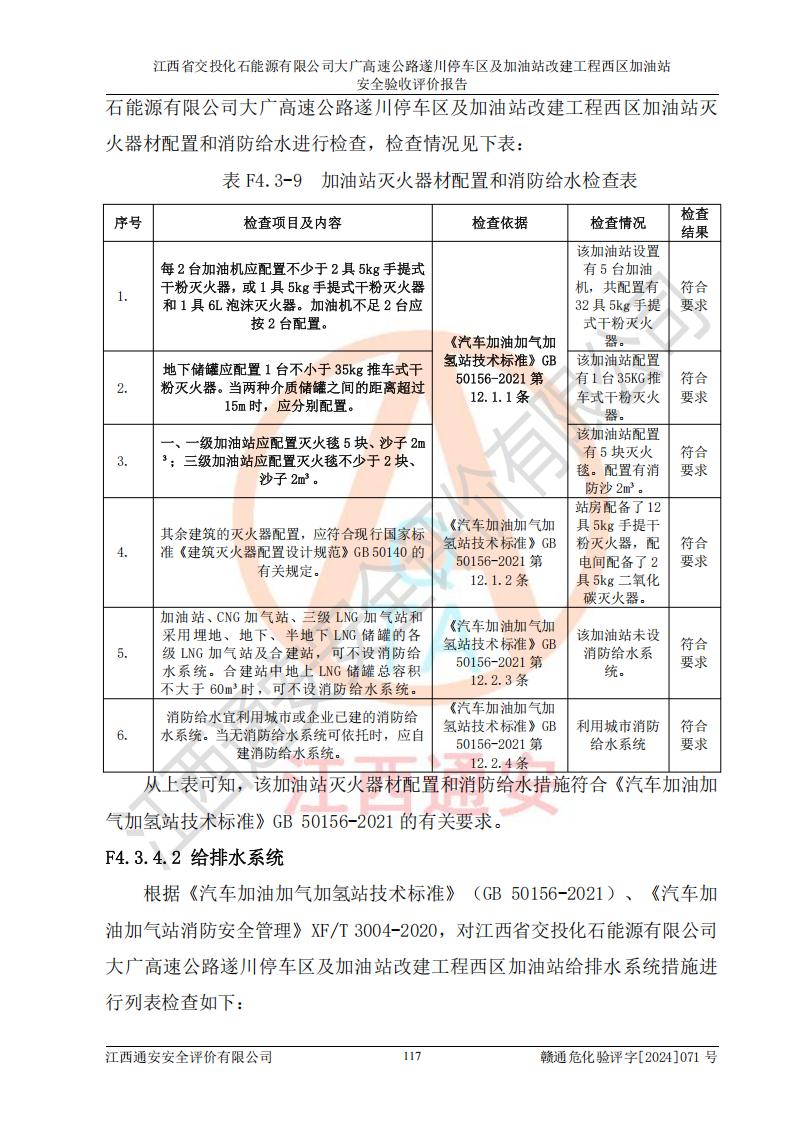評價結(jié)論 | 該加油站在設(shè)計、施工過程中符合《危險化學品建設(shè)項目安全監(jiān)督管理辦法》(2012年1月30日**安全生產(chǎn)監(jiān)督管理總局令第45號公布,自2012年4月1日起施行;根據(jù)2015年5月27日**安全生產(chǎn)監(jiān)督管理總局令第79號修正)等法規(guī)的要求,工程配套的安全設(shè)施做到了與主體工程同時設(shè)計、同時施工、同時投入生產(chǎn)和使用,符合**有關(guān)建設(shè)項目“三同時”的規(guī)定和要求。 該加油站現(xiàn)場情況與竣工圖紙一致,主體工程安全設(shè)施、安全措施符合法律法規(guī)的規(guī)定和要求,安全設(shè)施正常投用并運行**;公用工程及輔助設(shè)施滿足主體工程生產(chǎn)安全的需要;企業(yè)安全管理體系滿足生產(chǎn)安全的要求。該加油站與周邊裝置和設(shè)施的安全防護距離、安全設(shè)施滿足標準規(guī)范的要求,該加油站的安全條件滿足安全生產(chǎn)的要求。 該加油站已針對本報告提出的安全隱患整改意見組織人員進行整改,已落實到位,企業(yè)安全生產(chǎn)的風險控制在可以接受的范圍內(nèi)。 綜上所述,江西省交投化石能源有限公司大廣高速公路遂川停車區(qū)及加油站改建工程西區(qū)加油站具備**有關(guān)安全生產(chǎn)法律、法規(guī)、部門規(guī)章及標準規(guī)范要求的安全條件,符合經(jīng)營和儲存危險化學品的安全條件要求,具備安全驗收的要求。 | |||