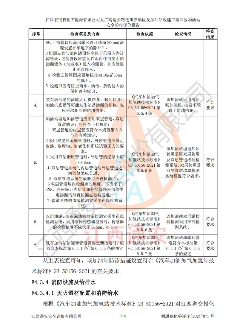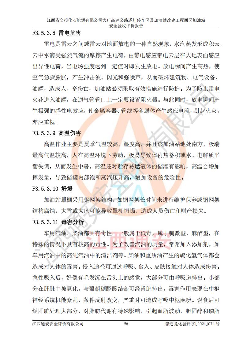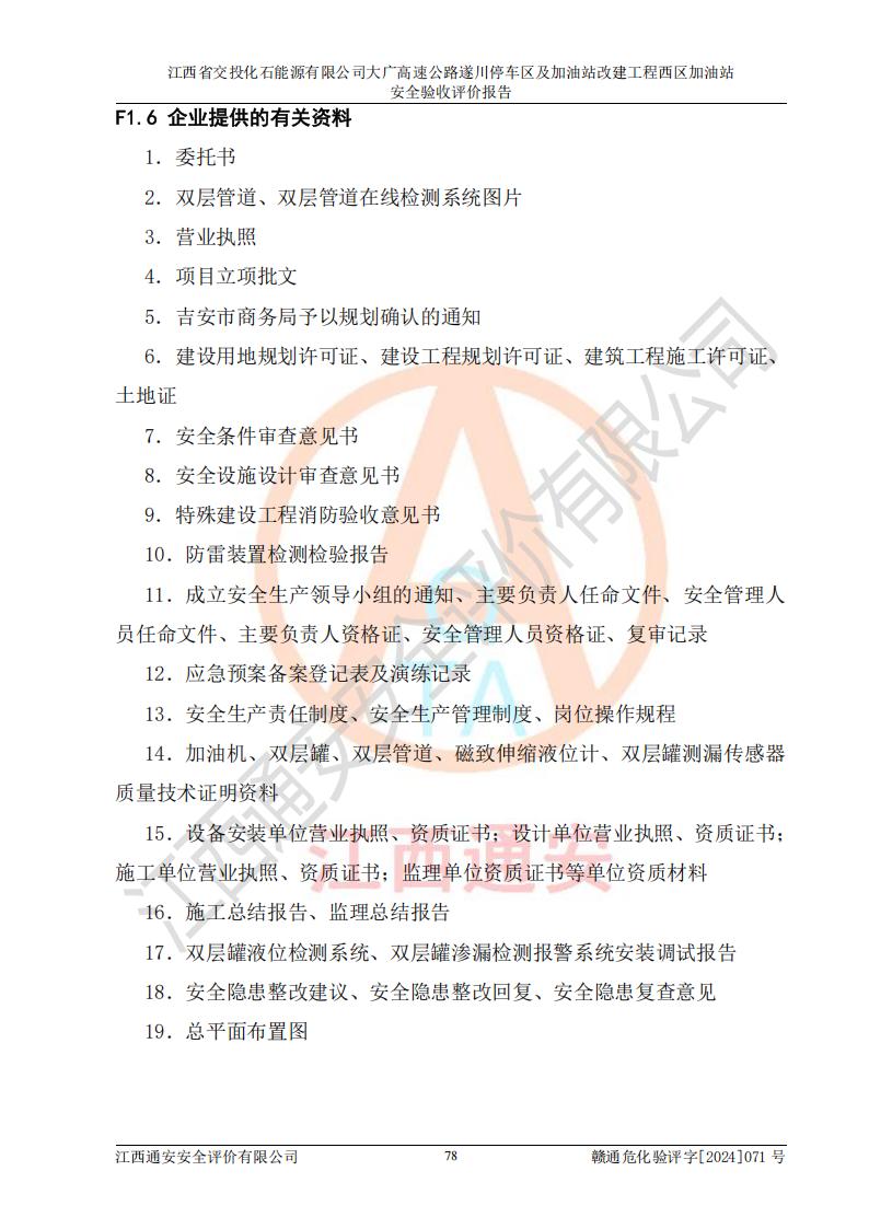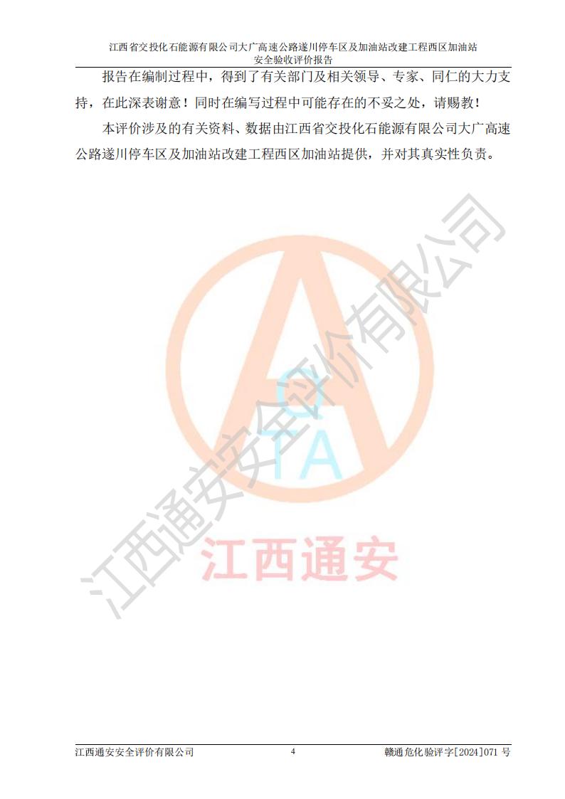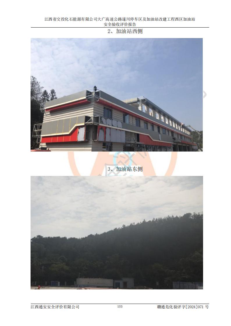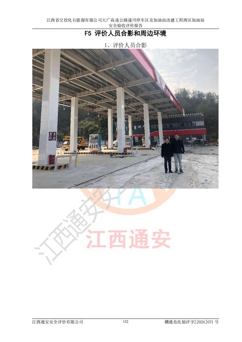 評價結(jié)論 | 該加油站在設(shè)計、施工過程中符合《危險化學品建設(shè)項目安全監(jiān)督管理辦法》(2012年1月30日**安全生產(chǎn)監(jiān)督管理總局令第45號公布,自2012年4月1日起施行;根據(jù)2015年5月27日**安全生產(chǎn)監(jiān)督管理總局令第79號修正)等法規(guī)的要求,工程配套的安全設(shè)施做到了與主體工程同時設(shè)計、同時施工、同時投入生產(chǎn)和使用,符合**有關(guān)建設(shè)項目“三同時”的規(guī)定和要求。 該加油站現(xiàn)場情況與竣工圖紙一致,主體工程安全設(shè)施、安全措施符合法律法規(guī)的規(guī)定和要求,安全設(shè)施正常投用并運行**;公用工程及輔助設(shè)施滿足主體工程生產(chǎn)安全的需要;企業(yè)安全管理體系滿足生產(chǎn)安全的要求。該加油站與周邊裝置和設(shè)施的安全防護距離、安全設(shè)施滿足標準規(guī)范的要求,該加油站的安全條件滿足安全生產(chǎn)的要求。 該加油站已針對本報告提出的安全隱患整改意見組織人員進行整改,已落實到位,企業(yè)安全生產(chǎn)的風險控制在可以接受的范圍內(nèi)。 綜上所述,江西省交投化石能源有限公司大廣高速公路遂川停車區(qū)及加油站改建工程西區(qū)加油站具備**有關(guān)安全生產(chǎn)法律、法規(guī)、部門規(guī)章及標準規(guī)范要求的安全條件,符合經(jīng)營和儲存危險化學品的安全條件要求,具備安全驗收的要求。 | |||
