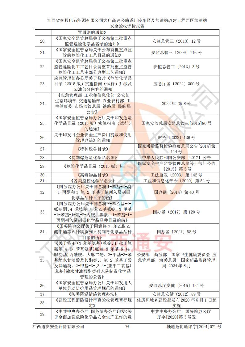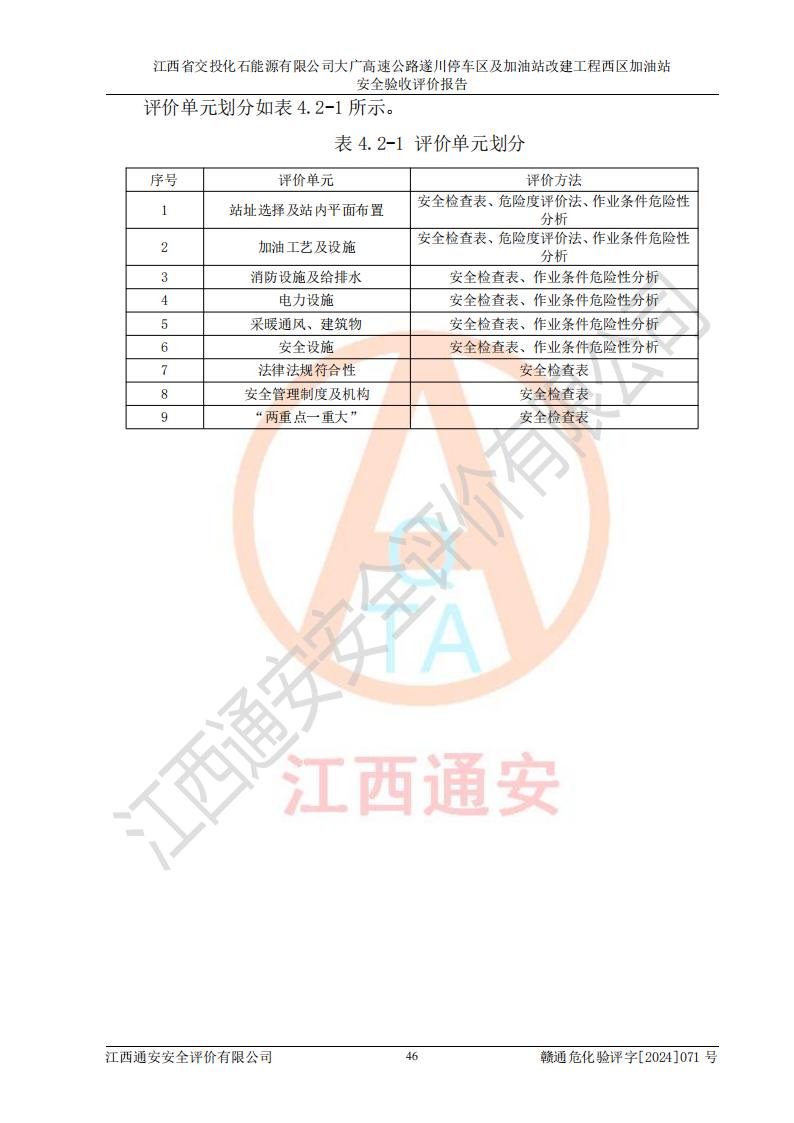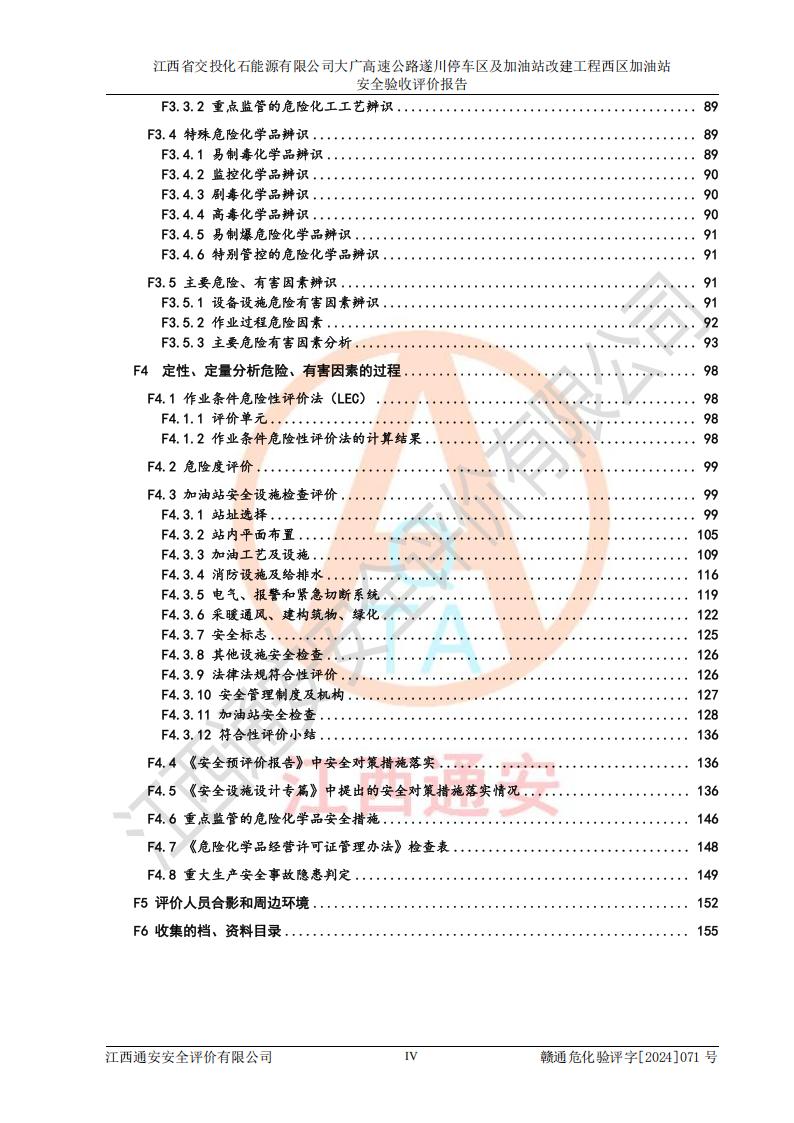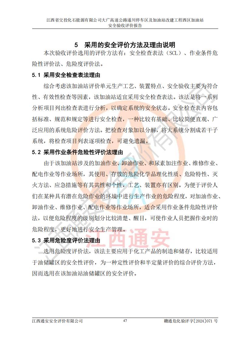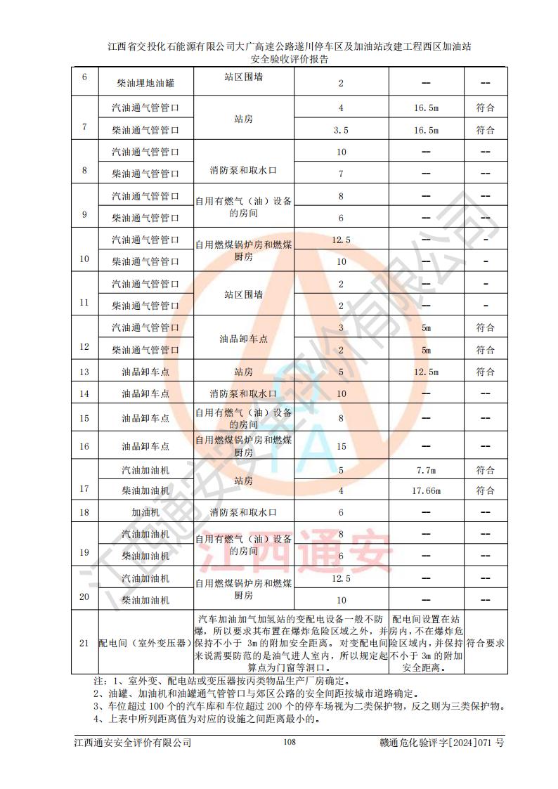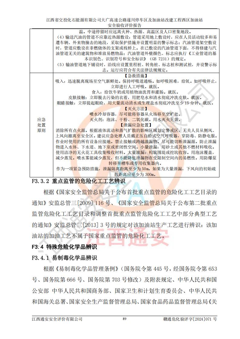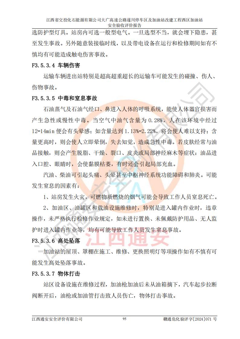 評價結(jié)論 | 該加油站在設(shè)計、施工過程中符合《危險化學品建設(shè)項目安全監(jiān)督管理辦法》(2012年1月30日**安全生產(chǎn)監(jiān)督管理總局令第45號公布,自2012年4月1日起施行;根據(jù)2015年5月27日**安全生產(chǎn)監(jiān)督管理總局令第79號修正)等法規(guī)的要求,工程配套的安全設(shè)施做到了與主體工程同時設(shè)計、同時施工、同時投入生產(chǎn)和使用,符合**有關(guān)建設(shè)項目“三同時”的規(guī)定和要求。 該加油站現(xiàn)場情況與竣工圖紙一致,主體工程安全設(shè)施、安全措施符合法律法規(guī)的規(guī)定和要求,安全設(shè)施正常投用并運行**;公用工程及輔助設(shè)施滿足主體工程生產(chǎn)安全的需要;企業(yè)安全管理體系滿足生產(chǎn)安全的要求。該加油站與周邊裝置和設(shè)施的安全防護距離、安全設(shè)施滿足標準規(guī)范的要求,該加油站的安全條件滿足安全生產(chǎn)的要求。 該加油站已針對本報告提出的安全隱患整改意見組織人員進行整改,已落實到位,企業(yè)安全生產(chǎn)的風險控制在可以接受的范圍內(nèi)。 綜上所述,江西省交投化石能源有限公司大廣高速公路遂川停車區(qū)及加油站改建工程西區(qū)加油站具備**有關(guān)安全生產(chǎn)法律、法規(guī)、部門規(guī)章及標準規(guī)范要求的安全條件,符合經(jīng)營和儲存危險化學品的安全條件要求,具備安全驗收的要求。 | |||