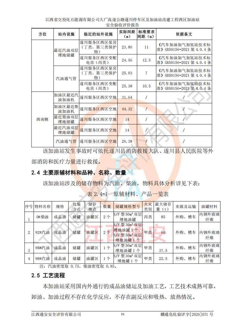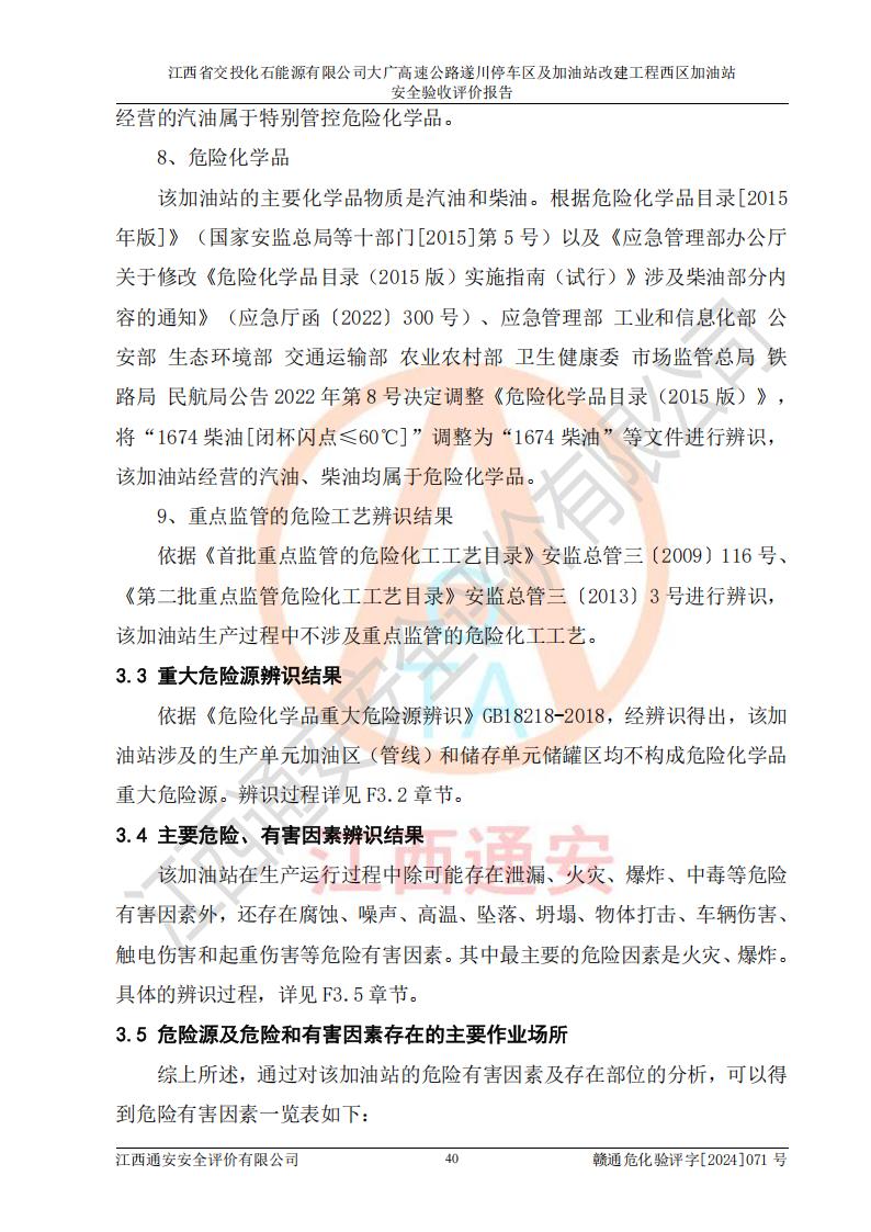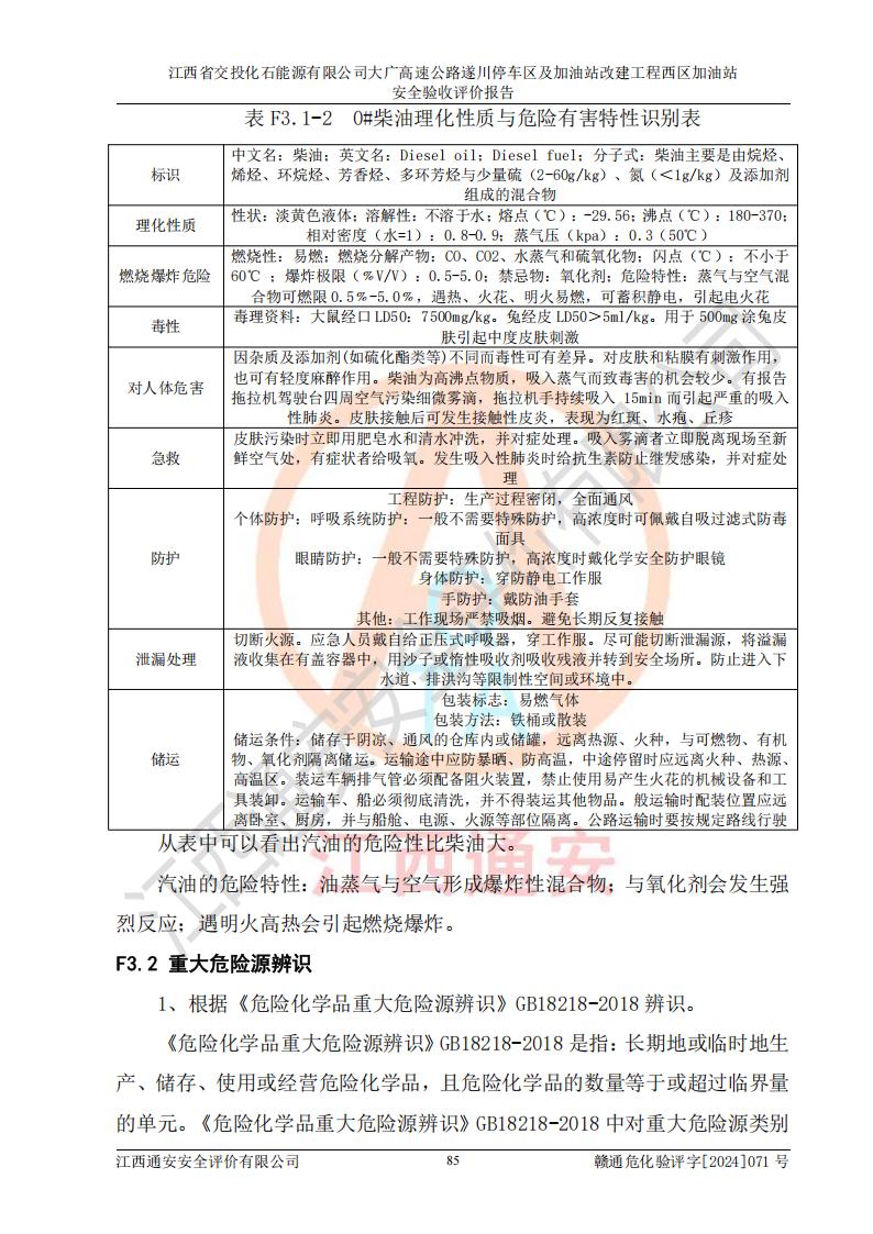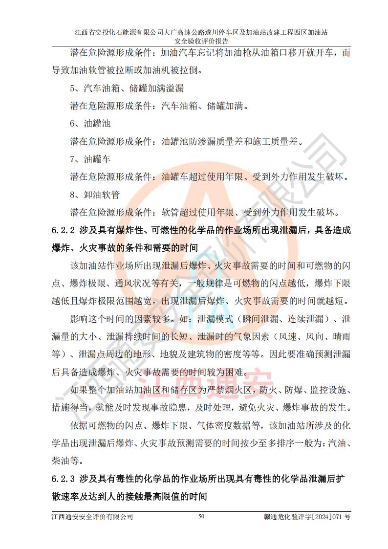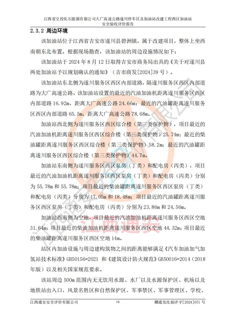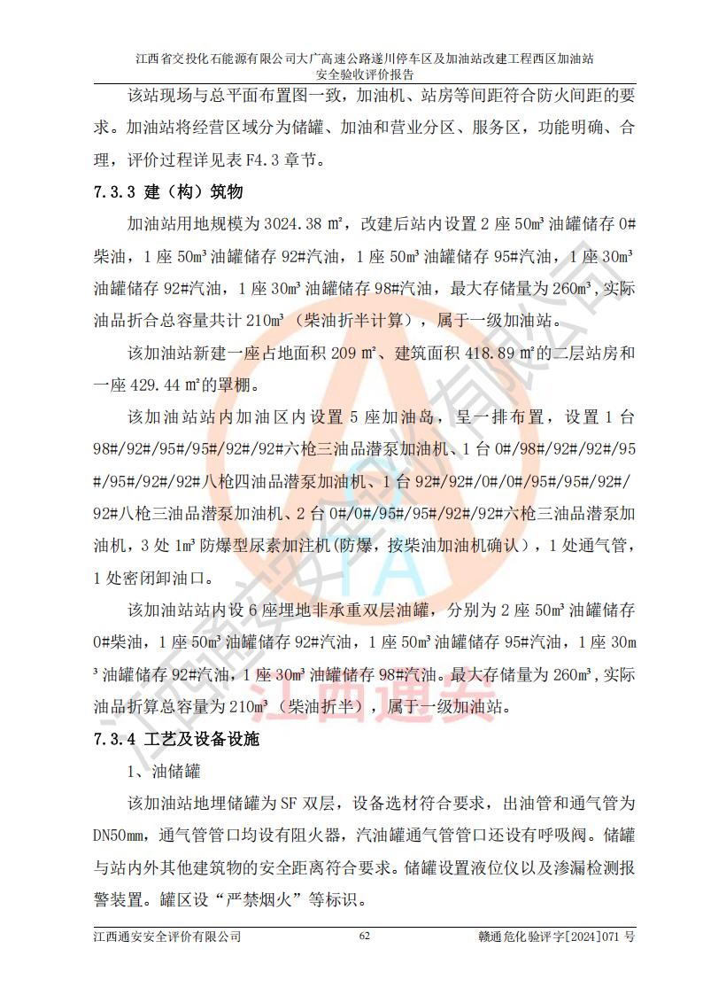 項目簡介 | 江西省交投化石能源有限公司成立于2023年6月13日,為江西省交通投資集團有限責任公司子公司,企業(yè)類型:有限責任公司(非自然人投資或控股的法人獨資),法定**人:陳大學。經(jīng)營范圍為:許可項目:建設(shè)工程施工(除核電站建設(shè)經(jīng)營、民用機場建設(shè)),建設(shè)工程設(shè)計,建設(shè)工程勘察,建設(shè)工程施工(依法須經(jīng)批準的項目,經(jīng)相關(guān)部門批準后在許可**期內(nèi)方可開展經(jīng)營活動,具體經(jīng)營項目和許可期限以相關(guān)部門批準文件或許可證件為準)一般項目:石油制品銷售(不含危險化學品),化工產(chǎn)品銷售(不含許可類化工產(chǎn)品),成品油批發(fā)(不含危險化學品),煉油、化工生產(chǎn)**設(shè)備銷售,非居住房地產(chǎn)租賃,住房租賃,租賃服務(wù)(不含許可類租賃服務(wù)),工程管理服務(wù),潤滑油銷售(除依法須經(jīng)批準的項目外,憑營業(yè)執(zhí)照依法自主開展經(jīng)營活動)。該站位于江西省吉安市遂川縣碧洲鎮(zhèn)。 該加油站改建前為中國石化銷售股份有限公司江西吉安石油分公司遂川服務(wù)區(qū)高速西加油站。江西省交投化石能源有限公司收購了該加油站。 江西省交投化石能源有限公司大廣高速公路遂川停車區(qū)及加油站改建工程西區(qū)加油站位于江西省吉安市遂川縣碧洲鎮(zhèn),占地規(guī)模和建筑面積:總用地面積3024.38m2,建筑計容面積848.33m2;新建二層框架結(jié)構(gòu)站房418.89m2。新建一座鋼結(jié)構(gòu)罩棚,投影面積971.29m2,建筑面積429.44m2。 該加油站改建前站內(nèi)設(shè)置了1座50m3的0#柴油埋地臥式雙層貯罐、1座30m3的0#柴油埋地臥式雙層貯罐、1座30m3的92#汽油埋地臥式雙層貯罐、1座50m3的92#汽油埋地臥式油罐、1座50m3的95#汽油埋地臥式雙層油罐。*大存儲量為210m3,實際油品折算總?cè)萘繛?70m3(柴油折半),屬于**加油站。改建后站內(nèi)設(shè)置2座50m3油罐儲存0#柴油,1座50m3油罐儲存92#汽油,1座50m3油罐儲存95#汽油,1座30m3油罐儲存92#汽油,1座30m3油罐儲存98#汽油,*大存儲量為260m3,實際油品折合總?cè)萘抗灿?10m3(柴油折半計算),屬于**加油站。加油站等級未發(fā)生改變。 該加油站的主要化學品物質(zhì)是汽油和柴油。根據(jù)危險化學品目錄[2015年版]》(**安監(jiān)總局等十部門[2015]第5號)以及《應急管理部辦公廳關(guān)于修改《危險化學品目錄(2015版)實施指南(試行)》涉及柴油部分內(nèi)容的通知》(應急廳函〔2022〕300號)、應急管理部 工業(yè)和信息化部 公安部 生態(tài)環(huán)境部 交通運輸部 農(nóng)業(yè)農(nóng)村部 衛(wèi)生健康委 市場監(jiān)管總局 鐵路局 民航局公告2022年第8號決定調(diào)整《危險化學品目錄(2015版)》,將“1674柴油[閉杯閃點≤60℃]”調(diào)整為“1674柴油”等文件進行辨識:該加油站經(jīng)營的汽油、柴油均屬于危險化學品。 | |||
