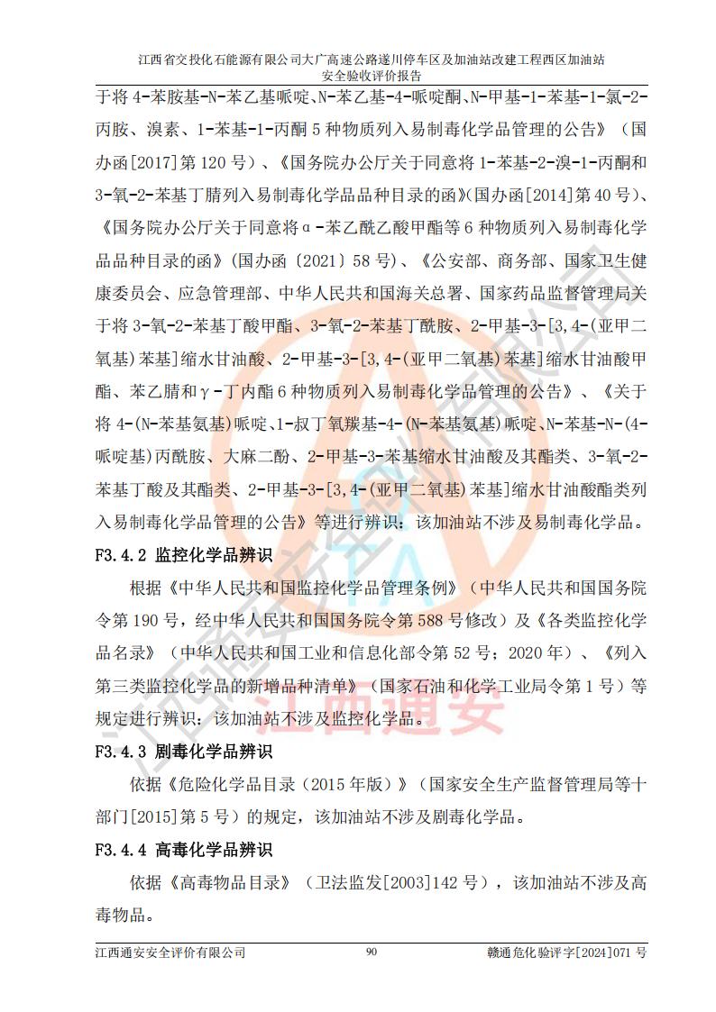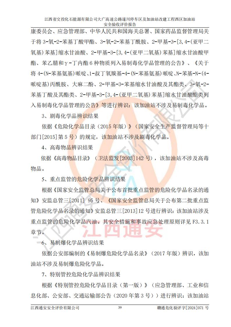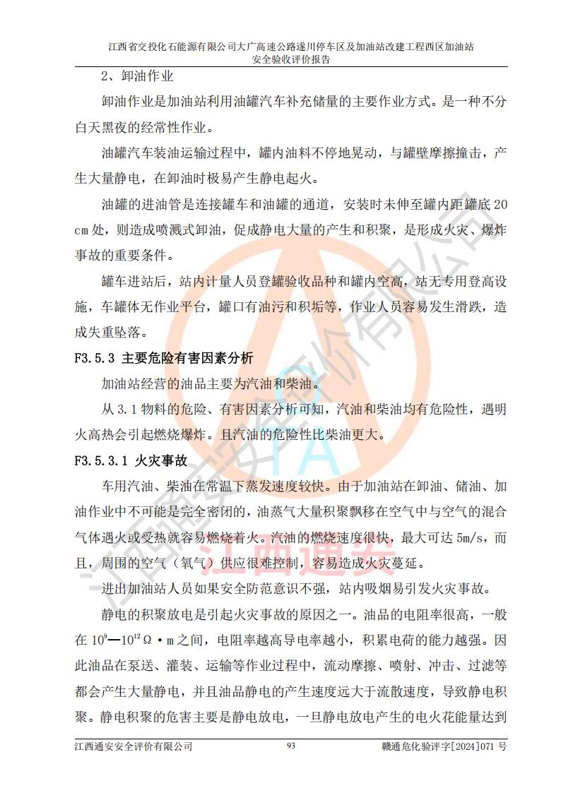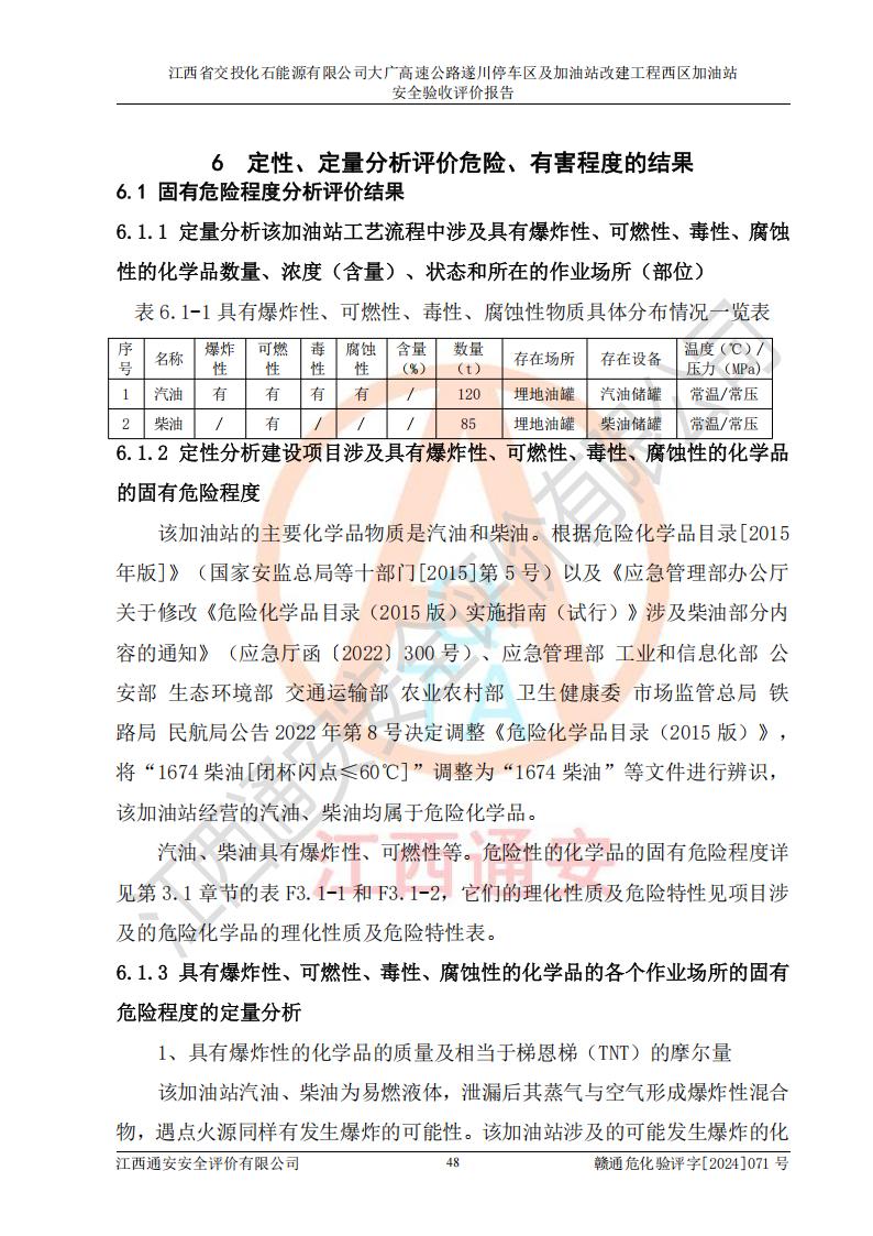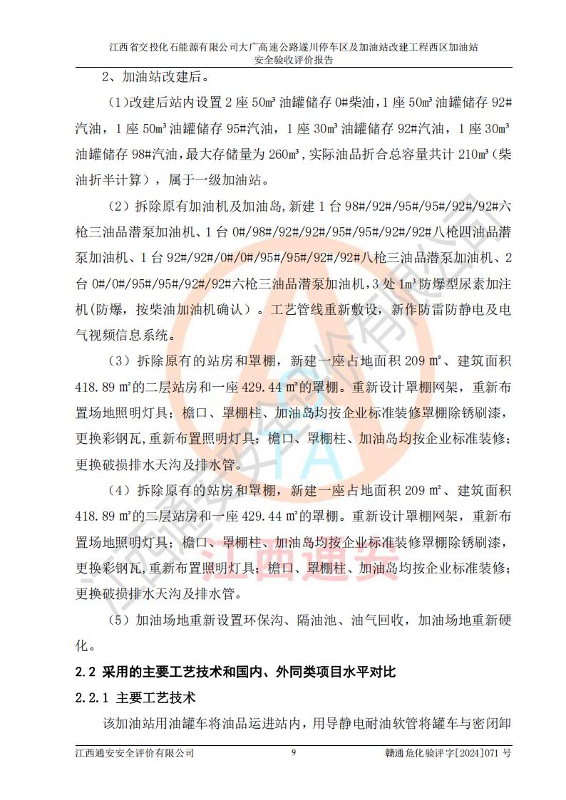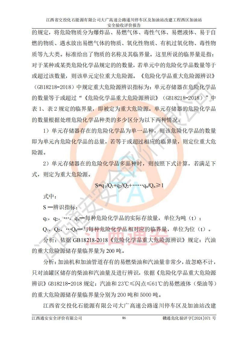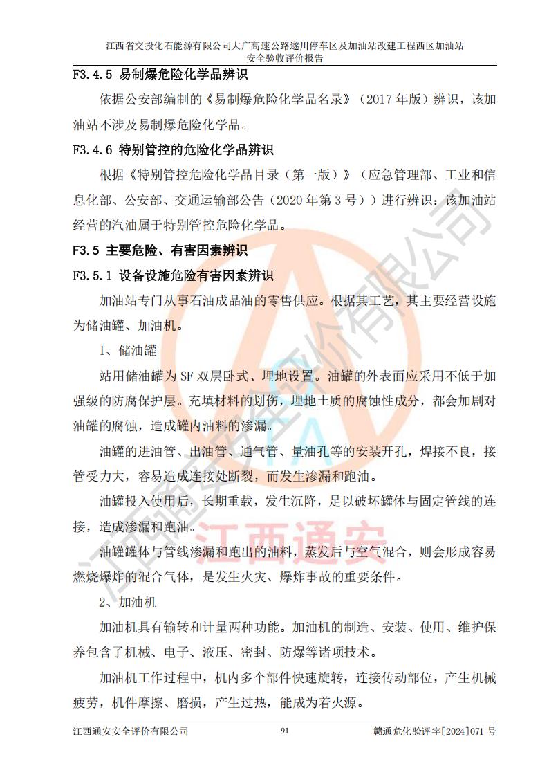 項目簡介 | 江西省交投化石能源有限公司成立于2023年6月13日,為江西省交通投資集團有限責任公司子公司,企業(yè)類型:有限責任公司(非自然人投資或控股的法人獨資),法定**人:陳大學。經(jīng)營范圍為:許可項目:建設(shè)工程施工(除核電站建設(shè)經(jīng)營、民用機場建設(shè)),建設(shè)工程設(shè)計,建設(shè)工程勘察,建設(shè)工程施工(依法須經(jīng)批準的項目,經(jīng)相關(guān)部門批準后在許可**期內(nèi)方可開展經(jīng)營活動,具體經(jīng)營項目和許可期限以相關(guān)部門批準文件或許可證件為準)一般項目:石油制品銷售(不含危險化學品),化工產(chǎn)品銷售(不含許可類化工產(chǎn)品),成品油批發(fā)(不含危險化學品),煉油、化工生產(chǎn)**設(shè)備銷售,非居住房地產(chǎn)租賃,住房租賃,租賃服務(wù)(不含許可類租賃服務(wù)),工程管理服務(wù),潤滑油銷售(除依法須經(jīng)批準的項目外,憑營業(yè)執(zhí)照依法自主開展經(jīng)營活動)。該站位于江西省吉安市遂川縣碧洲鎮(zhèn)。 該加油站改建前為中國石化銷售股份有限公司江西吉安石油分公司遂川服務(wù)區(qū)高速西加油站。江西省交投化石能源有限公司收購了該加油站。 江西省交投化石能源有限公司大廣高速公路遂川停車區(qū)及加油站改建工程西區(qū)加油站位于江西省吉安市遂川縣碧洲鎮(zhèn),占地規(guī)模和建筑面積:總用地面積3024.38m2,建筑計容面積848.33m2;新建二層框架結(jié)構(gòu)站房418.89m2。新建一座鋼結(jié)構(gòu)罩棚,投影面積971.29m2,建筑面積429.44m2。 該加油站改建前站內(nèi)設(shè)置了1座50m3的0#柴油埋地臥式雙層貯罐、1座30m3的0#柴油埋地臥式雙層貯罐、1座30m3的92#汽油埋地臥式雙層貯罐、1座50m3的92#汽油埋地臥式油罐、1座50m3的95#汽油埋地臥式雙層油罐。*大存儲量為210m3,實際油品折算總?cè)萘繛?70m3(柴油折半),屬于**加油站。改建后站內(nèi)設(shè)置2座50m3油罐儲存0#柴油,1座50m3油罐儲存92#汽油,1座50m3油罐儲存95#汽油,1座30m3油罐儲存92#汽油,1座30m3油罐儲存98#汽油,*大存儲量為260m3,實際油品折合總?cè)萘抗灿?10m3(柴油折半計算),屬于**加油站。加油站等級未發(fā)生改變。 該加油站的主要化學品物質(zhì)是汽油和柴油。根據(jù)危險化學品目錄[2015年版]》(**安監(jiān)總局等十部門[2015]第5號)以及《應急管理部辦公廳關(guān)于修改《危險化學品目錄(2015版)實施指南(試行)》涉及柴油部分內(nèi)容的通知》(應急廳函〔2022〕300號)、應急管理部 工業(yè)和信息化部 公安部 生態(tài)環(huán)境部 交通運輸部 農(nóng)業(yè)農(nóng)村部 衛(wèi)生健康委 市場監(jiān)管總局 鐵路局 民航局公告2022年第8號決定調(diào)整《危險化學品目錄(2015版)》,將“1674柴油[閉杯閃點≤60℃]”調(diào)整為“1674柴油”等文件進行辨識:該加油站經(jīng)營的汽油、柴油均屬于危險化學品。 | |||