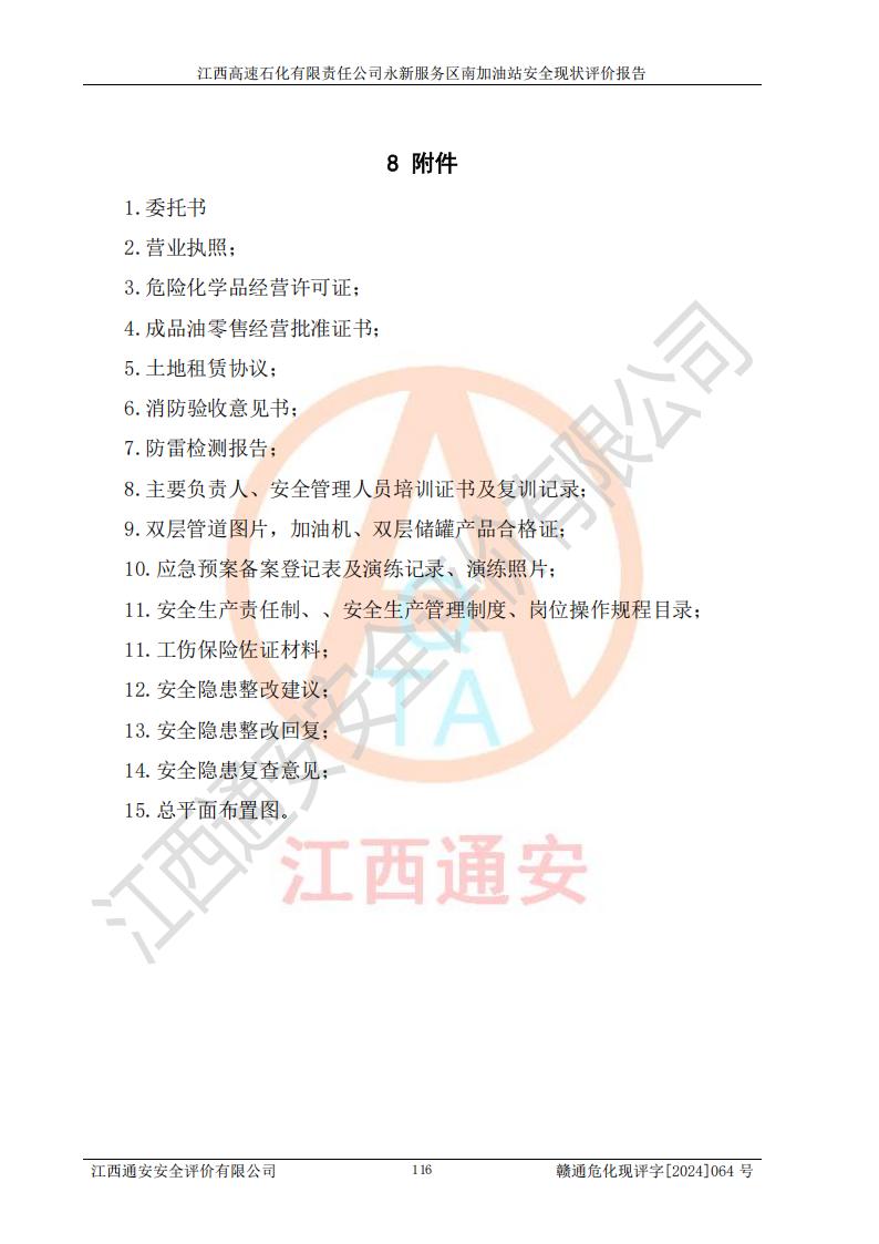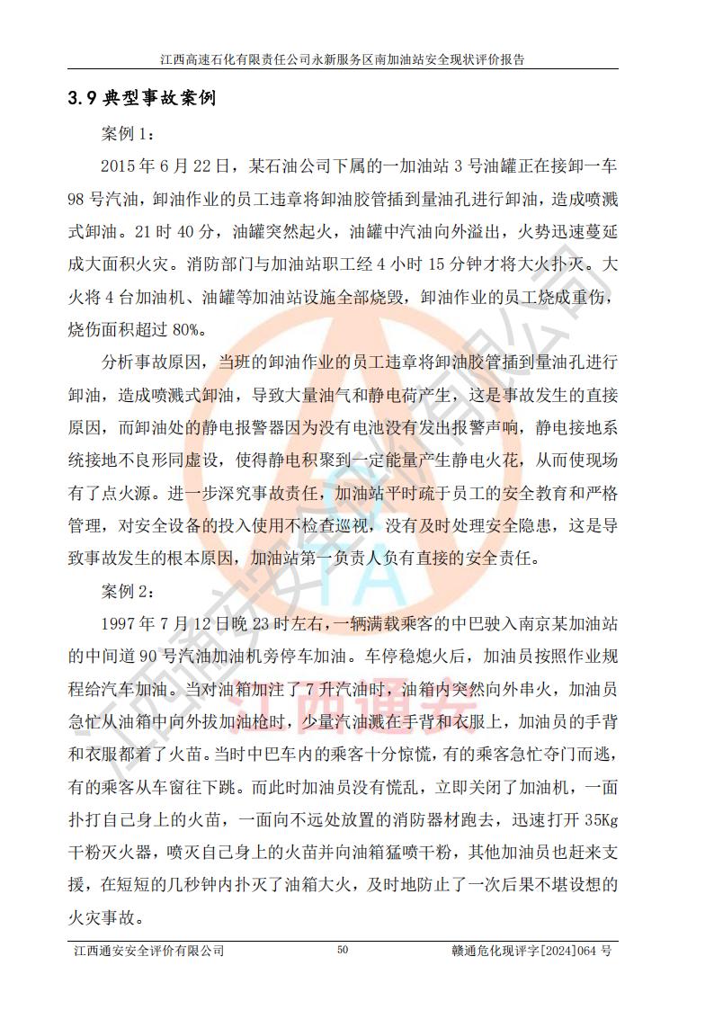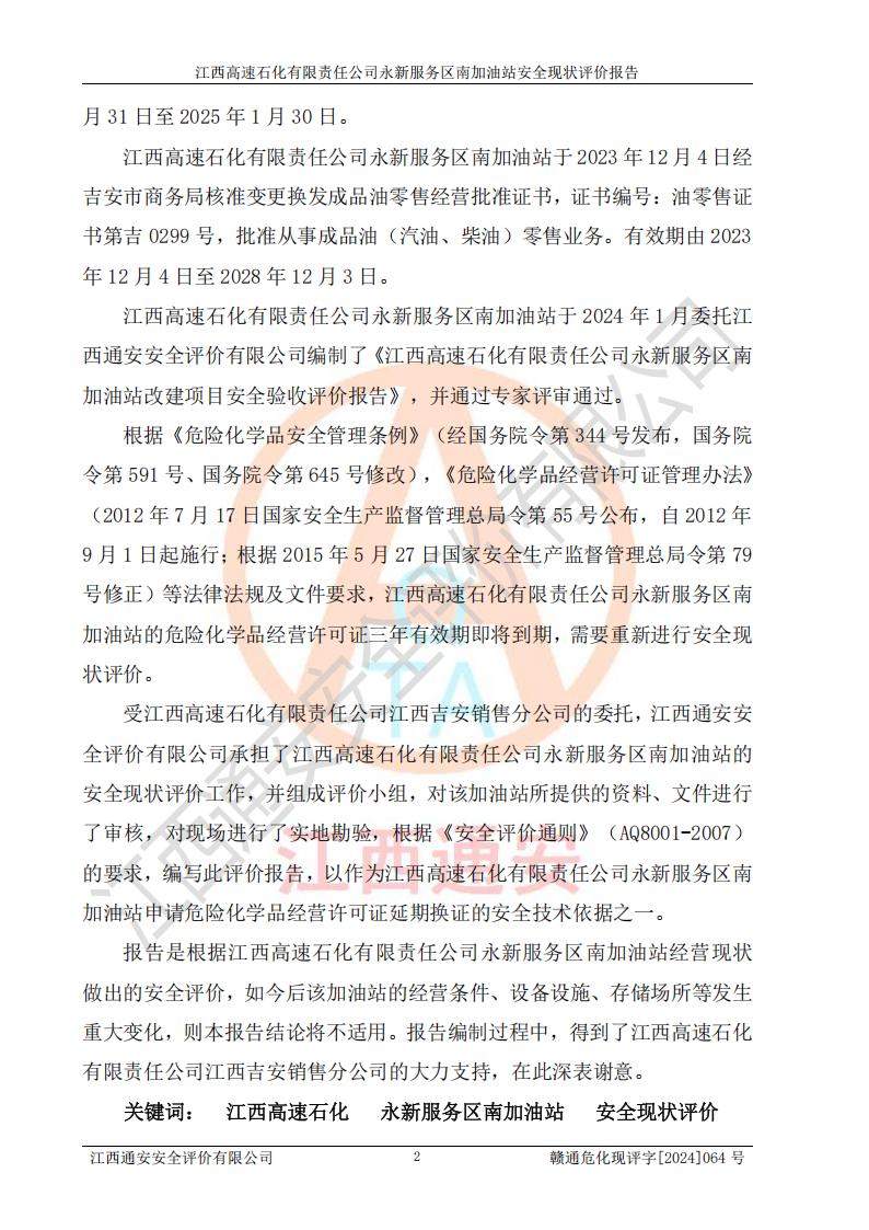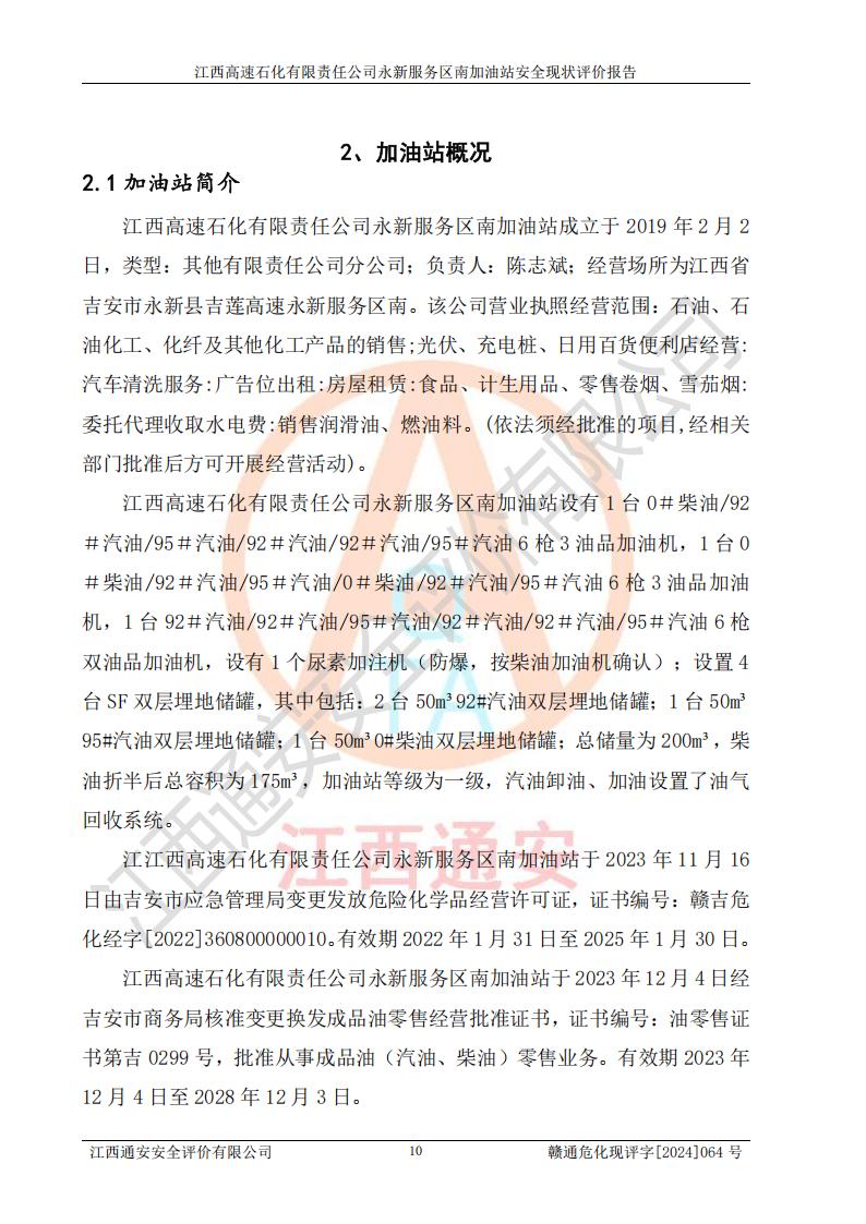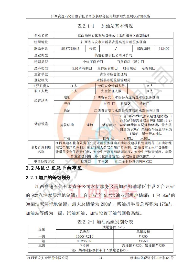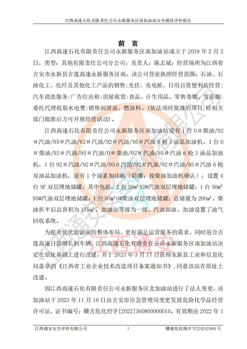 評價(jià)報(bào)告名稱 | 江西高速石化有限責(zé)任公司永新服務(wù)區(qū)南加油站安全現(xiàn)狀評價(jià)報(bào)告 | |||