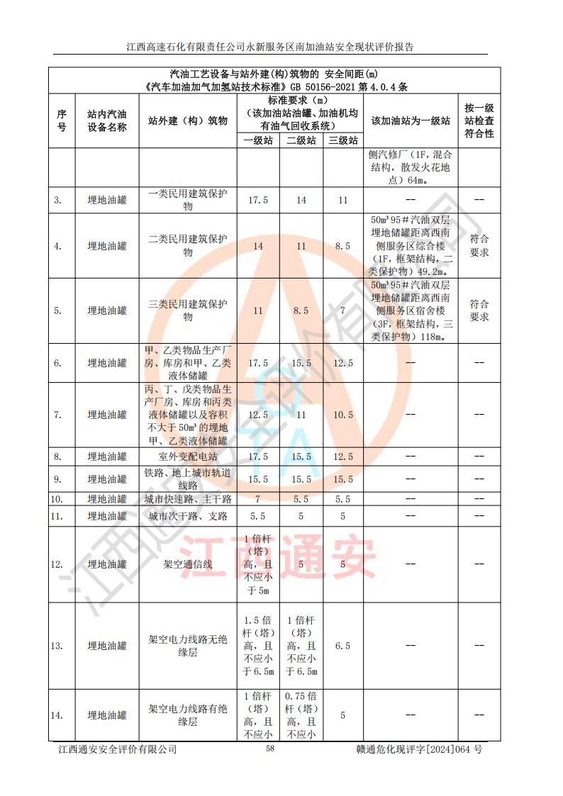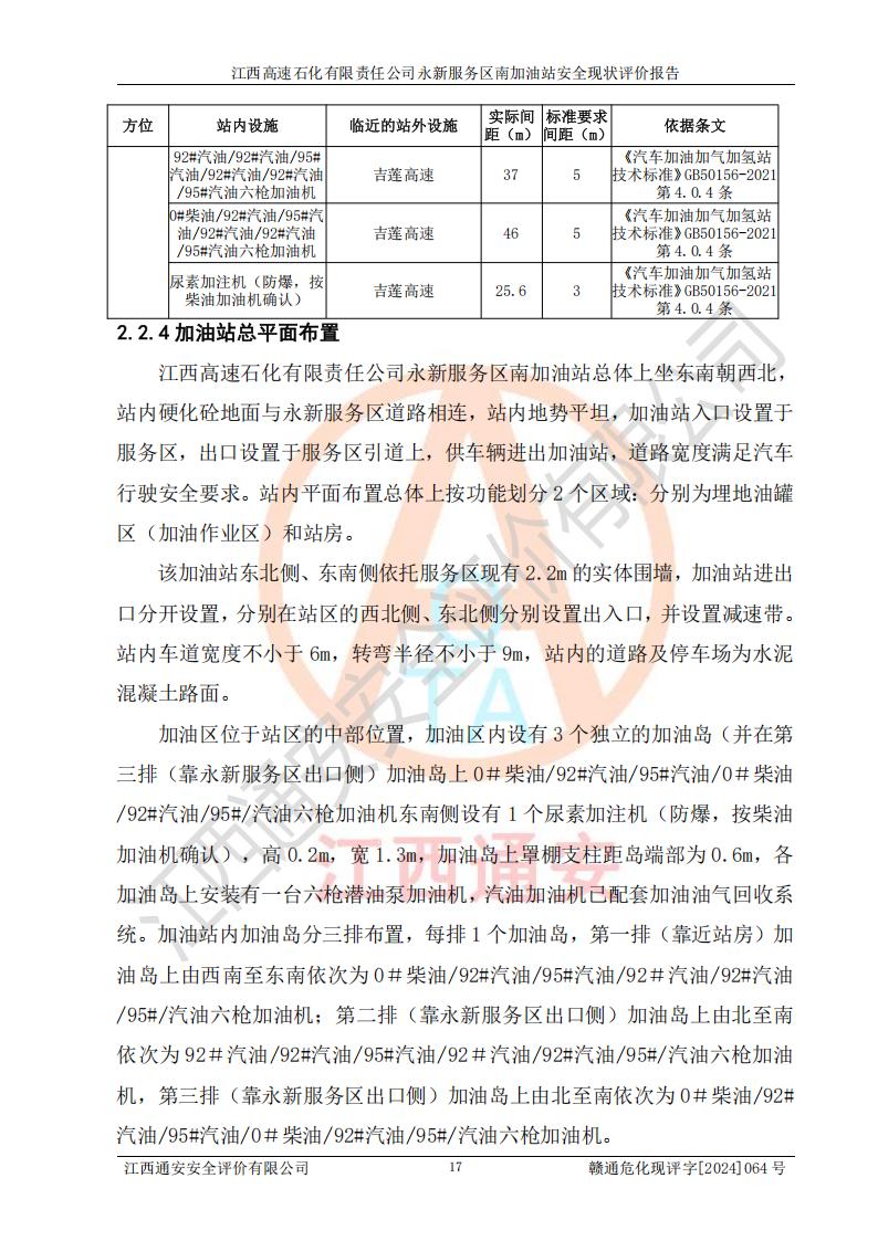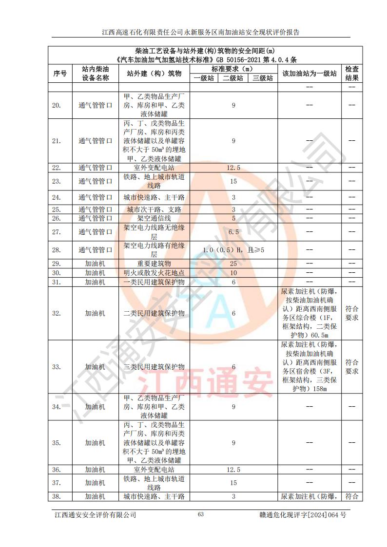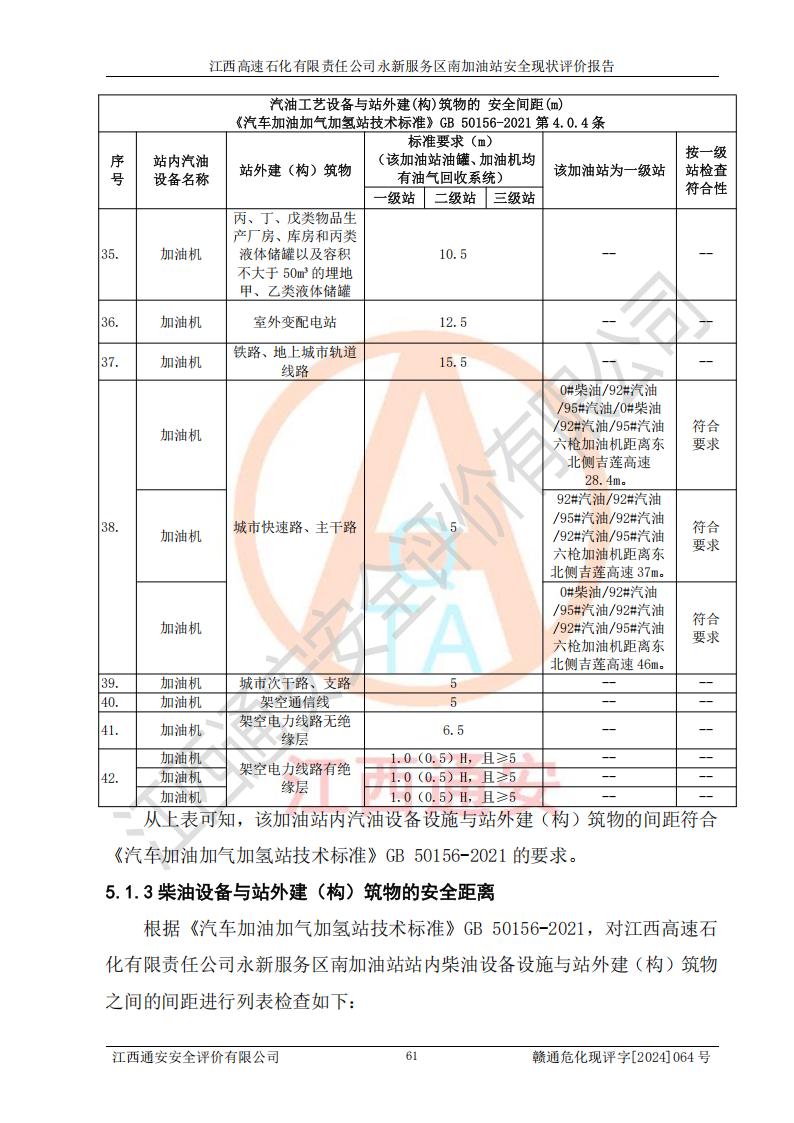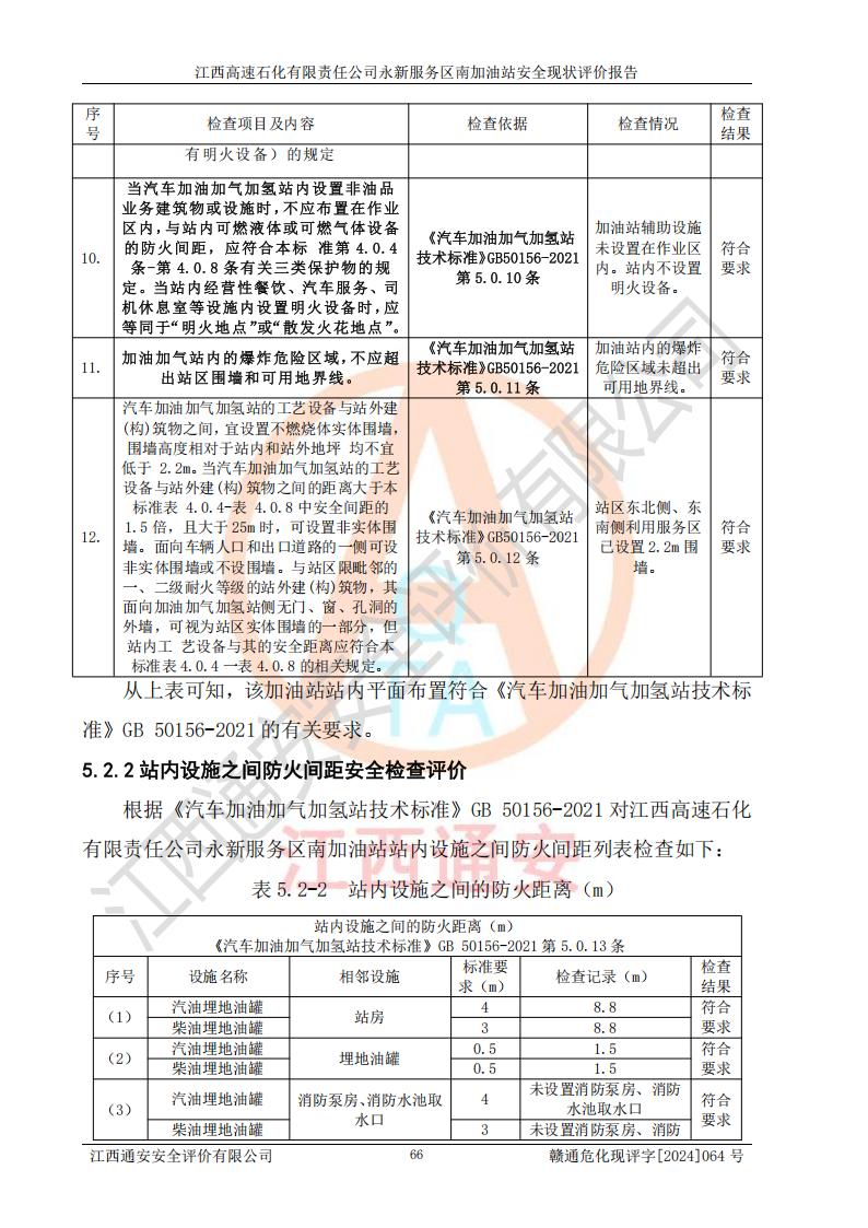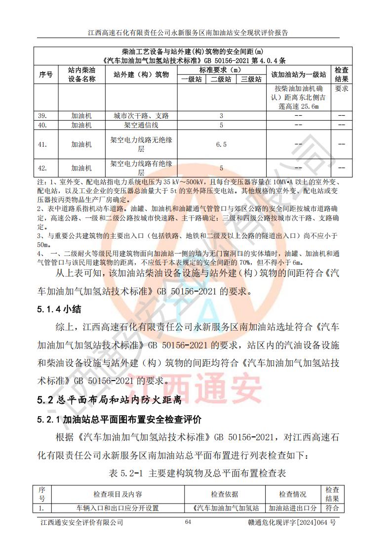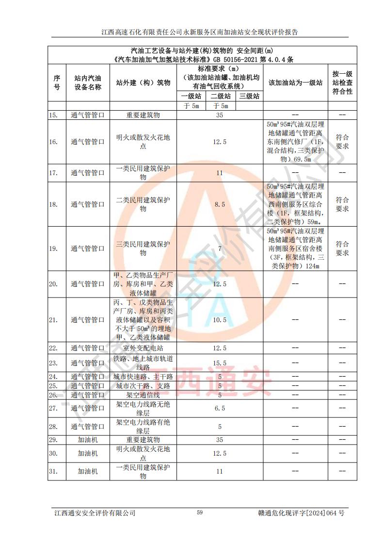 評價(jià)結(jié)論 | 江西高速石化有限責(zé)任公司永新服務(wù)區(qū)南加油站站址合理,周邊環(huán)境良好,與敏感防護(hù)目標(biāo)間距符合規(guī)范要求,站區(qū)建構(gòu)筑物之間的防火間距、耐火等級符合標(biāo)準(zhǔn)要求,與總平面布置圖一致,加油卸油工藝及設(shè)備設(shè)施合理,工藝布置得當(dāng),防雷設(shè)施經(jīng)檢測合格,采取的工藝安全設(shè)施符合規(guī)范要求;該加油站制定了安全管理制度和操作規(guī)程,人員經(jīng)培訓(xùn)合格后上崗,安全管理人員經(jīng)考核合格并取得安全合格證,能按照法律法規(guī)要求開展安全生產(chǎn)管理工作。 綜上:江西高速石化有限責(zé)任公司永新服務(wù)區(qū)南加油站符合《汽車加油加氣加氫站技術(shù)標(biāo)準(zhǔn)》GB50156-2021等標(biāo)準(zhǔn)規(guī)范的要求,安全風(fēng)險(xiǎn)可控,滿足危險(xiǎn)化學(xué)品經(jīng)營的安全條件。 | |||