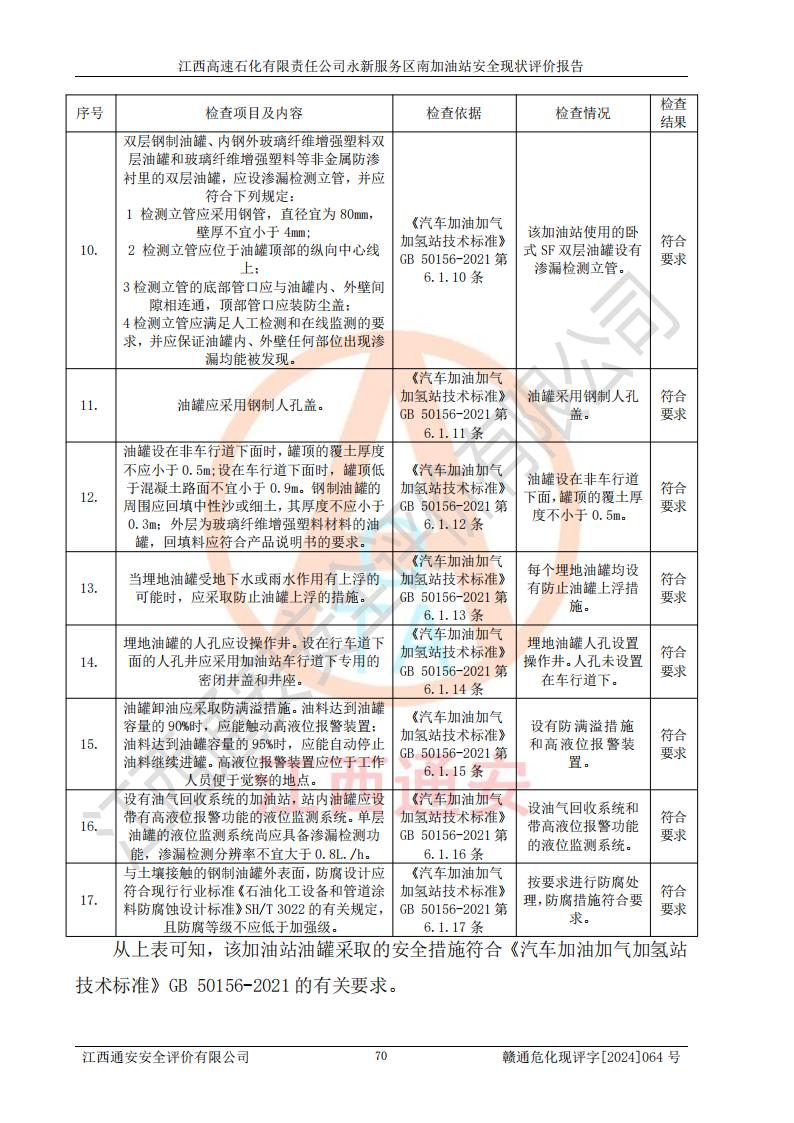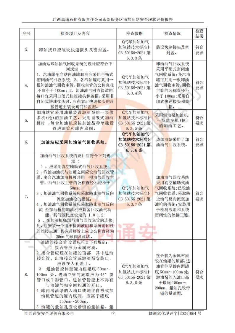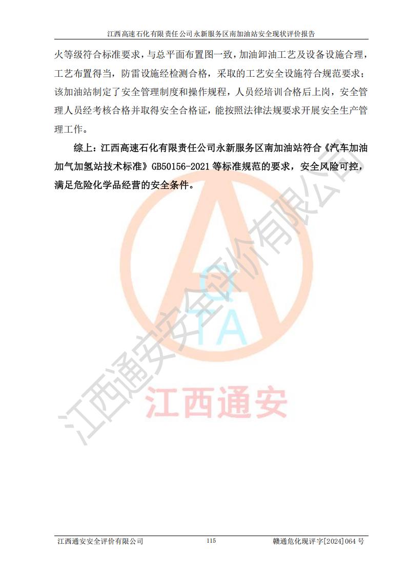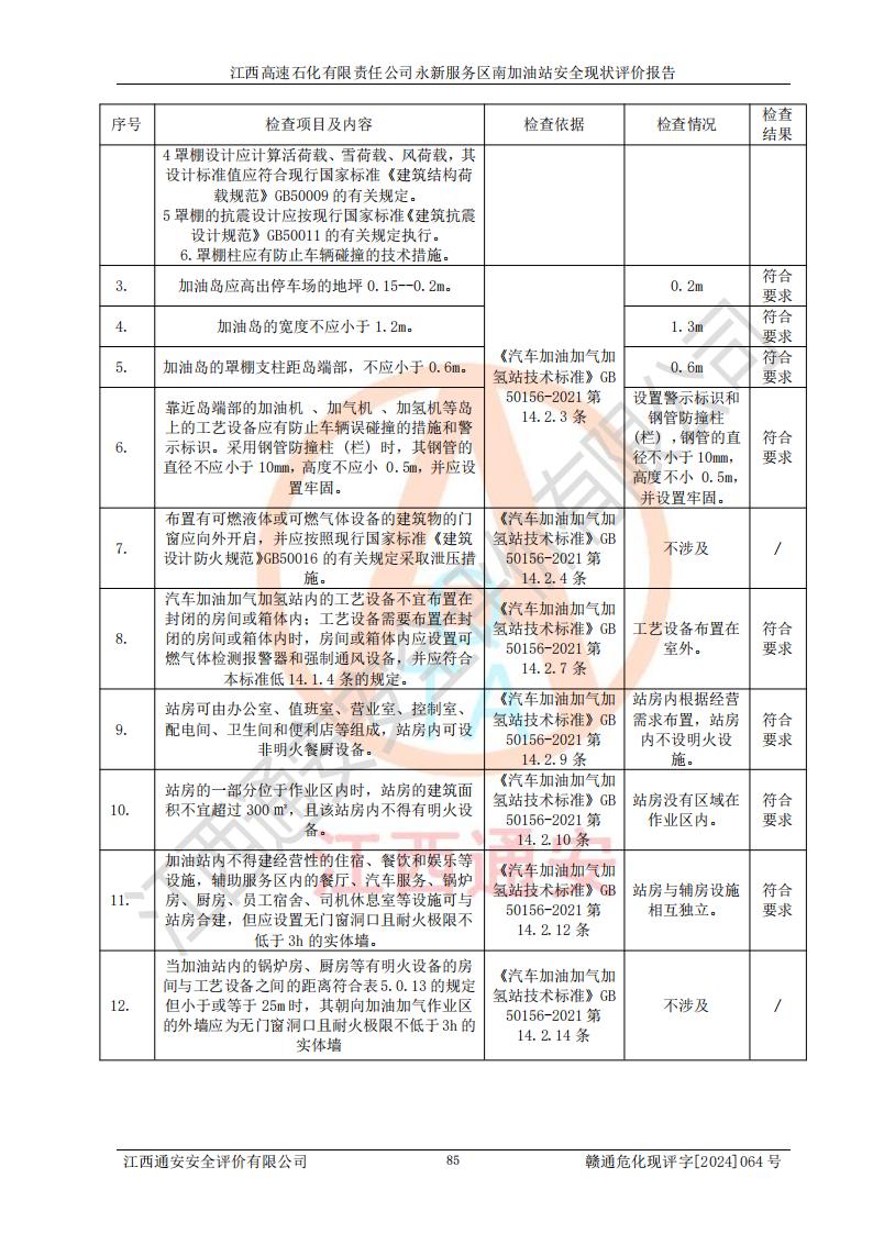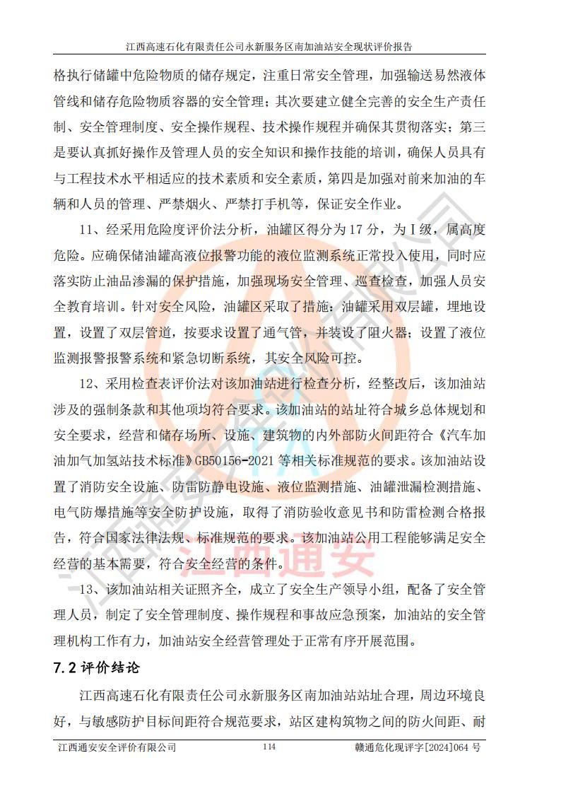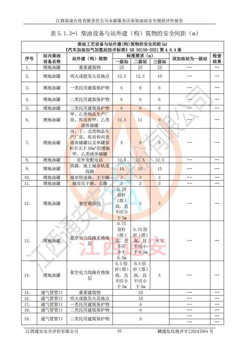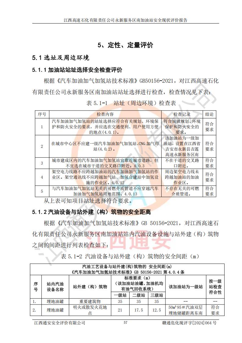 評價(jià)結(jié)論 | 江西高速石化有限責(zé)任公司永新服務(wù)區(qū)南加油站站址合理,周邊環(huán)境良好,與敏感防護(hù)目標(biāo)間距符合規(guī)范要求,站區(qū)建構(gòu)筑物之間的防火間距、耐火等級符合標(biāo)準(zhǔn)要求,與總平面布置圖一致,加油卸油工藝及設(shè)備設(shè)施合理,工藝布置得當(dāng),防雷設(shè)施經(jīng)檢測合格,采取的工藝安全設(shè)施符合規(guī)范要求;該加油站制定了安全管理制度和操作規(guī)程,人員經(jīng)培訓(xùn)合格后上崗,安全管理人員經(jīng)考核合格并取得安全合格證,能按照法律法規(guī)要求開展安全生產(chǎn)管理工作。 綜上:江西高速石化有限責(zé)任公司永新服務(wù)區(qū)南加油站符合《汽車加油加氣加氫站技術(shù)標(biāo)準(zhǔn)》GB50156-2021等標(biāo)準(zhǔn)規(guī)范的要求,安全風(fēng)險(xiǎn)可控,滿足危險(xiǎn)化學(xué)品經(jīng)營的安全條件。 | |||