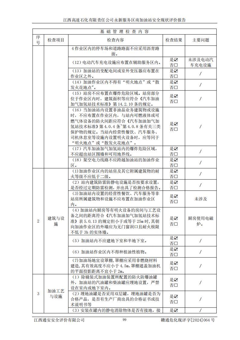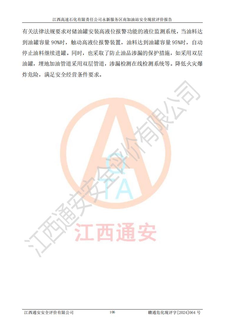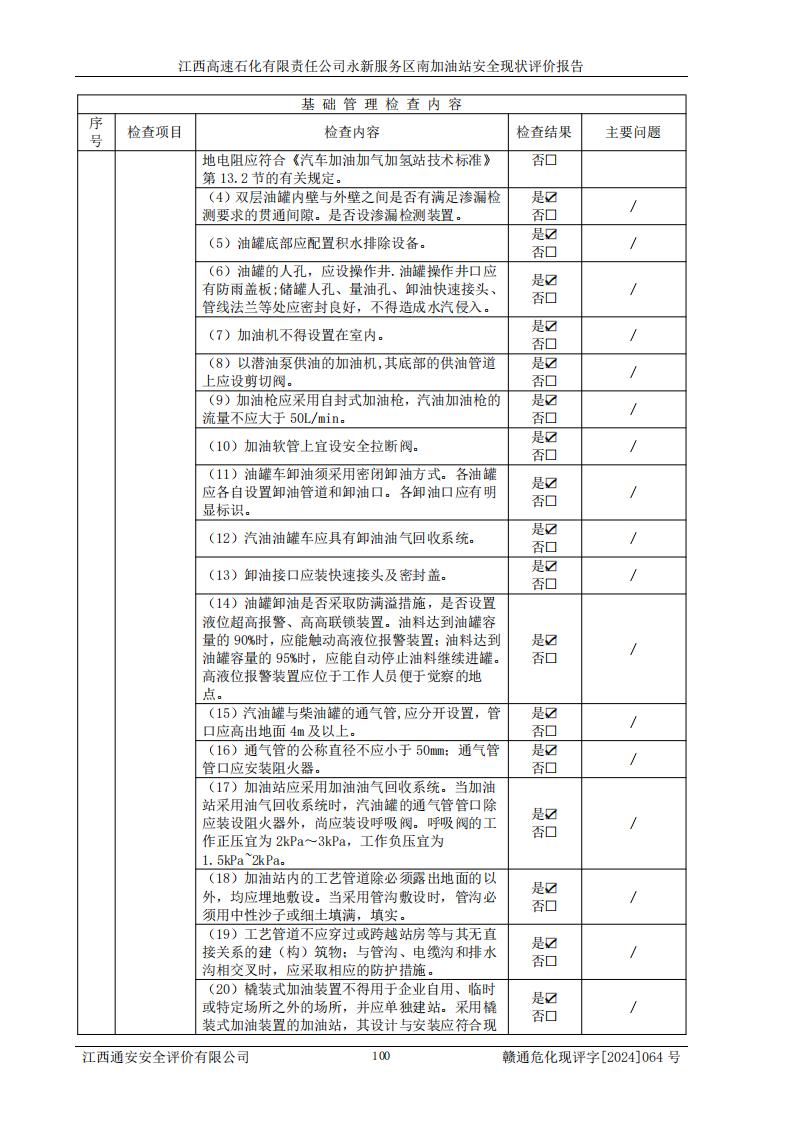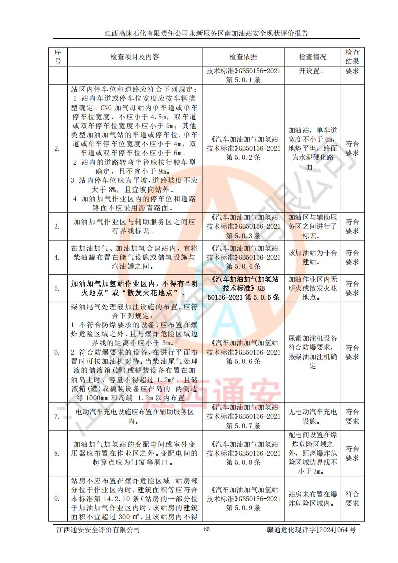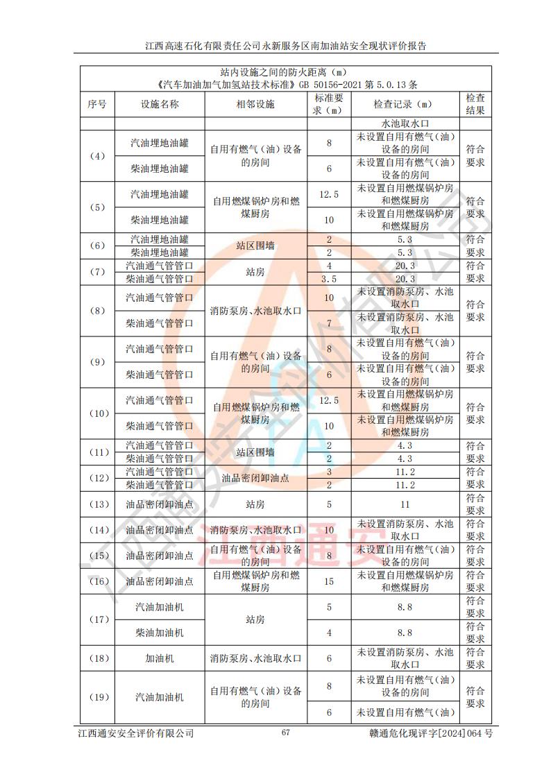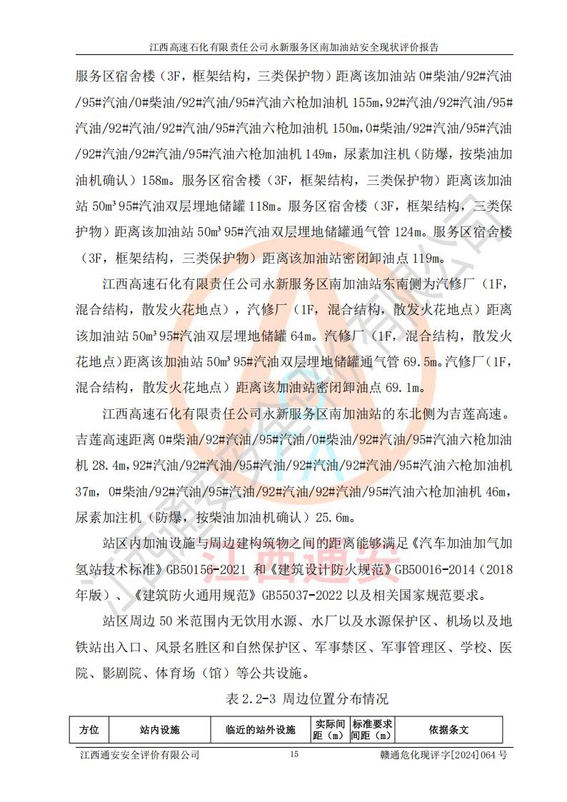 評價(jià)結(jié)論 | 江西高速石化有限責(zé)任公司永新服務(wù)區(qū)南加油站站址合理,周邊環(huán)境良好,與敏感防護(hù)目標(biāo)間距符合規(guī)范要求,站區(qū)建構(gòu)筑物之間的防火間距、耐火等級符合標(biāo)準(zhǔn)要求,與總平面布置圖一致,加油卸油工藝及設(shè)備設(shè)施合理,工藝布置得當(dāng),防雷設(shè)施經(jīng)檢測合格,采取的工藝安全設(shè)施符合規(guī)范要求;該加油站制定了安全管理制度和操作規(guī)程,人員經(jīng)培訓(xùn)合格后上崗,安全管理人員經(jīng)考核合格并取得安全合格證,能按照法律法規(guī)要求開展安全生產(chǎn)管理工作。 綜上:江西高速石化有限責(zé)任公司永新服務(wù)區(qū)南加油站符合《汽車加油加氣加氫站技術(shù)標(biāo)準(zhǔn)》GB50156-2021等標(biāo)準(zhǔn)規(guī)范的要求,安全風(fēng)險(xiǎn)可控,滿足危險(xiǎn)化學(xué)品經(jīng)營的安全條件。 | |||