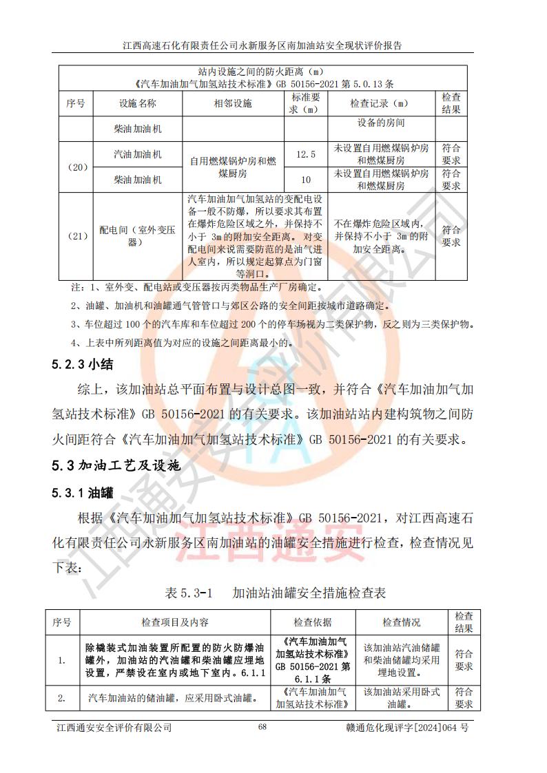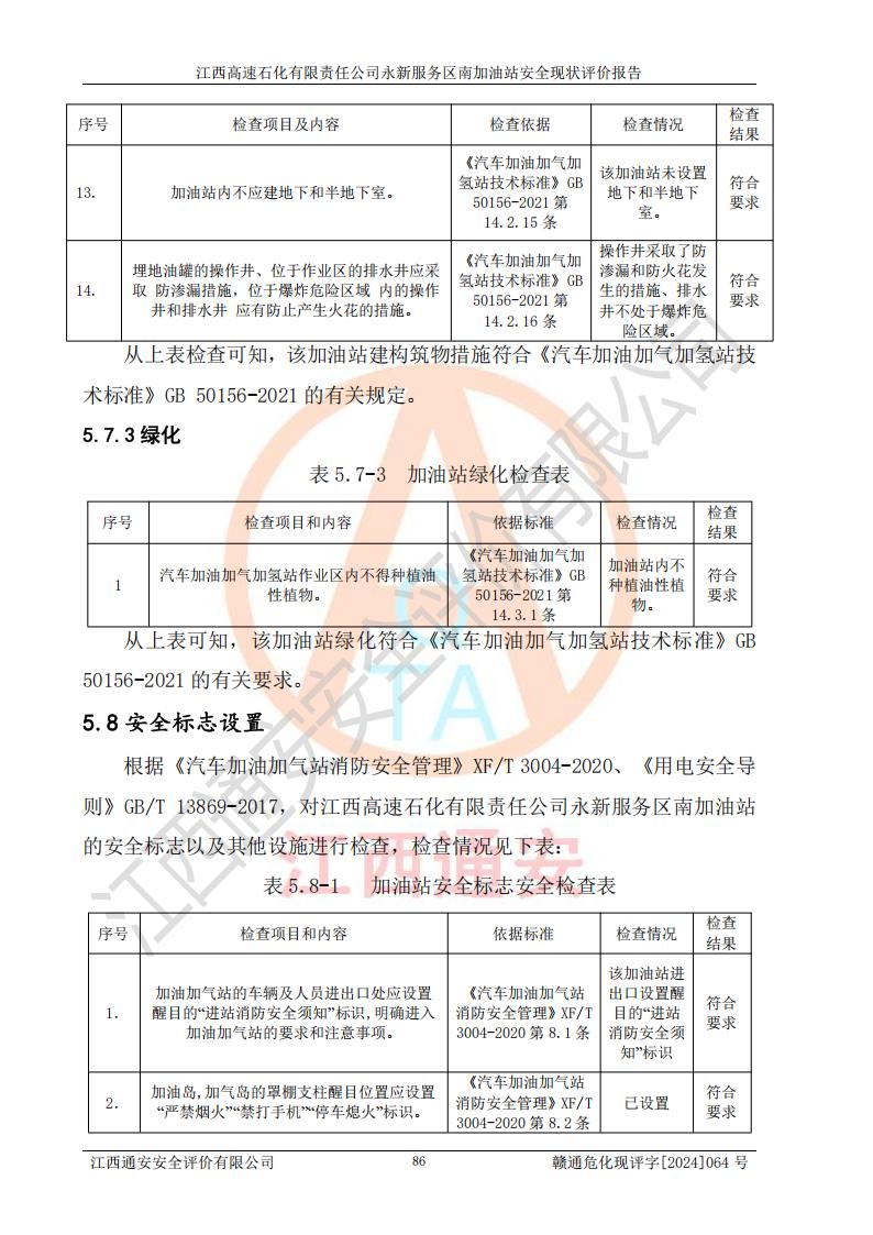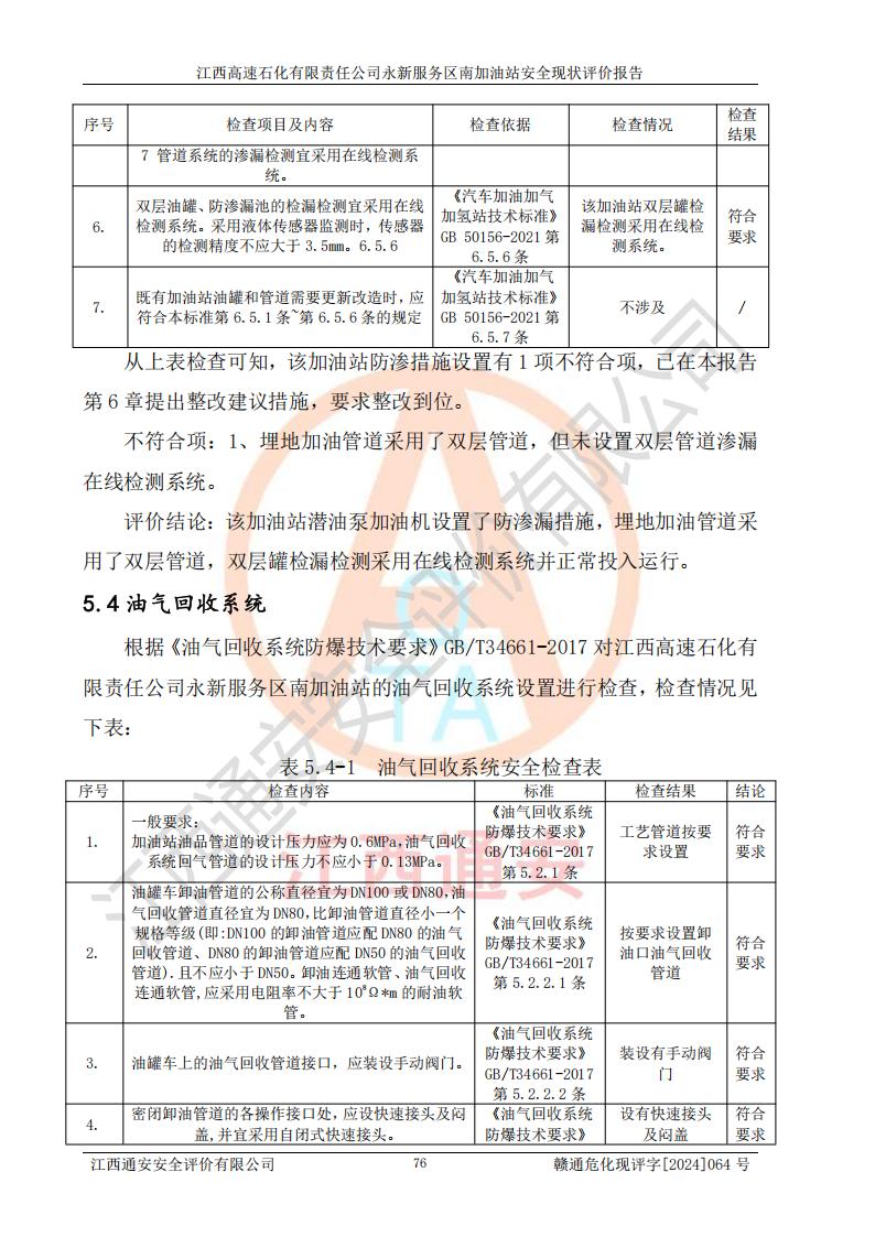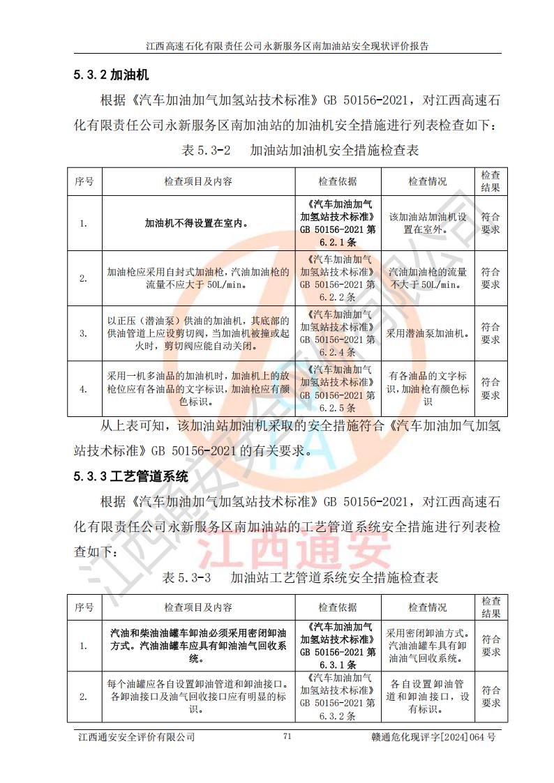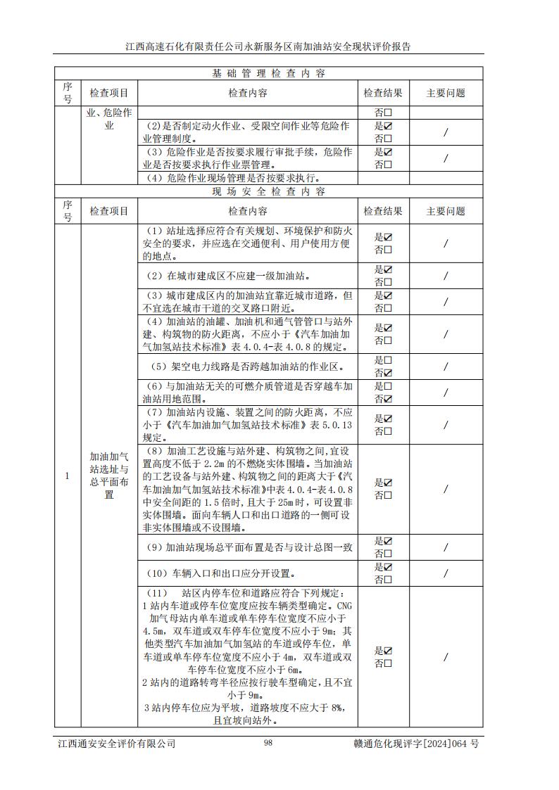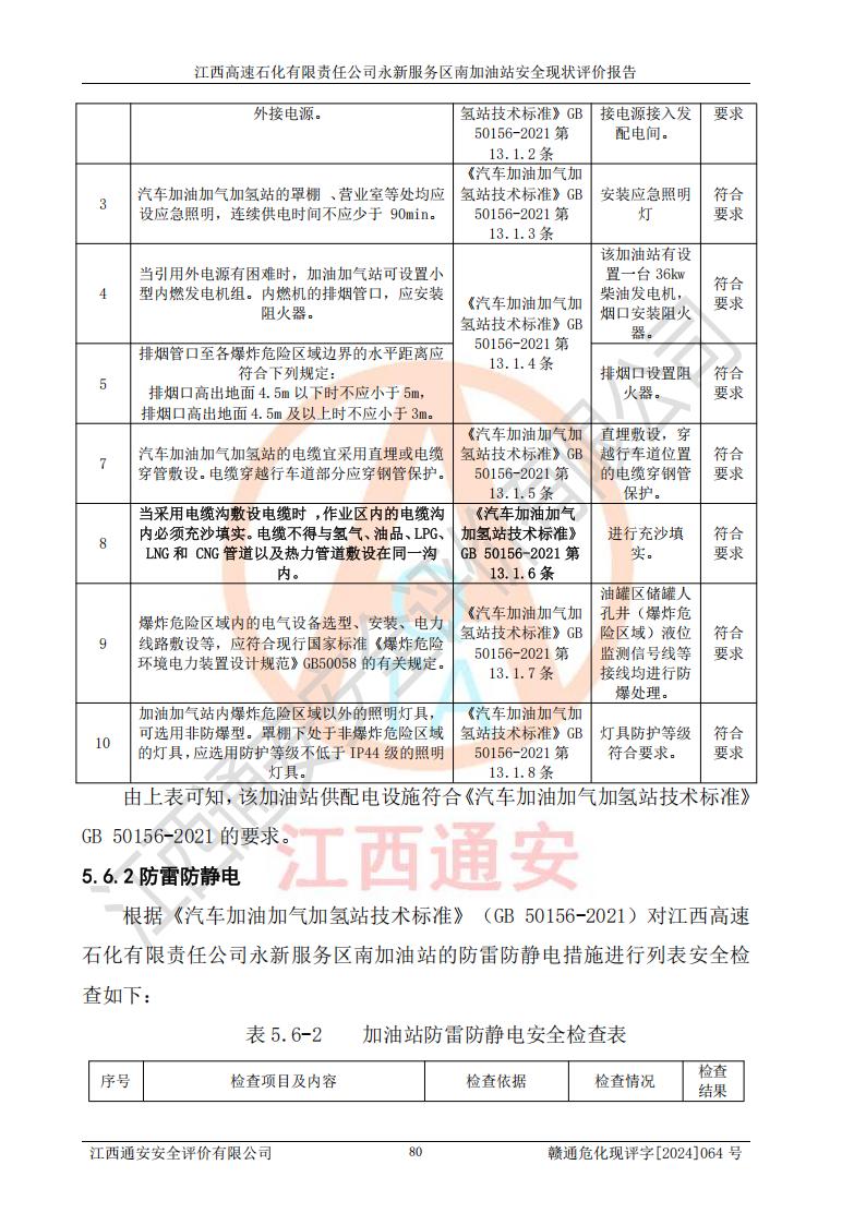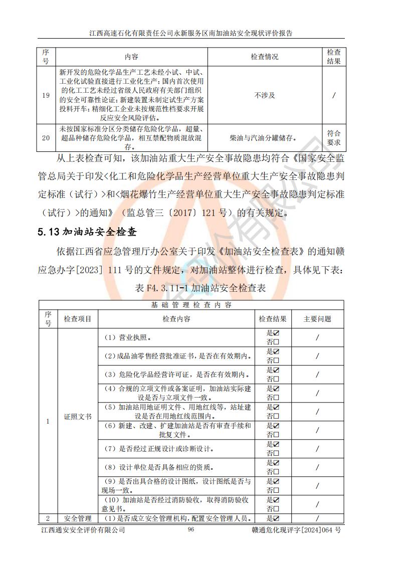 評價(jià)結(jié)論 | 江西高速石化有限責(zé)任公司永新服務(wù)區(qū)南加油站站址合理,周邊環(huán)境良好,與敏感防護(hù)目標(biāo)間距符合規(guī)范要求,站區(qū)建構(gòu)筑物之間的防火間距、耐火等級符合標(biāo)準(zhǔn)要求,與總平面布置圖一致,加油卸油工藝及設(shè)備設(shè)施合理,工藝布置得當(dāng),防雷設(shè)施經(jīng)檢測合格,采取的工藝安全設(shè)施符合規(guī)范要求;該加油站制定了安全管理制度和操作規(guī)程,人員經(jīng)培訓(xùn)合格后上崗,安全管理人員經(jīng)考核合格并取得安全合格證,能按照法律法規(guī)要求開展安全生產(chǎn)管理工作。 綜上:江西高速石化有限責(zé)任公司永新服務(wù)區(qū)南加油站符合《汽車加油加氣加氫站技術(shù)標(biāo)準(zhǔn)》GB50156-2021等標(biāo)準(zhǔn)規(guī)范的要求,安全風(fēng)險(xiǎn)可控,滿足危險(xiǎn)化學(xué)品經(jīng)營的安全條件。 | |||