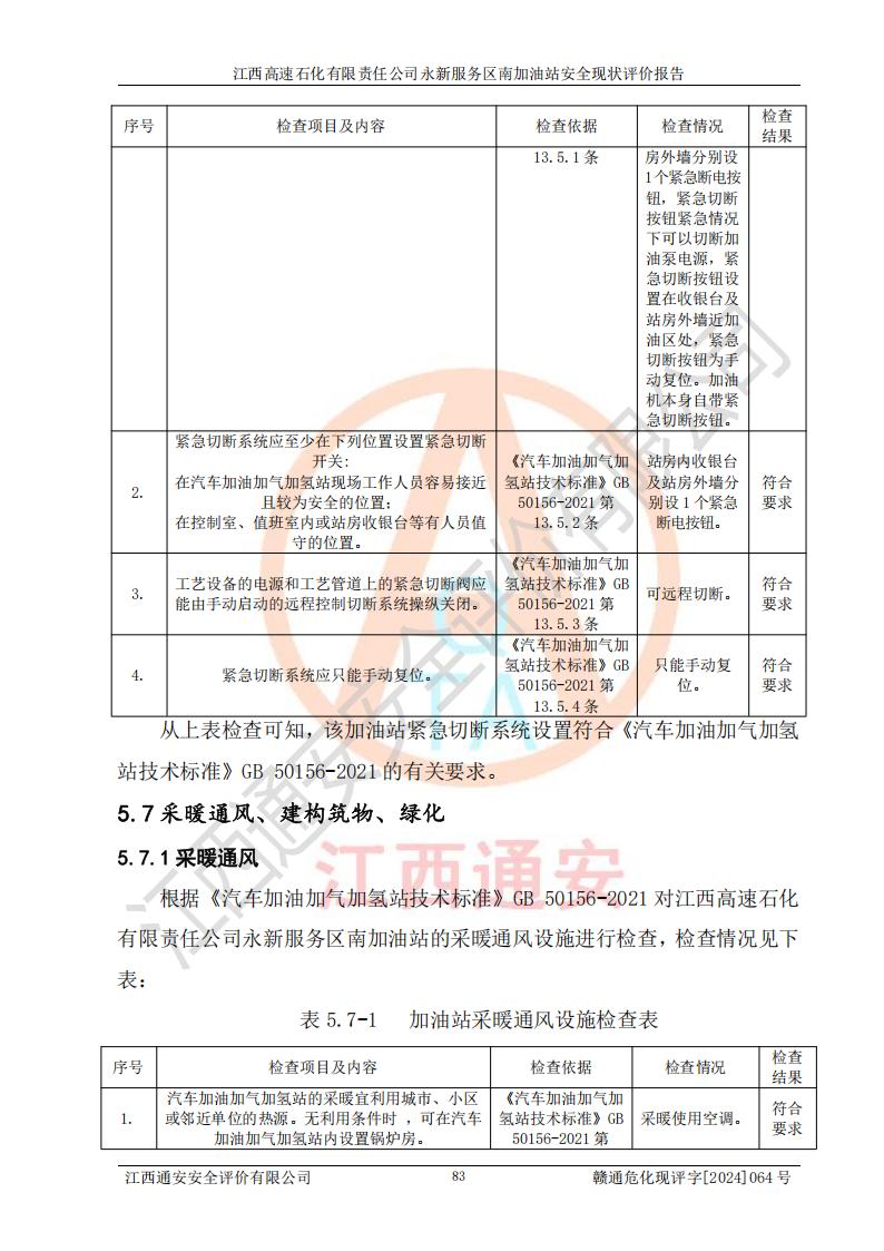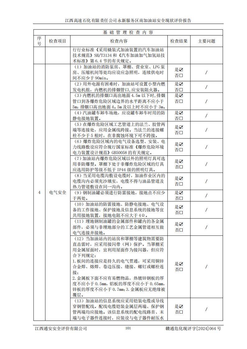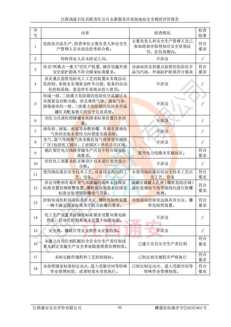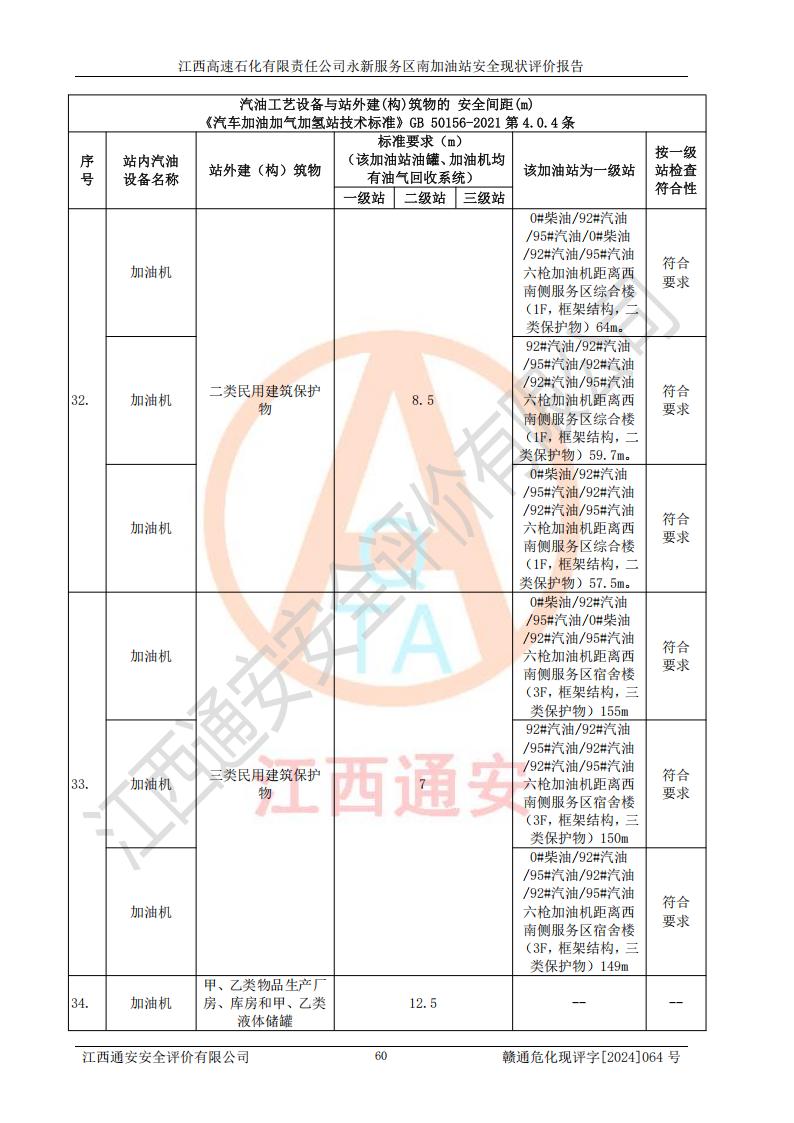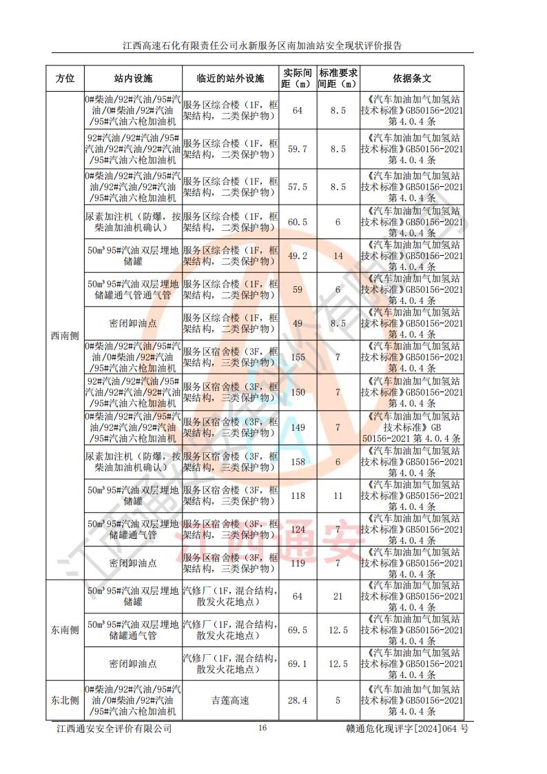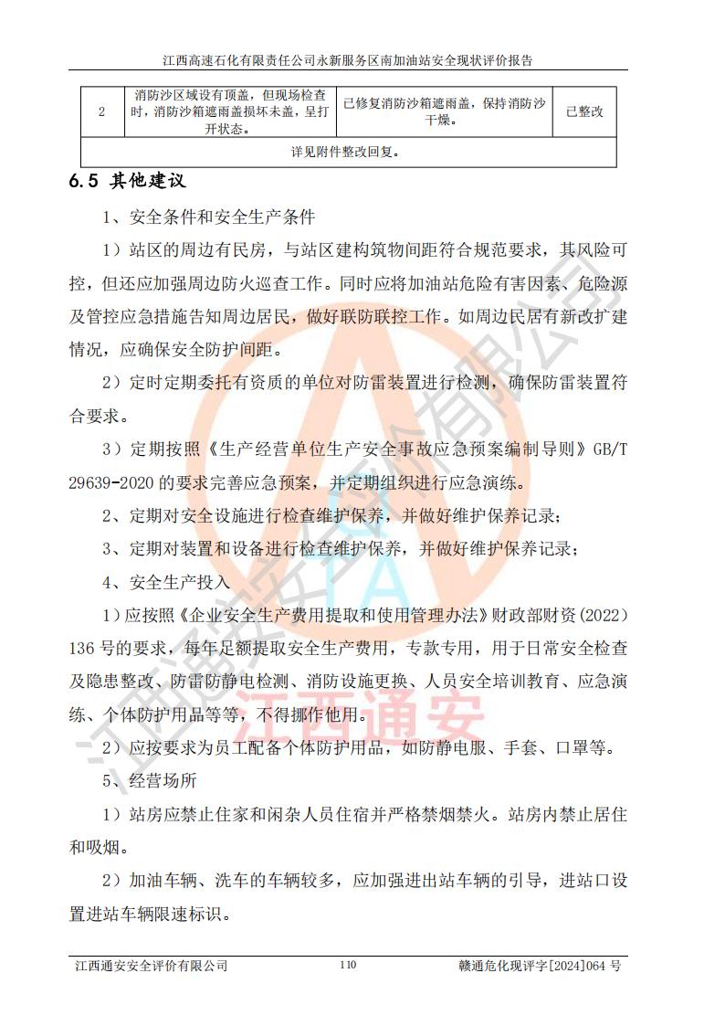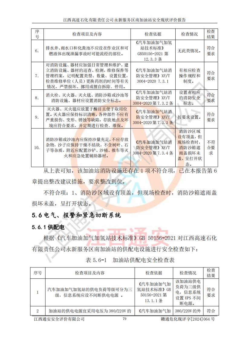 評價(jià)結(jié)論 | 江西高速石化有限責(zé)任公司永新服務(wù)區(qū)南加油站站址合理,周邊環(huán)境良好,與敏感防護(hù)目標(biāo)間距符合規(guī)范要求,站區(qū)建構(gòu)筑物之間的防火間距、耐火等級符合標(biāo)準(zhǔn)要求,與總平面布置圖一致,加油卸油工藝及設(shè)備設(shè)施合理,工藝布置得當(dāng),防雷設(shè)施經(jīng)檢測合格,采取的工藝安全設(shè)施符合規(guī)范要求;該加油站制定了安全管理制度和操作規(guī)程,人員經(jīng)培訓(xùn)合格后上崗,安全管理人員經(jīng)考核合格并取得安全合格證,能按照法律法規(guī)要求開展安全生產(chǎn)管理工作。 綜上:江西高速石化有限責(zé)任公司永新服務(wù)區(qū)南加油站符合《汽車加油加氣加氫站技術(shù)標(biāo)準(zhǔn)》GB50156-2021等標(biāo)準(zhǔn)規(guī)范的要求,安全風(fēng)險(xiǎn)可控,滿足危險(xiǎn)化學(xué)品經(jīng)營的安全條件。 | |||