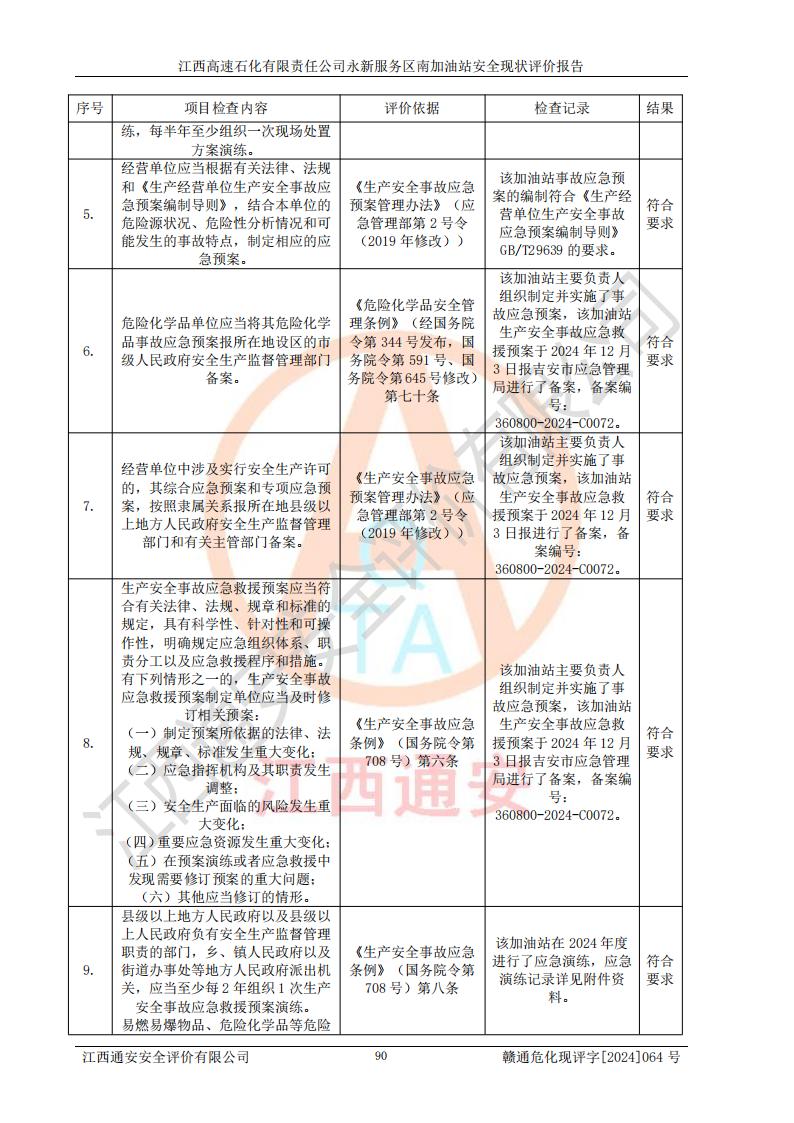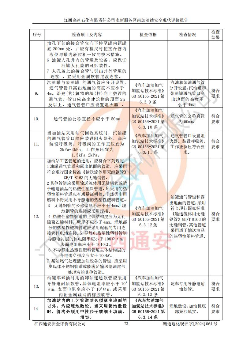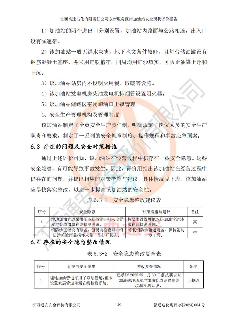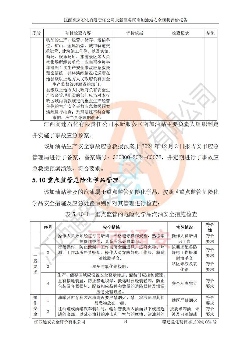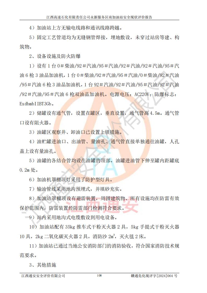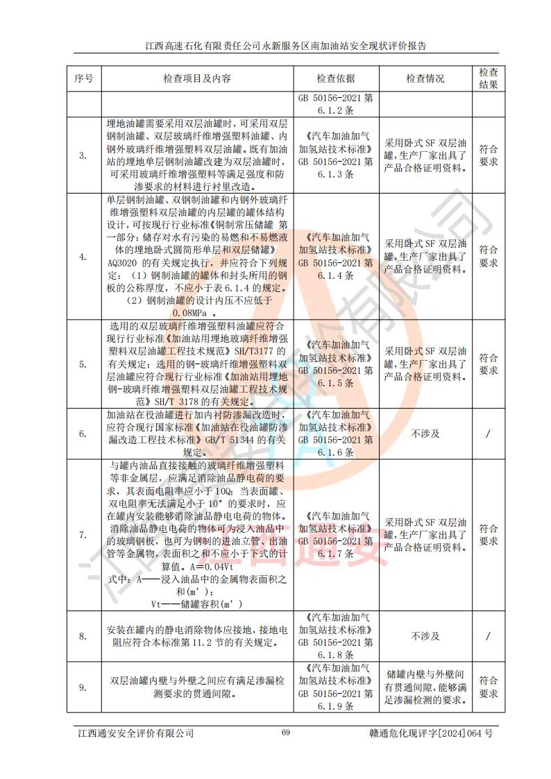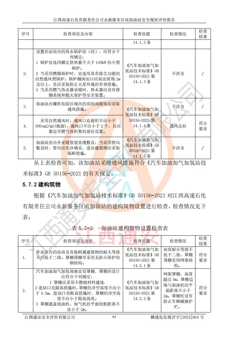 評價(jià)結(jié)論 | 江西高速石化有限責(zé)任公司永新服務(wù)區(qū)南加油站站址合理,周邊環(huán)境良好,與敏感防護(hù)目標(biāo)間距符合規(guī)范要求,站區(qū)建構(gòu)筑物之間的防火間距、耐火等級符合標(biāo)準(zhǔn)要求,與總平面布置圖一致,加油卸油工藝及設(shè)備設(shè)施合理,工藝布置得當(dāng),防雷設(shè)施經(jīng)檢測合格,采取的工藝安全設(shè)施符合規(guī)范要求;該加油站制定了安全管理制度和操作規(guī)程,人員經(jīng)培訓(xùn)合格后上崗,安全管理人員經(jīng)考核合格并取得安全合格證,能按照法律法規(guī)要求開展安全生產(chǎn)管理工作。 綜上:江西高速石化有限責(zé)任公司永新服務(wù)區(qū)南加油站符合《汽車加油加氣加氫站技術(shù)標(biāo)準(zhǔn)》GB50156-2021等標(biāo)準(zhǔn)規(guī)范的要求,安全風(fēng)險(xiǎn)可控,滿足危險(xiǎn)化學(xué)品經(jīng)營的安全條件。 | |||