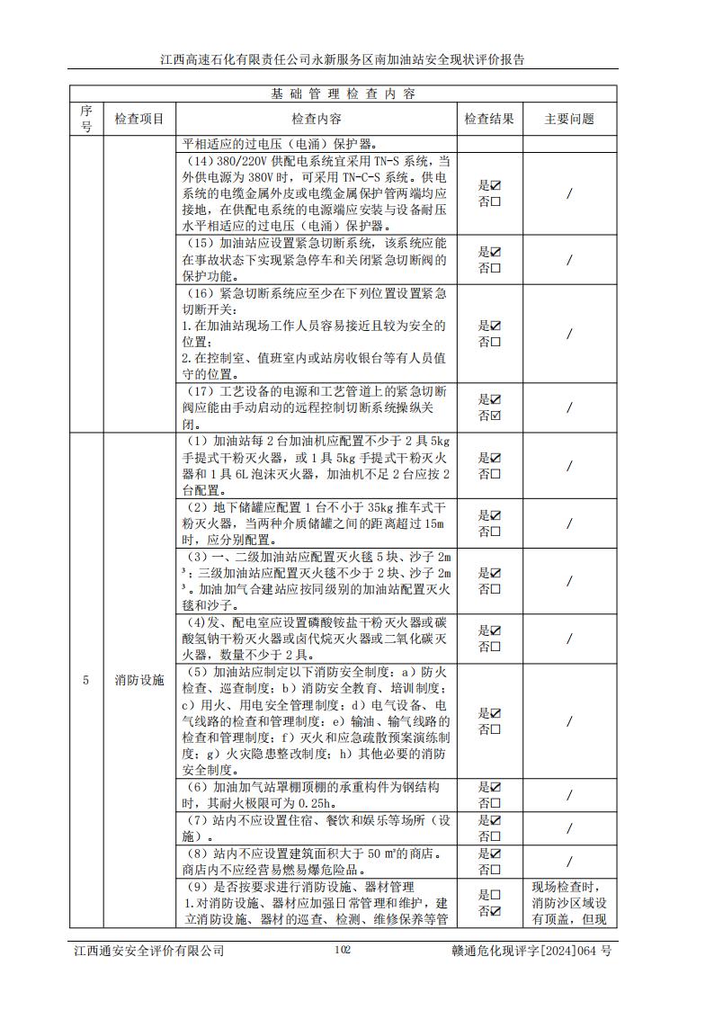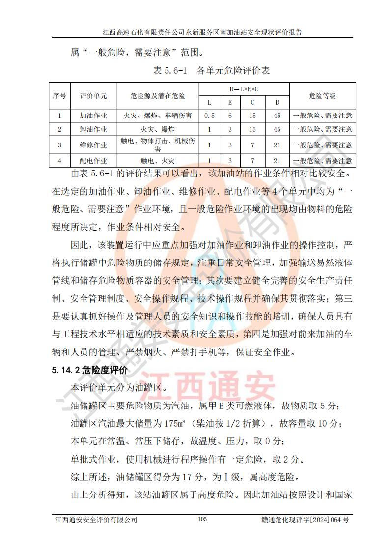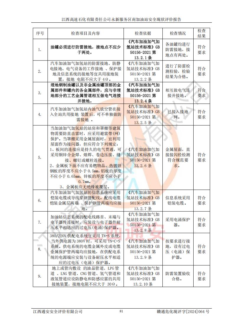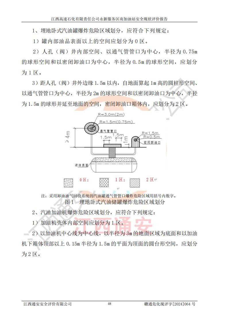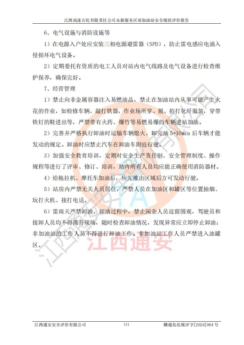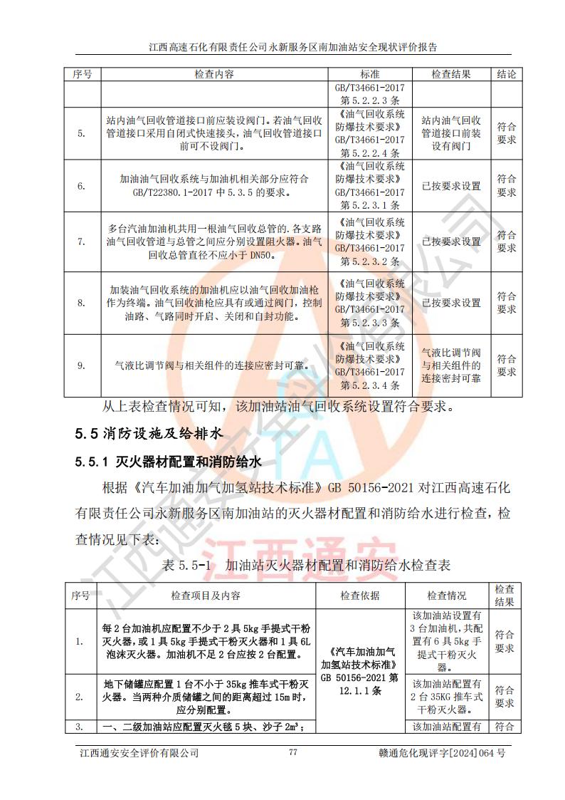 評價(jià)結(jié)論 | 江西高速石化有限責(zé)任公司永新服務(wù)區(qū)南加油站站址合理,周邊環(huán)境良好,與敏感防護(hù)目標(biāo)間距符合規(guī)范要求,站區(qū)建構(gòu)筑物之間的防火間距、耐火等級符合標(biāo)準(zhǔn)要求,與總平面布置圖一致,加油卸油工藝及設(shè)備設(shè)施合理,工藝布置得當(dāng),防雷設(shè)施經(jīng)檢測合格,采取的工藝安全設(shè)施符合規(guī)范要求;該加油站制定了安全管理制度和操作規(guī)程,人員經(jīng)培訓(xùn)合格后上崗,安全管理人員經(jīng)考核合格并取得安全合格證,能按照法律法規(guī)要求開展安全生產(chǎn)管理工作。 綜上:江西高速石化有限責(zé)任公司永新服務(wù)區(qū)南加油站符合《汽車加油加氣加氫站技術(shù)標(biāo)準(zhǔn)》GB50156-2021等標(biāo)準(zhǔn)規(guī)范的要求,安全風(fēng)險(xiǎn)可控,滿足危險(xiǎn)化學(xué)品經(jīng)營的安全條件。 | |||
