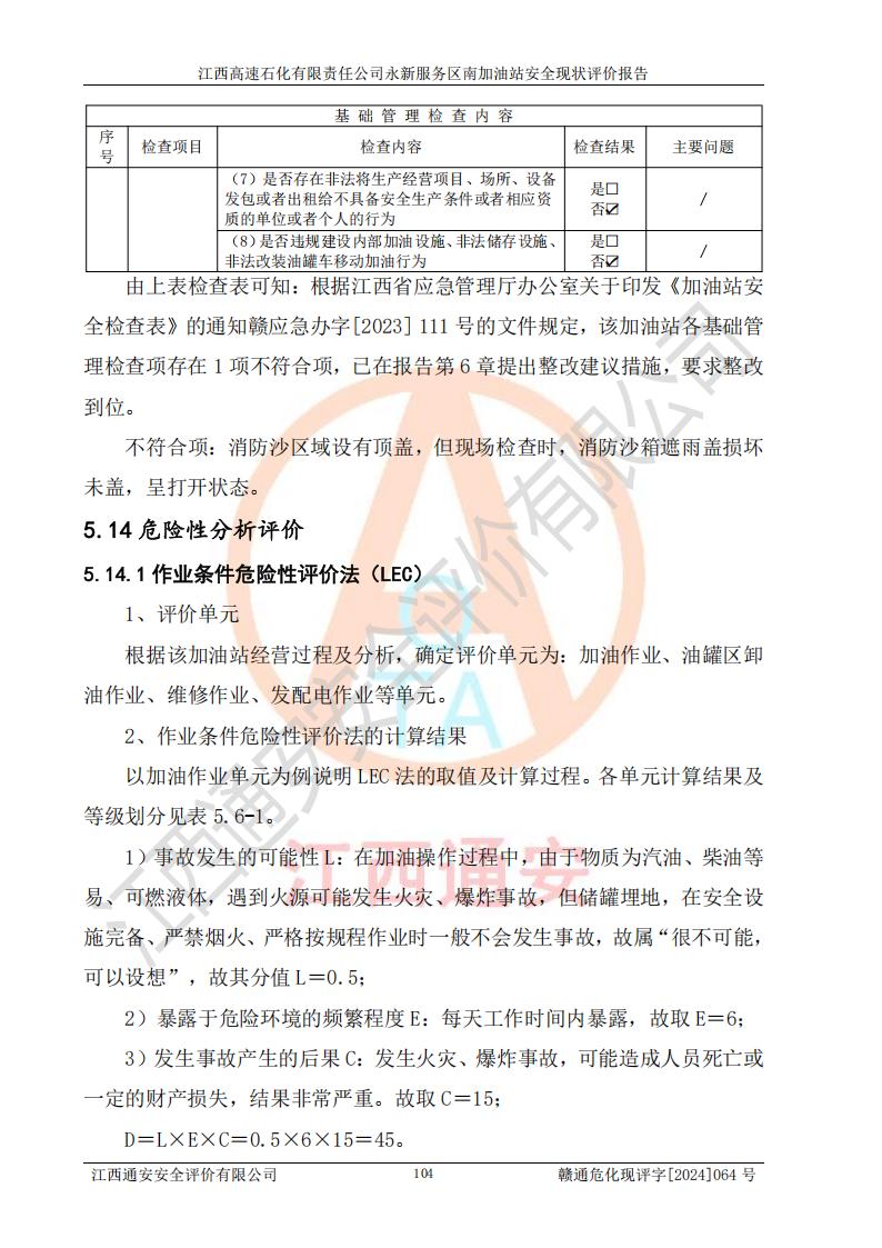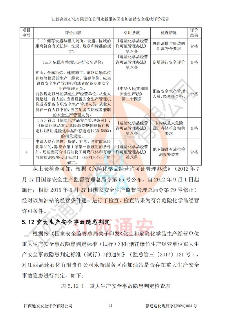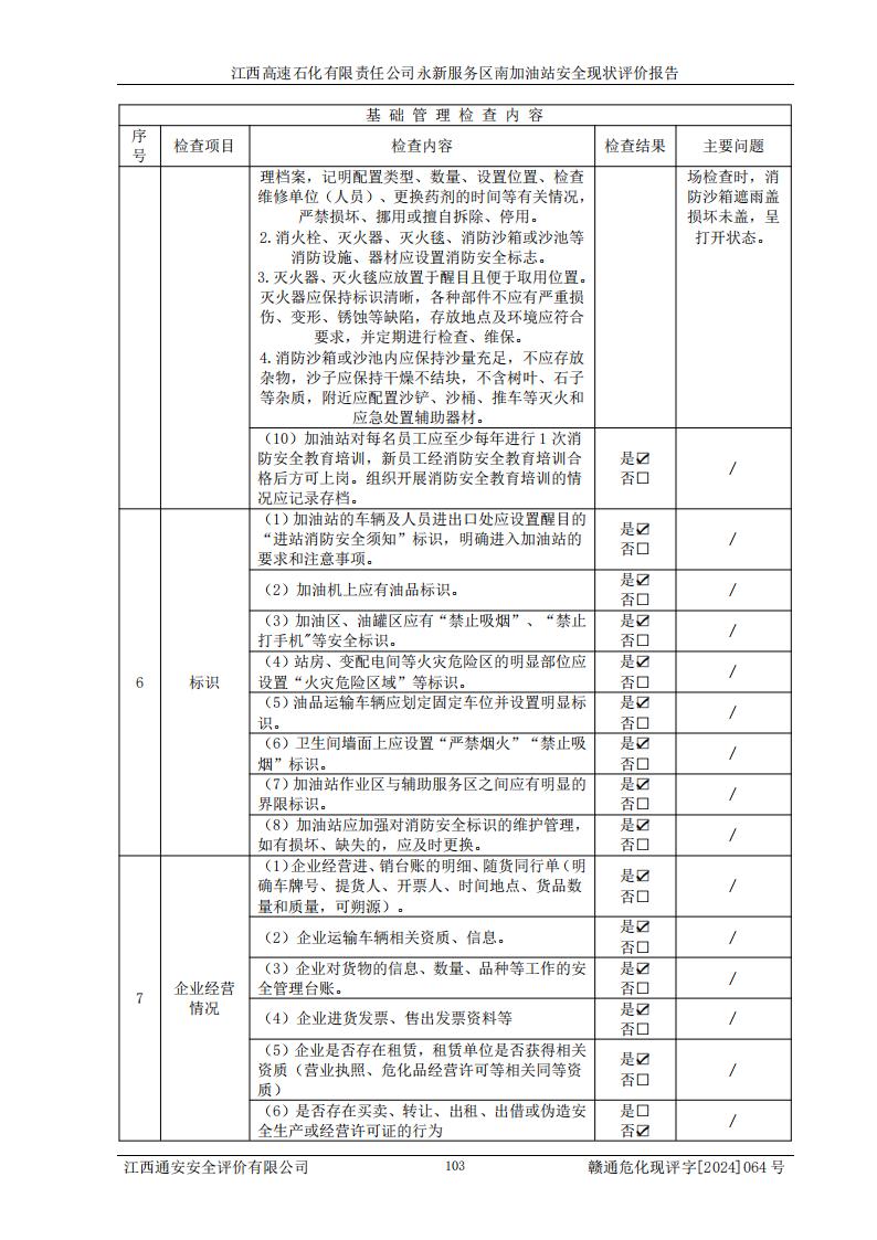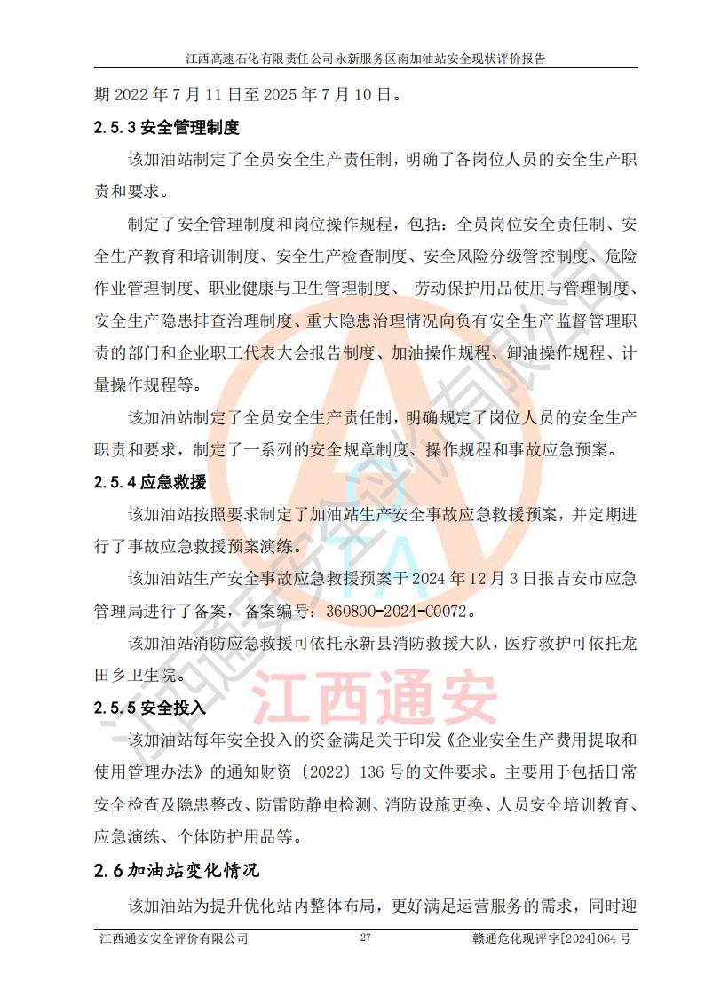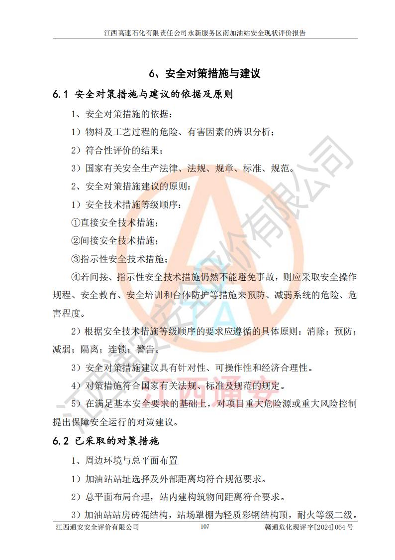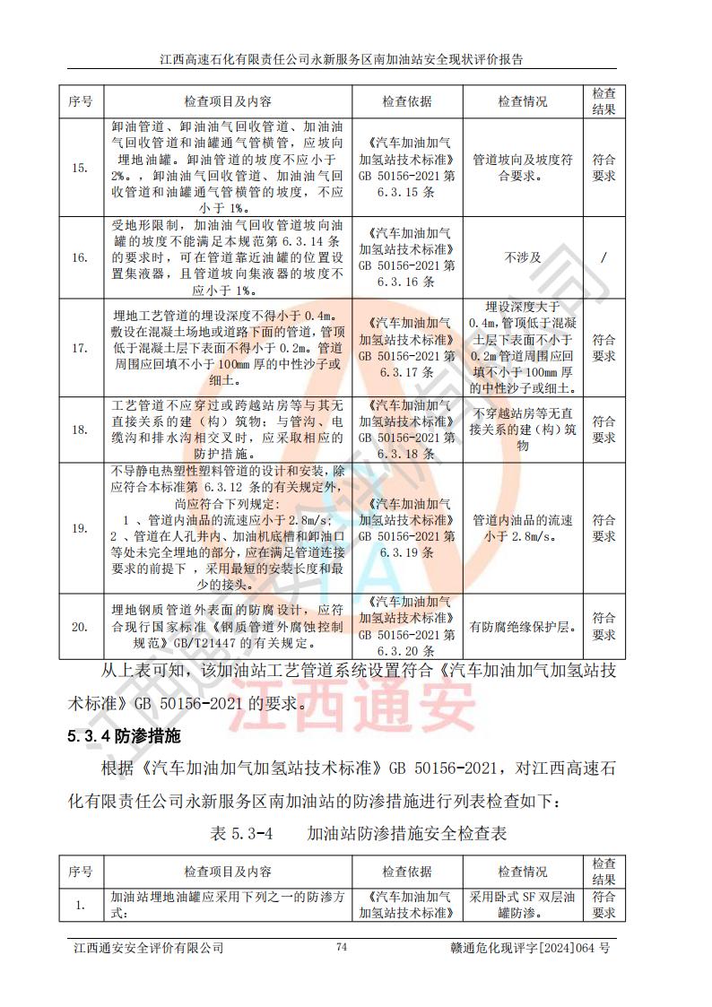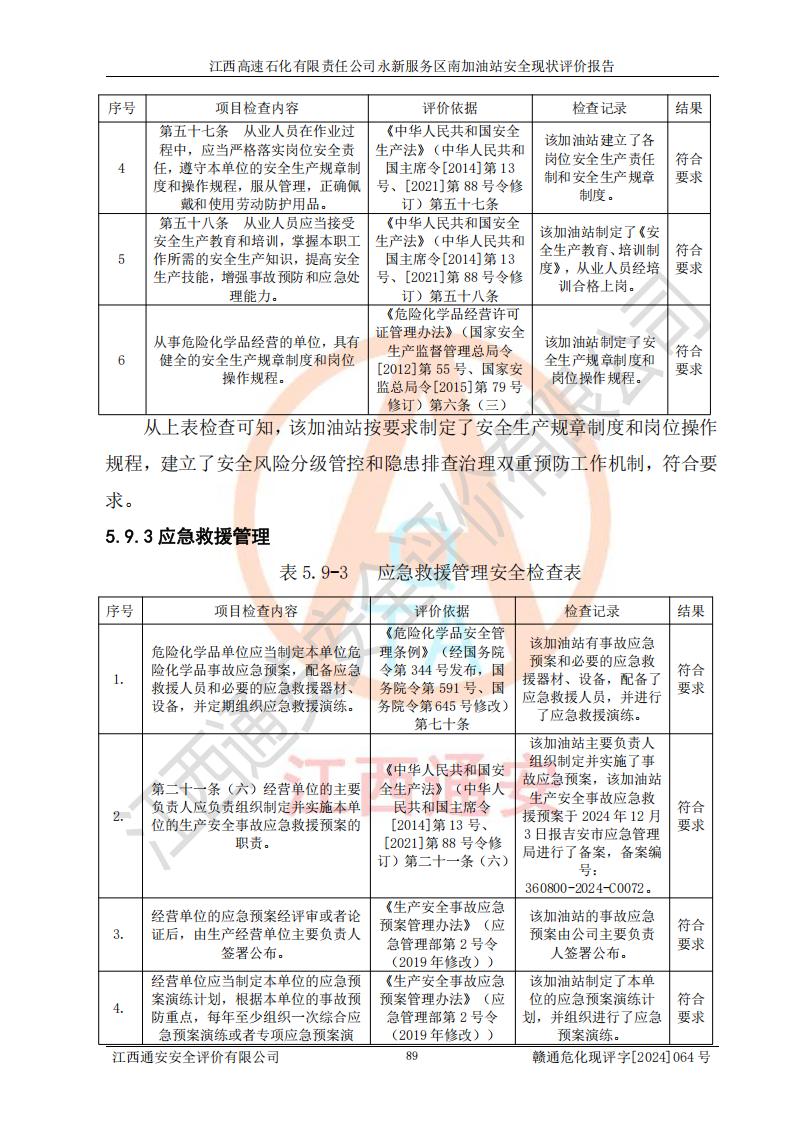 評價(jià)結(jié)論 | 江西高速石化有限責(zé)任公司永新服務(wù)區(qū)南加油站站址合理,周邊環(huán)境良好,與敏感防護(hù)目標(biāo)間距符合規(guī)范要求,站區(qū)建構(gòu)筑物之間的防火間距、耐火等級符合標(biāo)準(zhǔn)要求,與總平面布置圖一致,加油卸油工藝及設(shè)備設(shè)施合理,工藝布置得當(dāng),防雷設(shè)施經(jīng)檢測合格,采取的工藝安全設(shè)施符合規(guī)范要求;該加油站制定了安全管理制度和操作規(guī)程,人員經(jīng)培訓(xùn)合格后上崗,安全管理人員經(jīng)考核合格并取得安全合格證,能按照法律法規(guī)要求開展安全生產(chǎn)管理工作。 綜上:江西高速石化有限責(zé)任公司永新服務(wù)區(qū)南加油站符合《汽車加油加氣加氫站技術(shù)標(biāo)準(zhǔn)》GB50156-2021等標(biāo)準(zhǔn)規(guī)范的要求,安全風(fēng)險(xiǎn)可控,滿足危險(xiǎn)化學(xué)品經(jīng)營的安全條件。 | |||