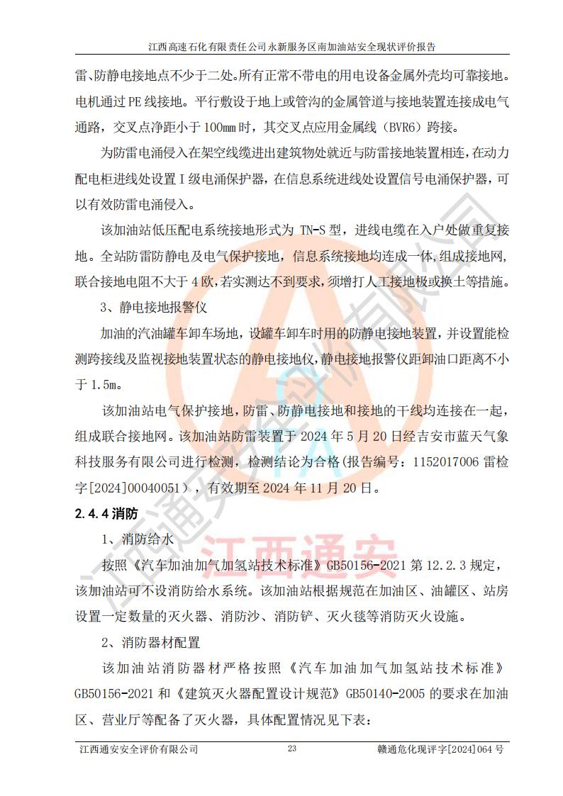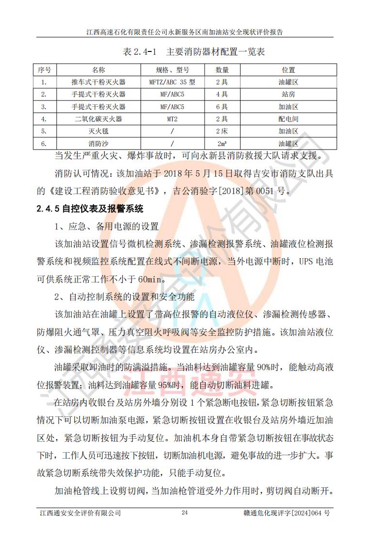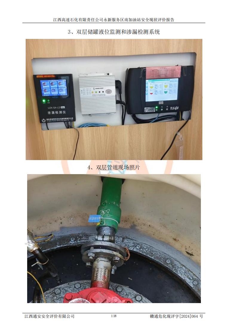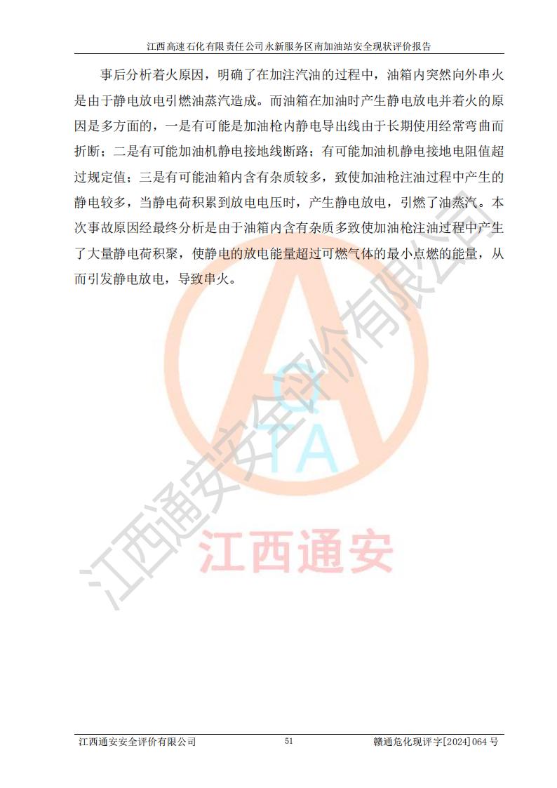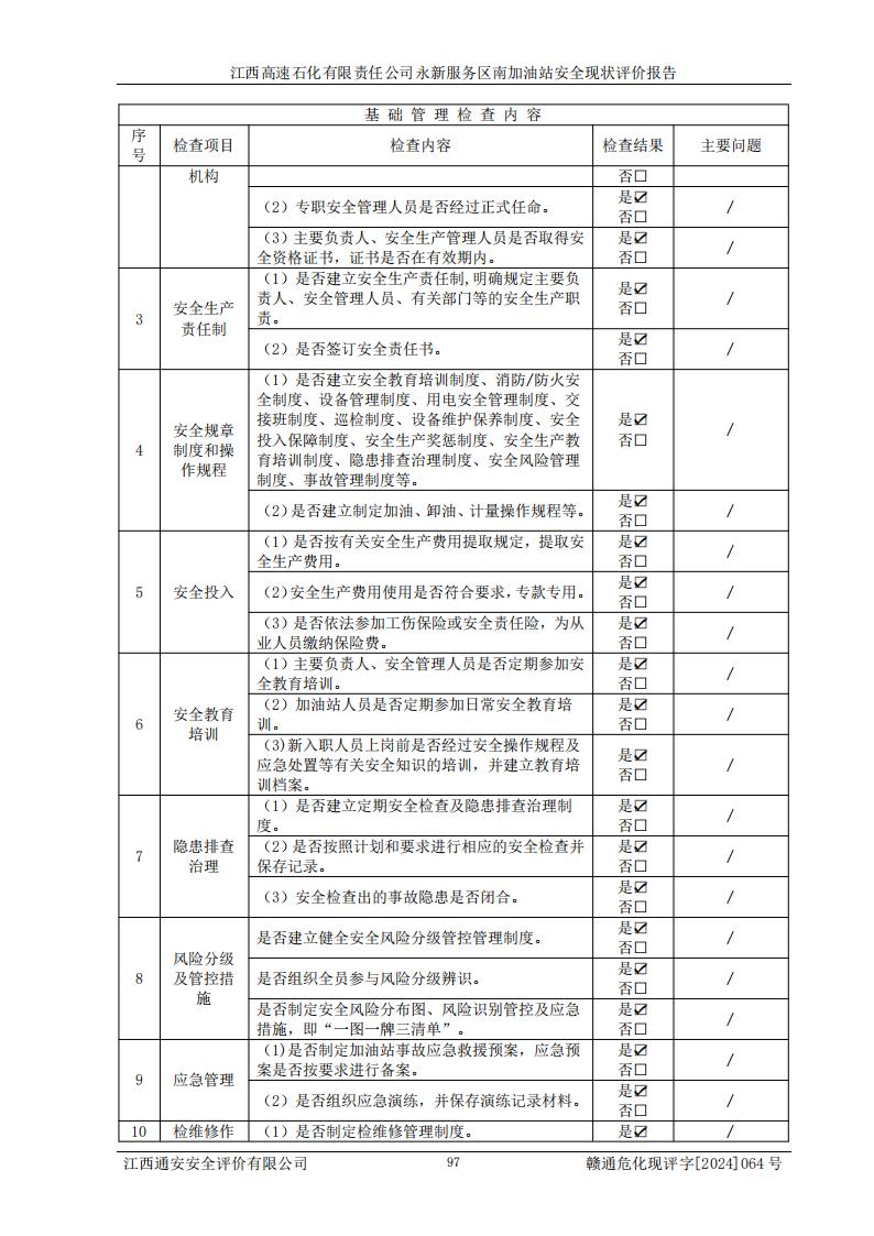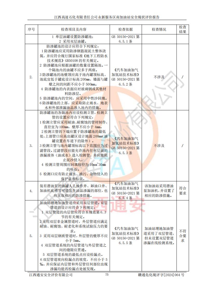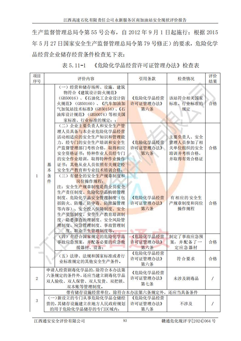 評價(jià)結(jié)論 | 江西高速石化有限責(zé)任公司永新服務(wù)區(qū)南加油站站址合理,周邊環(huán)境良好,與敏感防護(hù)目標(biāo)間距符合規(guī)范要求,站區(qū)建構(gòu)筑物之間的防火間距、耐火等級符合標(biāo)準(zhǔn)要求,與總平面布置圖一致,加油卸油工藝及設(shè)備設(shè)施合理,工藝布置得當(dāng),防雷設(shè)施經(jīng)檢測合格,采取的工藝安全設(shè)施符合規(guī)范要求;該加油站制定了安全管理制度和操作規(guī)程,人員經(jīng)培訓(xùn)合格后上崗,安全管理人員經(jīng)考核合格并取得安全合格證,能按照法律法規(guī)要求開展安全生產(chǎn)管理工作。 綜上:江西高速石化有限責(zé)任公司永新服務(wù)區(qū)南加油站符合《汽車加油加氣加氫站技術(shù)標(biāo)準(zhǔn)》GB50156-2021等標(biāo)準(zhǔn)規(guī)范的要求,安全風(fēng)險(xiǎn)可控,滿足危險(xiǎn)化學(xué)品經(jīng)營的安全條件。 | |||