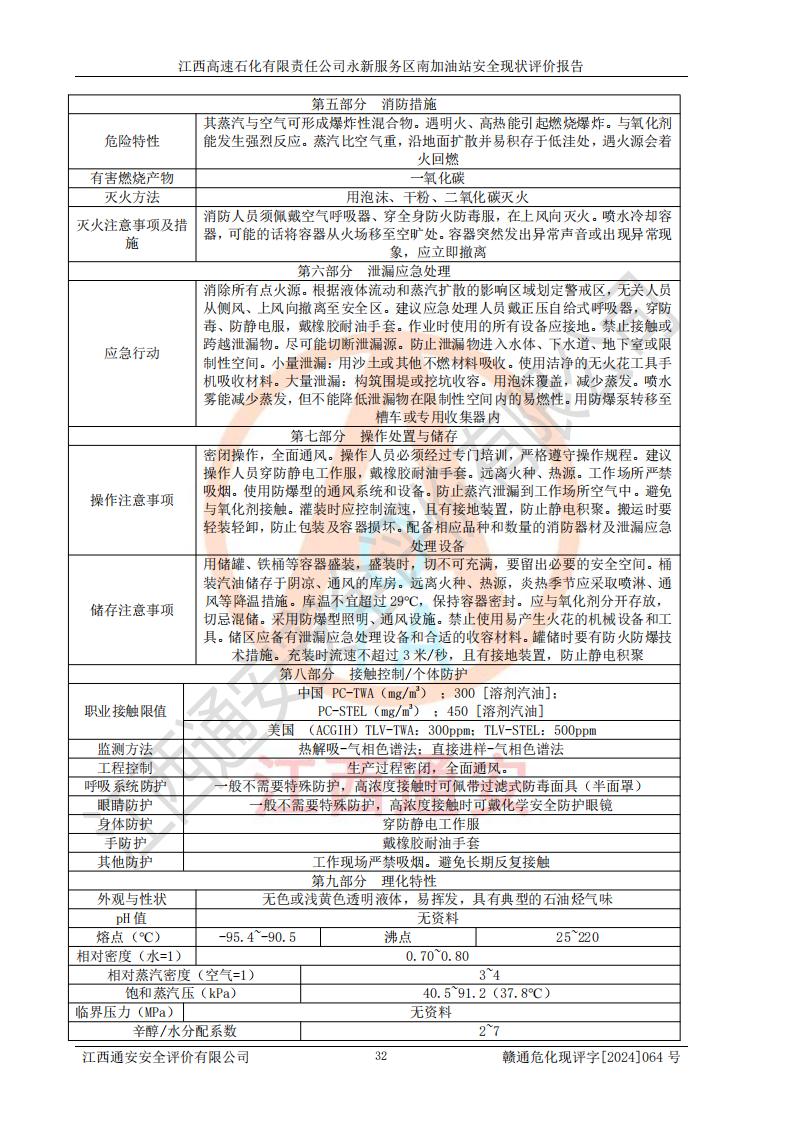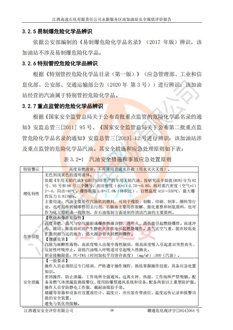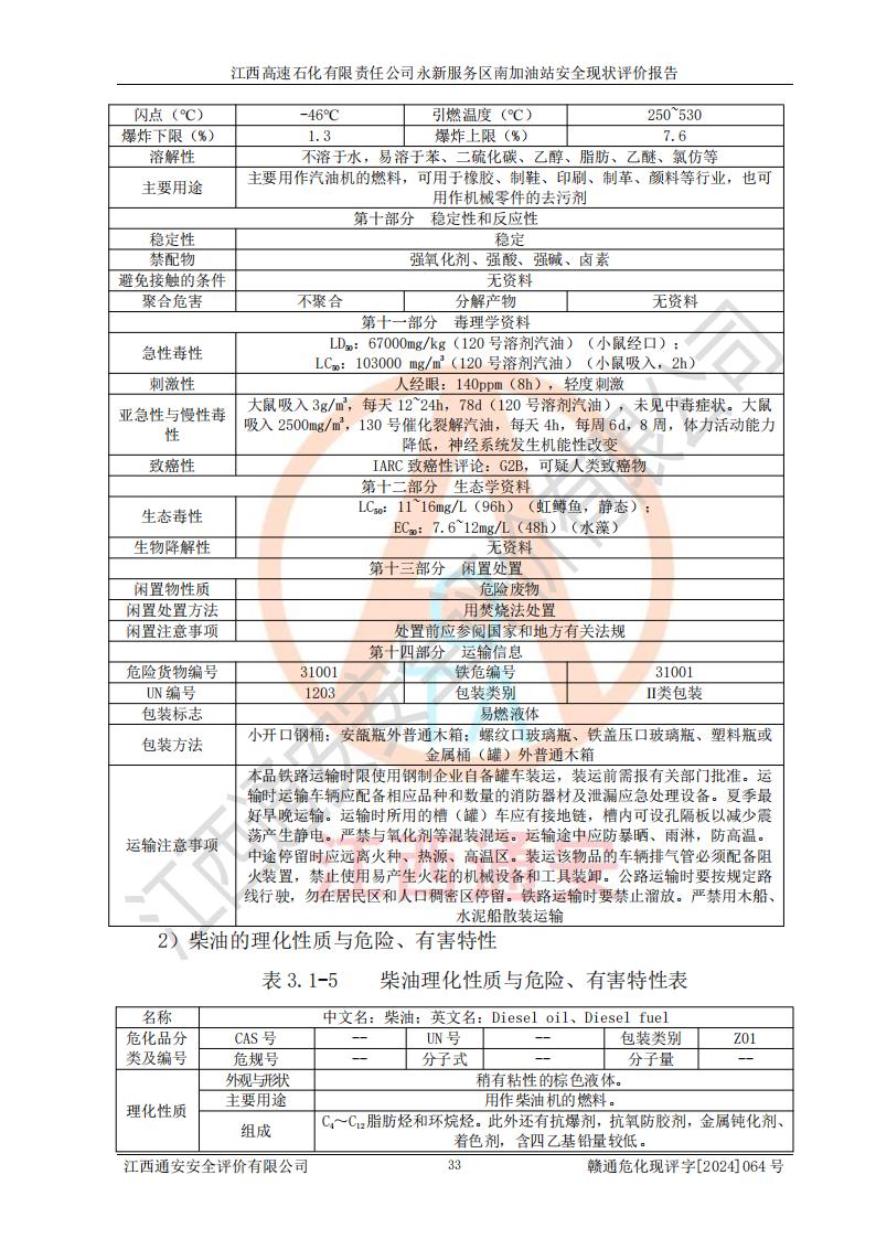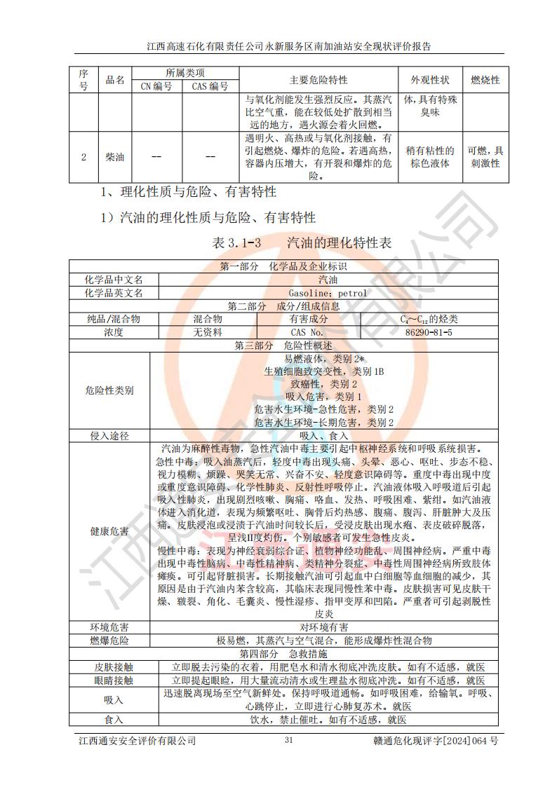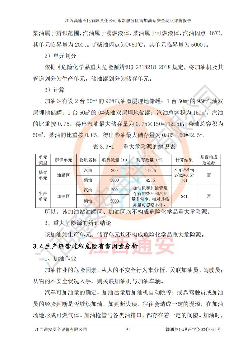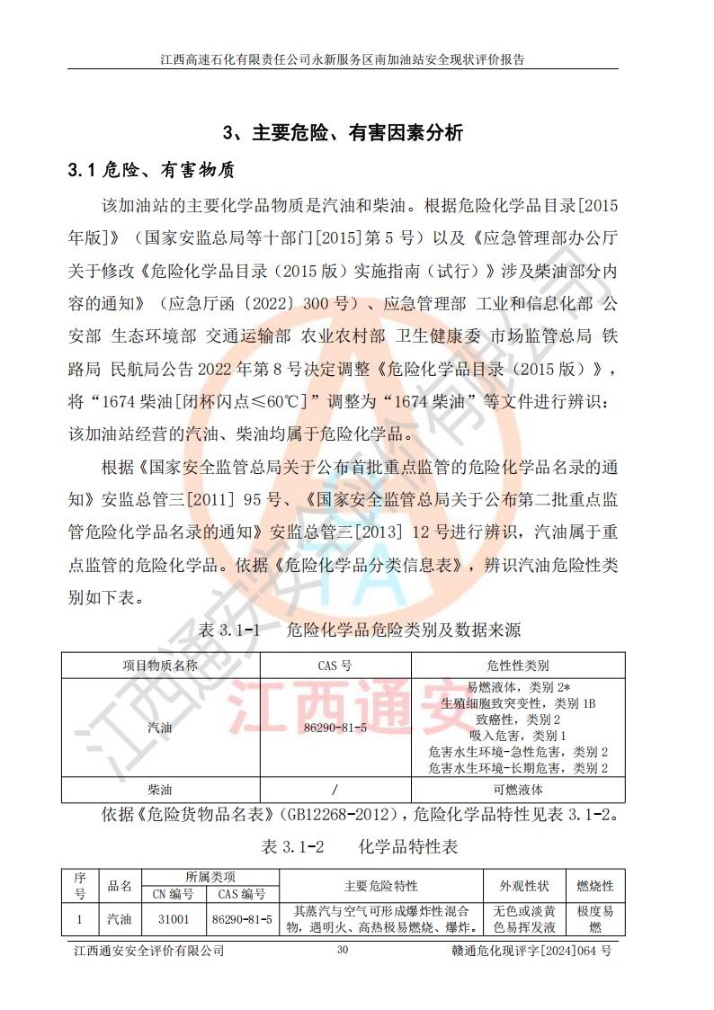 項(xiàng)目簡介 | 江西高速石化有限責(zé)任公司永新服務(wù)區(qū)南加油站成立于2019年2月2日,類型:其他有限責(zé)任公司分公司;負(fù)責(zé)人:陳志斌;經(jīng)營場所為江西省吉安市永新縣吉蓮高速永新服務(wù)區(qū)南。該公司營業(yè)執(zhí)照經(jīng)營范圍:石油、石油化工、化纖及其他化工產(chǎn)品的銷售;光伏、充電樁、日用百貨便利店經(jīng)營:汽車清洗服務(wù):廣告位出租:房屋租賃:食品、計(jì)生用品、零售卷煙、雪茄煙:委托代理收取水電費(fèi):銷售潤滑油、燃油料。(依法須經(jīng)批準(zhǔn)的項(xiàng)目,經(jīng)相關(guān)部門批準(zhǔn)后方可開展經(jīng)營活動(dòng))。 江西高速石化有限責(zé)任公司永新服務(wù)區(qū)南加油站設(shè)有1臺0#柴油/92#汽油/95#汽油/92#汽油/92#汽油/95#汽油6槍3油品加油機(jī),1臺0#柴油/92#汽油/95#汽油/0#柴油/92#汽油/95#汽油6槍3油品加油機(jī),1臺92#汽油/92#汽油/95#汽油/92#汽油/92#汽油/95#汽油6槍雙油品加油機(jī),設(shè)有1個(gè)尿素加注機(jī)(防爆,按柴油加油機(jī)確認(rèn));設(shè)置4臺SF雙層埋地儲罐,其中包括:2臺50m392#汽油雙層埋地儲罐;1臺50m395#汽油雙層埋地儲罐;1臺50m30#柴油雙層埋地儲罐;總儲量為200m3,柴油折半后總?cè)莘e為175m3,加油站等級為**,汽油卸油、加油設(shè)置了油氣回收系統(tǒng)。 該加油站的主要化學(xué)品物質(zhì)是汽油和柴油。根據(jù)危險(xiǎn)化學(xué)品目錄[2015年版]》(**安監(jiān)總局等十部門[2015]第5號)以及《應(yīng)急管理部辦公廳關(guān)于修改《危險(xiǎn)化學(xué)品目錄(2015版)實(shí)施指南(試行)》涉及柴油部分內(nèi)容的通知》(應(yīng)急廳函〔2022〕300號)、應(yīng)急管理部 工業(yè)和信息化部 公安部 生態(tài)環(huán)境部 交通運(yùn)輸部 農(nóng)業(yè)農(nóng)村部 衛(wèi)生健康委 市場監(jiān)管總局 鐵路局 民航局公告2022年第8號決定調(diào)整《危險(xiǎn)化學(xué)品目錄(2015版)》,將“1674柴油[閉杯閃點(diǎn)≤60℃]”調(diào)整為“1674柴油”等文件進(jìn)行辨識:該加油站經(jīng)營的汽油、柴油均屬于危險(xiǎn)化學(xué)品。 | |||