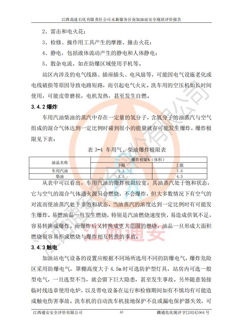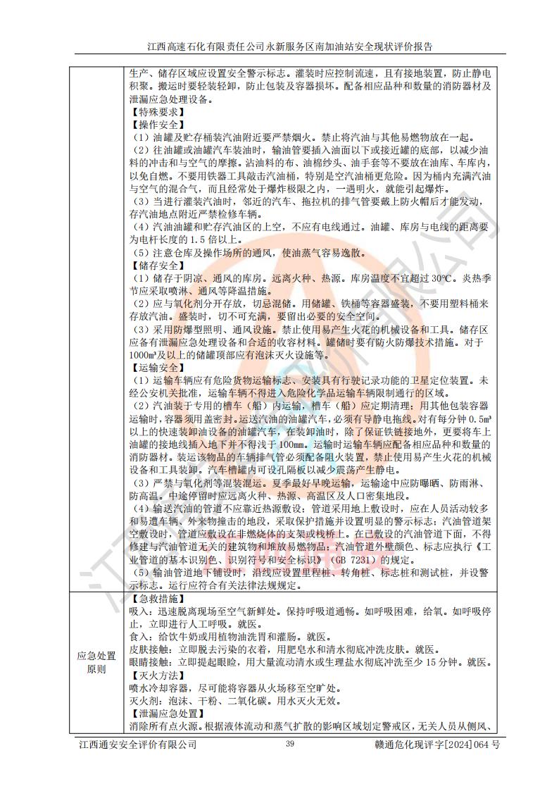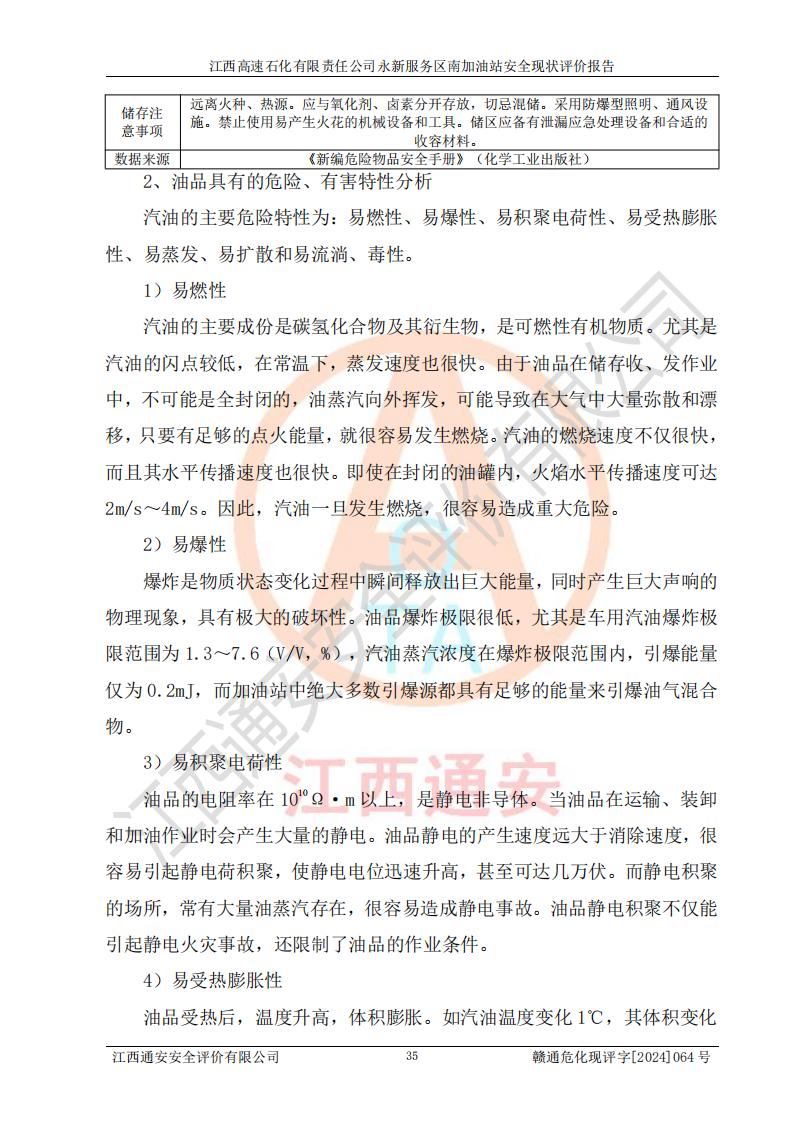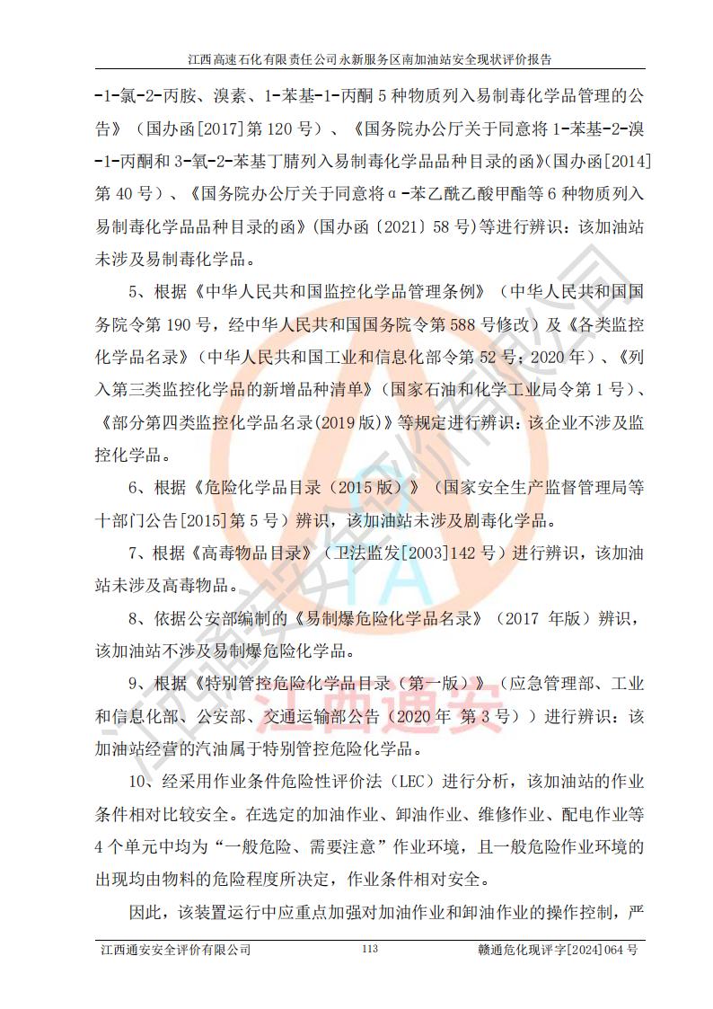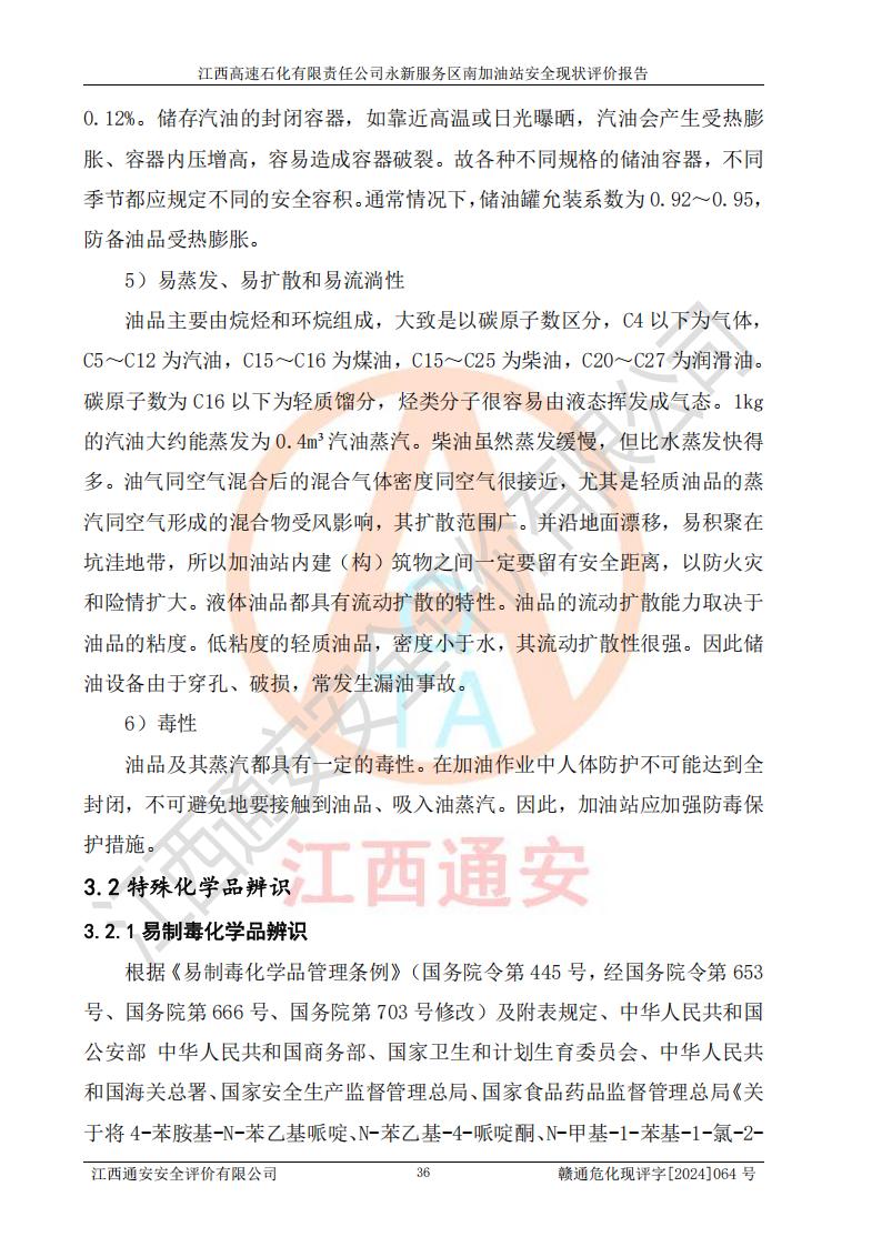 項(xiàng)目簡介 | 江西高速石化有限責(zé)任公司永新服務(wù)區(qū)南加油站成立于2019年2月2日,類型:其他有限責(zé)任公司分公司;負(fù)責(zé)人:陳志斌;經(jīng)營場所為江西省吉安市永新縣吉蓮高速永新服務(wù)區(qū)南。該公司營業(yè)執(zhí)照經(jīng)營范圍:石油、石油化工、化纖及其他化工產(chǎn)品的銷售;光伏、充電樁、日用百貨便利店經(jīng)營:汽車清洗服務(wù):廣告位出租:房屋租賃:食品、計(jì)生用品、零售卷煙、雪茄煙:委托代理收取水電費(fèi):銷售潤滑油、燃油料。(依法須經(jīng)批準(zhǔn)的項(xiàng)目,經(jīng)相關(guān)部門批準(zhǔn)后方可開展經(jīng)營活動(dòng))。 江西高速石化有限責(zé)任公司永新服務(wù)區(qū)南加油站設(shè)有1臺0#柴油/92#汽油/95#汽油/92#汽油/92#汽油/95#汽油6槍3油品加油機(jī),1臺0#柴油/92#汽油/95#汽油/0#柴油/92#汽油/95#汽油6槍3油品加油機(jī),1臺92#汽油/92#汽油/95#汽油/92#汽油/92#汽油/95#汽油6槍雙油品加油機(jī),設(shè)有1個(gè)尿素加注機(jī)(防爆,按柴油加油機(jī)確認(rèn));設(shè)置4臺SF雙層埋地儲罐,其中包括:2臺50m392#汽油雙層埋地儲罐;1臺50m395#汽油雙層埋地儲罐;1臺50m30#柴油雙層埋地儲罐;總儲量為200m3,柴油折半后總?cè)莘e為175m3,加油站等級為**,汽油卸油、加油設(shè)置了油氣回收系統(tǒng)。 該加油站的主要化學(xué)品物質(zhì)是汽油和柴油。根據(jù)危險(xiǎn)化學(xué)品目錄[2015年版]》(**安監(jiān)總局等十部門[2015]第5號)以及《應(yīng)急管理部辦公廳關(guān)于修改《危險(xiǎn)化學(xué)品目錄(2015版)實(shí)施指南(試行)》涉及柴油部分內(nèi)容的通知》(應(yīng)急廳函〔2022〕300號)、應(yīng)急管理部 工業(yè)和信息化部 公安部 生態(tài)環(huán)境部 交通運(yùn)輸部 農(nóng)業(yè)農(nóng)村部 衛(wèi)生健康委 市場監(jiān)管總局 鐵路局 民航局公告2022年第8號決定調(diào)整《危險(xiǎn)化學(xué)品目錄(2015版)》,將“1674柴油[閉杯閃點(diǎn)≤60℃]”調(diào)整為“1674柴油”等文件進(jìn)行辨識:該加油站經(jīng)營的汽油、柴油均屬于危險(xiǎn)化學(xué)品。 | |||