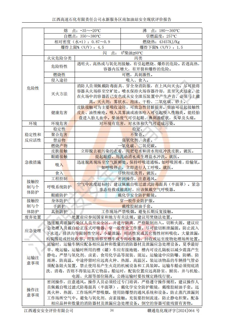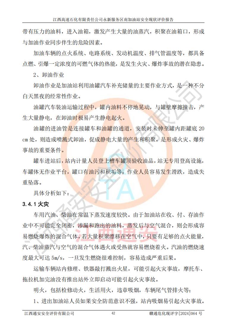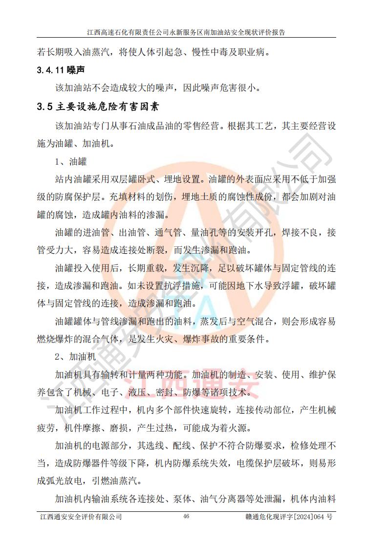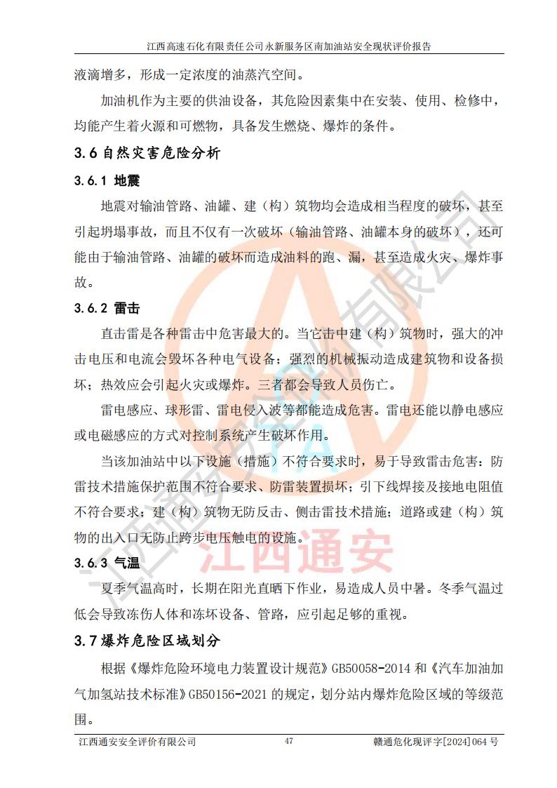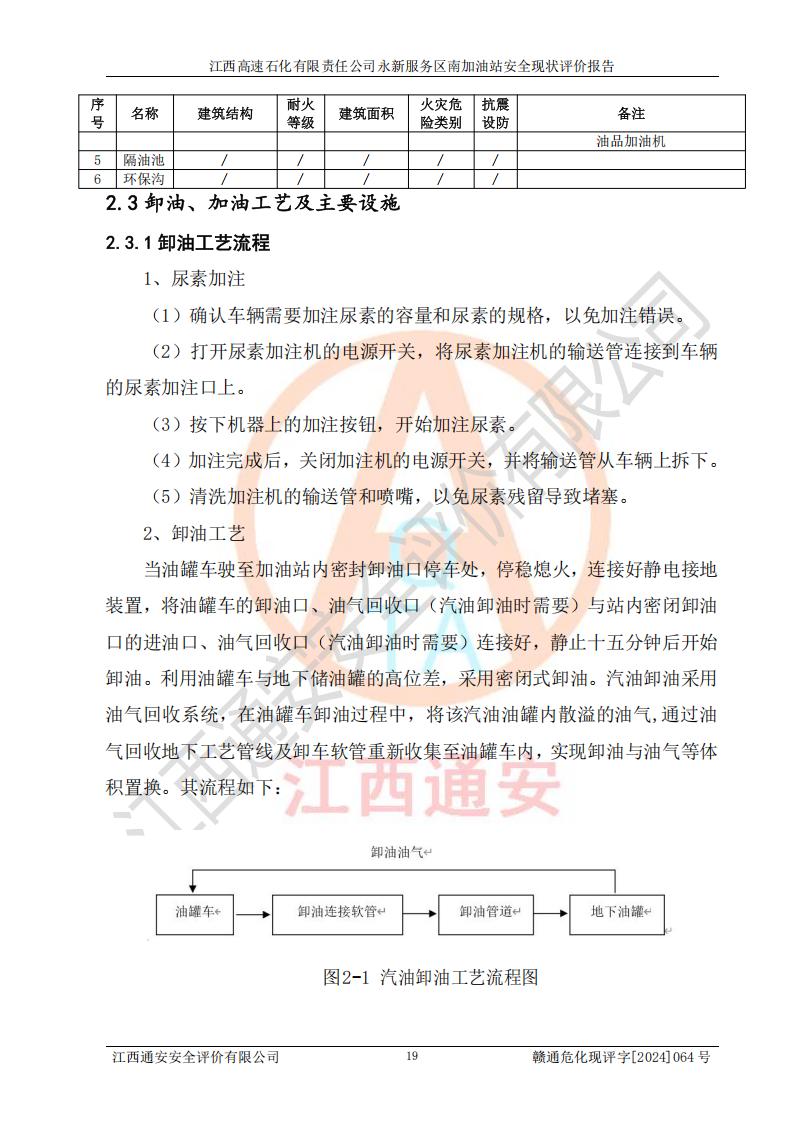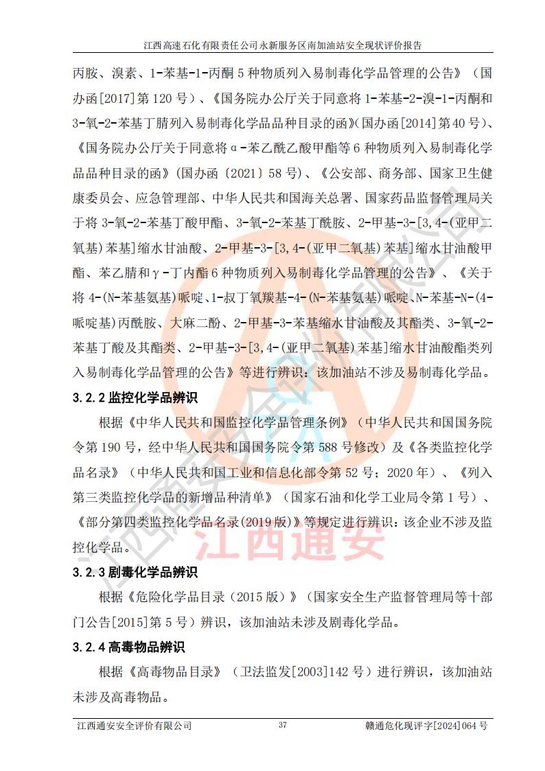 項(xiàng)目簡介 | 江西高速石化有限責(zé)任公司永新服務(wù)區(qū)南加油站成立于2019年2月2日,類型:其他有限責(zé)任公司分公司;負(fù)責(zé)人:陳志斌;經(jīng)營場所為江西省吉安市永新縣吉蓮高速永新服務(wù)區(qū)南。該公司營業(yè)執(zhí)照經(jīng)營范圍:石油、石油化工、化纖及其他化工產(chǎn)品的銷售;光伏、充電樁、日用百貨便利店經(jīng)營:汽車清洗服務(wù):廣告位出租:房屋租賃:食品、計(jì)生用品、零售卷煙、雪茄煙:委托代理收取水電費(fèi):銷售潤滑油、燃油料。(依法須經(jīng)批準(zhǔn)的項(xiàng)目,經(jīng)相關(guān)部門批準(zhǔn)后方可開展經(jīng)營活動(dòng))。 江西高速石化有限責(zé)任公司永新服務(wù)區(qū)南加油站設(shè)有1臺0#柴油/92#汽油/95#汽油/92#汽油/92#汽油/95#汽油6槍3油品加油機(jī),1臺0#柴油/92#汽油/95#汽油/0#柴油/92#汽油/95#汽油6槍3油品加油機(jī),1臺92#汽油/92#汽油/95#汽油/92#汽油/92#汽油/95#汽油6槍雙油品加油機(jī),設(shè)有1個(gè)尿素加注機(jī)(防爆,按柴油加油機(jī)確認(rèn));設(shè)置4臺SF雙層埋地儲罐,其中包括:2臺50m392#汽油雙層埋地儲罐;1臺50m395#汽油雙層埋地儲罐;1臺50m30#柴油雙層埋地儲罐;總儲量為200m3,柴油折半后總?cè)莘e為175m3,加油站等級為**,汽油卸油、加油設(shè)置了油氣回收系統(tǒng)。 該加油站的主要化學(xué)品物質(zhì)是汽油和柴油。根據(jù)危險(xiǎn)化學(xué)品目錄[2015年版]》(**安監(jiān)總局等十部門[2015]第5號)以及《應(yīng)急管理部辦公廳關(guān)于修改《危險(xiǎn)化學(xué)品目錄(2015版)實(shí)施指南(試行)》涉及柴油部分內(nèi)容的通知》(應(yīng)急廳函〔2022〕300號)、應(yīng)急管理部 工業(yè)和信息化部 公安部 生態(tài)環(huán)境部 交通運(yùn)輸部 農(nóng)業(yè)農(nóng)村部 衛(wèi)生健康委 市場監(jiān)管總局 鐵路局 民航局公告2022年第8號決定調(diào)整《危險(xiǎn)化學(xué)品目錄(2015版)》,將“1674柴油[閉杯閃點(diǎn)≤60℃]”調(diào)整為“1674柴油”等文件進(jìn)行辨識:該加油站經(jīng)營的汽油、柴油均屬于危險(xiǎn)化學(xué)品。 | |||