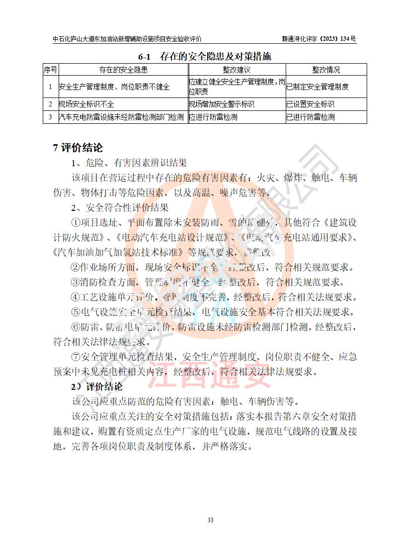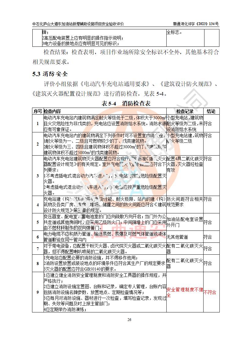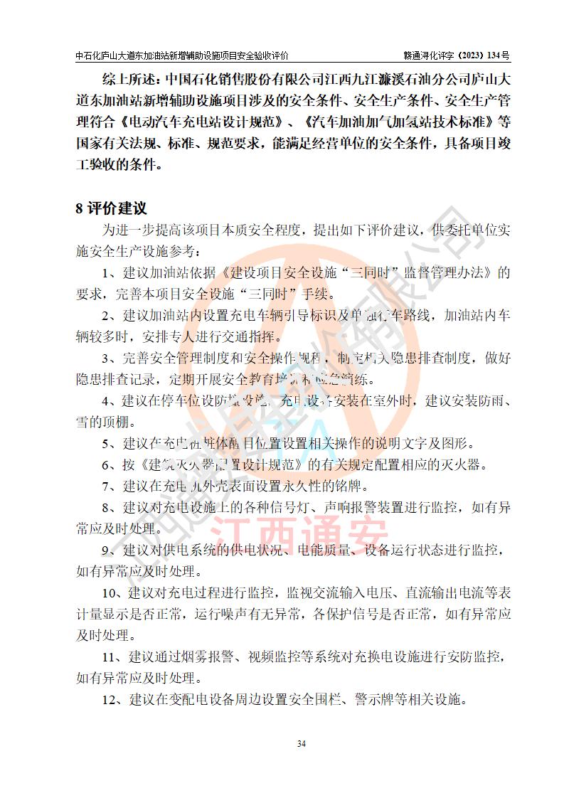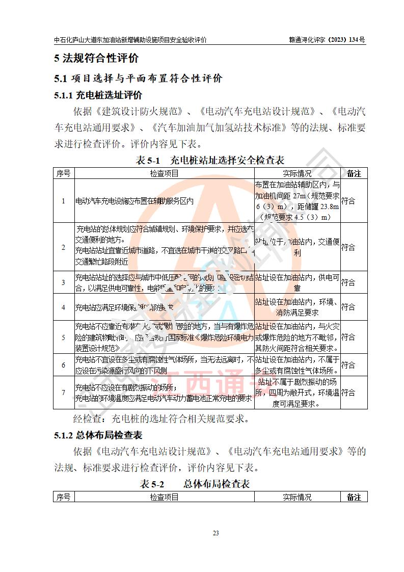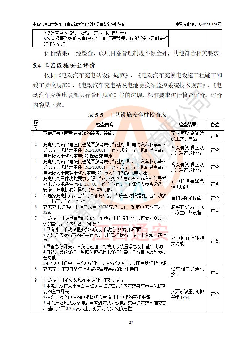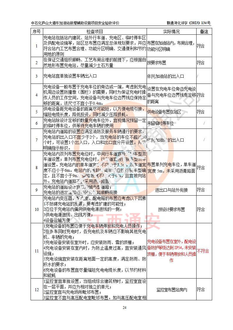 評價結(jié)論 | 中國石化銷售股份有限公司江西九江濂溪石油分公司廬山大道東加油站新增輔助設(shè)施項目涉及的安全條件、安全生產(chǎn)條件、安全生產(chǎn)管理符合《電動汽車充電站設(shè)計規(guī)范》、《汽車加油加氣加氫站技術(shù)標(biāo)準(zhǔn)》等**有關(guān)法規(guī)、標(biāo)準(zhǔn)、規(guī)范要求,能滿足經(jīng)營單位的安全條件,具備項目竣工驗收的條件。 | |||