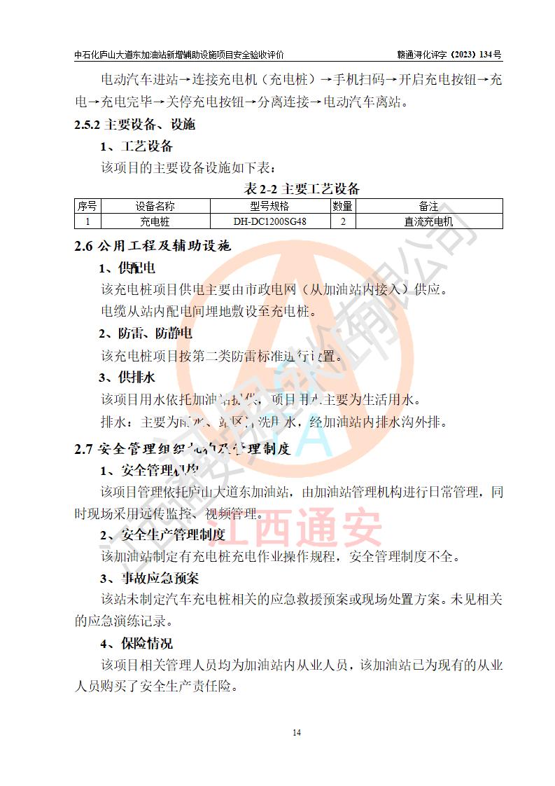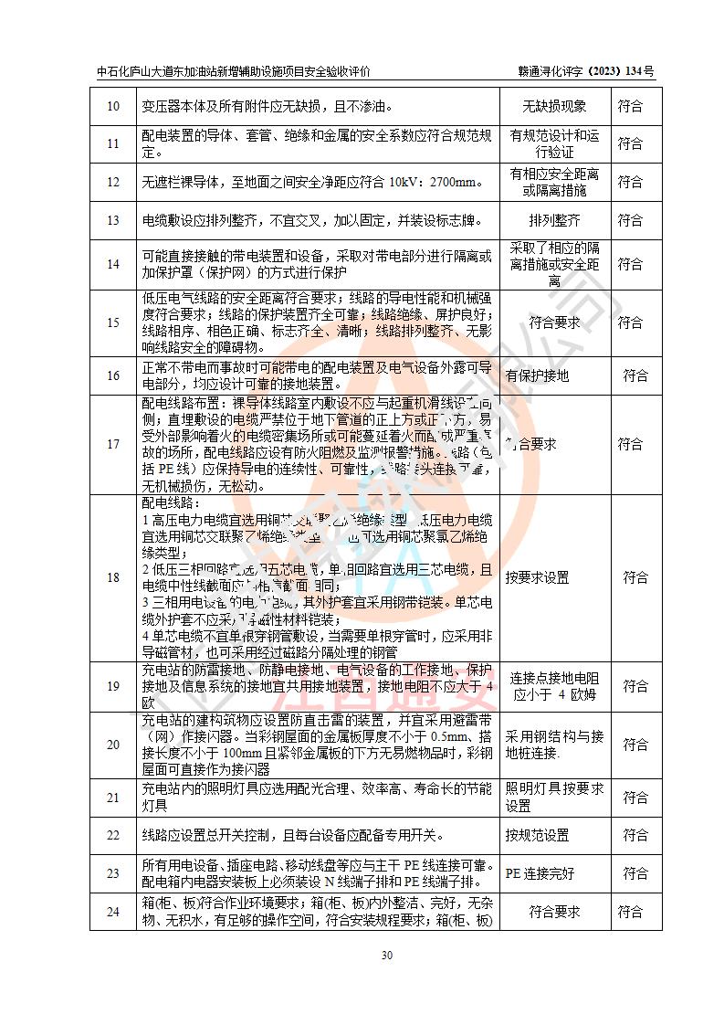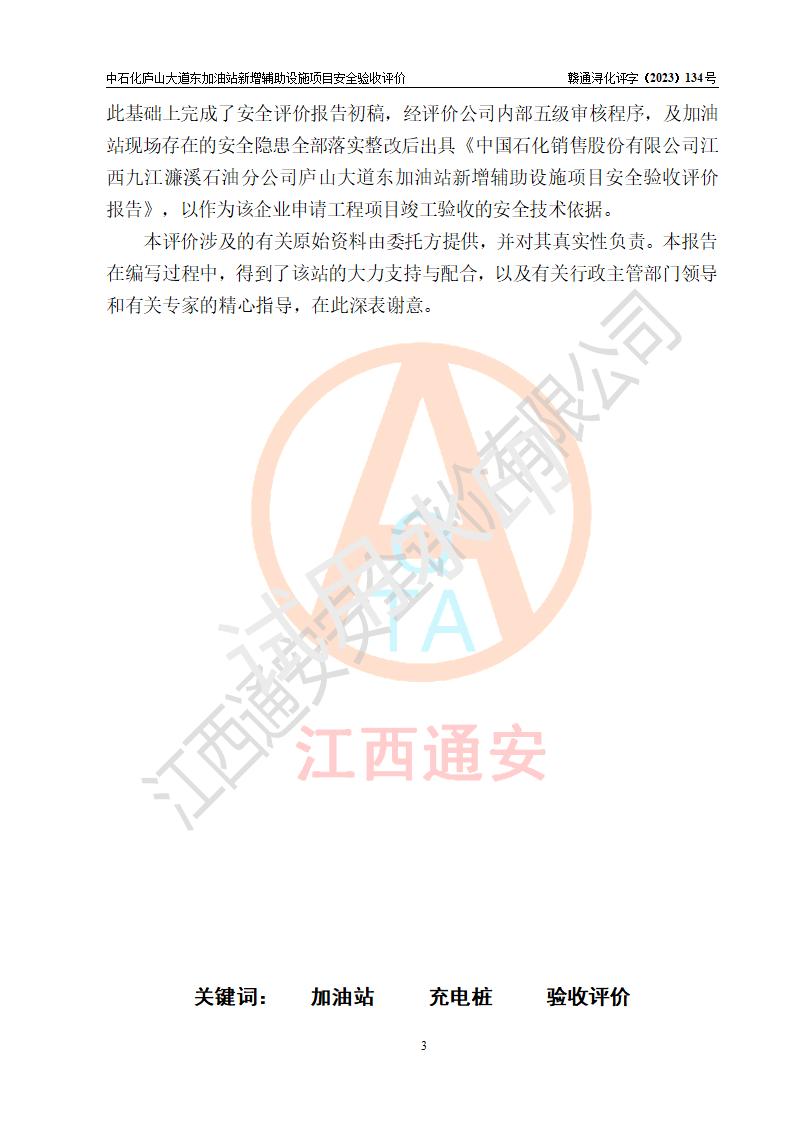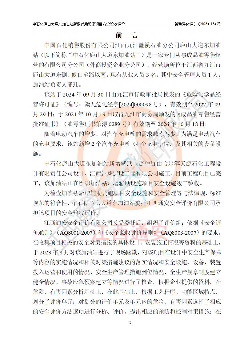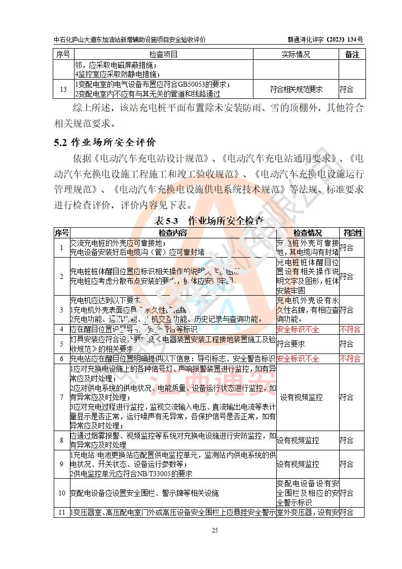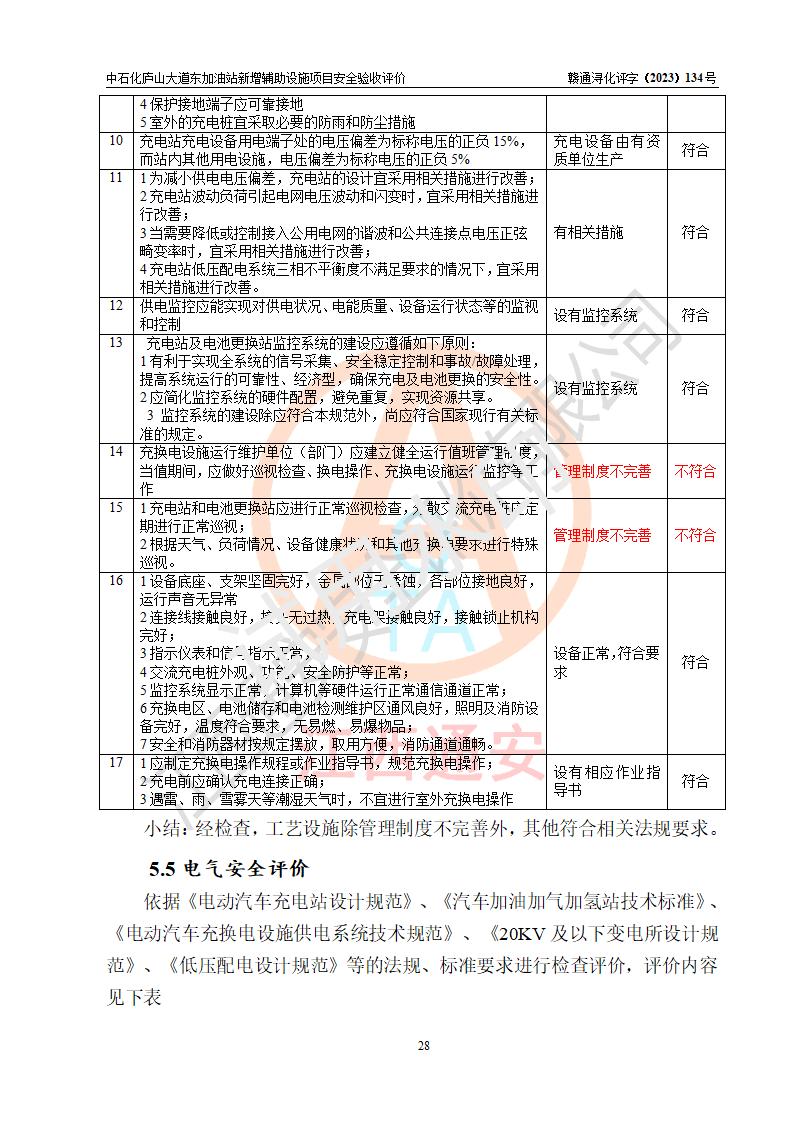 評價結(jié)論 | 中國石化銷售股份有限公司江西九江濂溪石油分公司廬山大道東加油站新增輔助設(shè)施項目涉及的安全條件、安全生產(chǎn)條件、安全生產(chǎn)管理符合《電動汽車充電站設(shè)計規(guī)范》、《汽車加油加氣加氫站技術(shù)標(biāo)準(zhǔn)》等**有關(guān)法規(guī)、標(biāo)準(zhǔn)、規(guī)范要求,能滿足經(jīng)營單位的安全條件,具備項目竣工驗收的條件。 | |||