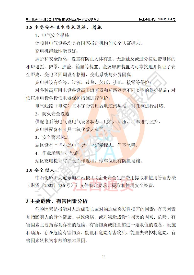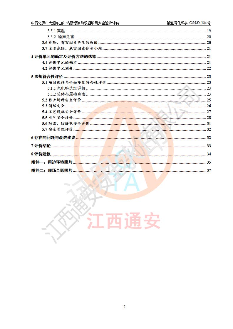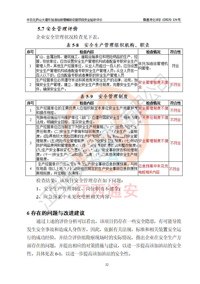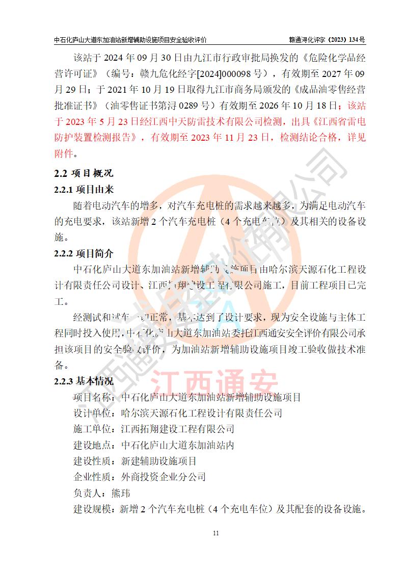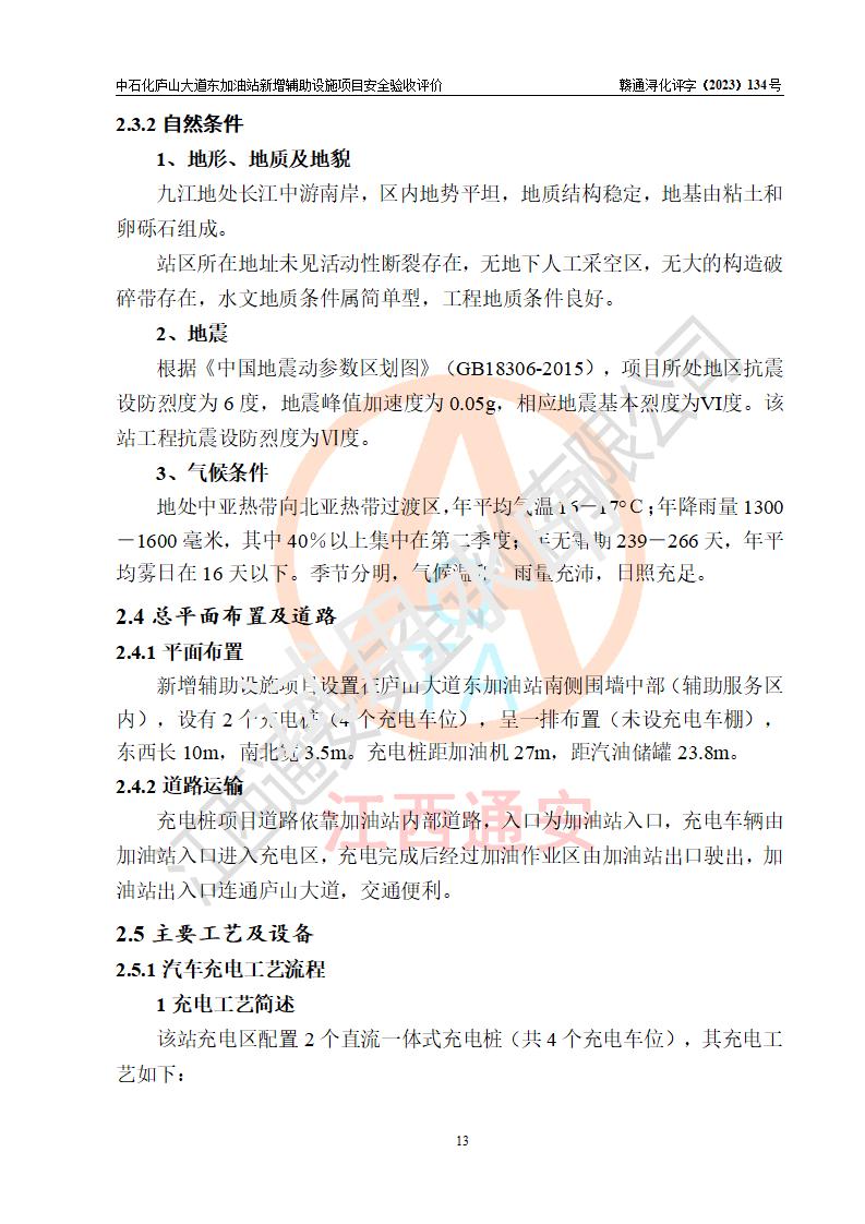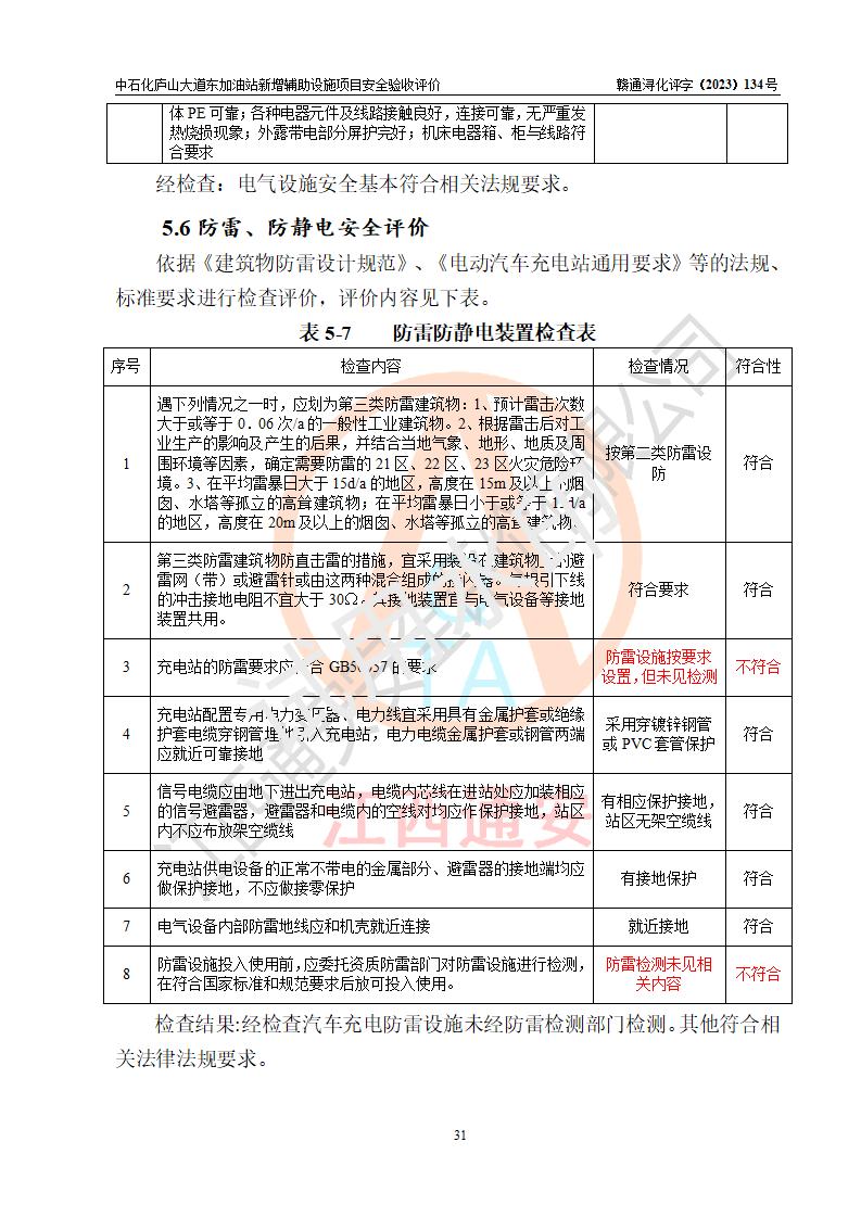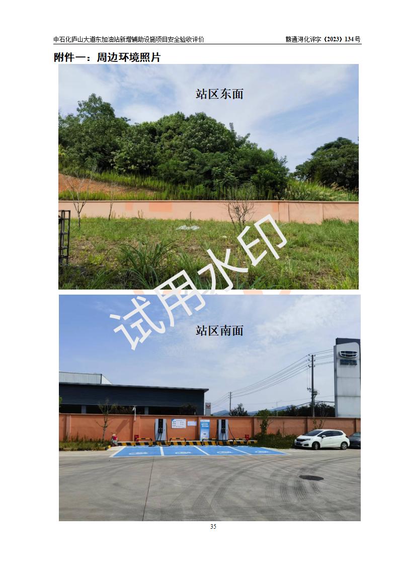 評價結(jié)論 | 中國石化銷售股份有限公司江西九江濂溪石油分公司廬山大道東加油站新增輔助設(shè)施項目涉及的安全條件、安全生產(chǎn)條件、安全生產(chǎn)管理符合《電動汽車充電站設(shè)計規(guī)范》、《汽車加油加氣加氫站技術(shù)標(biāo)準(zhǔn)》等**有關(guān)法規(guī)、標(biāo)準(zhǔn)、規(guī)范要求,能滿足經(jīng)營單位的安全條件,具備項目竣工驗收的條件。 | |||
