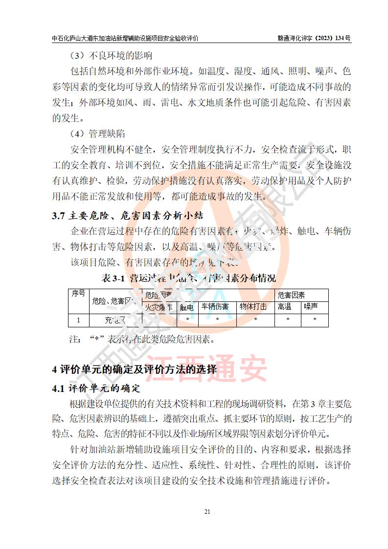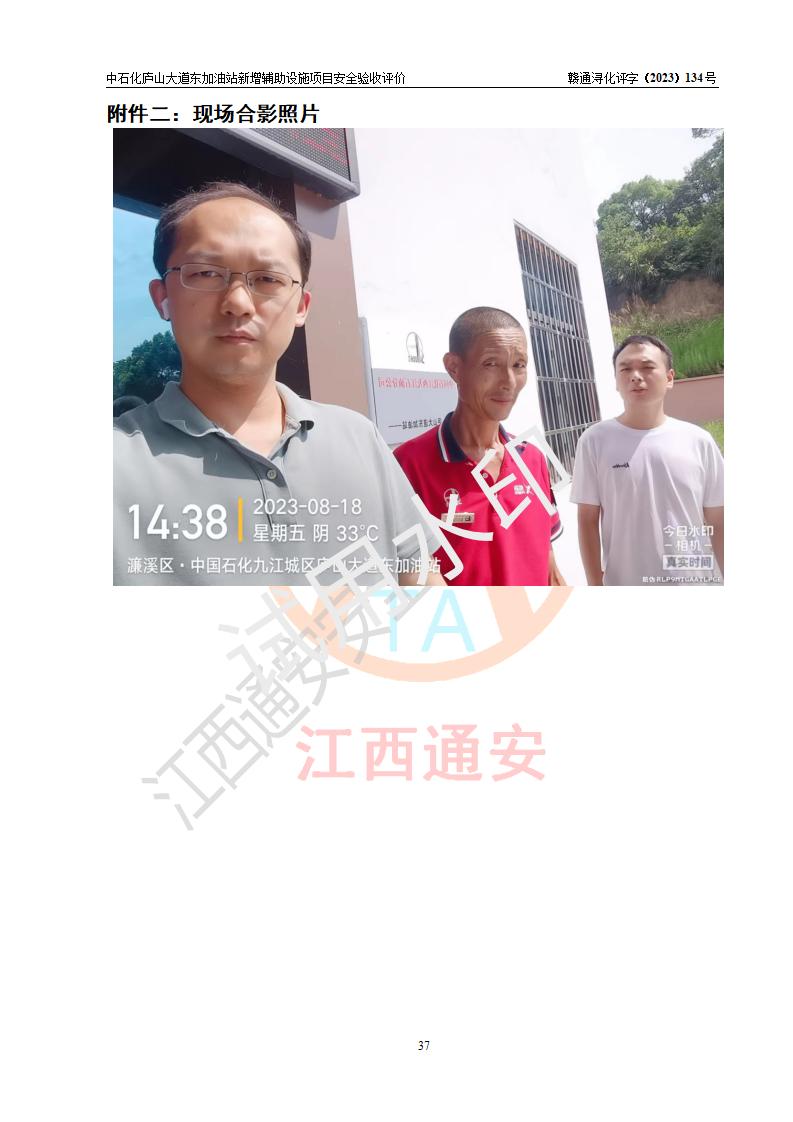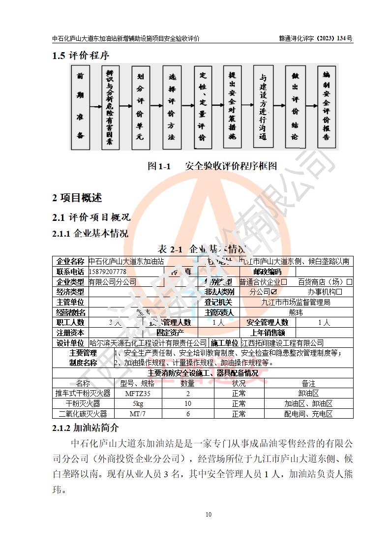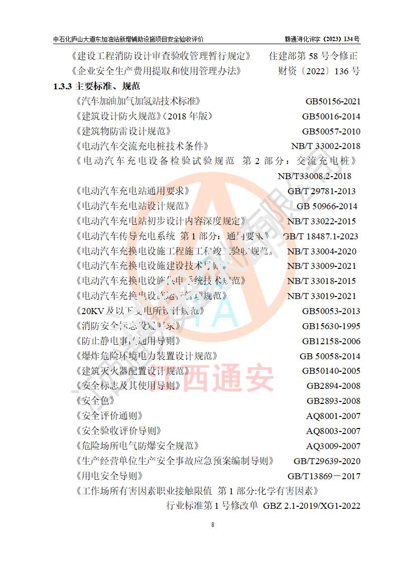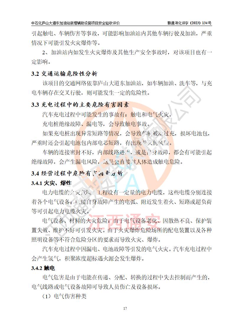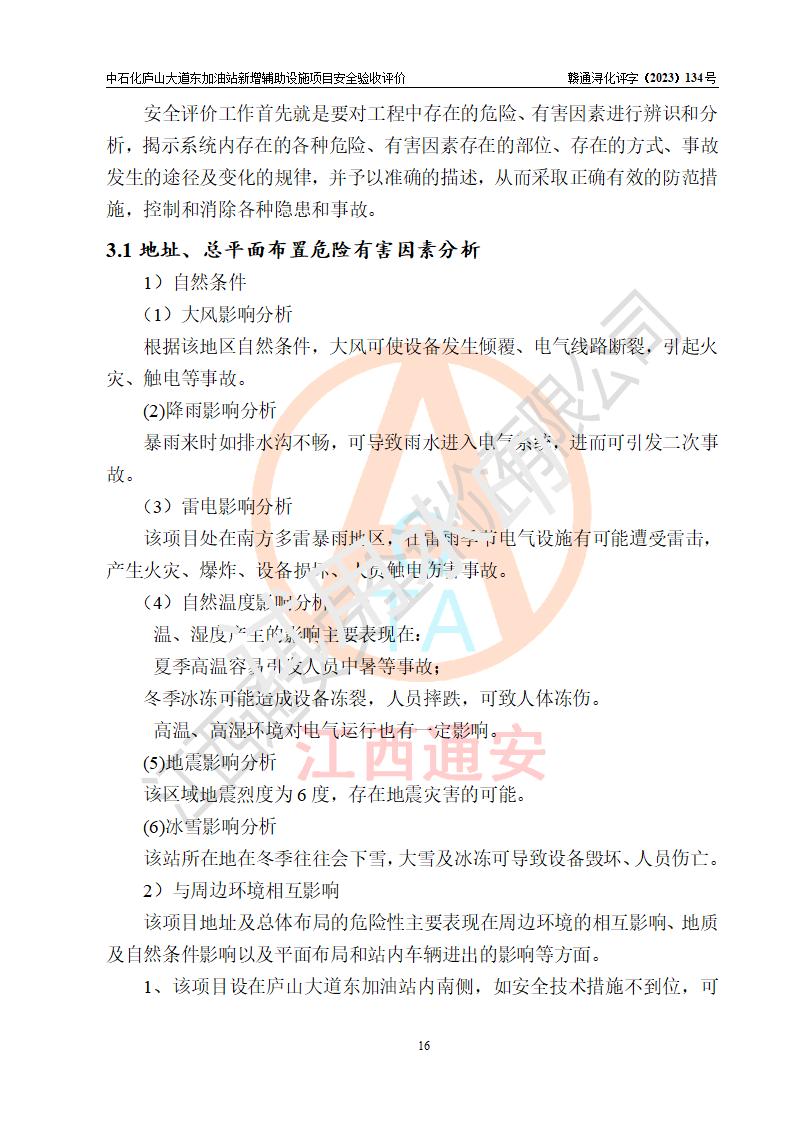 評價結(jié)論 | 中國石化銷售股份有限公司江西九江濂溪石油分公司廬山大道東加油站新增輔助設(shè)施項目涉及的安全條件、安全生產(chǎn)條件、安全生產(chǎn)管理符合《電動汽車充電站設(shè)計規(guī)范》、《汽車加油加氣加氫站技術(shù)標(biāo)準(zhǔn)》等**有關(guān)法規(guī)、標(biāo)準(zhǔn)、規(guī)范要求,能滿足經(jīng)營單位的安全條件,具備項目竣工驗收的條件。 | |||